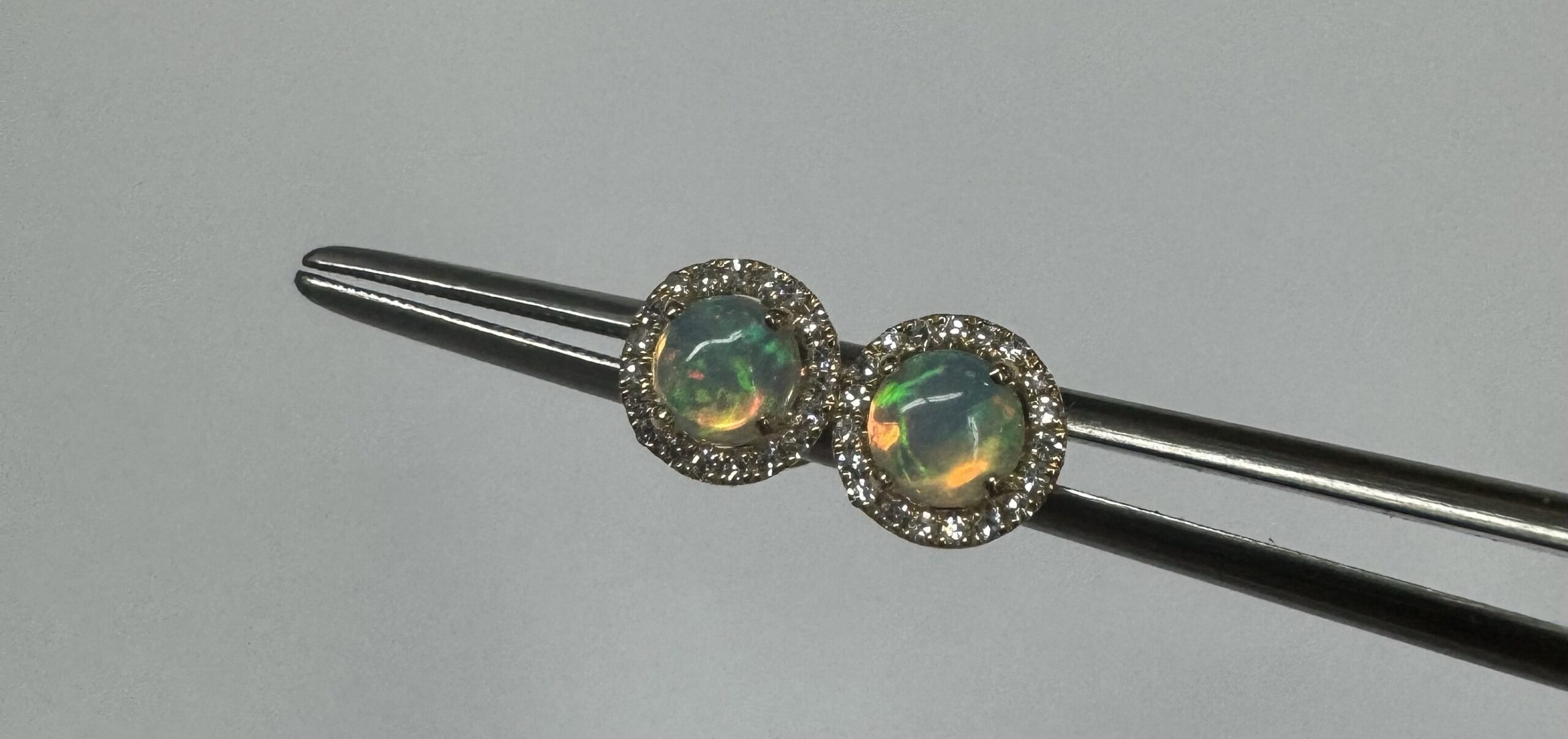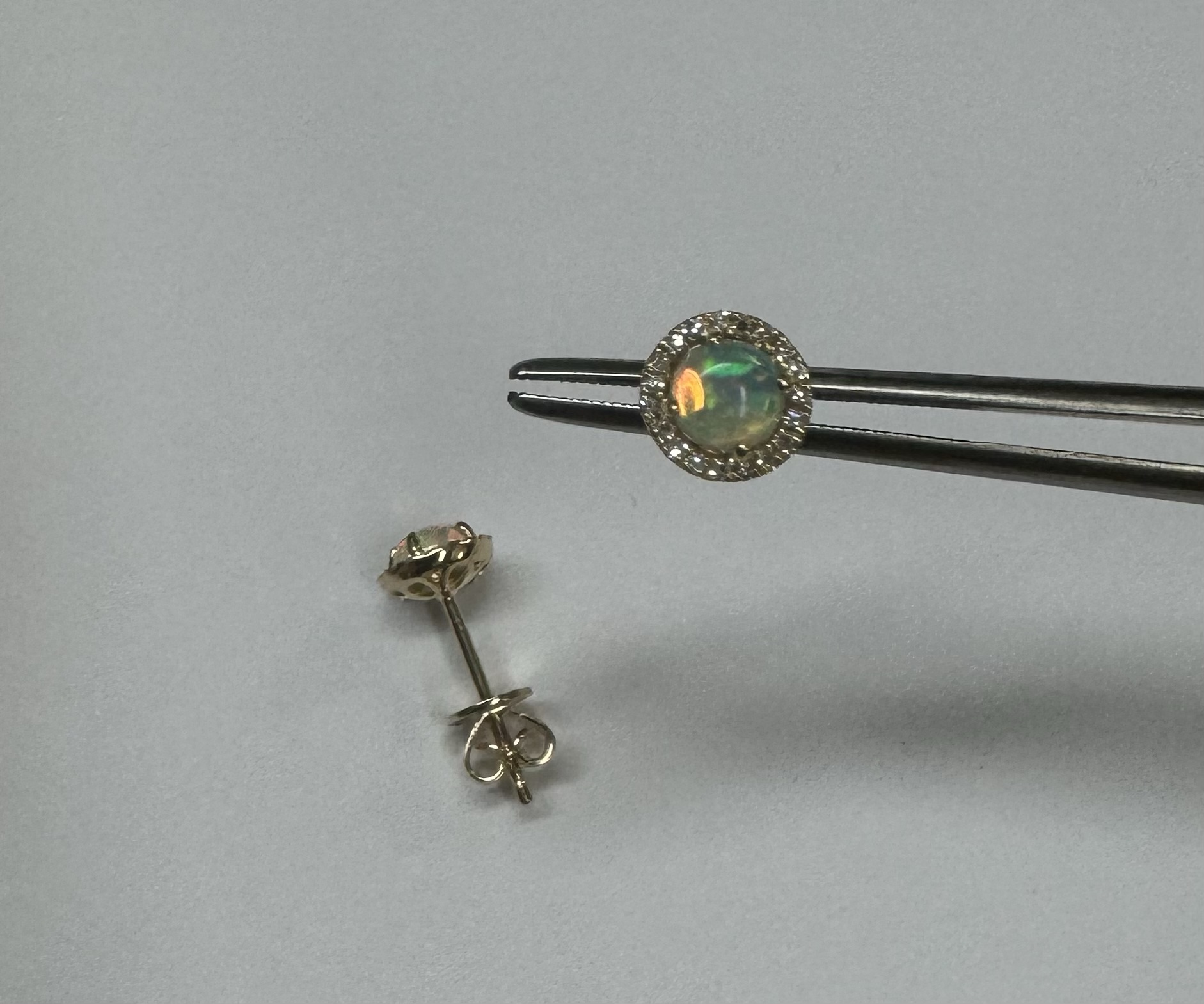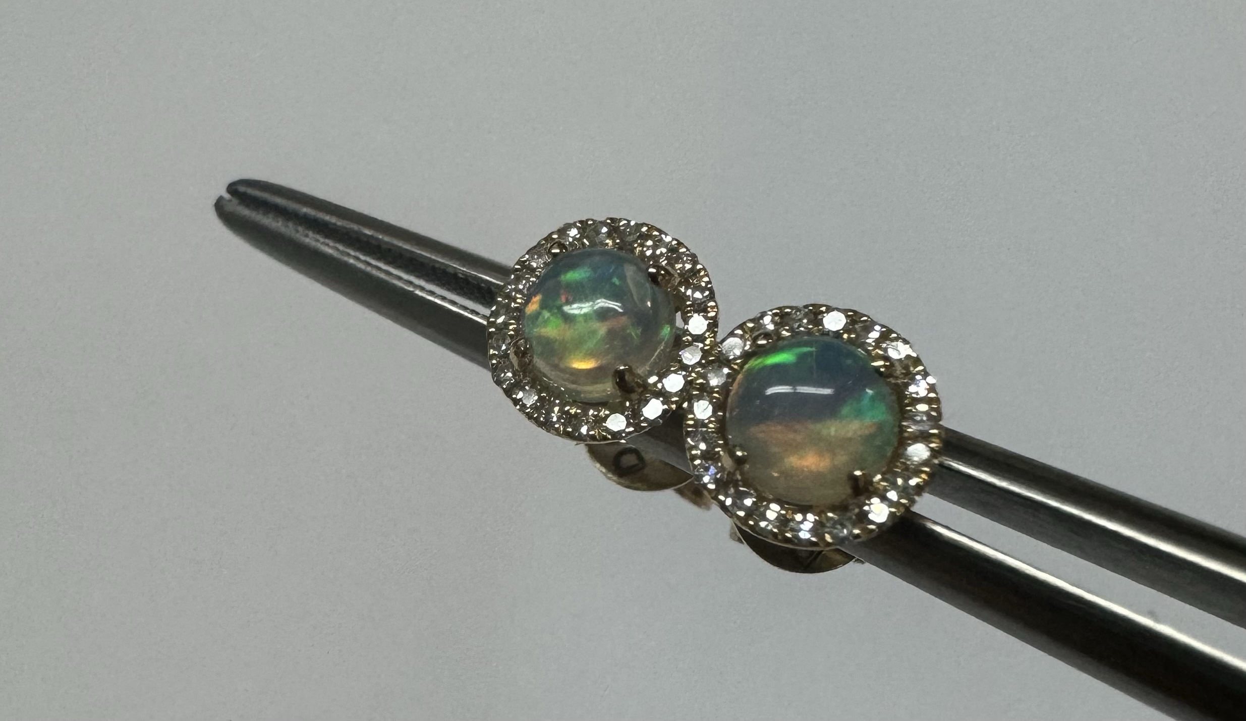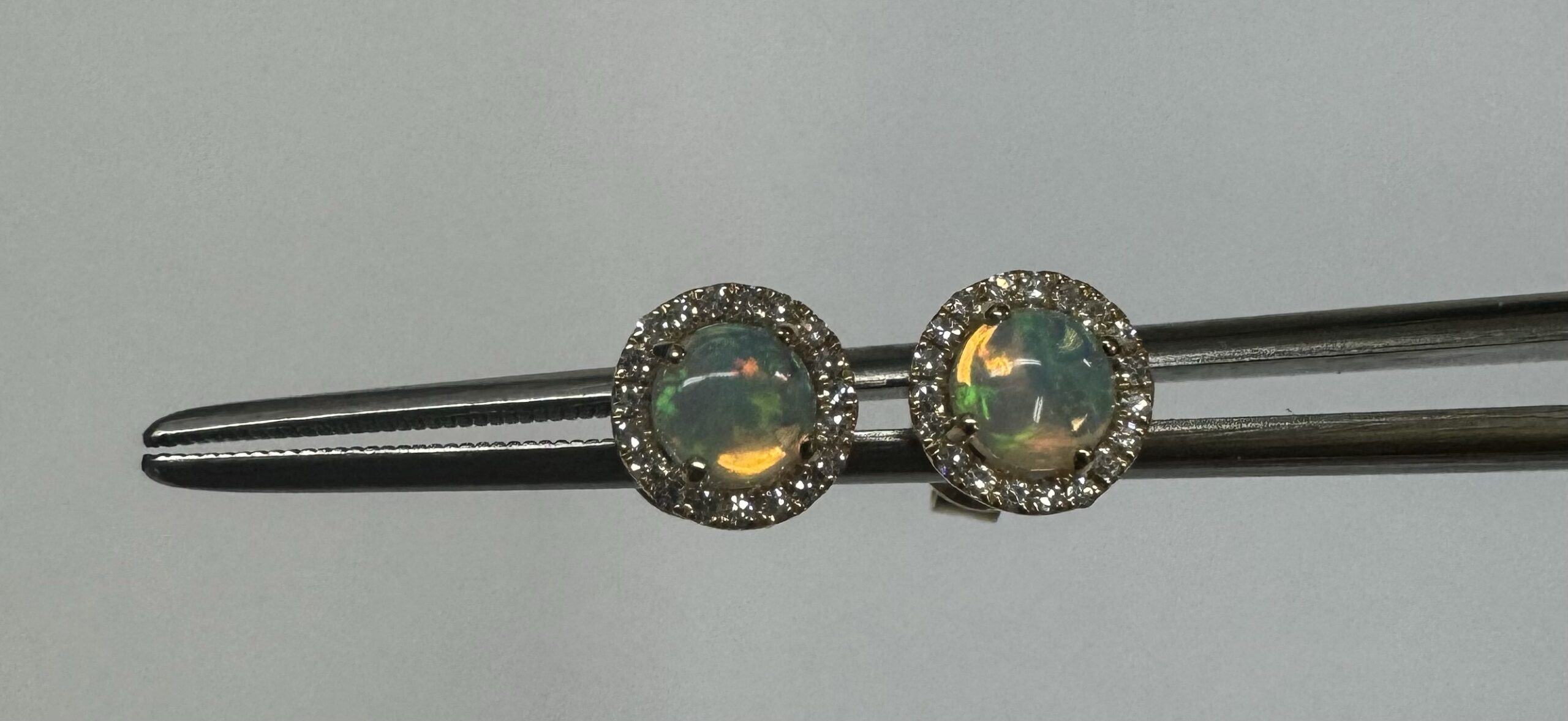14k yellow gold genuine .40 cttw Opal & genuine .08 cttw Round Brilliant Cut diamond halo stud earrings. These diamonds average G-H in color and SI1 in clarity. These earrings have a total combined weight of 1.0 grams.