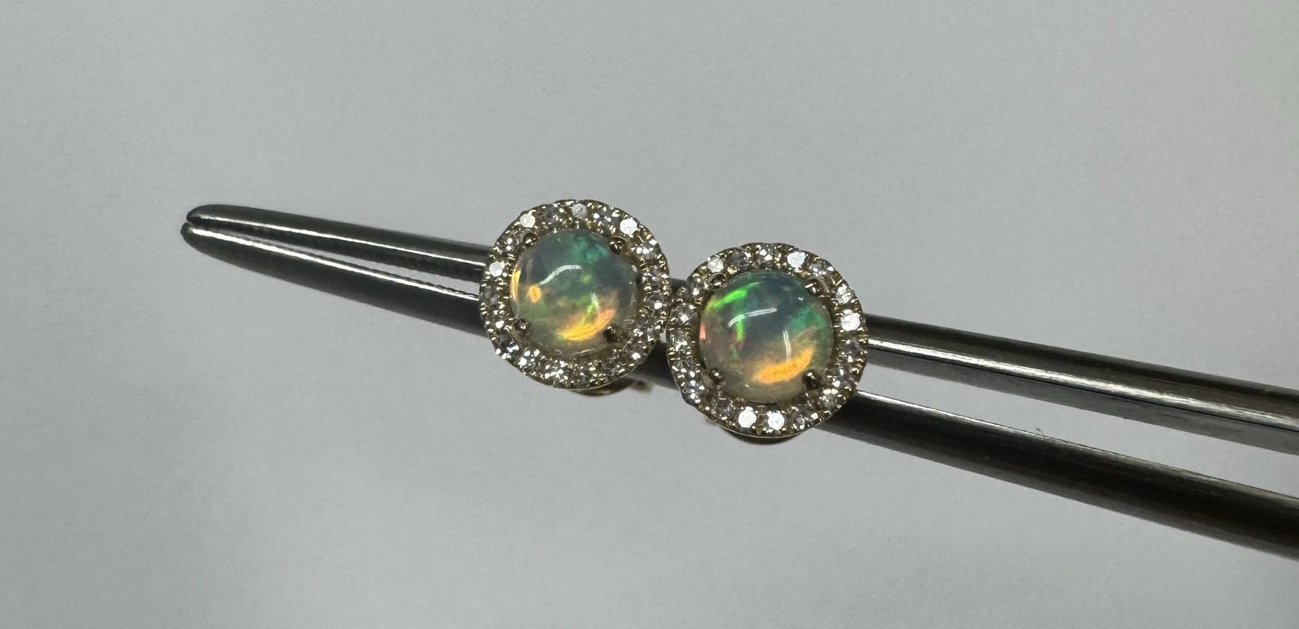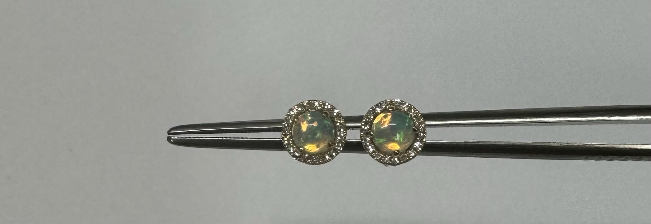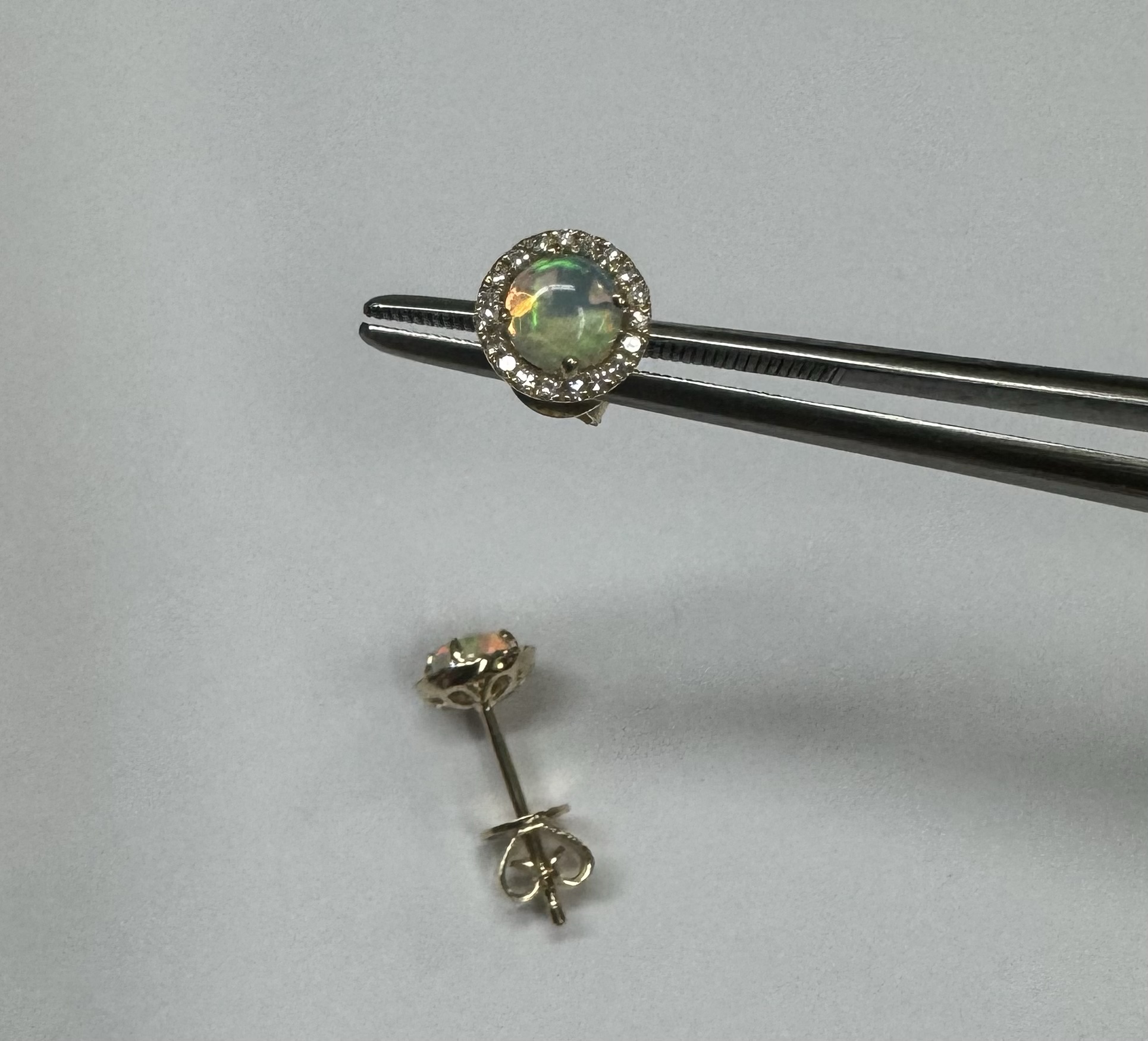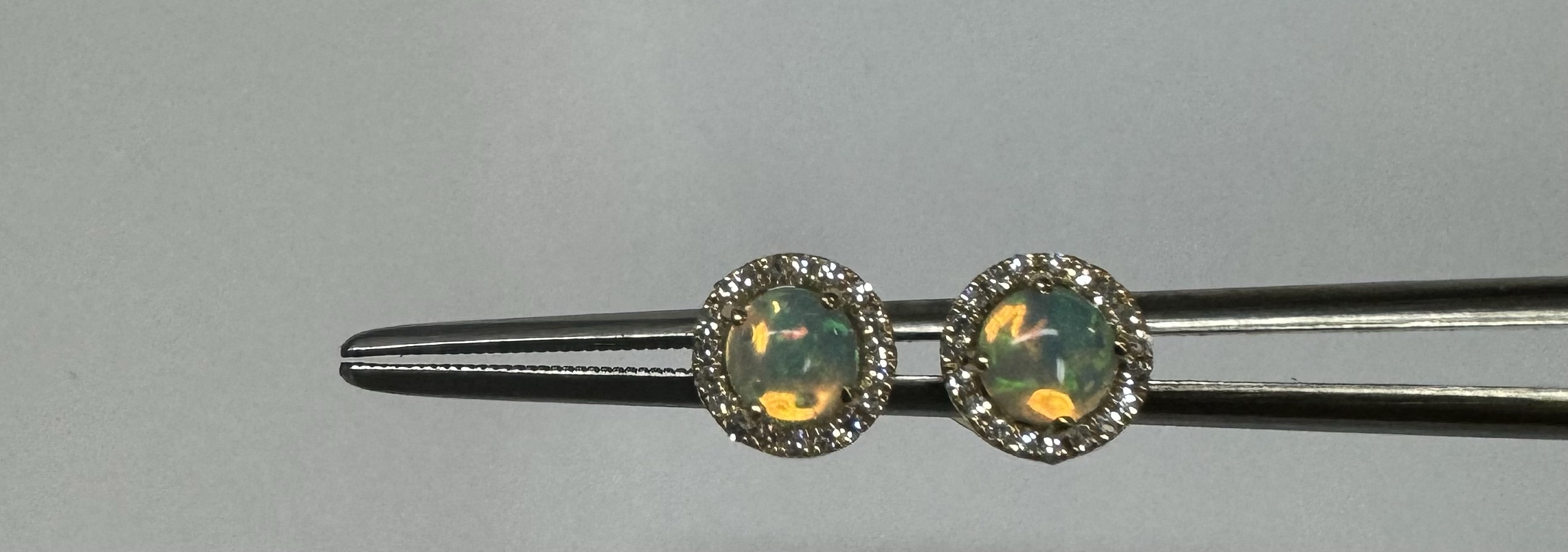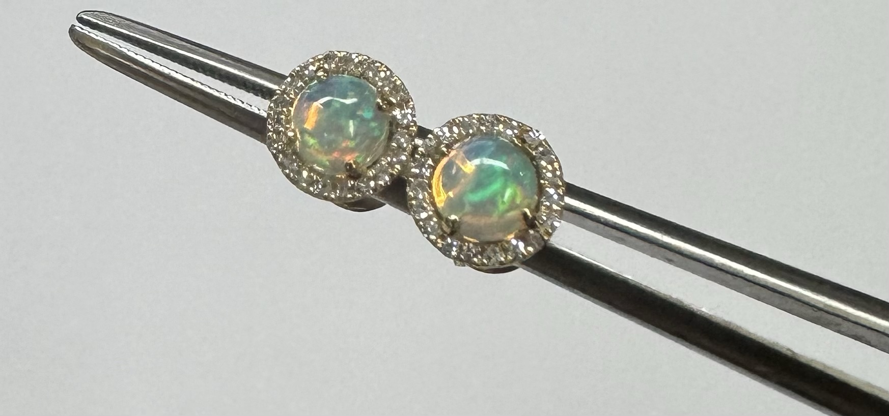 14k yellow gold genuine .40 cttw Opal & genuine .08 cttw Round Brilliant Cut diamond halo stud earrings. These diamonds average G-H in color and SI1 in clarity. These earrings have a total combined weight of 1.0 grams.