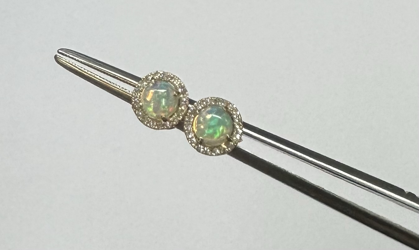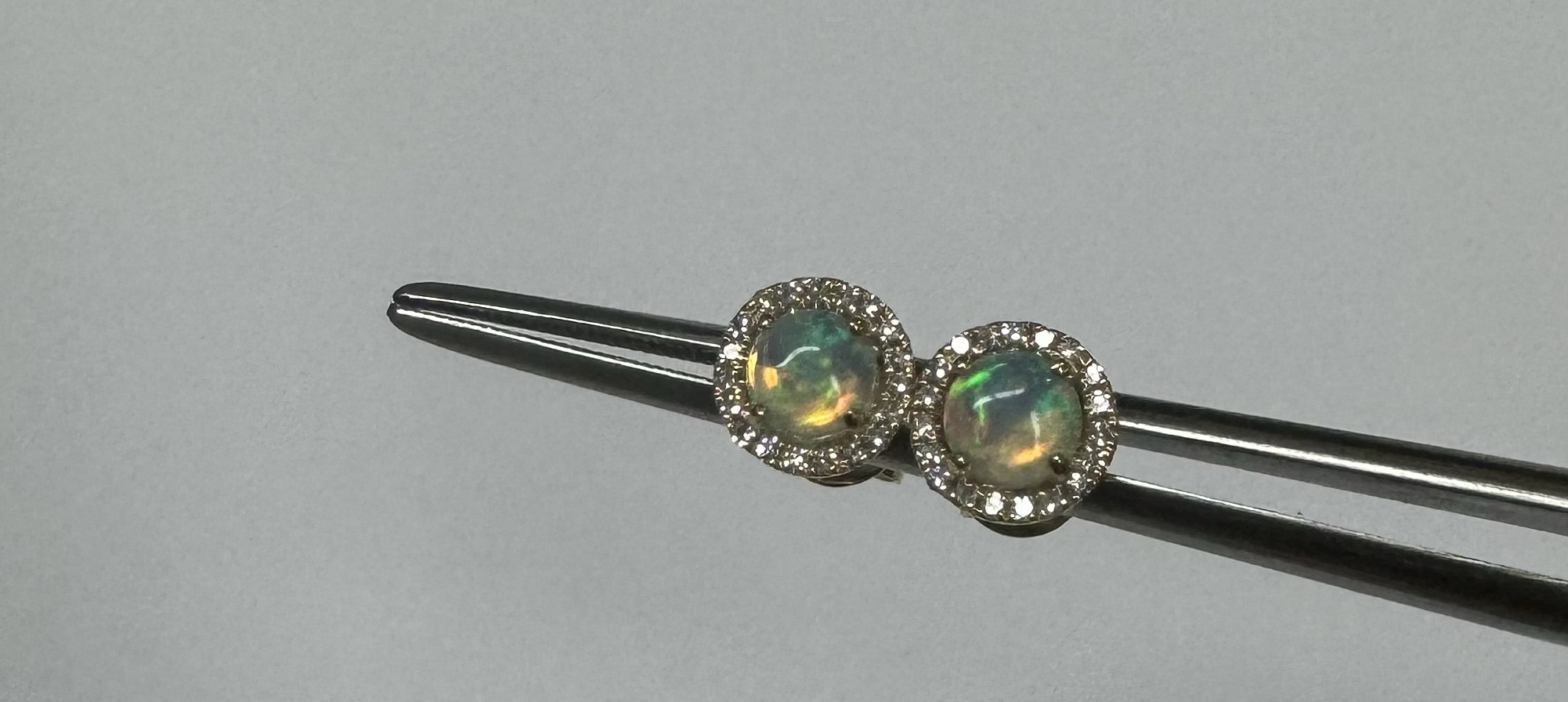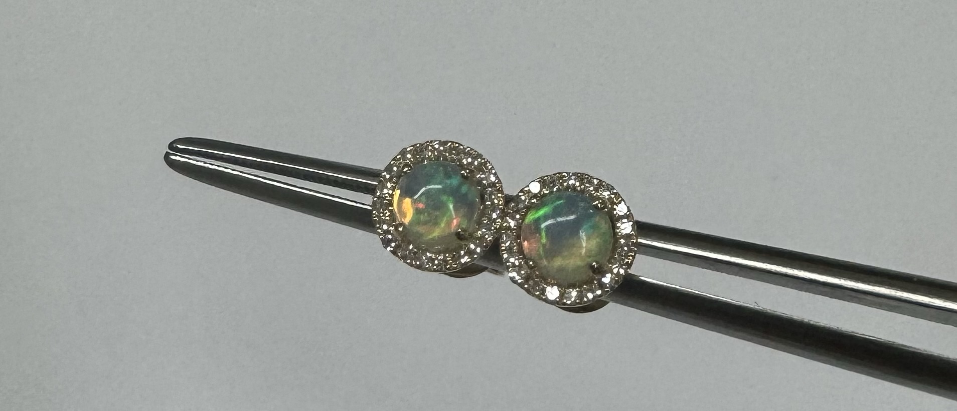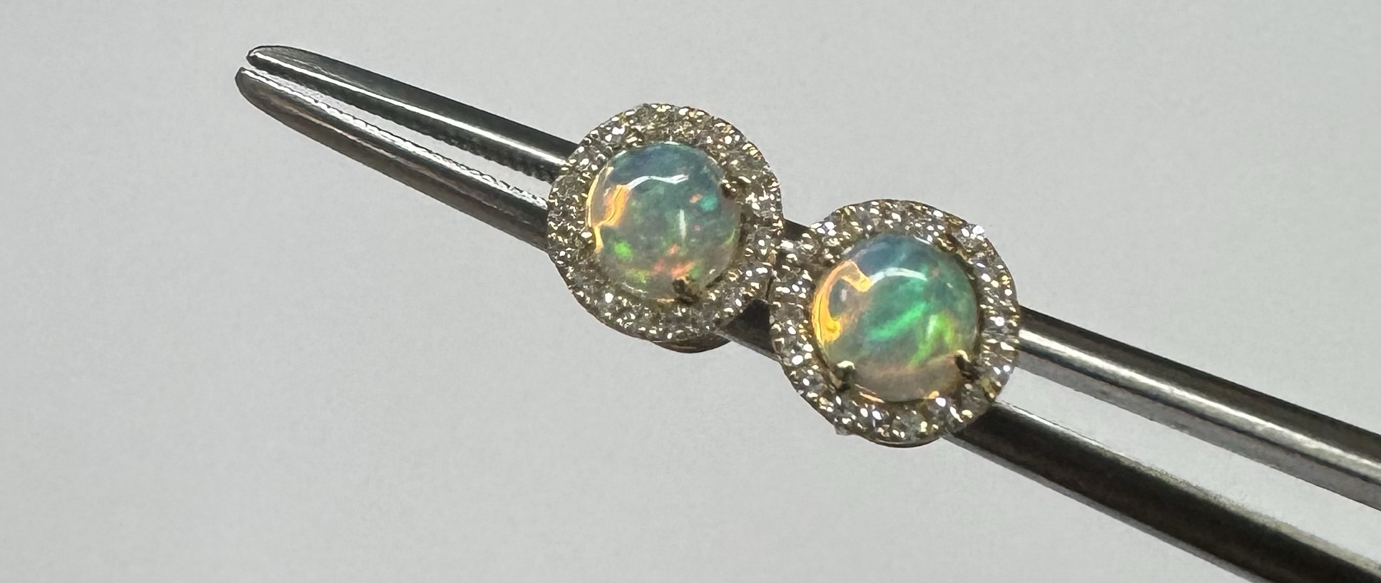 14k yellow gold genuine .40 cttw Opal & genuine .08 cttw Round Brilliant Cut diamond halo stud earrings. These diamonds average G-H in color and SI1 in clarity. These earrings have a total combined weight of 1.0 grams.