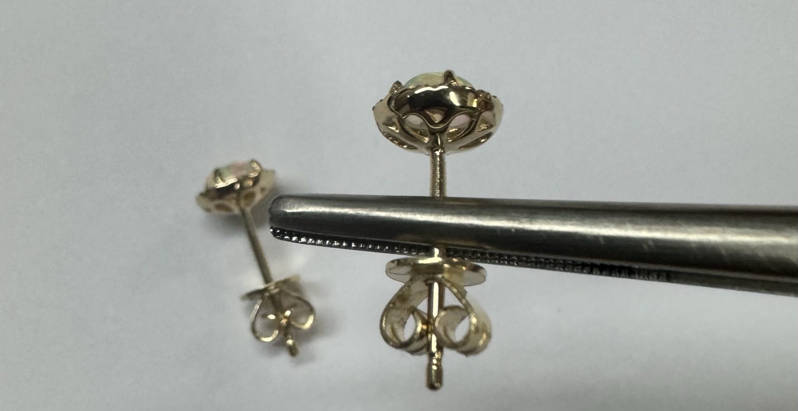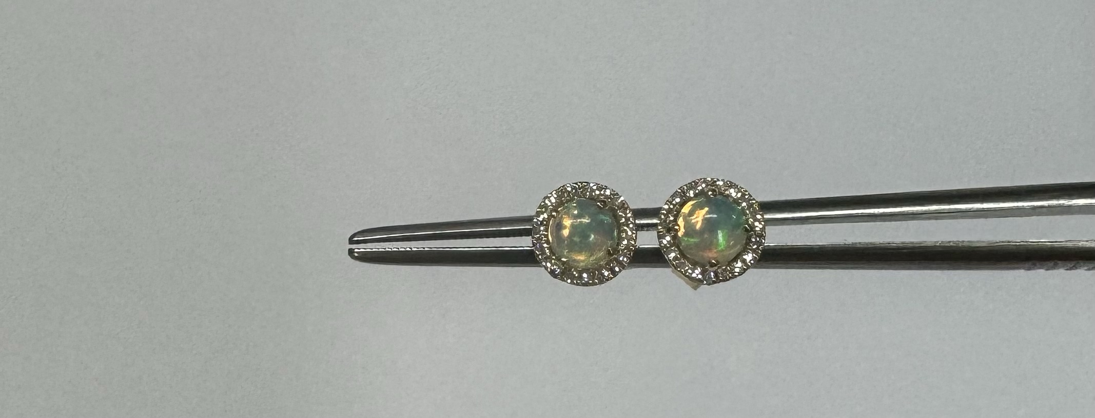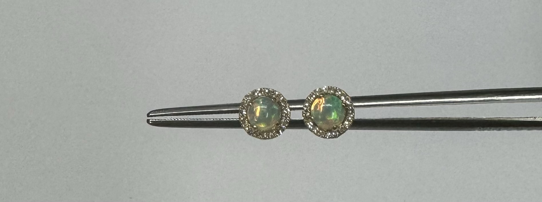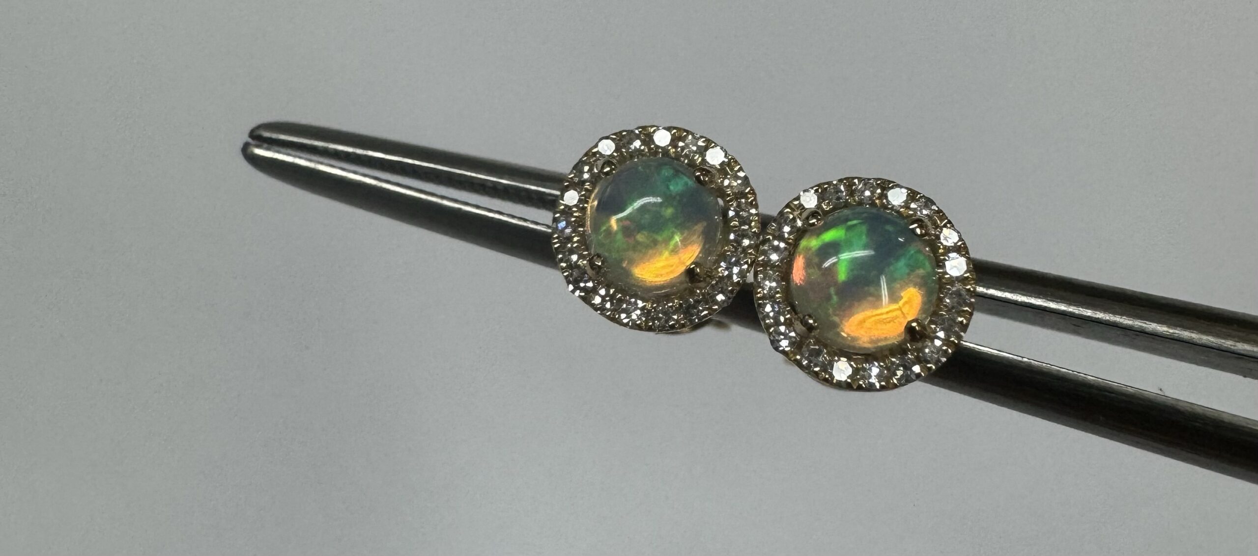14k yellow gold genuine .40 cttw Opal & genuine .08 cttw Round Brilliant Cut diamond halo stud earrings. These diamonds average G-H in color and SI1 in clarity. These earrings have a total combined weight of 1.0 grams.