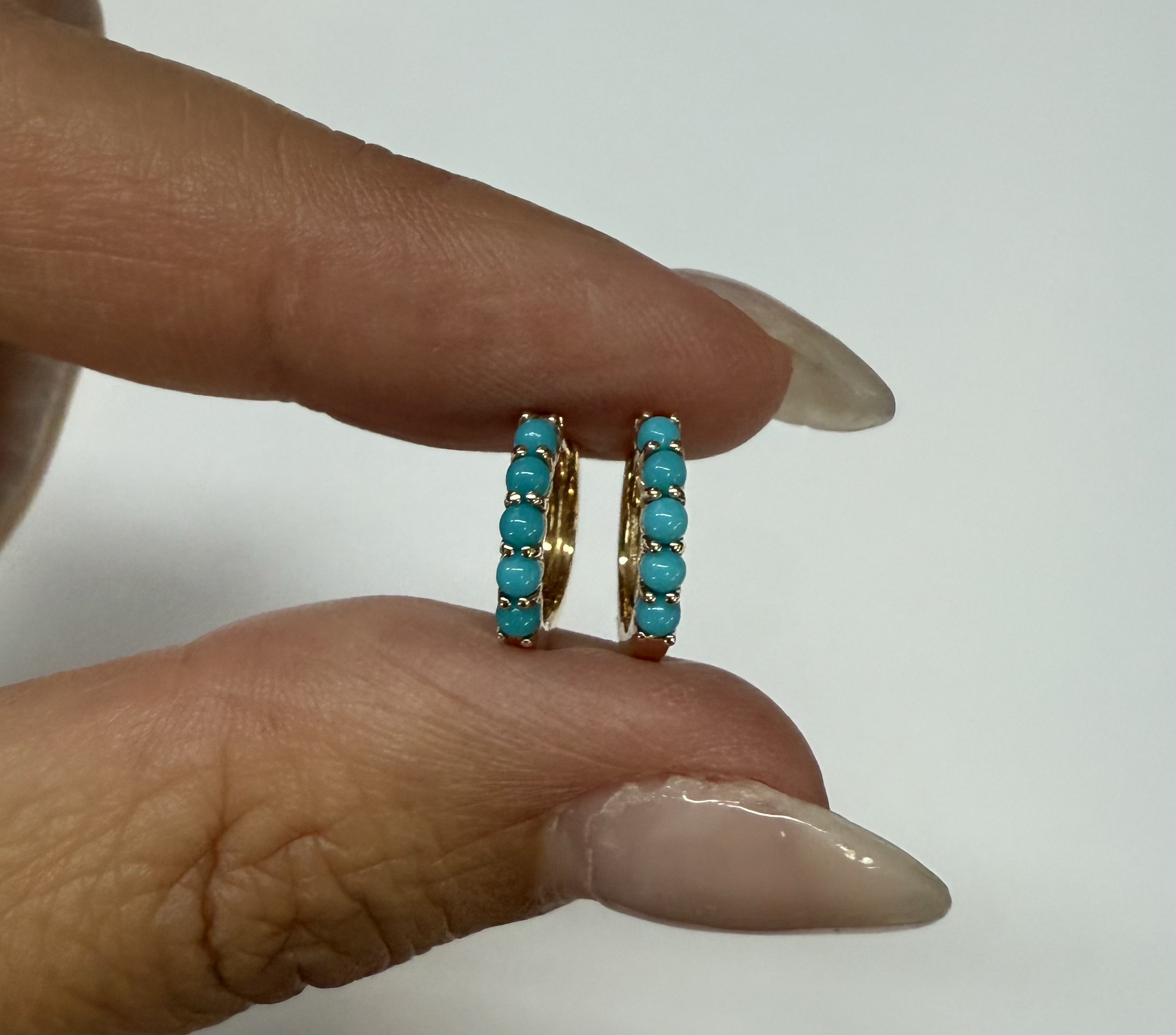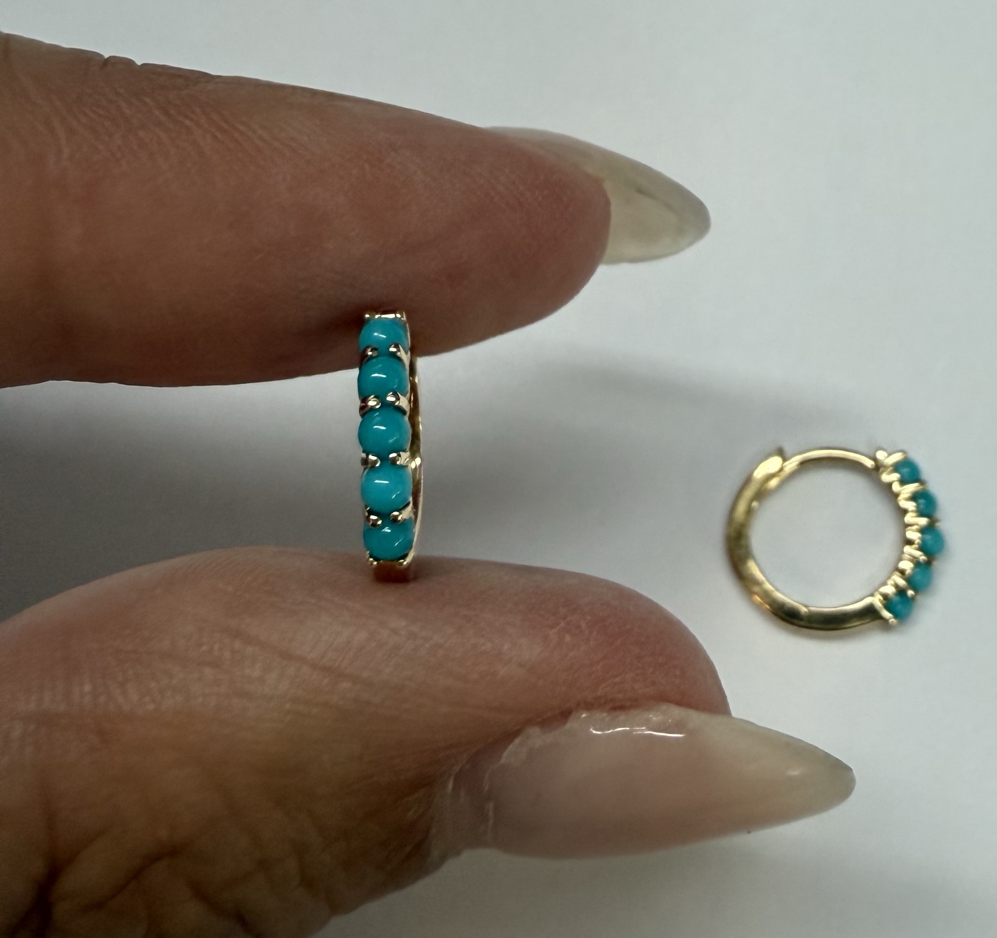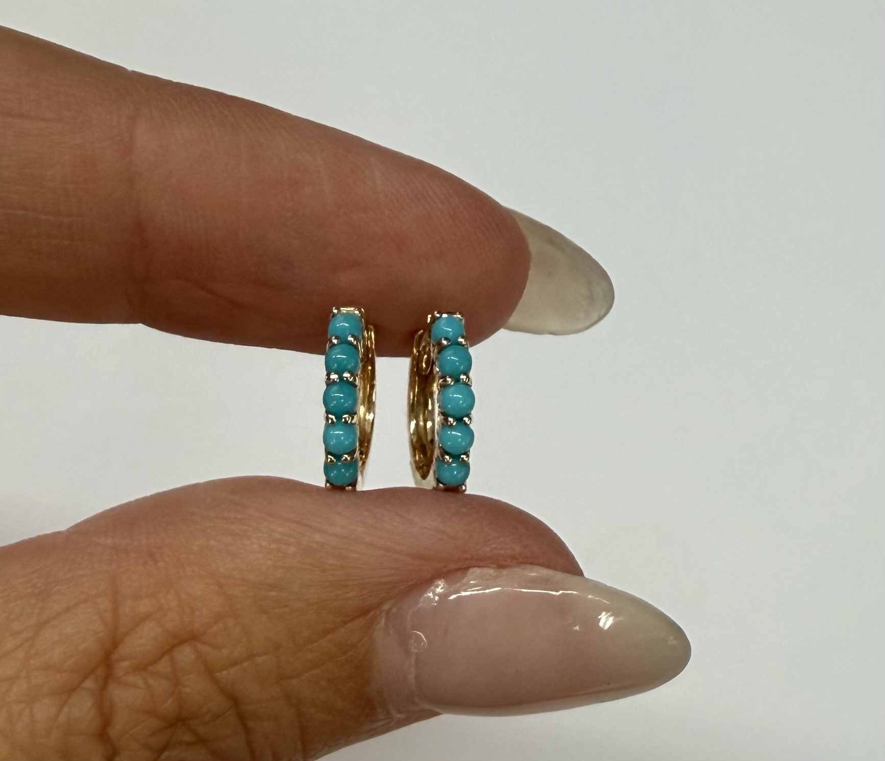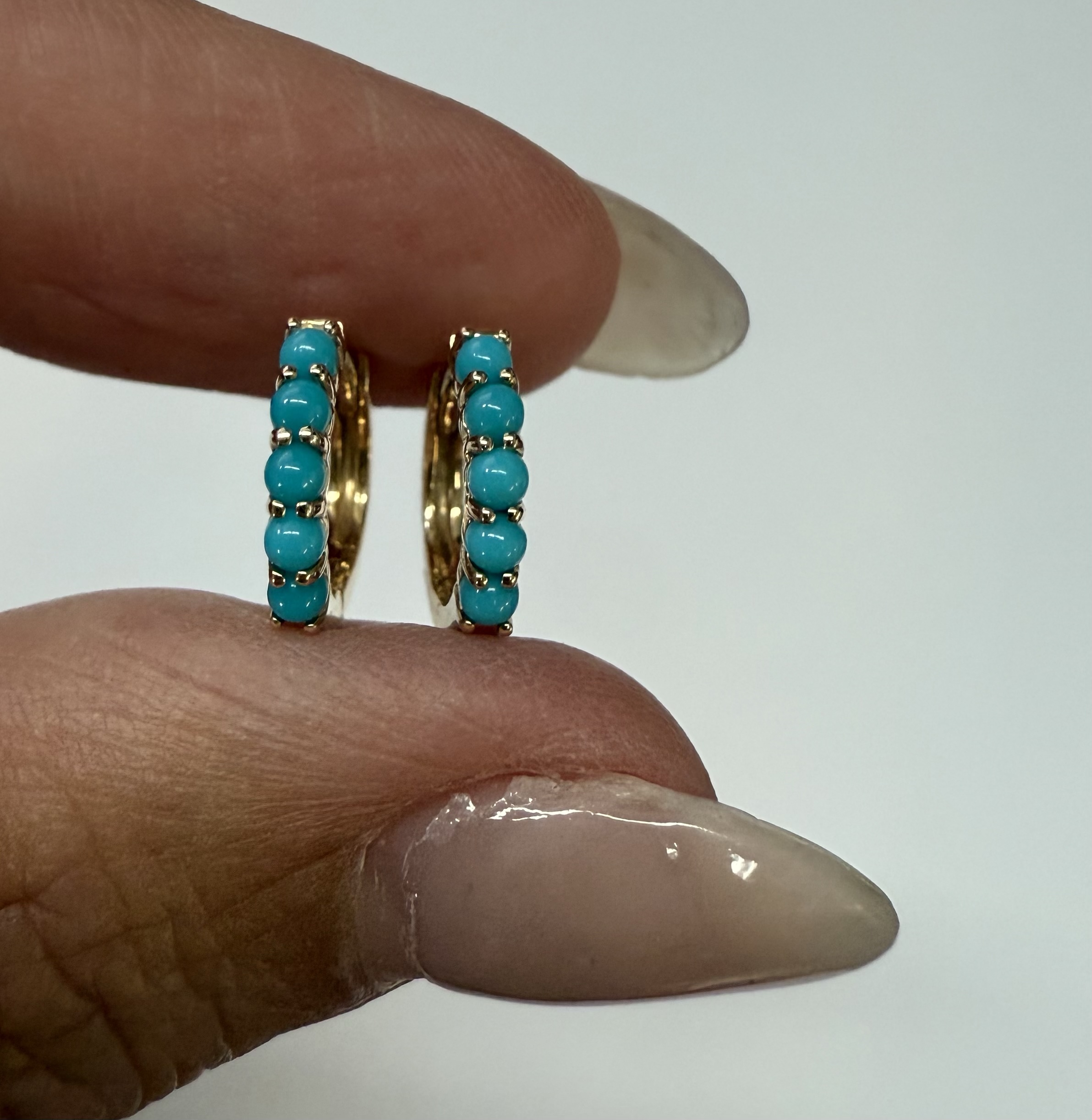 14k Yellow Gold Genuine .47 Cttw Turquoise (10 stone) Huggy Hoop Earrings. These earrings have an entire weight of 1.6 grams.
