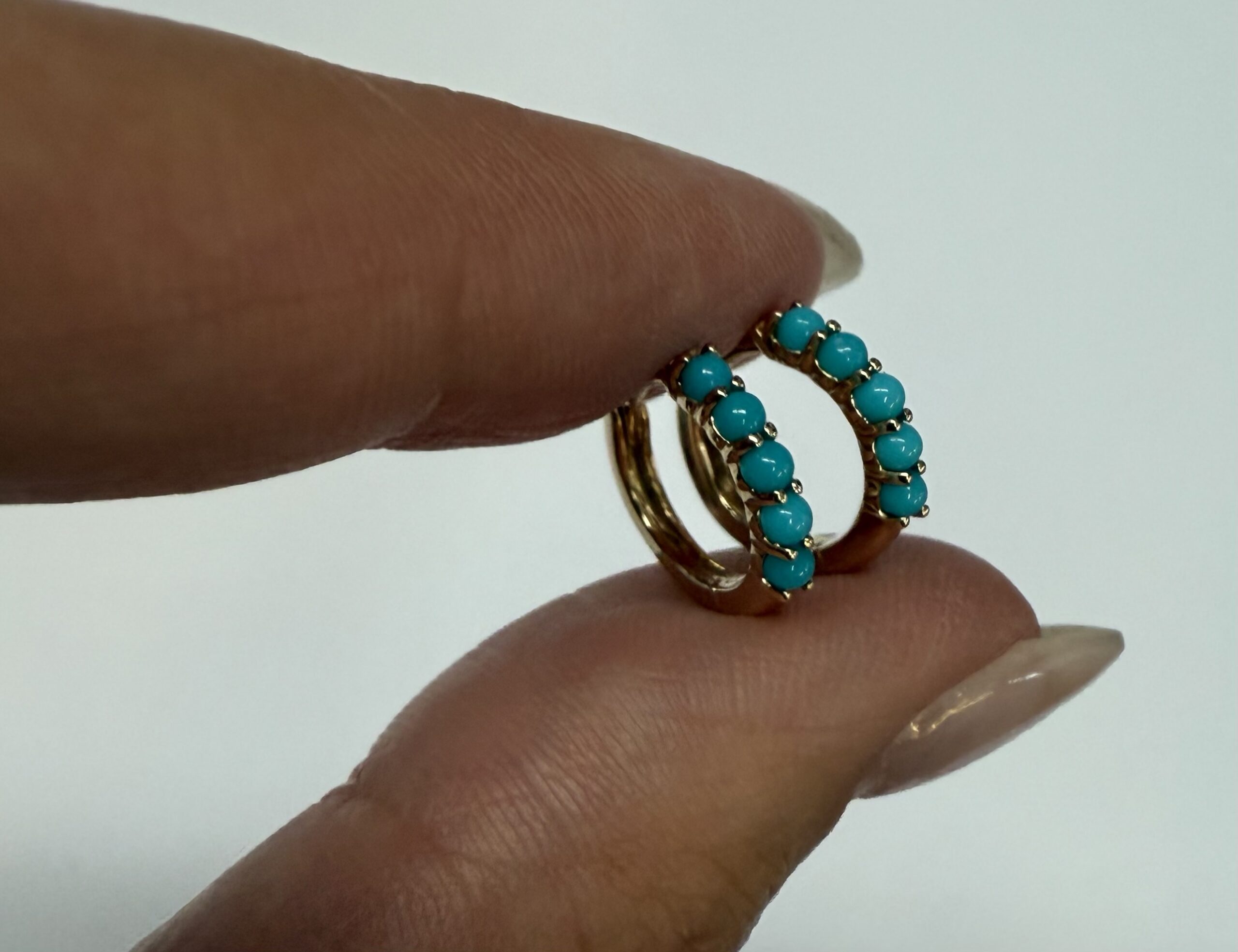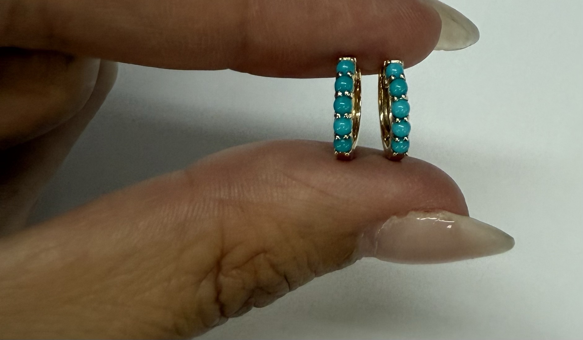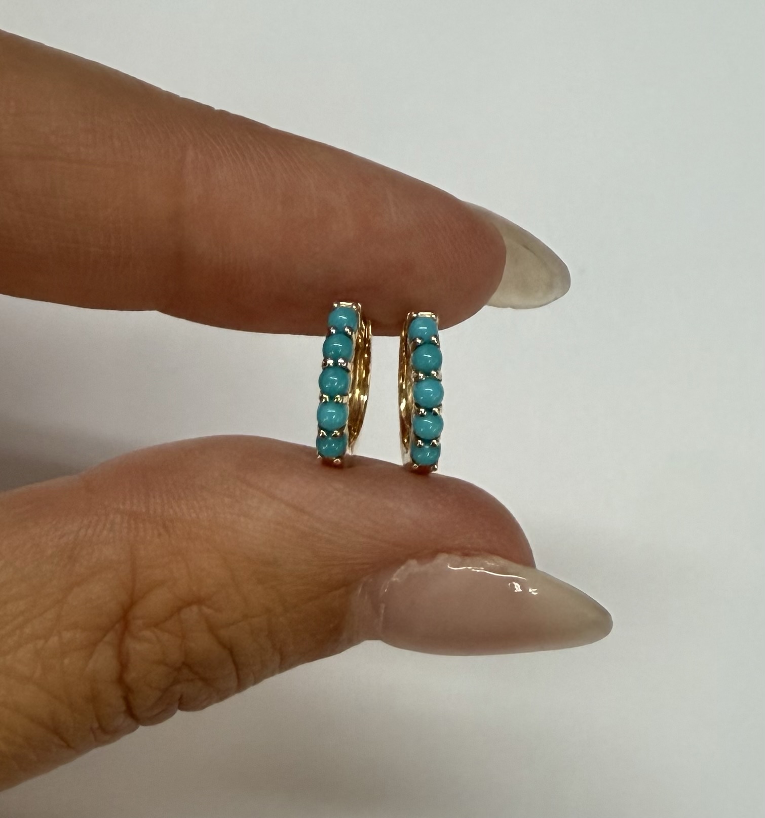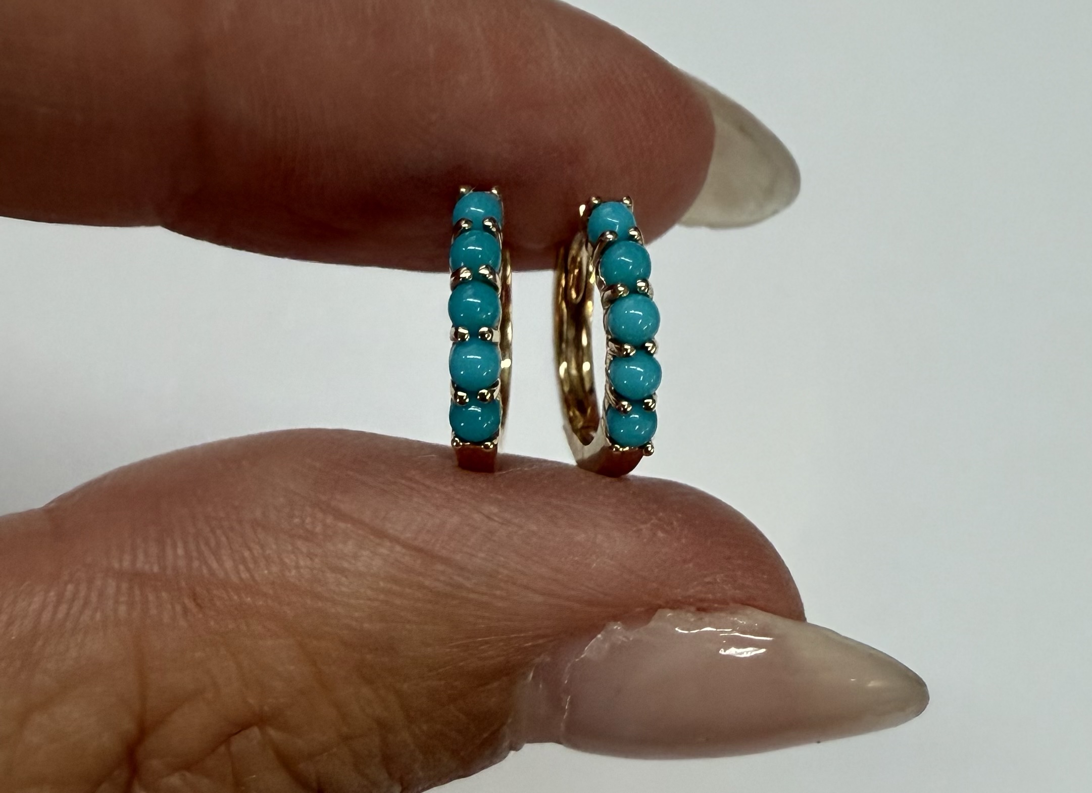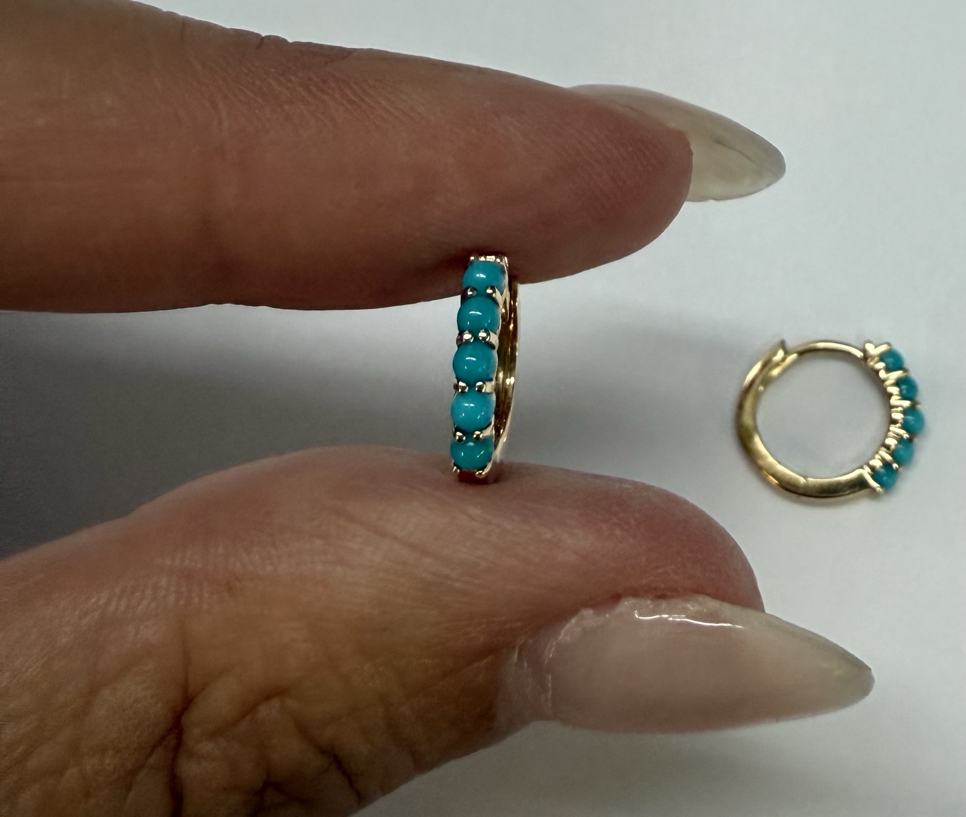 14k Yellow Gold Genuine .47 Cttw Turquoise (10 stone) Huggy Hoop Earrings. These earrings have an entire weight of 1.6 grams.