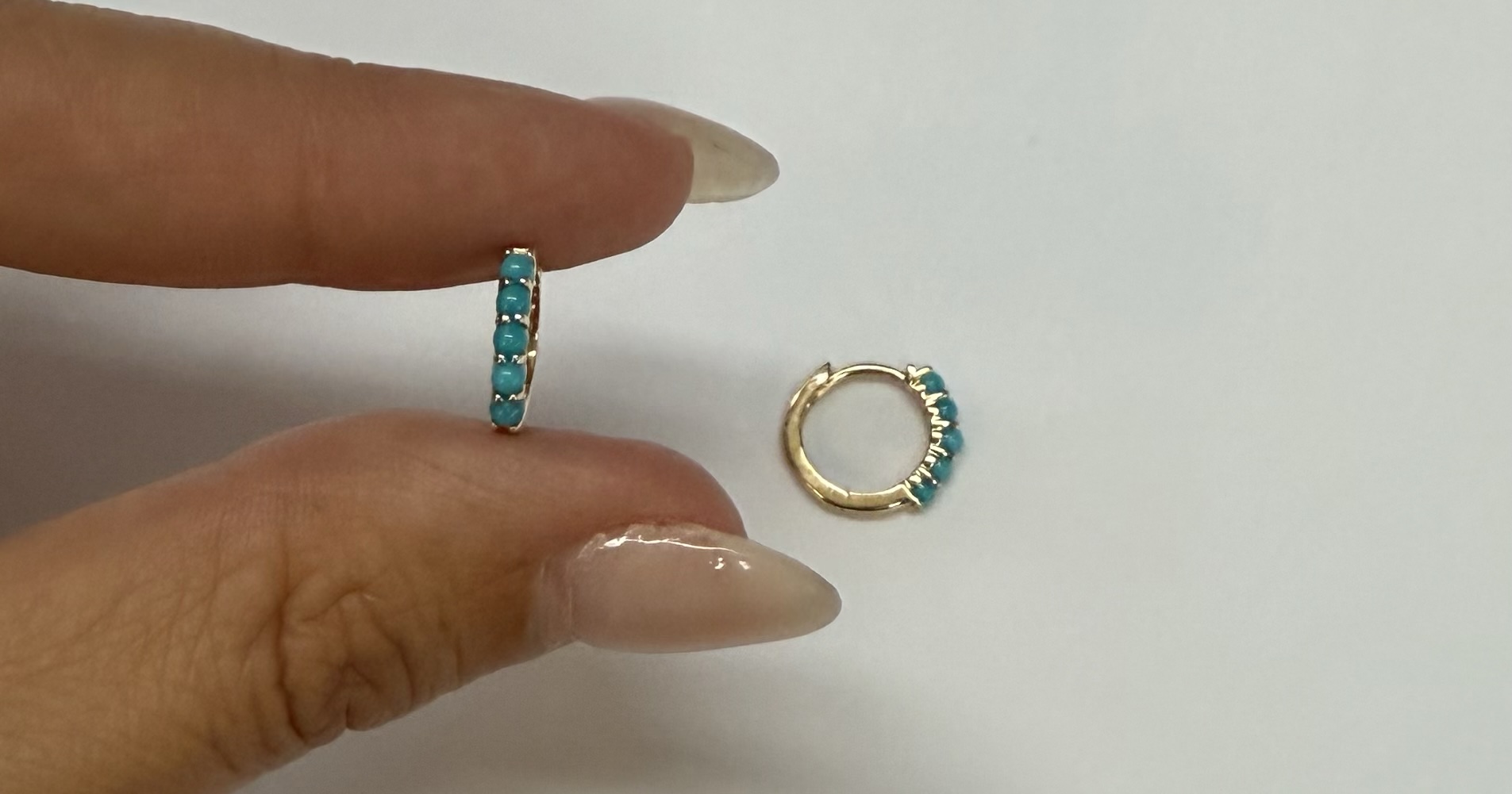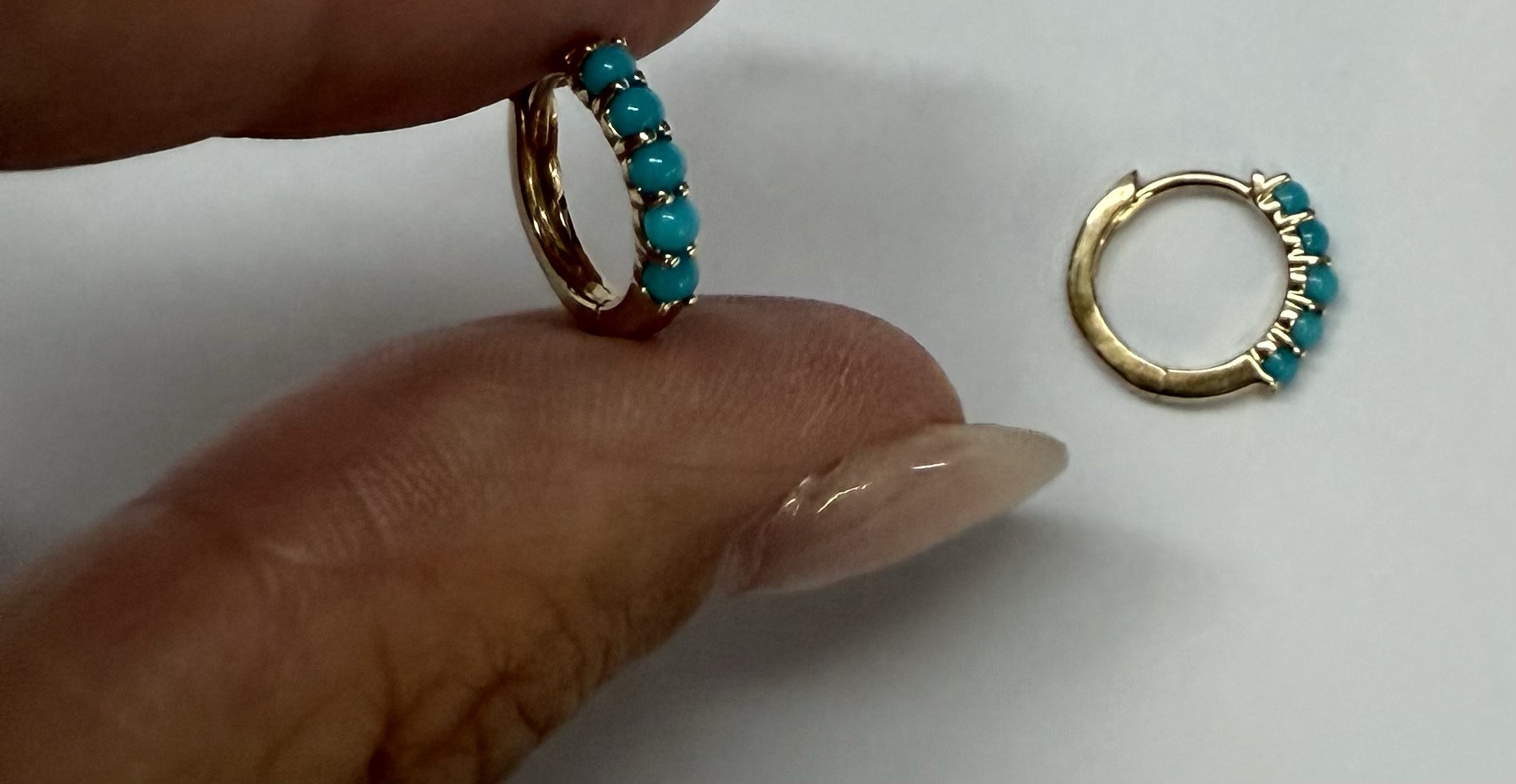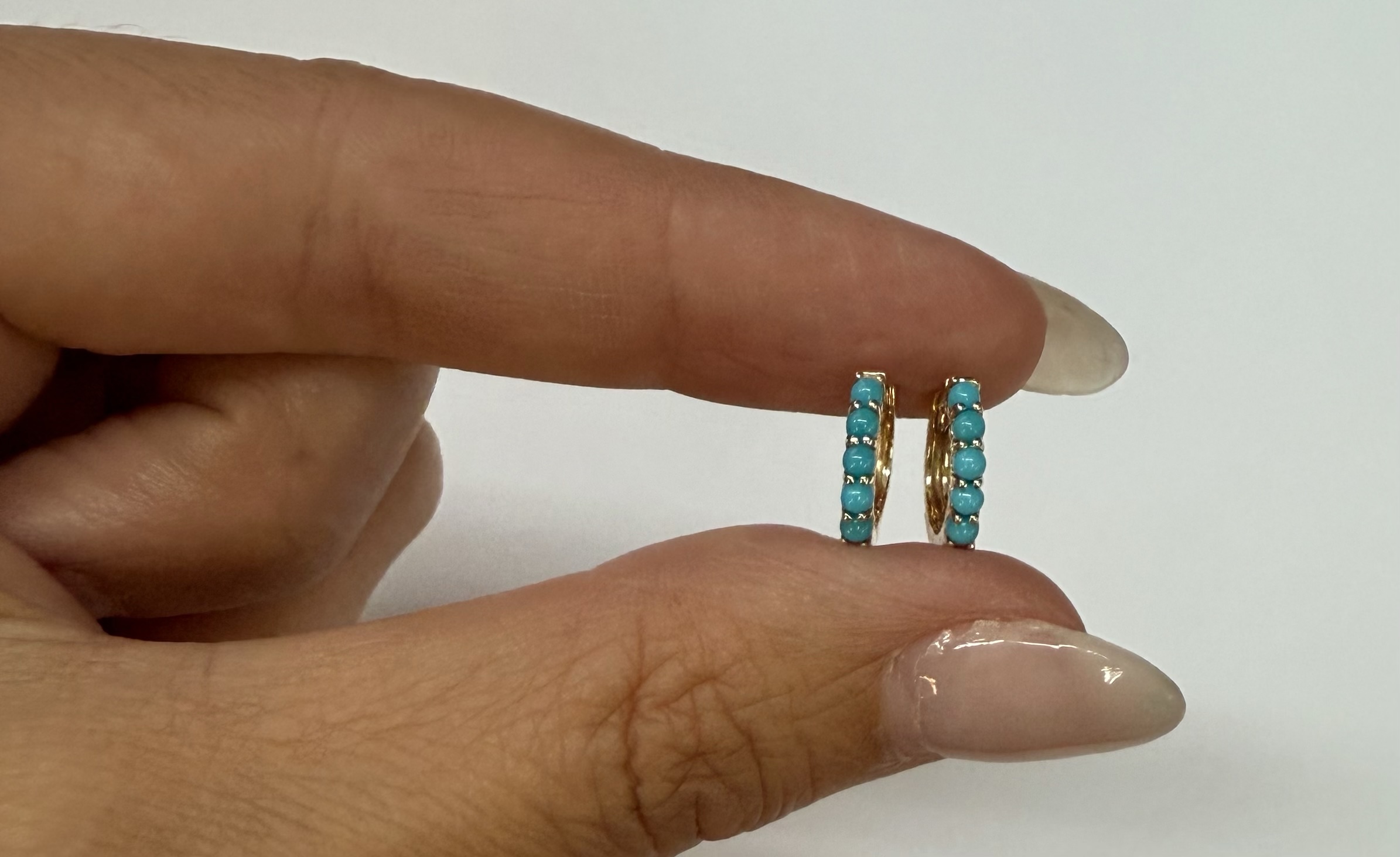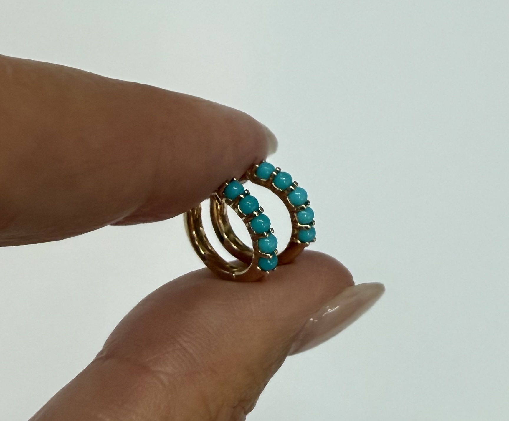 14k Yellow Gold Genuine .47 Cttw Turquoise (10 stone) Huggy Hoop Earrings. These earrings have an entire weight of 1.6 grams.
