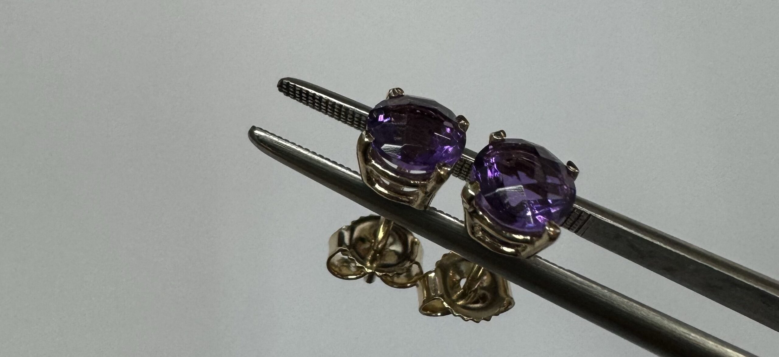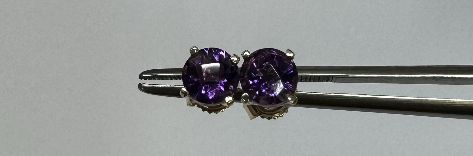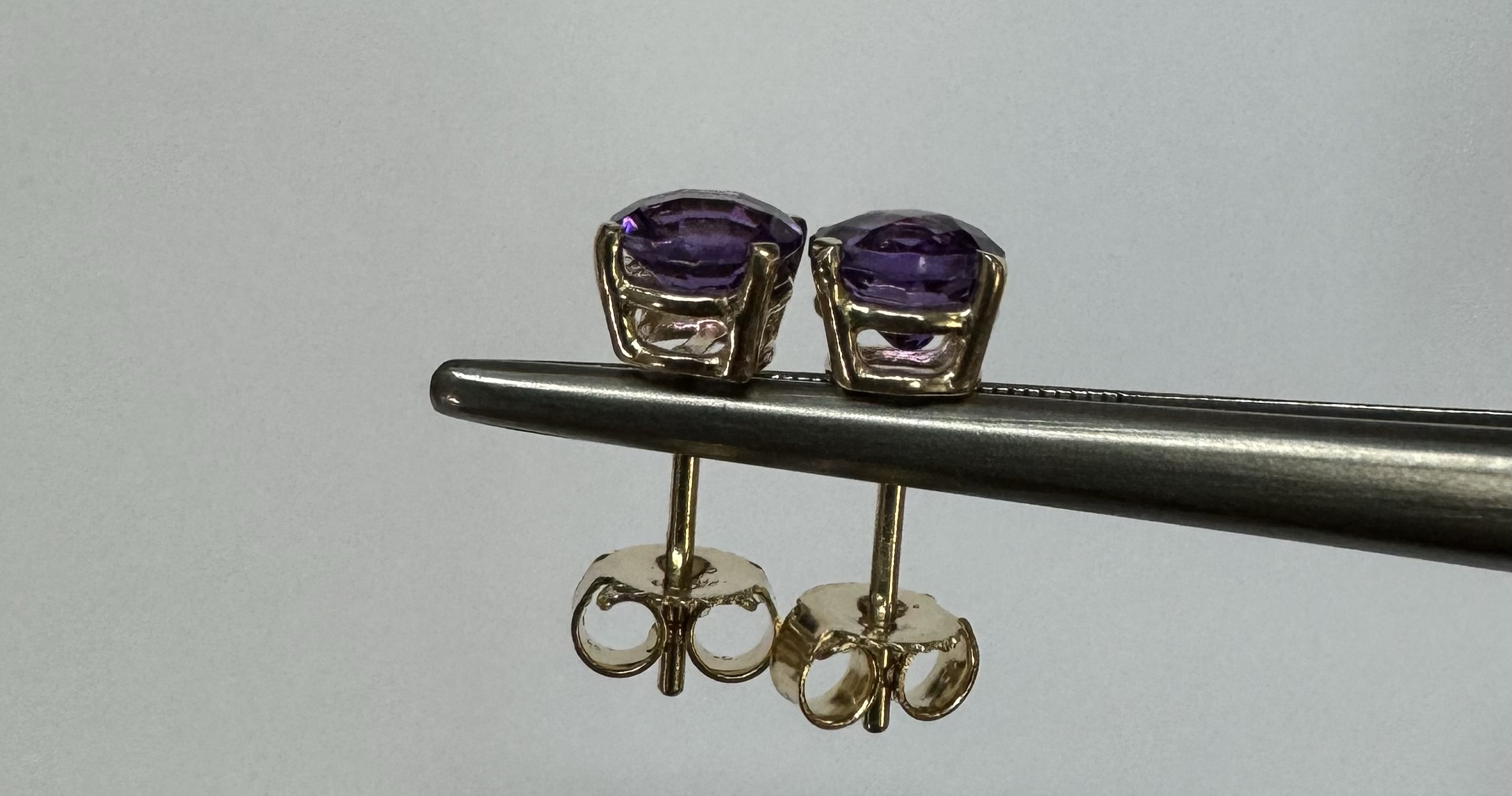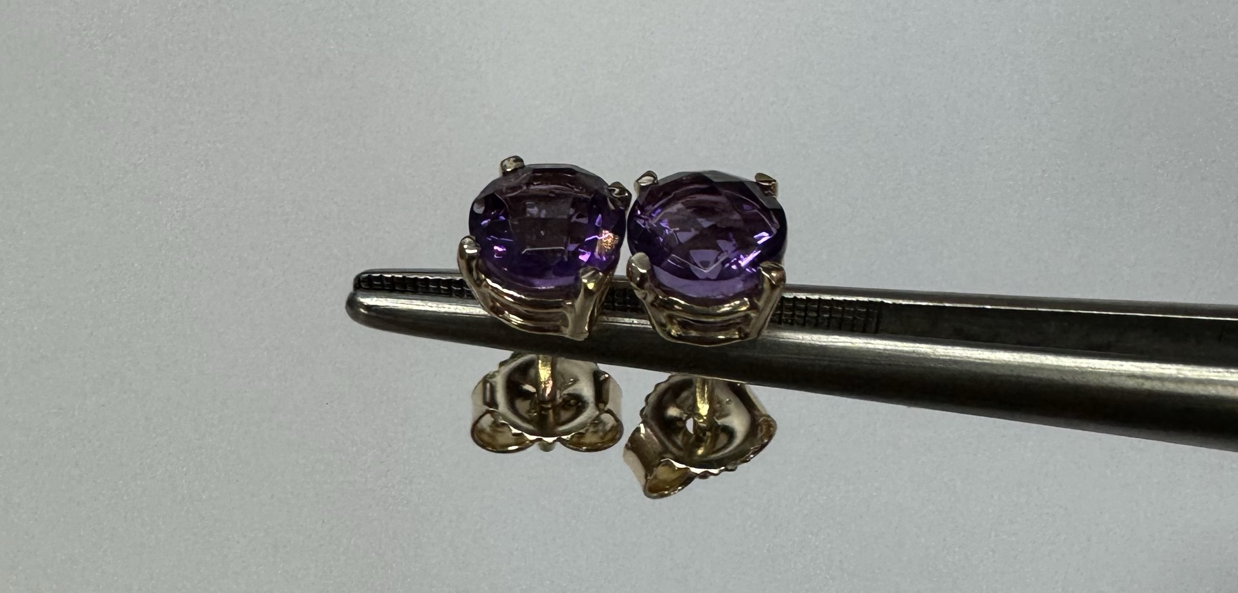 14k yellow gold 5 mm round faceted Amethyst set four prong basket set stud earrings. These earrings have a total combined weight of 0.9 grams.