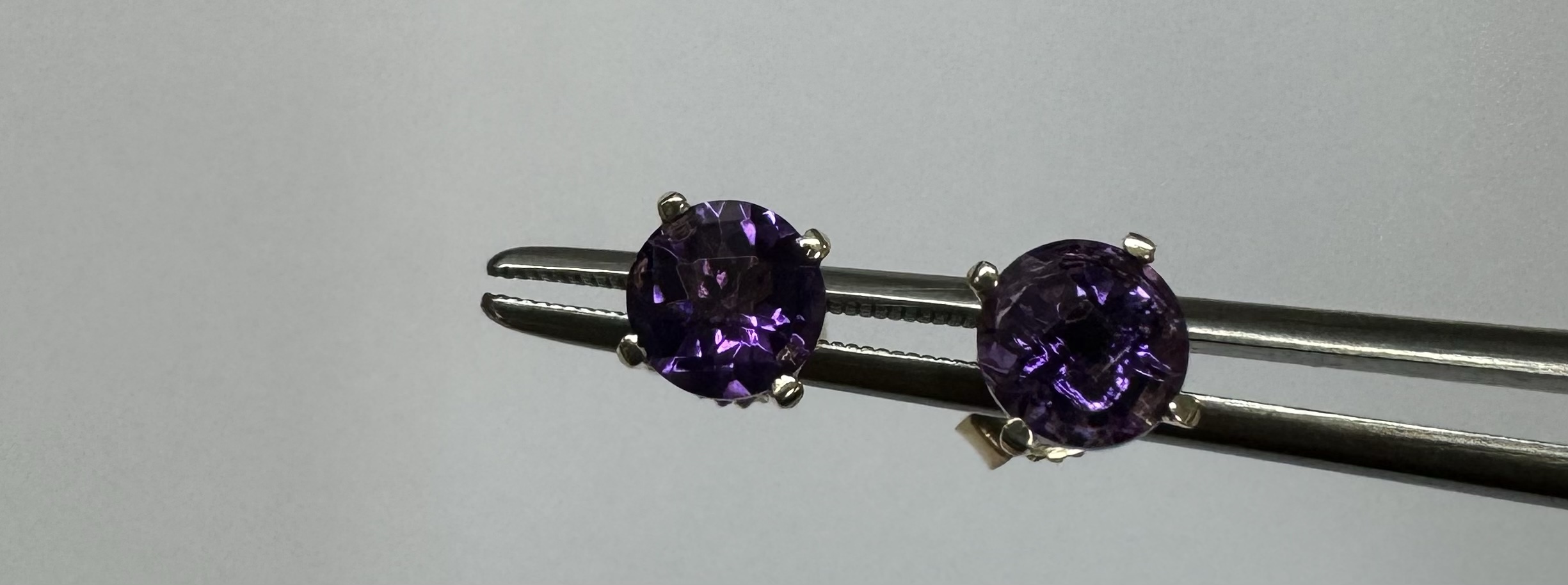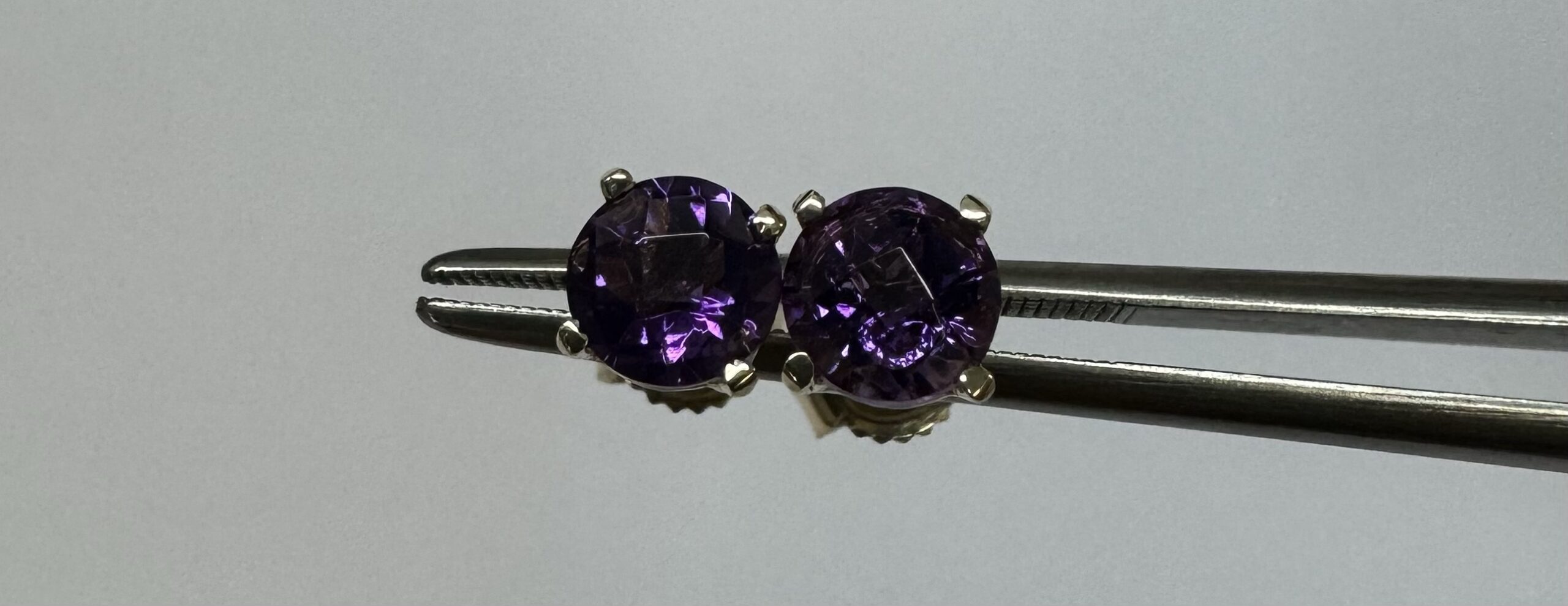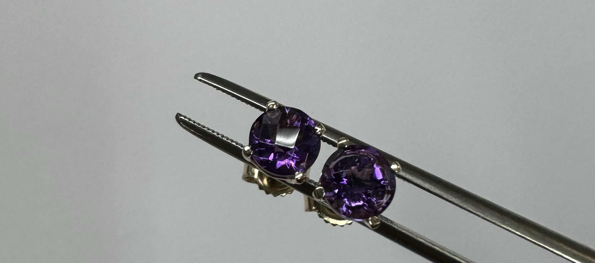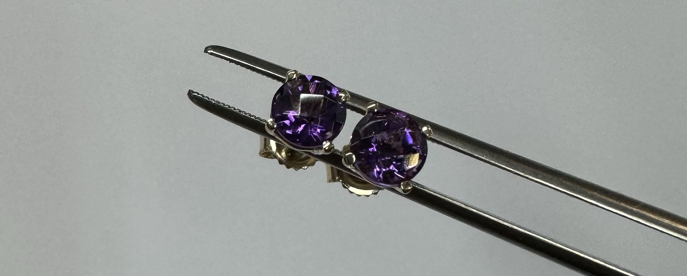 14k yellow gold 5 mm round faceted Amethyst set four prong basket set stud earrings. These earrings have a total combined weight of 0.9 grams.