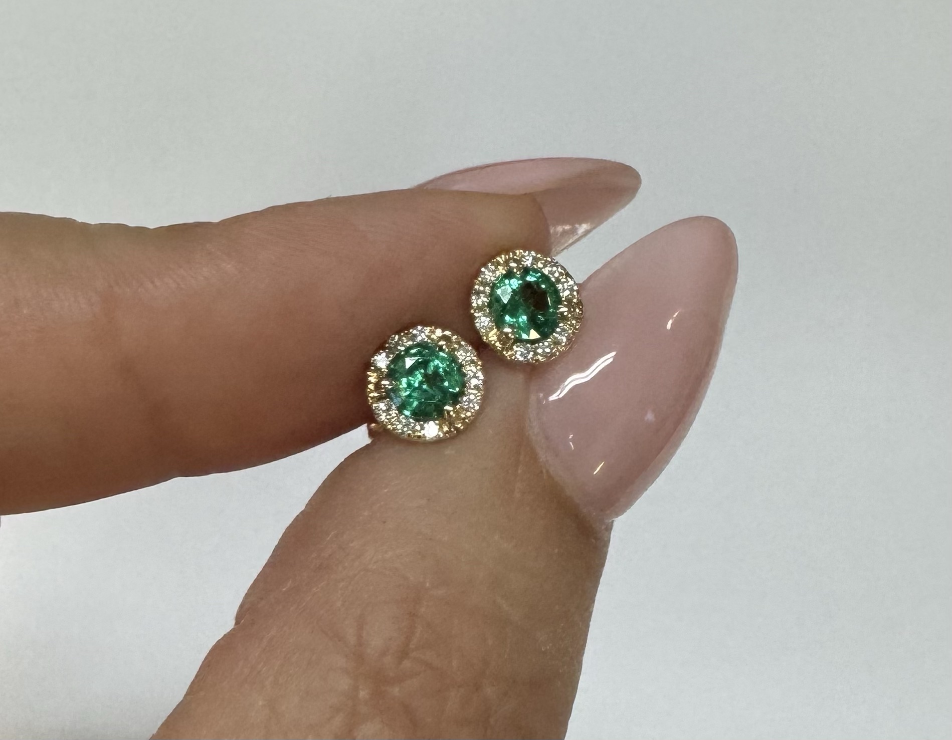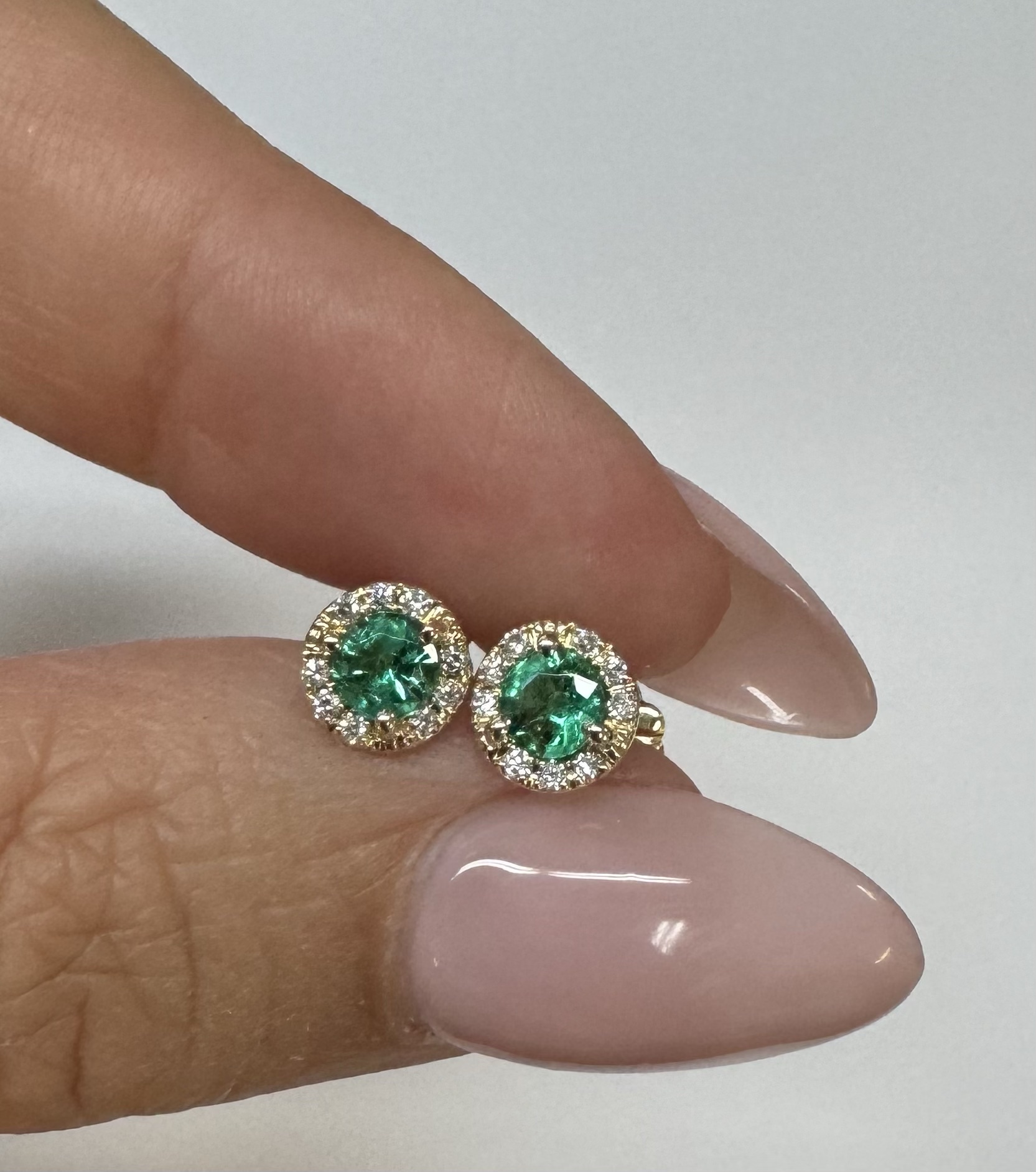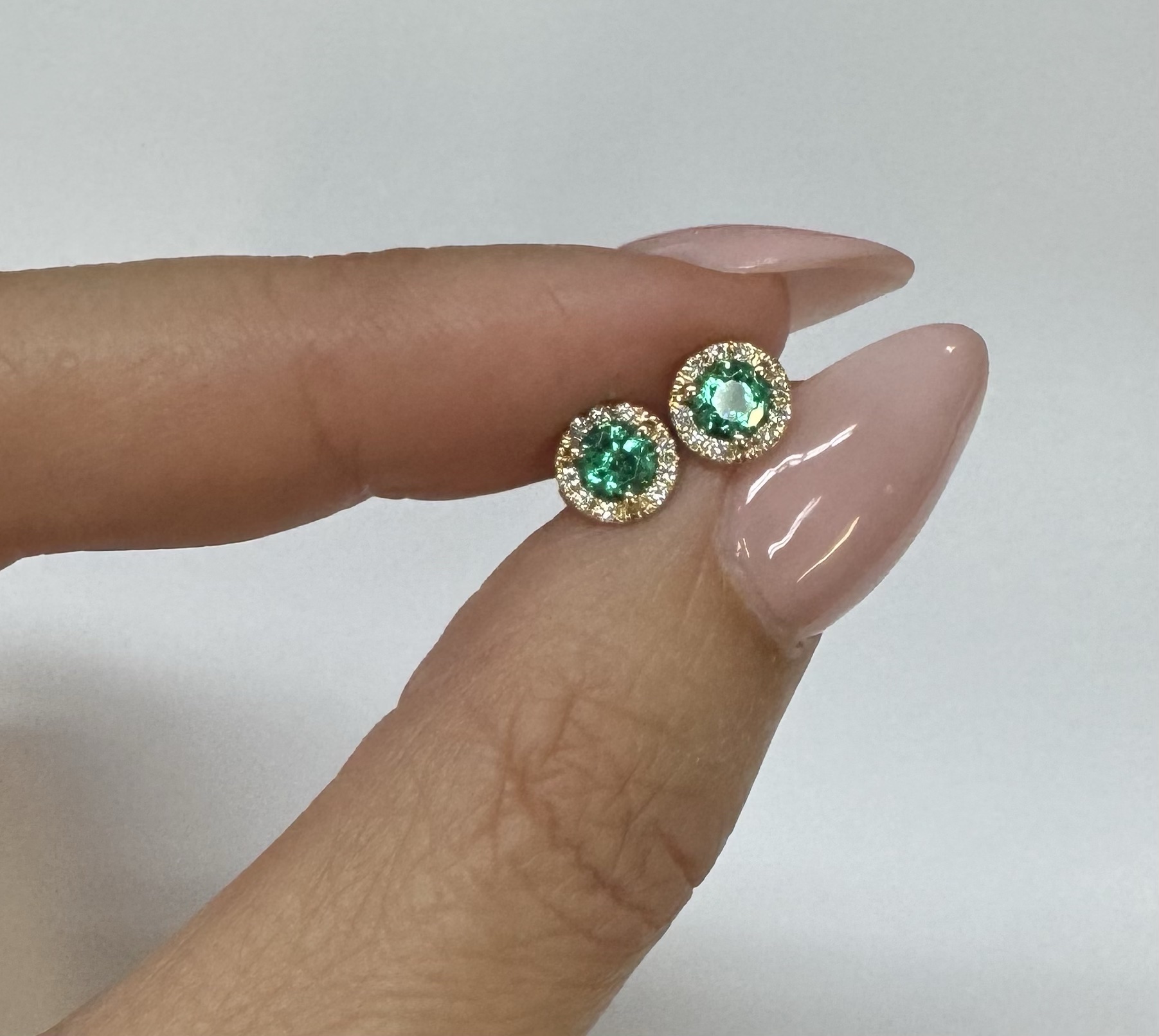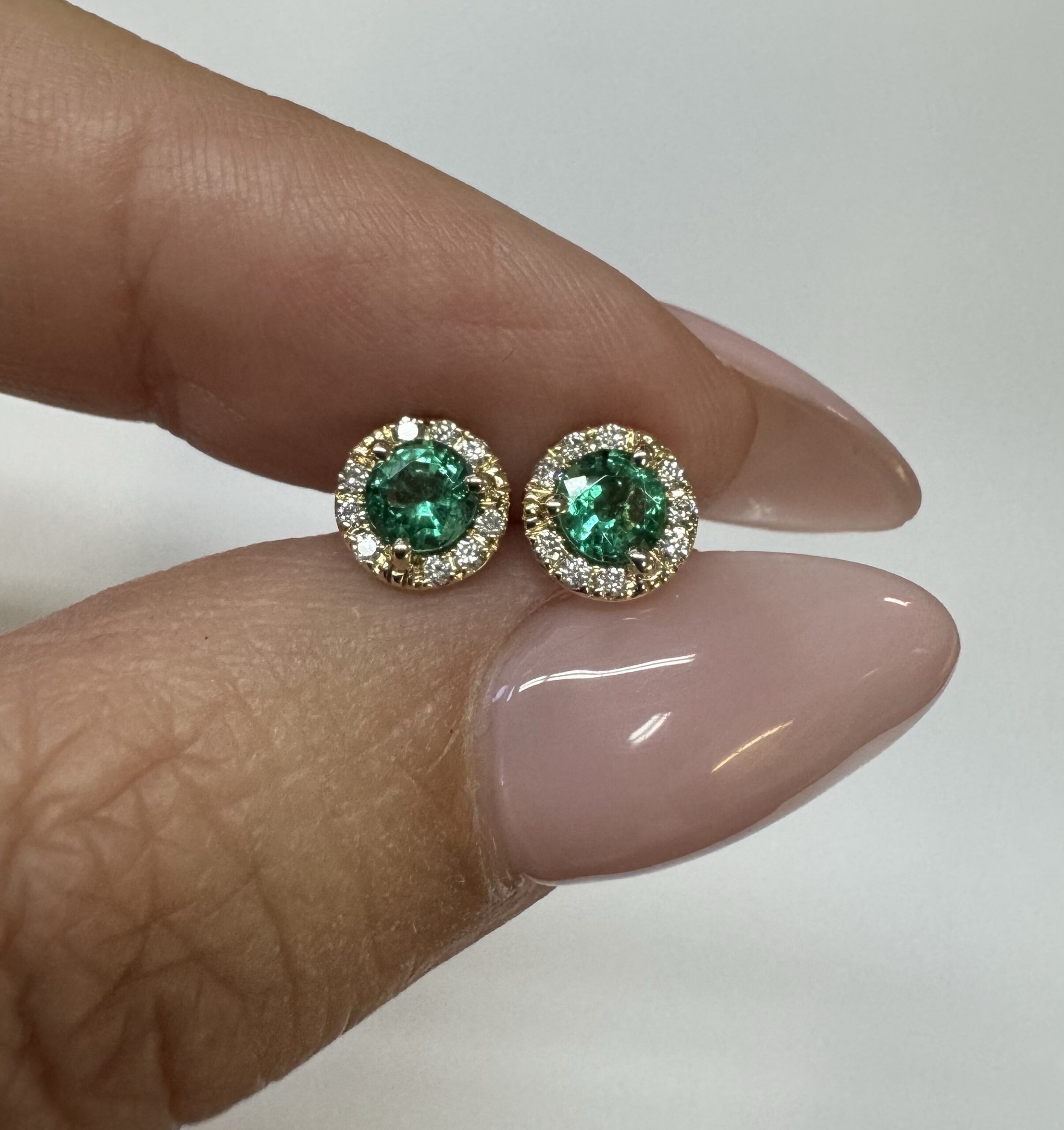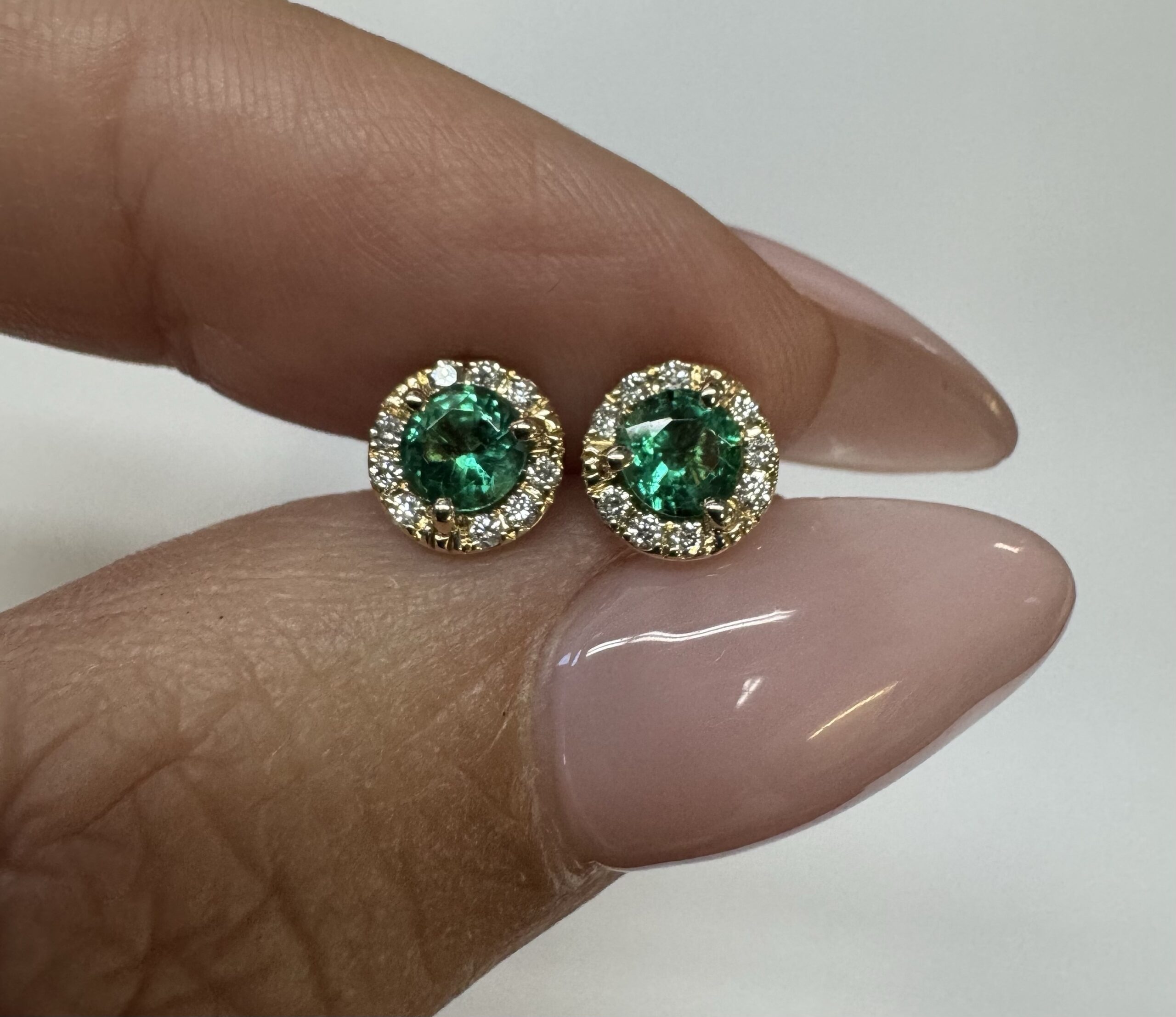 14k yellow gold genuine round, faceted .52 cttw Emerald & .10 cttw genuine Round Brilliant Cut diamond halo stud earrings. These diamonds average G-H in color and SI1 in clarity. These earrings have an entire weight of 1.0 grams.