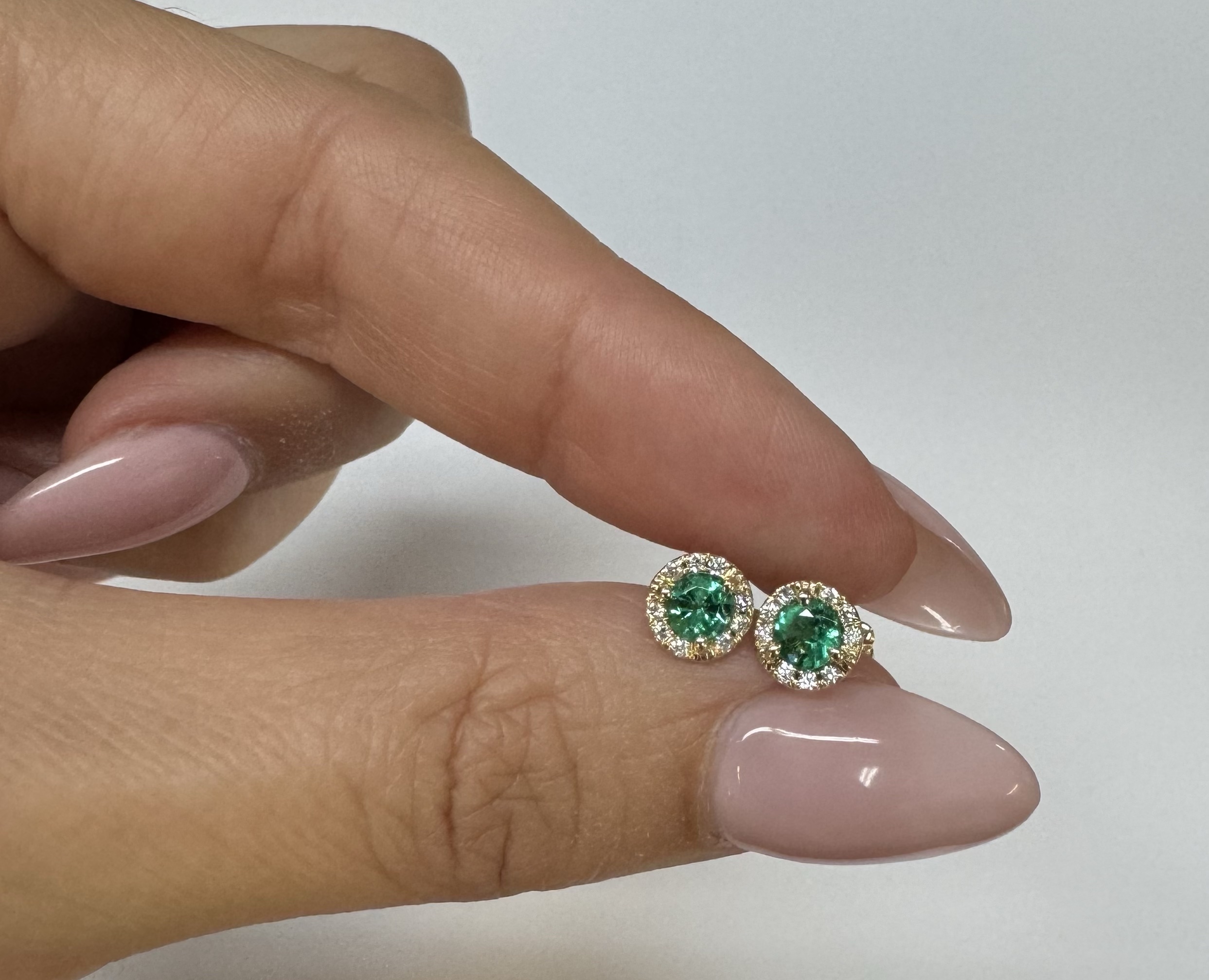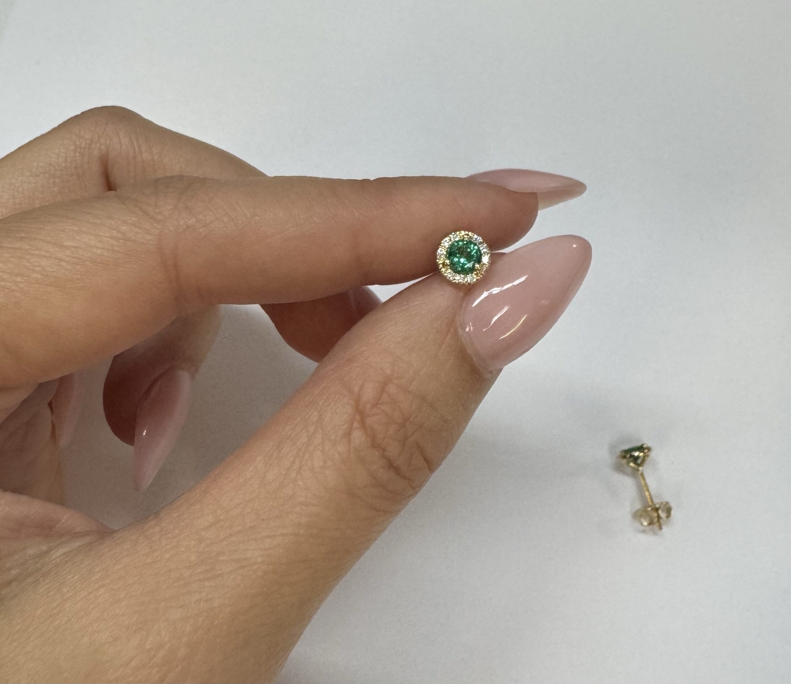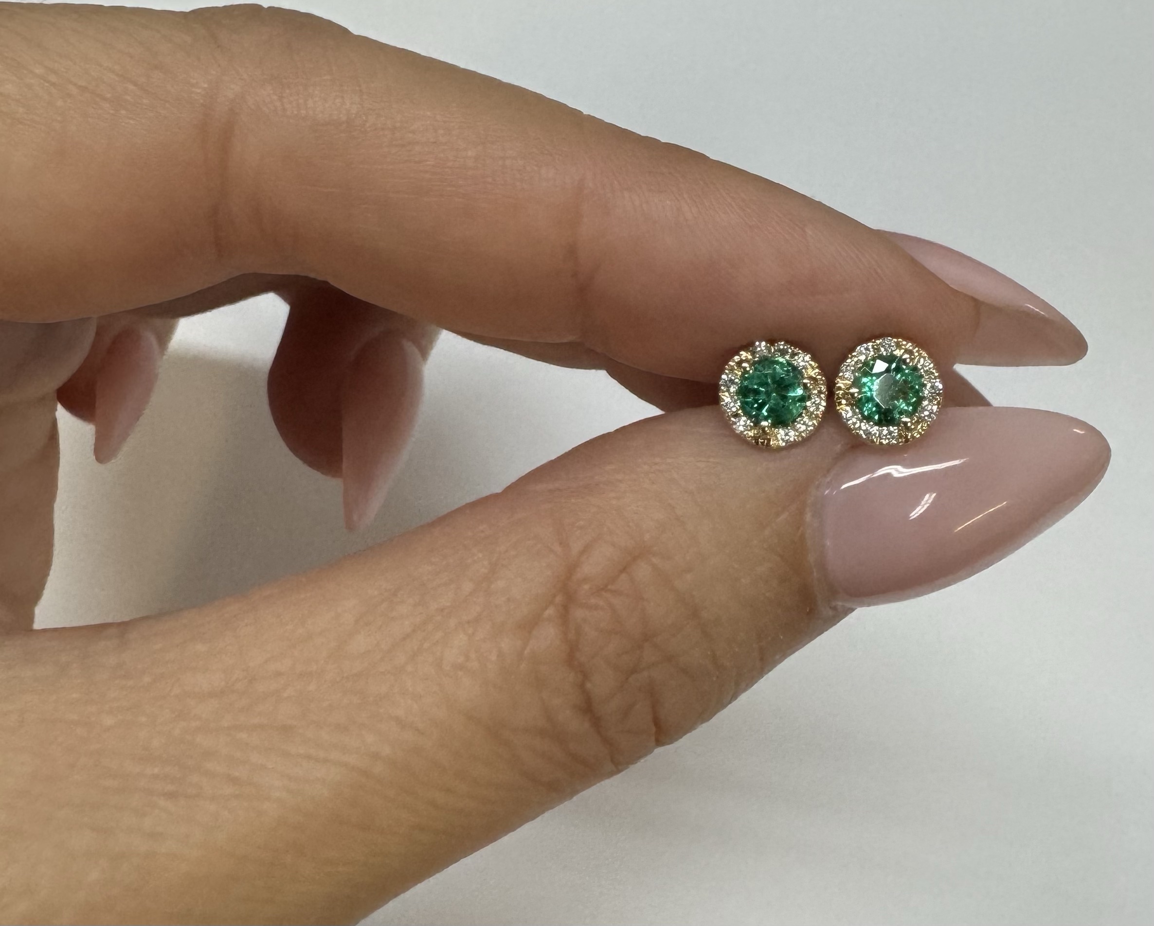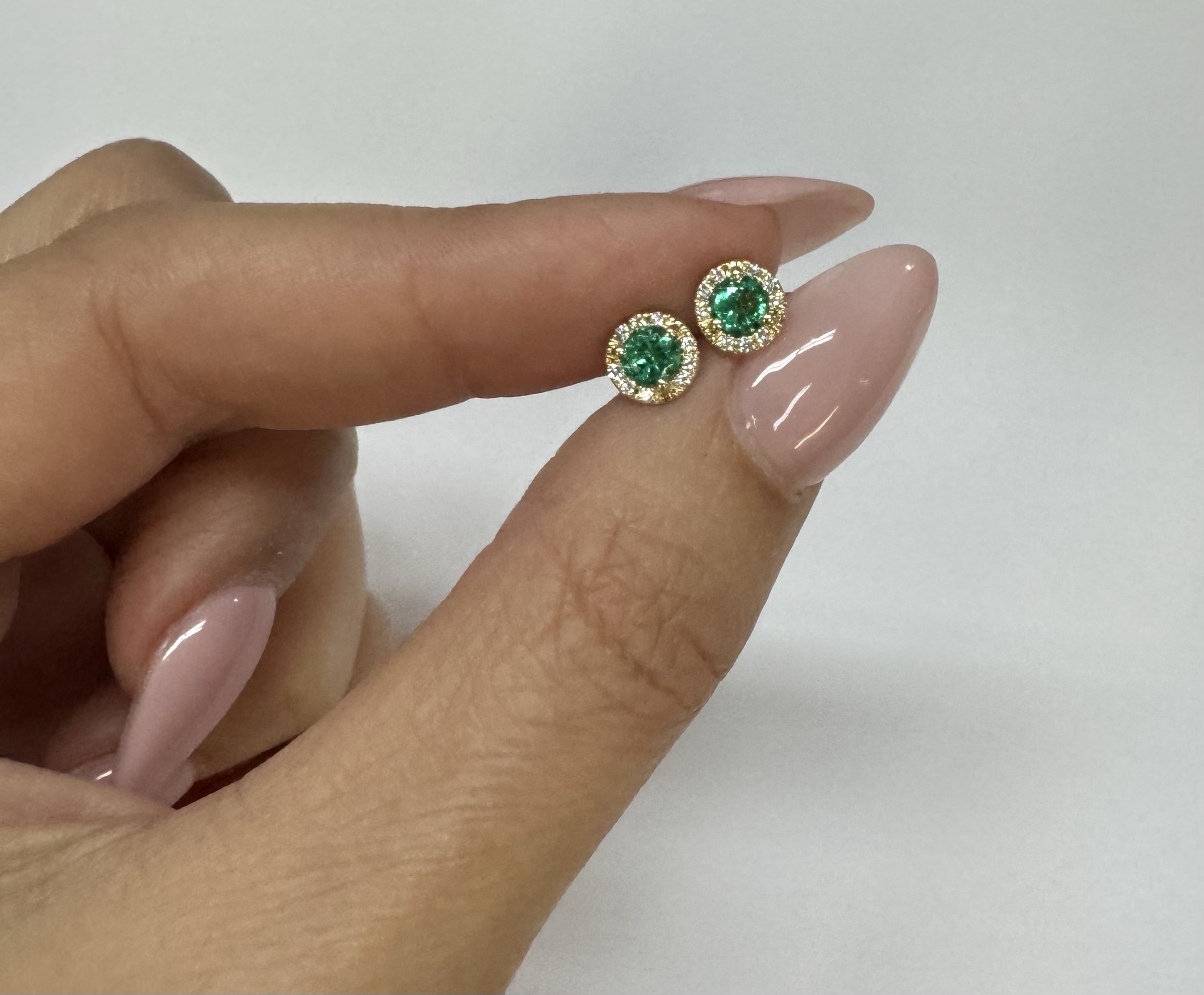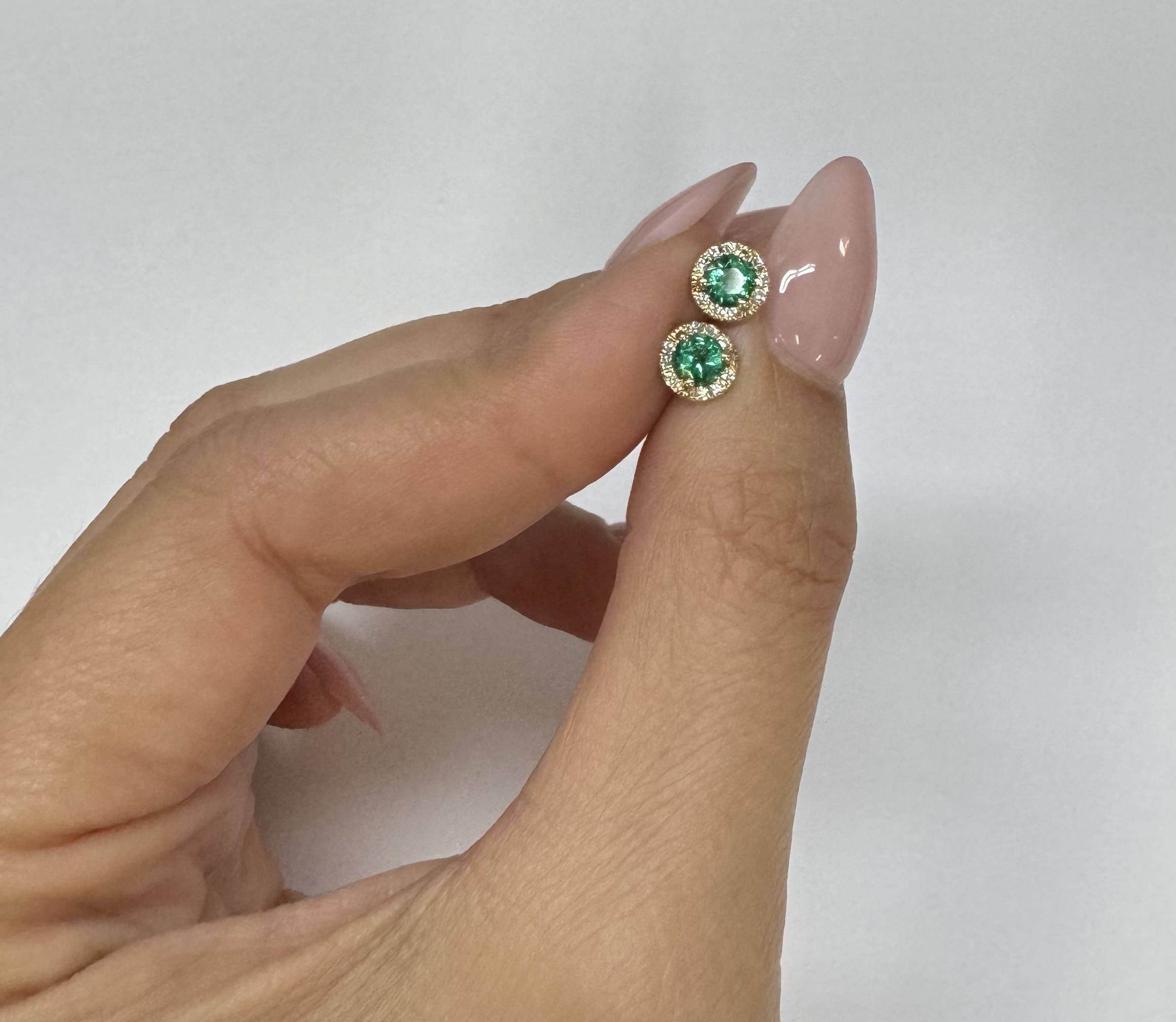 14k yellow gold genuine round, faceted .52 cttw Emerald & .10 cttw genuine Round Brilliant Cut diamond halo stud earrings. These diamonds average G-H in color and SI1 in clarity. These earrings have an entire weight of 1.0 grams.