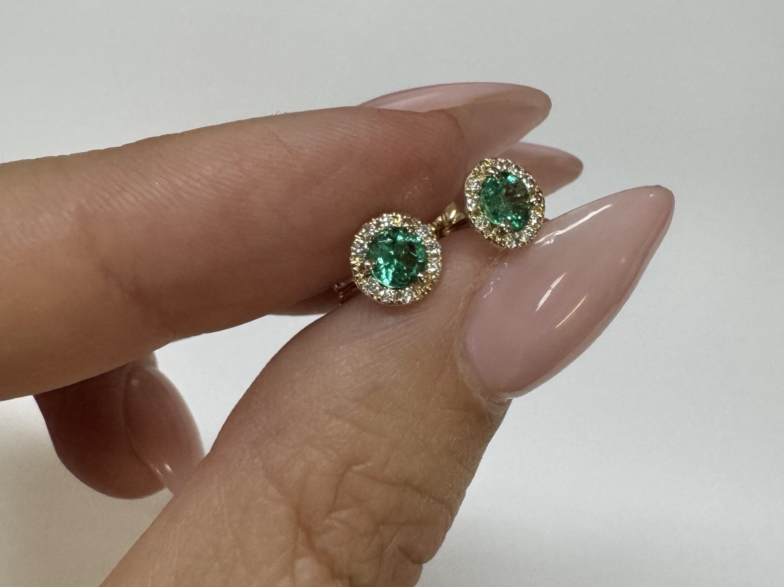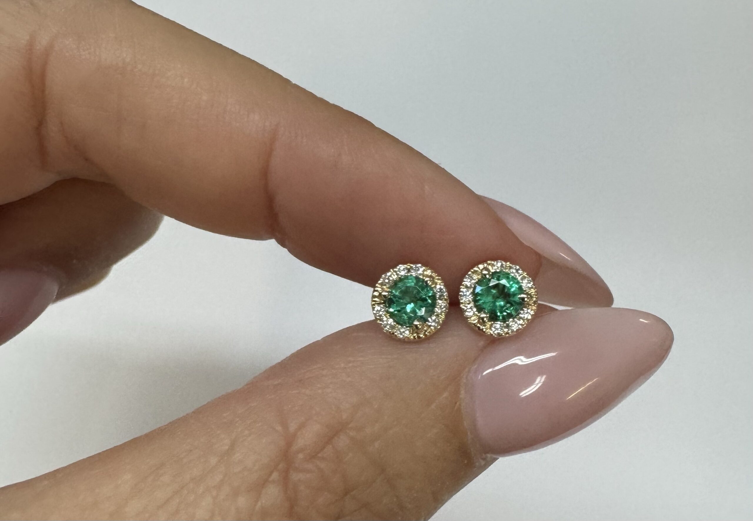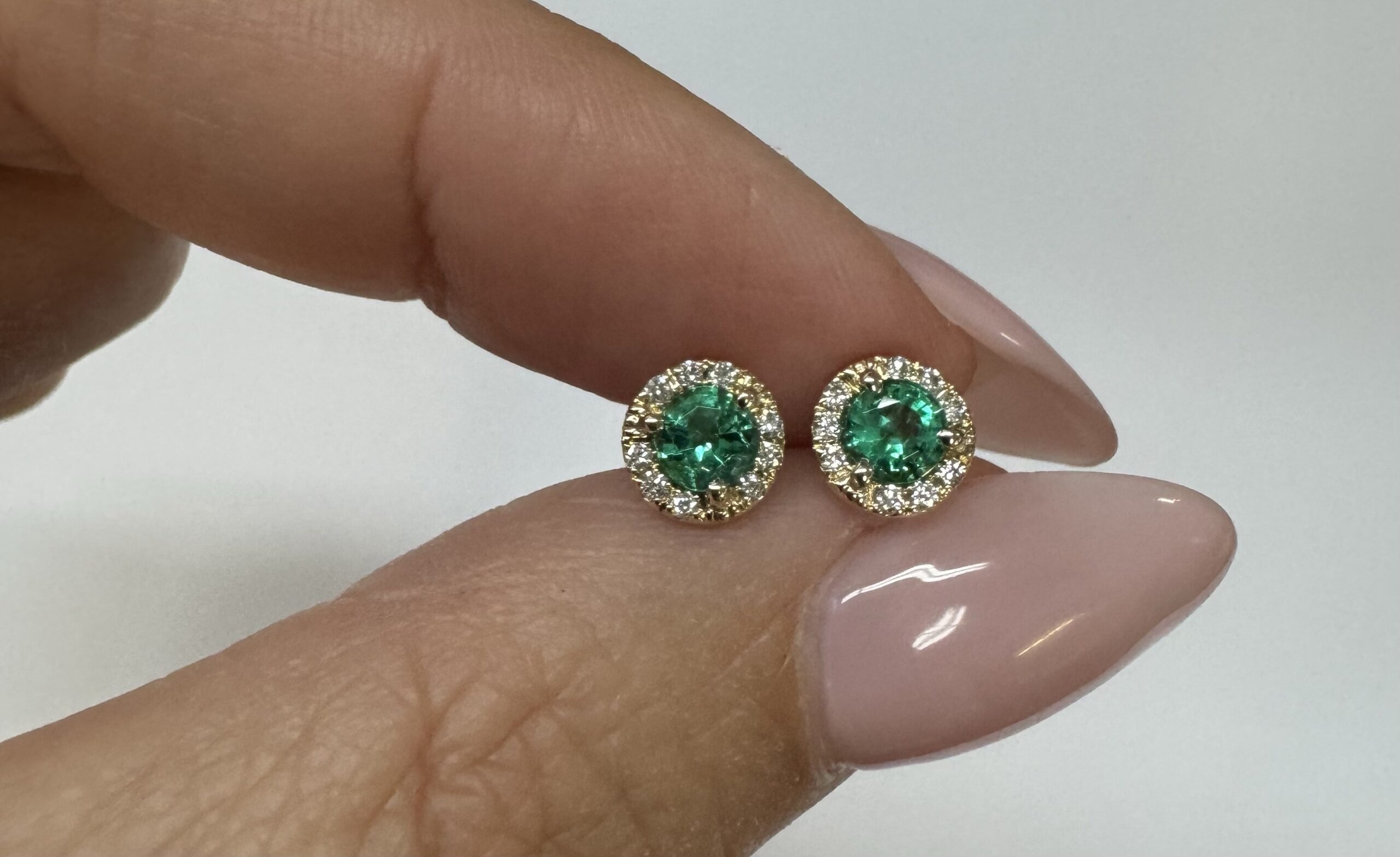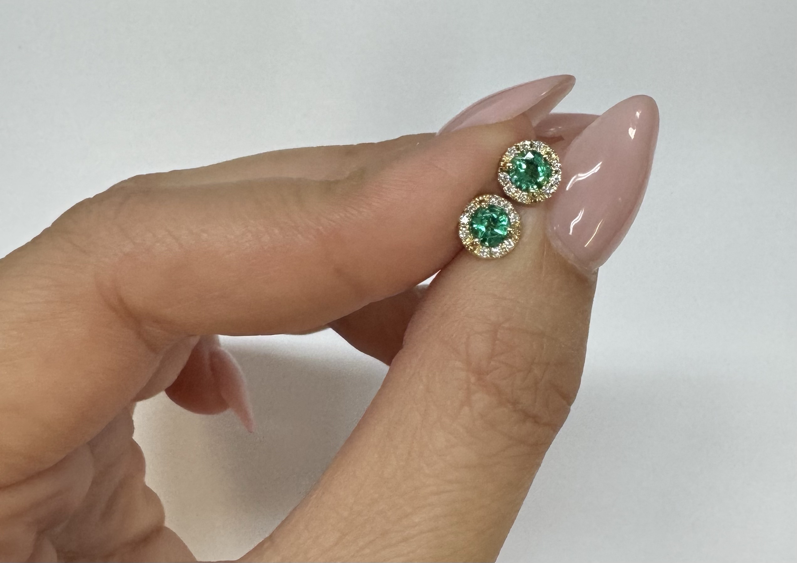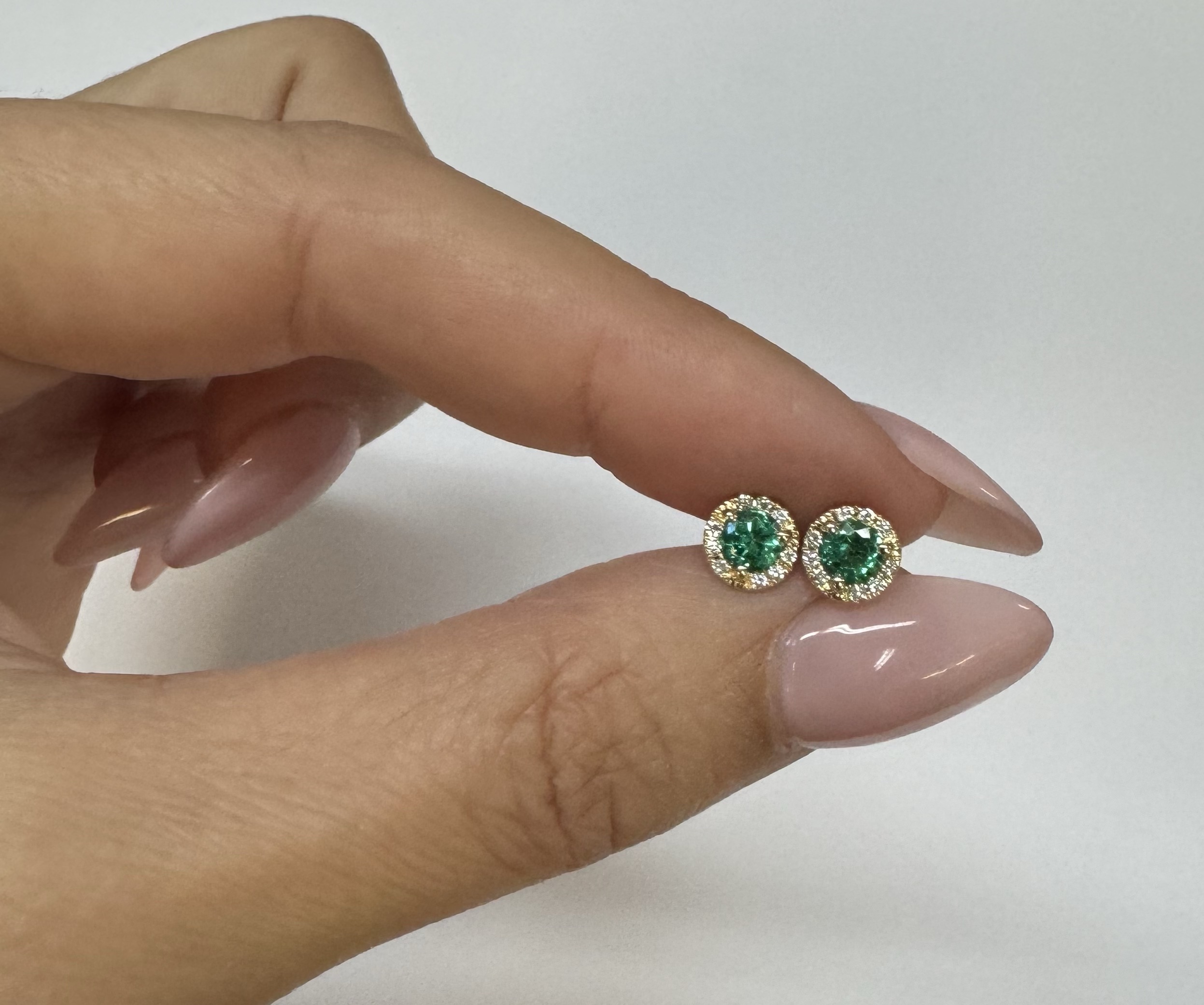 14k yellow gold genuine round, faceted .52 cttw Emerald & .10 cttw genuine Round Brilliant Cut diamond halo stud earrings. These diamonds average G-H in color and SI1 in clarity. These earrings have an entire weight of 1.0 grams.