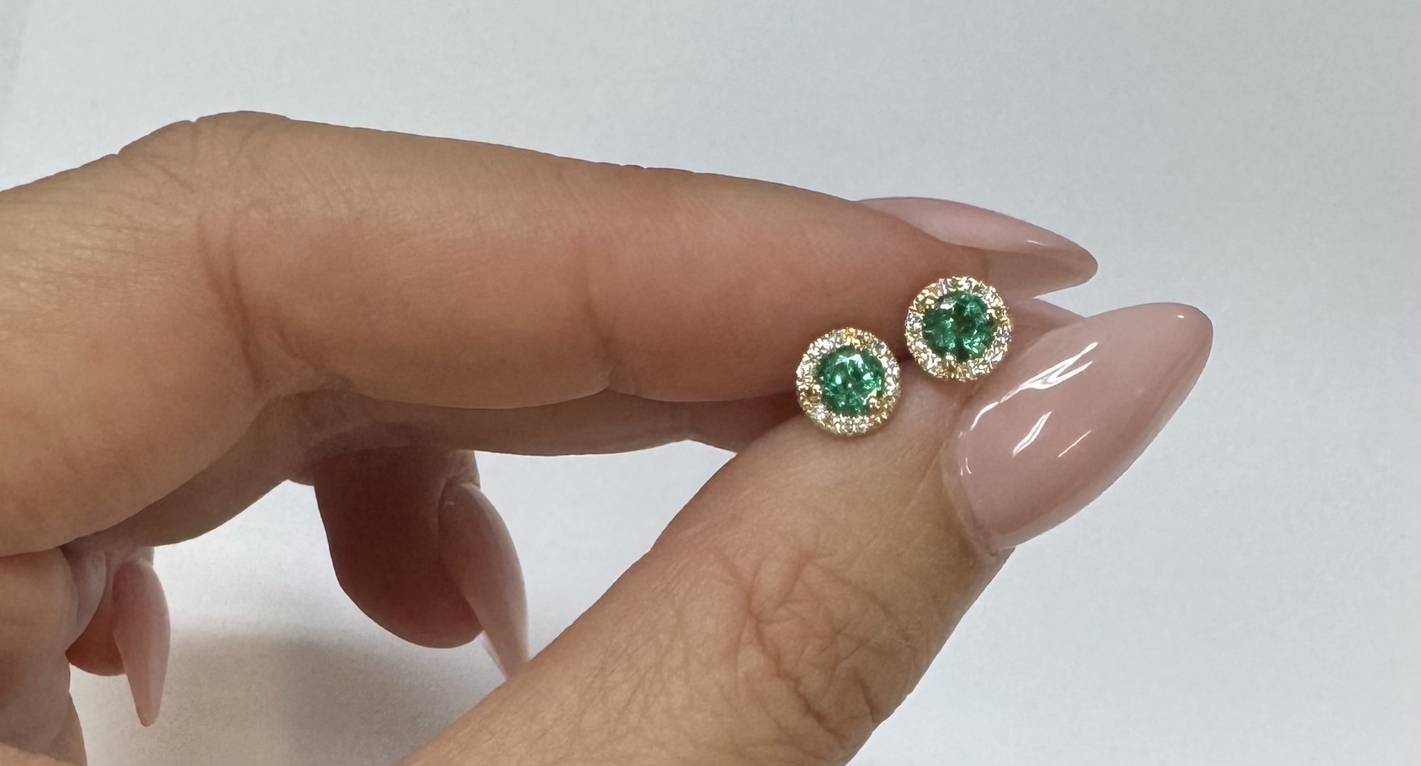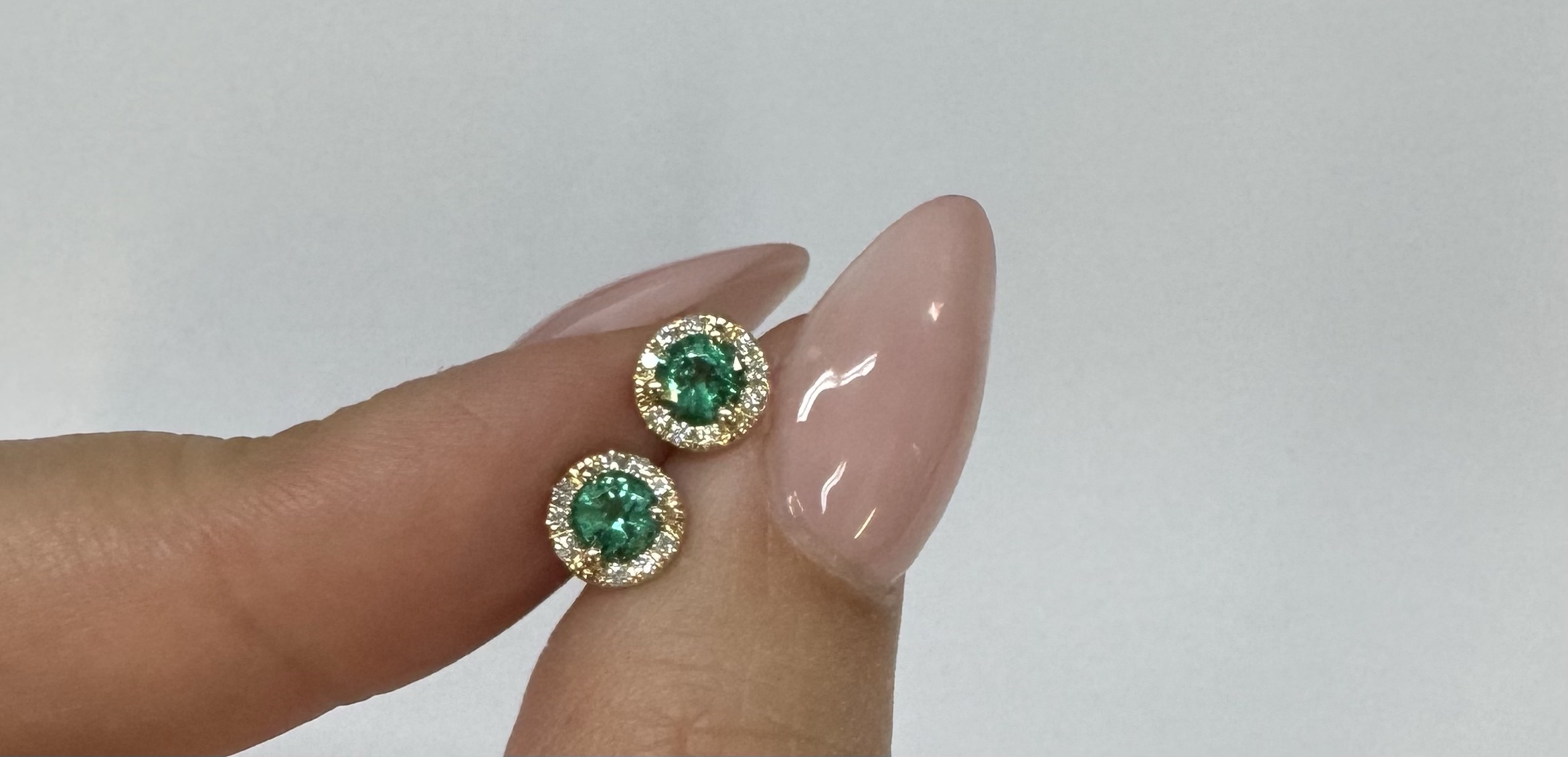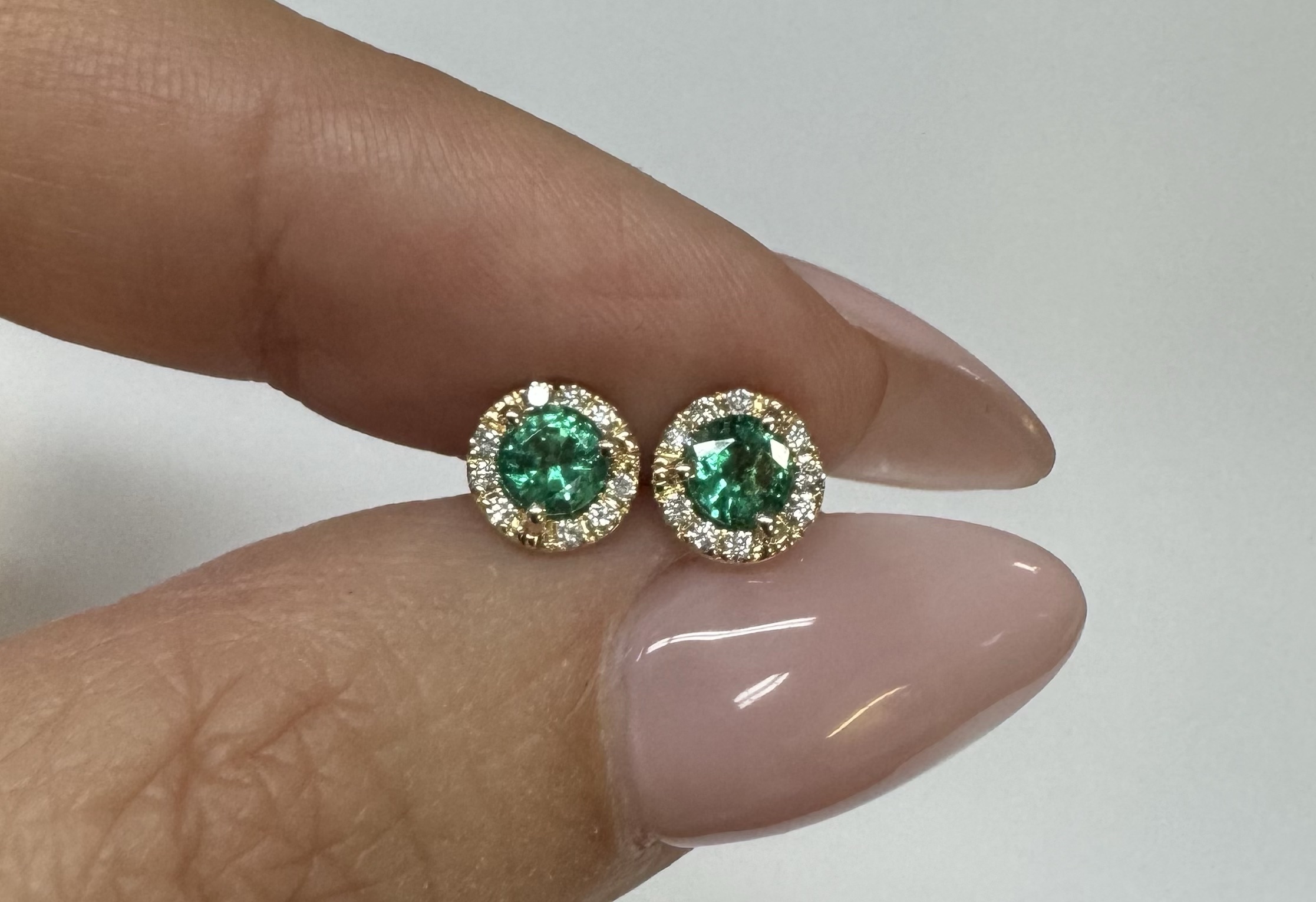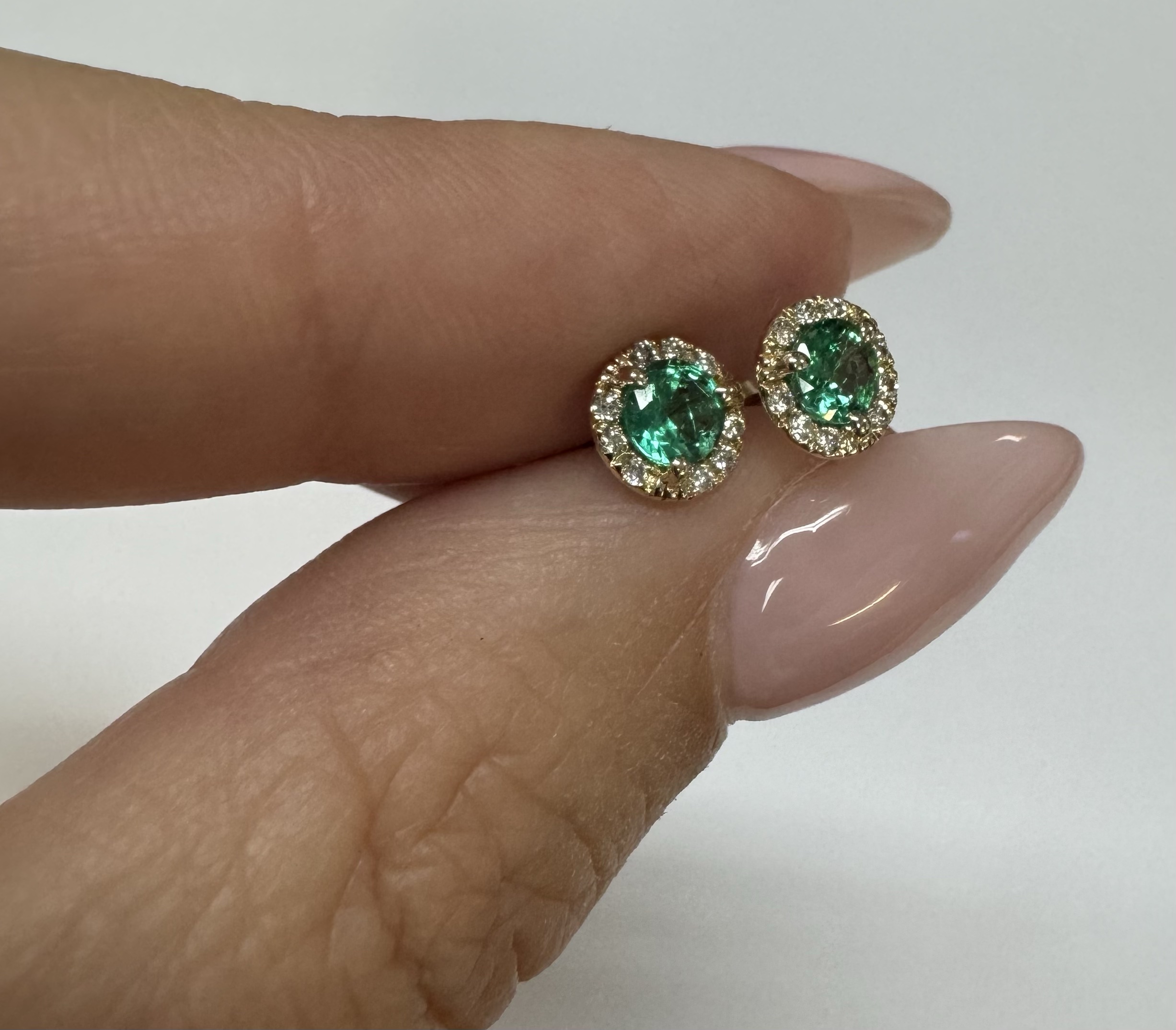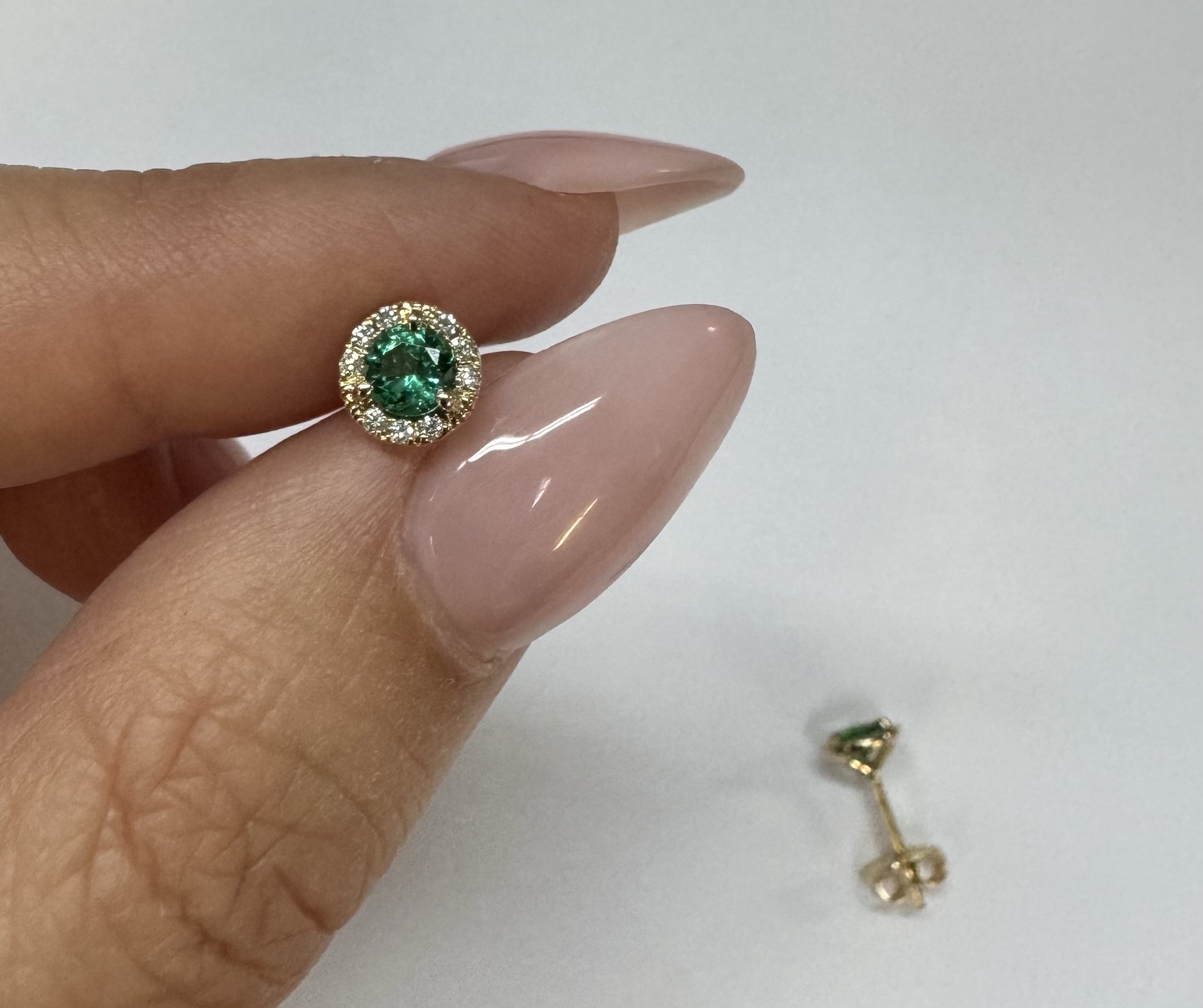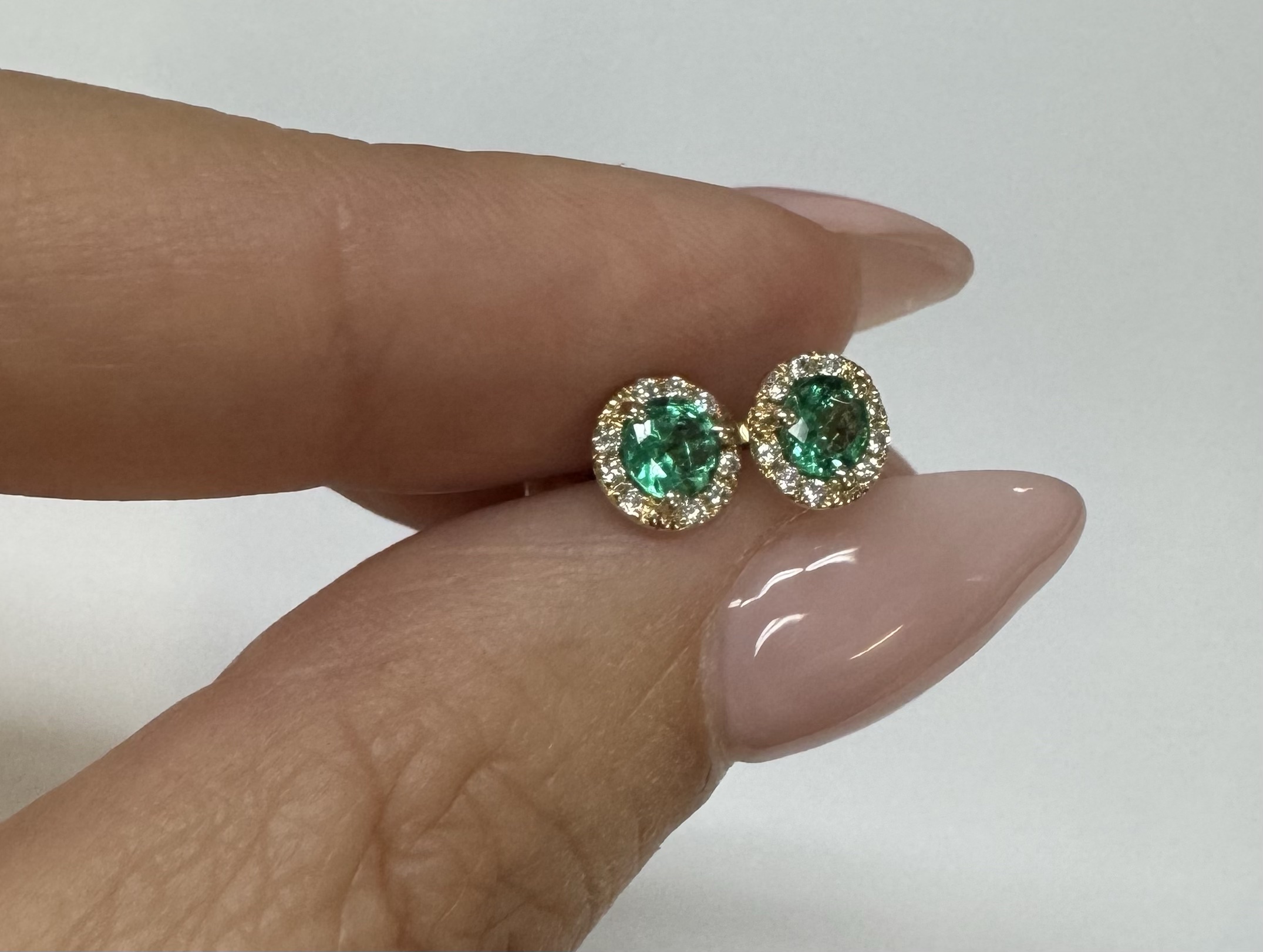 14k yellow gold genuine round, faceted .52 cttw Emerald & .10 cttw genuine Round Brilliant Cut diamond halo stud earrings. These diamonds average G-H in color and SI1 in clarity. These earrings have an entire weight of 1.0 grams.