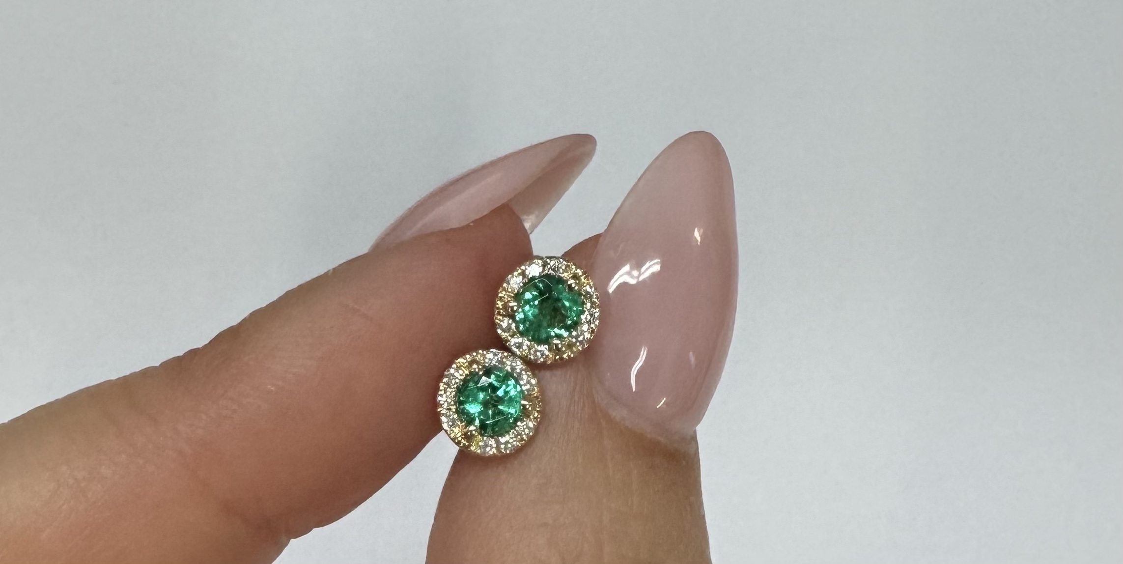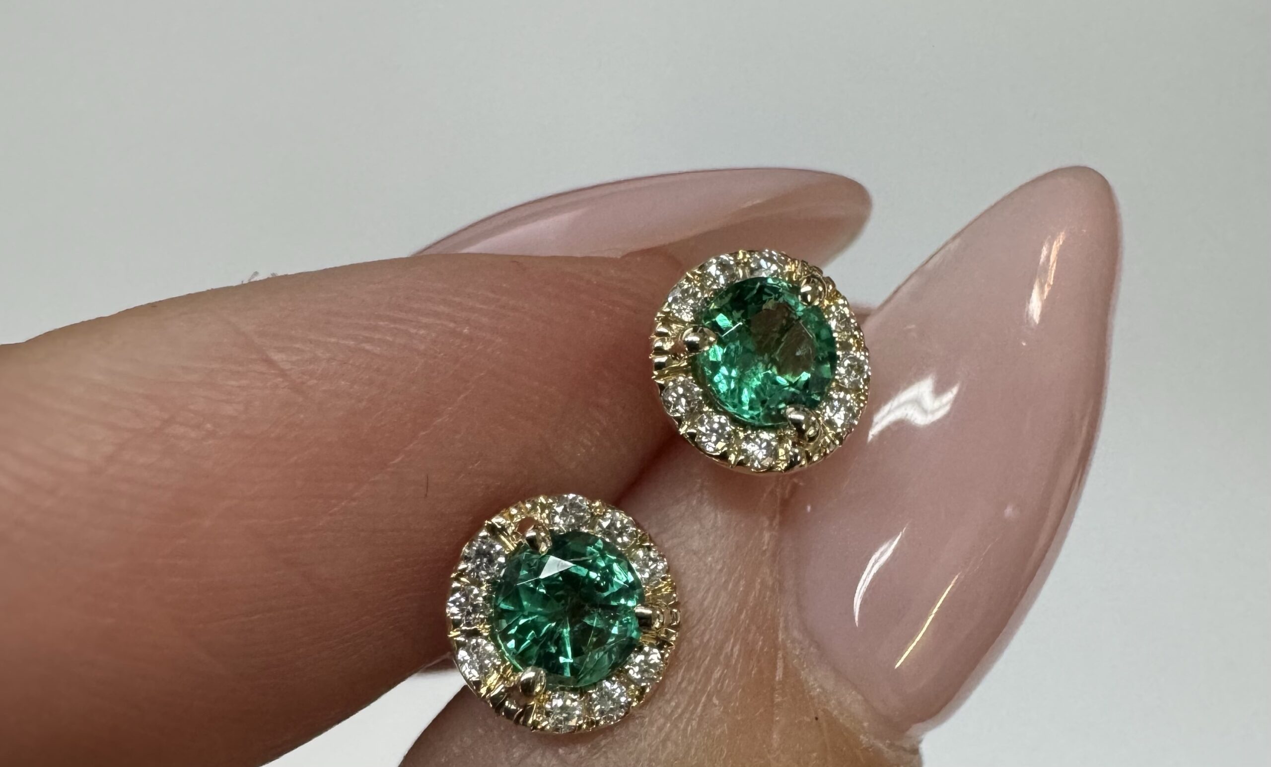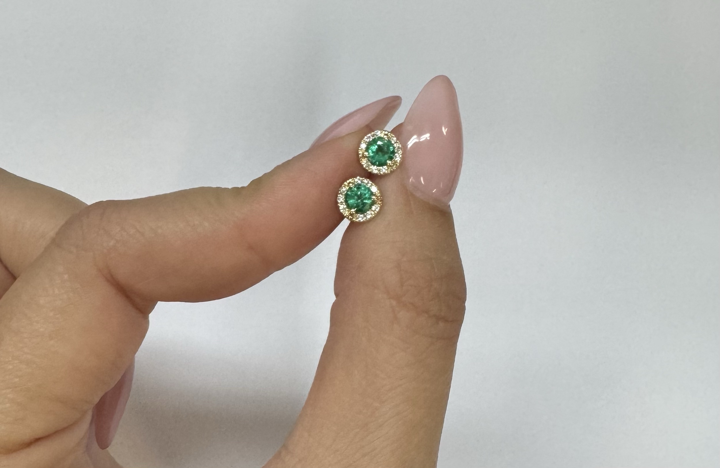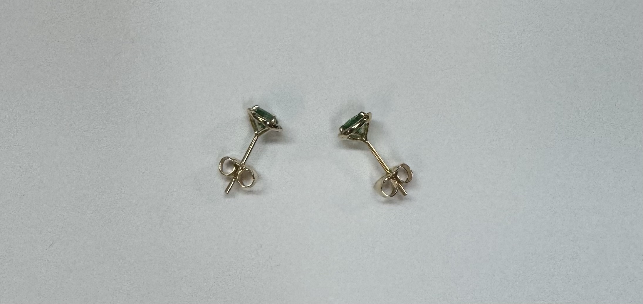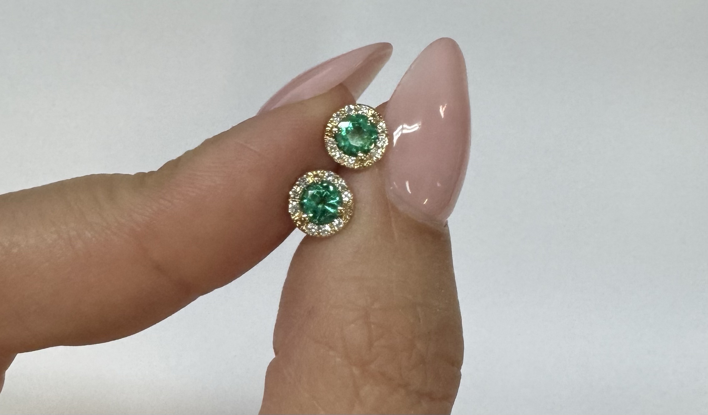 14k yellow gold genuine round, faceted .52 cttw Emerald & .10 cttw genuine Round Brilliant Cut diamond halo stud earrings. These diamonds average G-H in color and SI1 in clarity. These earrings have an entire weight of 1.0 grams.