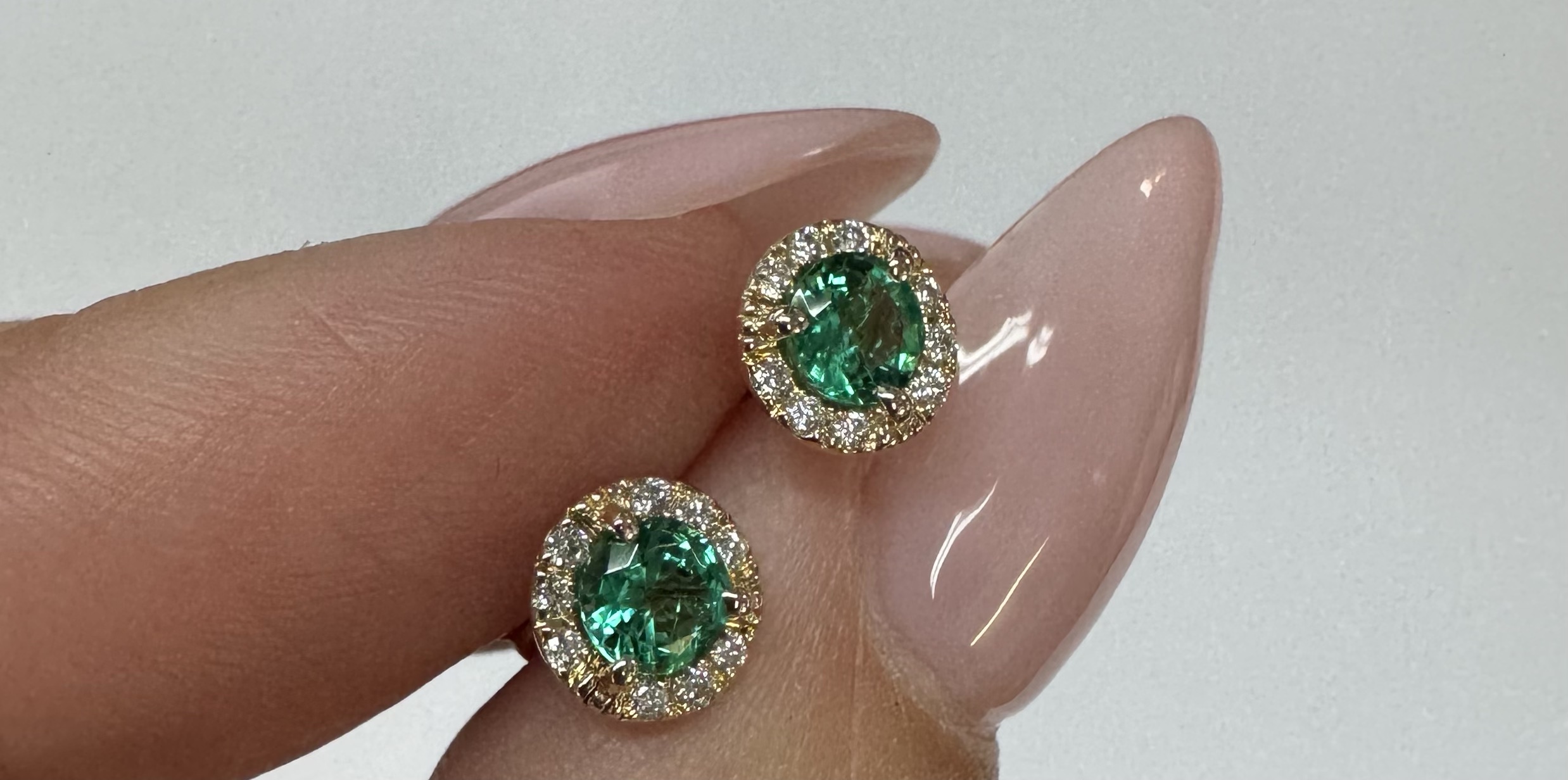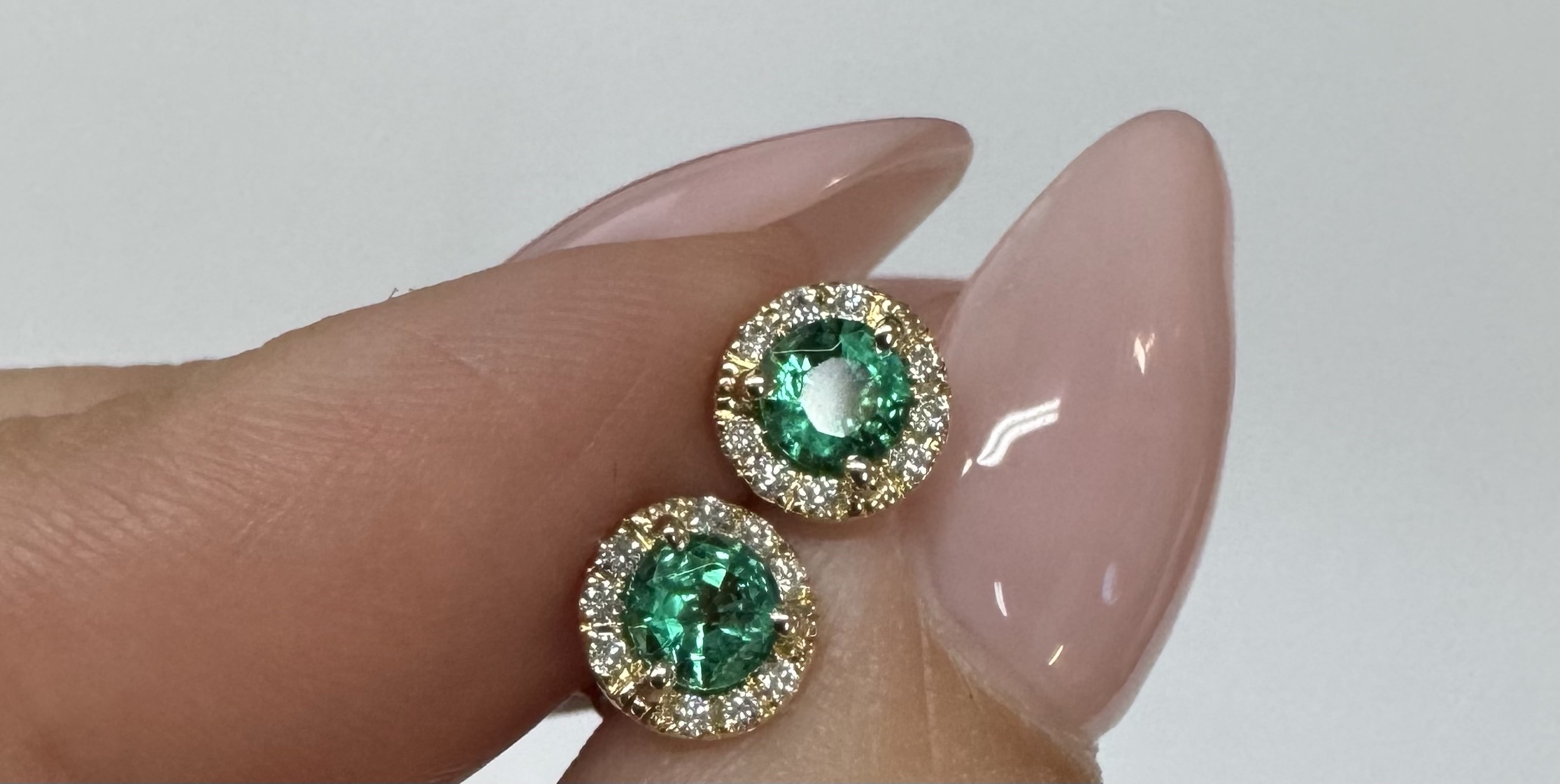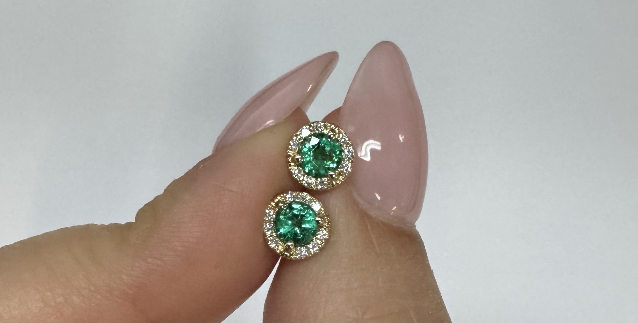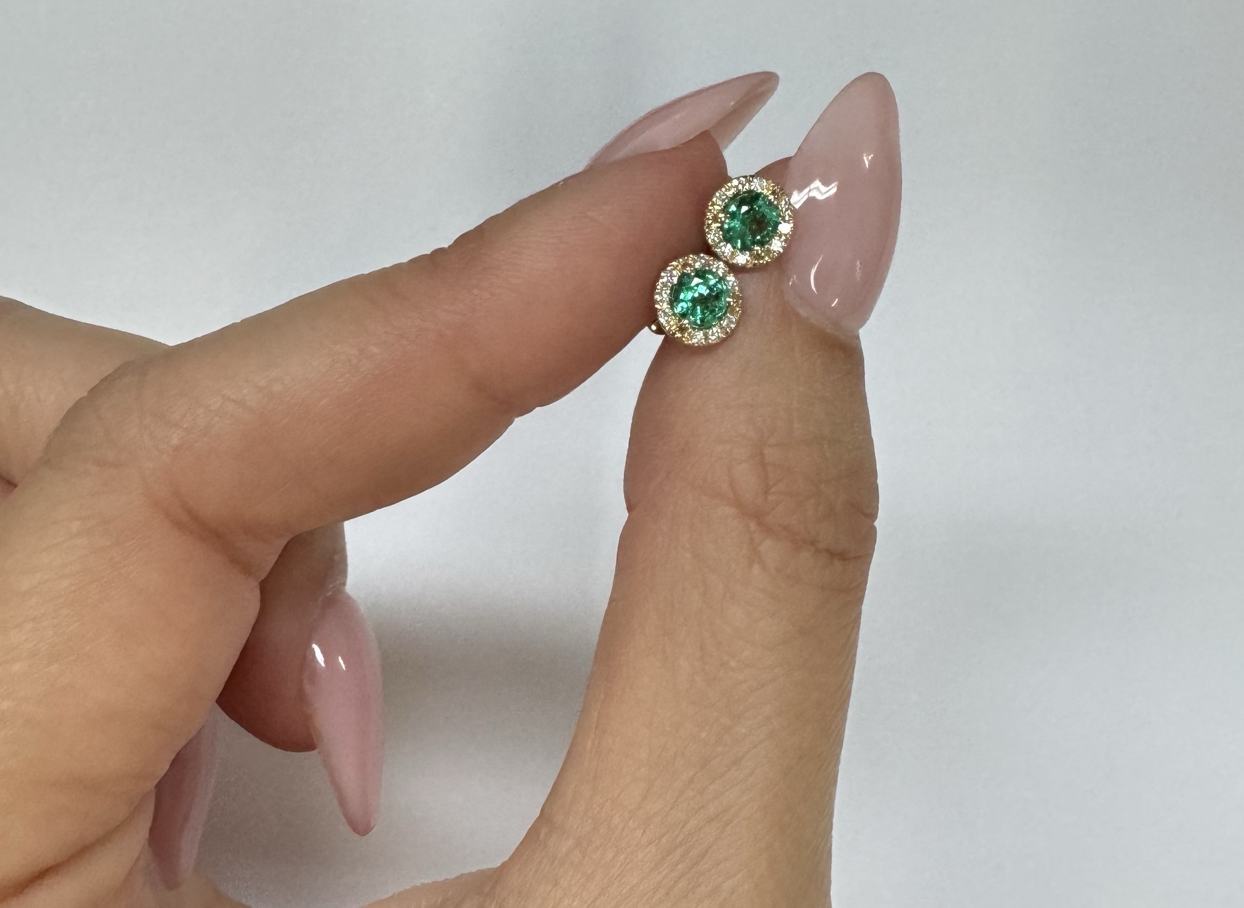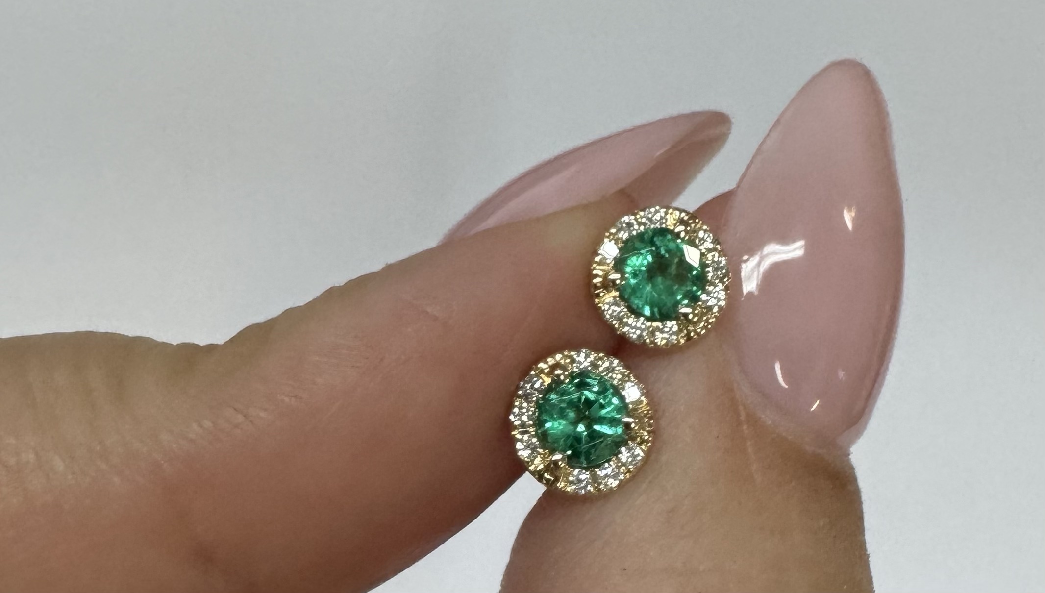 14k yellow gold genuine round, faceted .52 cttw Emerald & .10 cttw genuine Round Brilliant Cut diamond halo stud earrings. These diamonds average G-H in color and SI1 in clarity. These earrings have an entire weight of 1.0 grams.