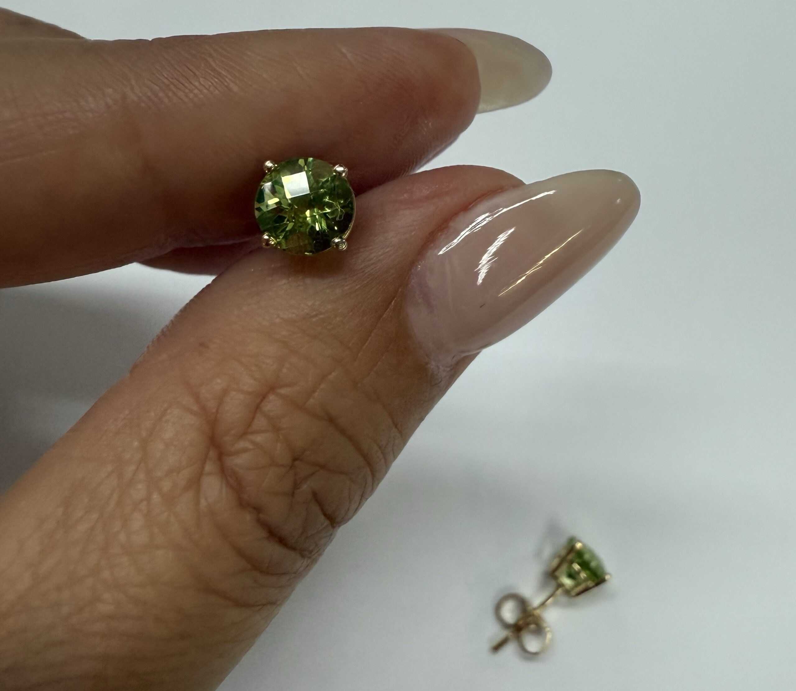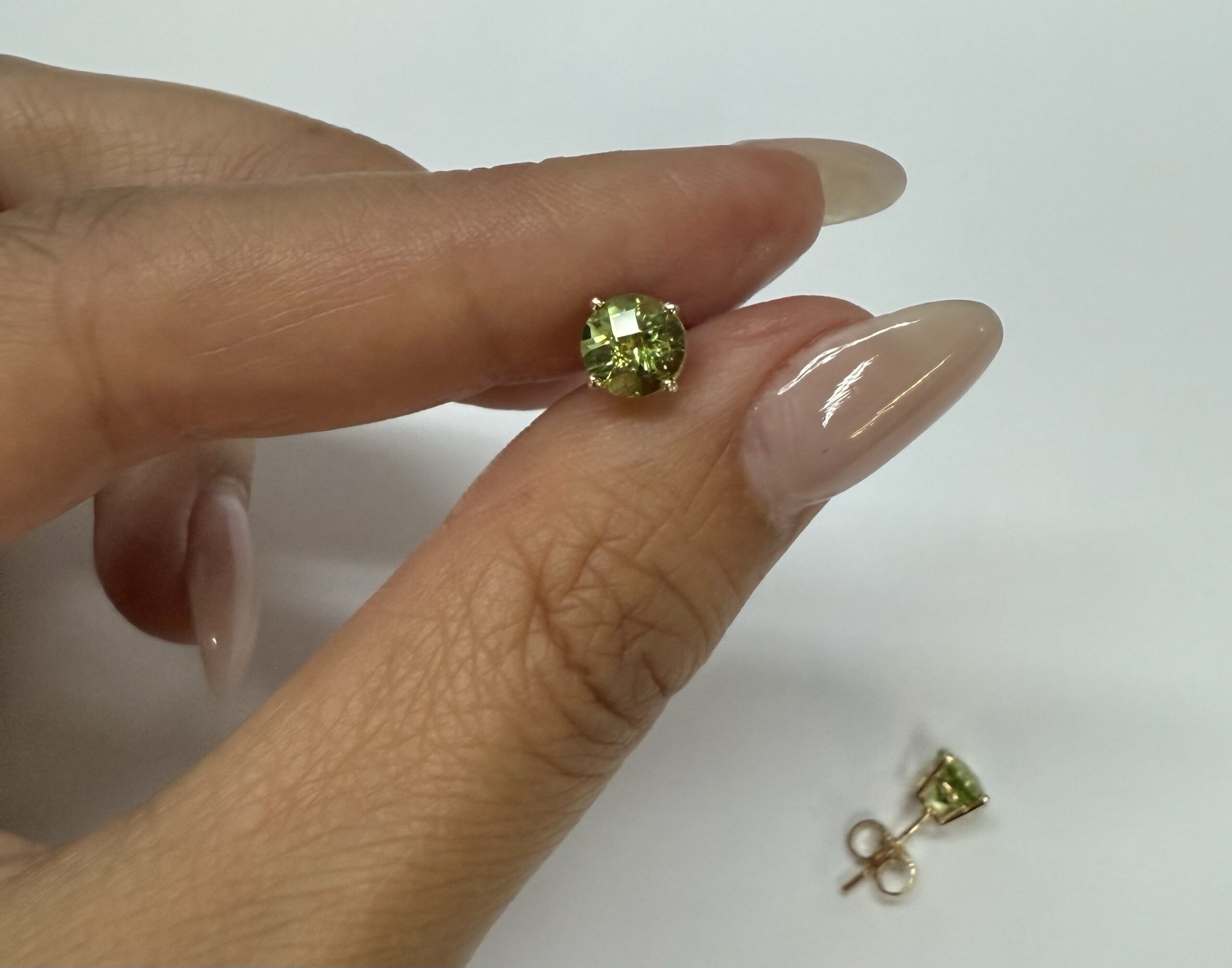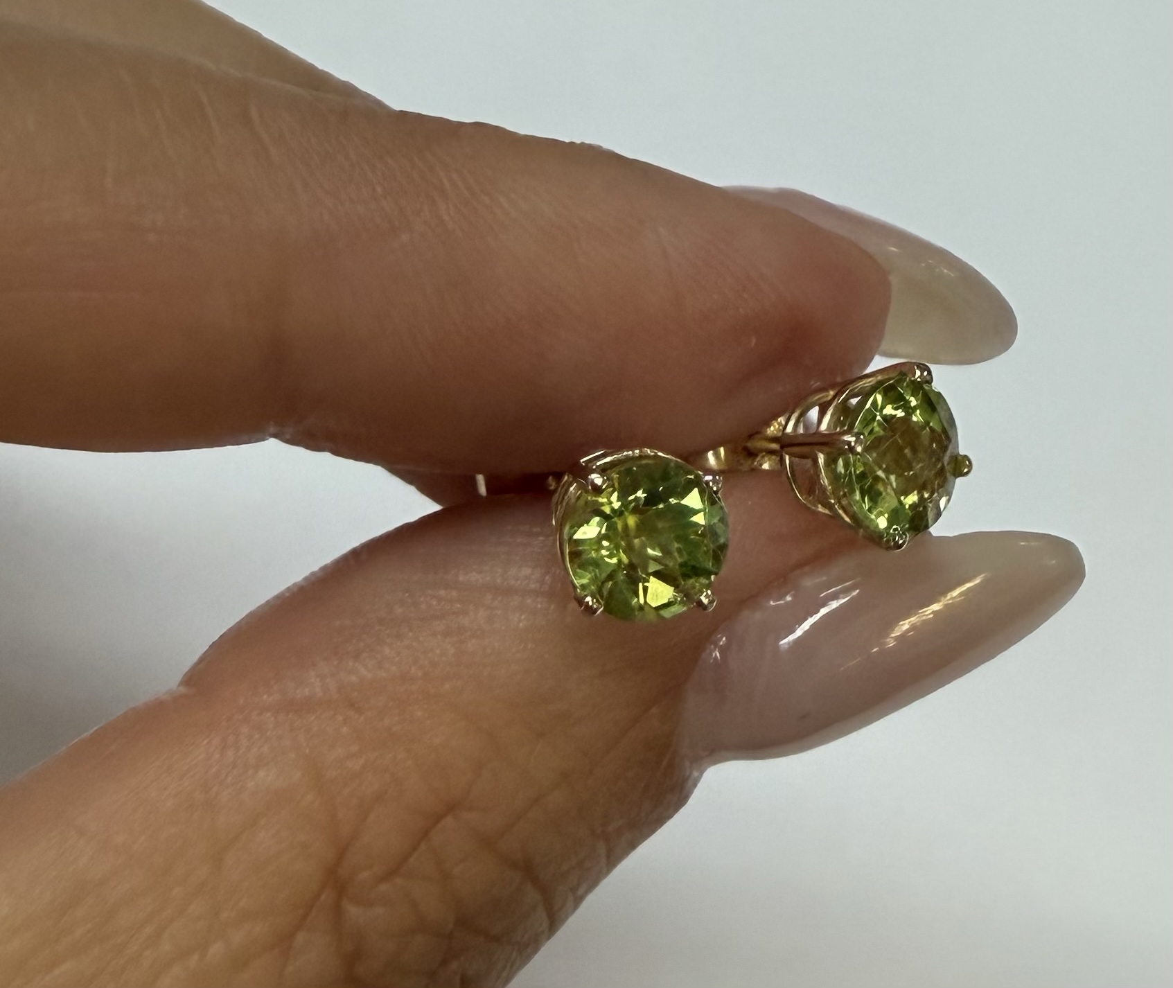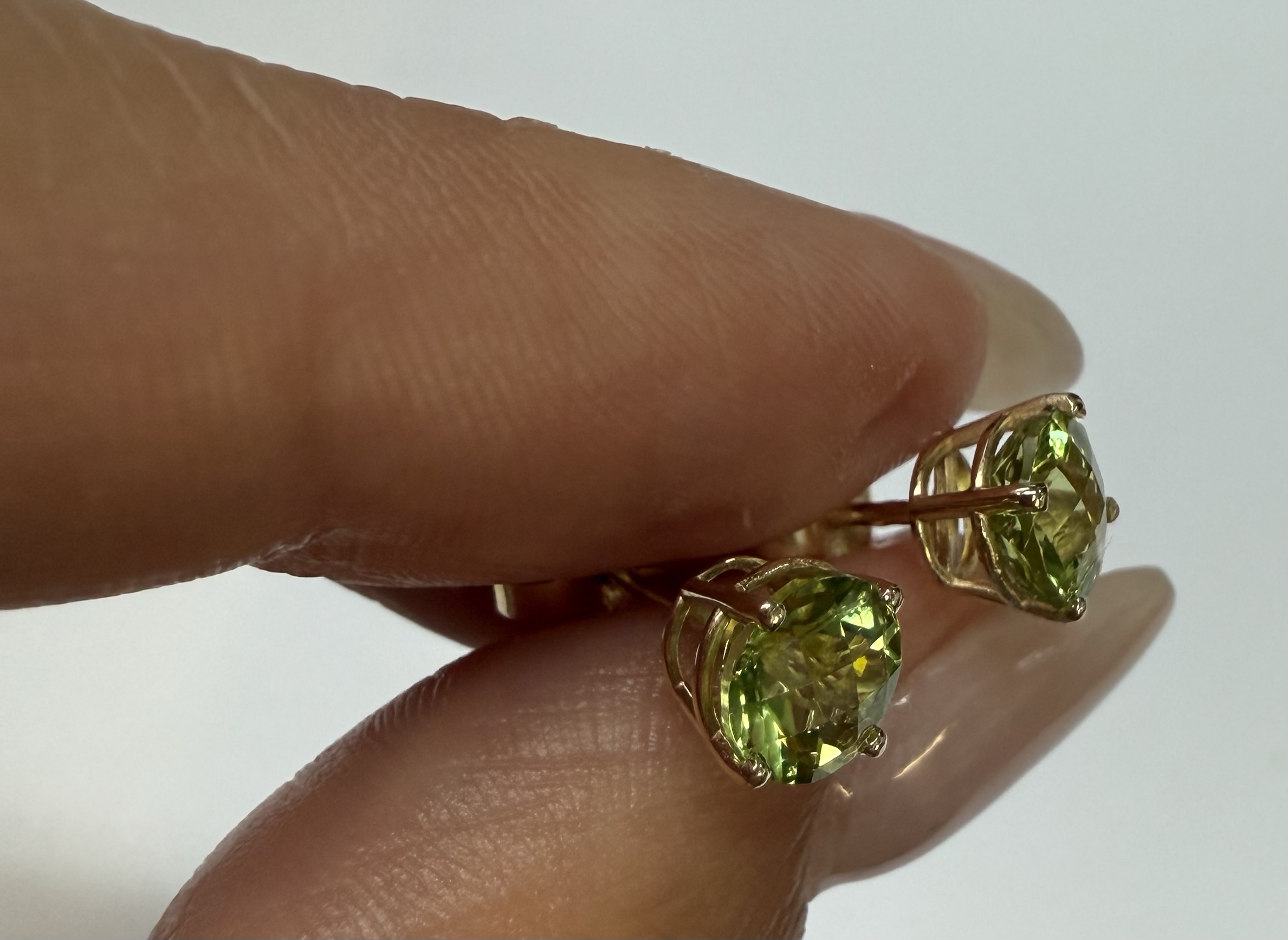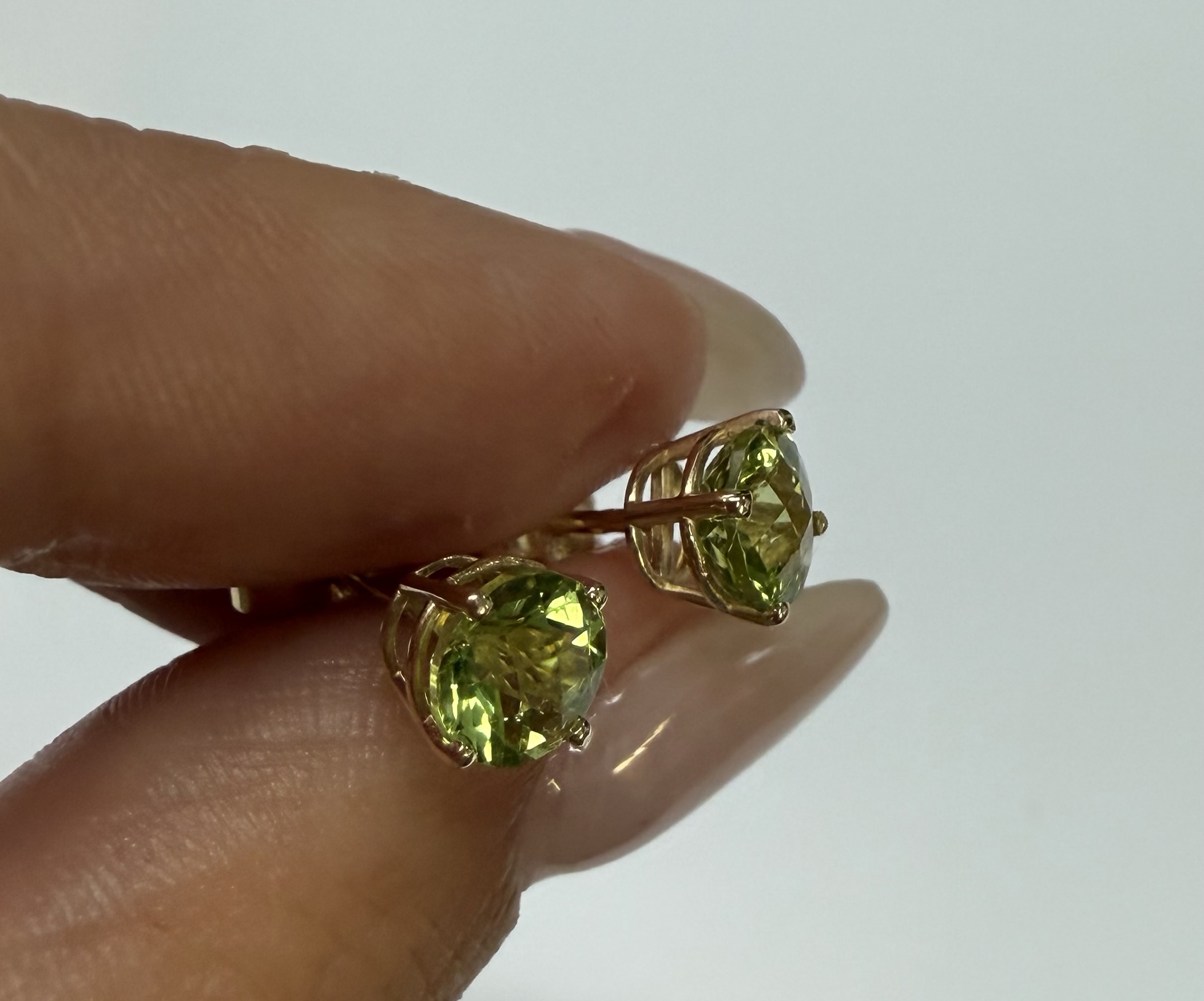 14k yellow gold four prong basket set genuine 6 mm Peridot (August birthstone) stud earrings. These earrings have an entire weight of 1.2 grams.