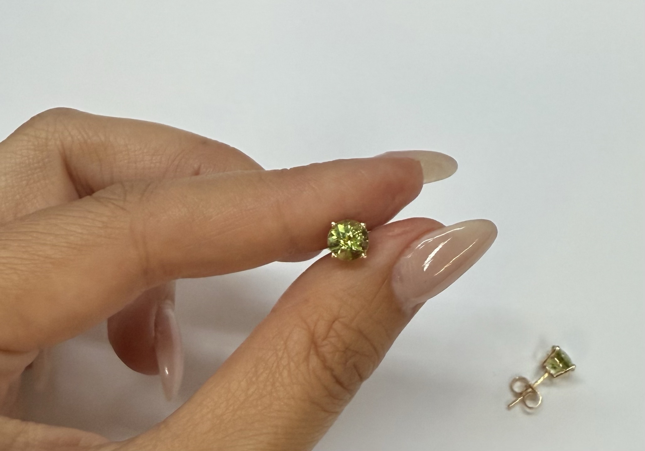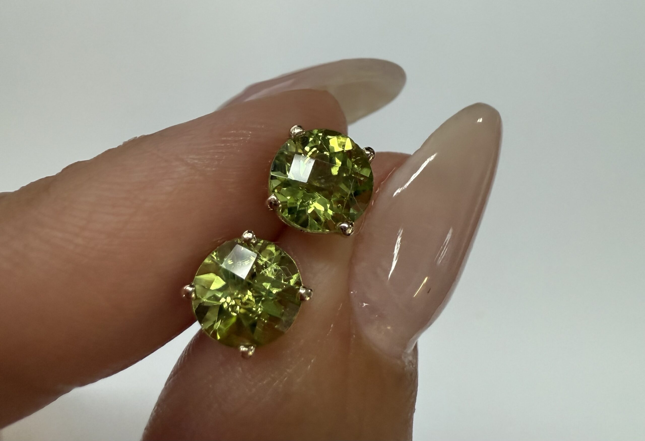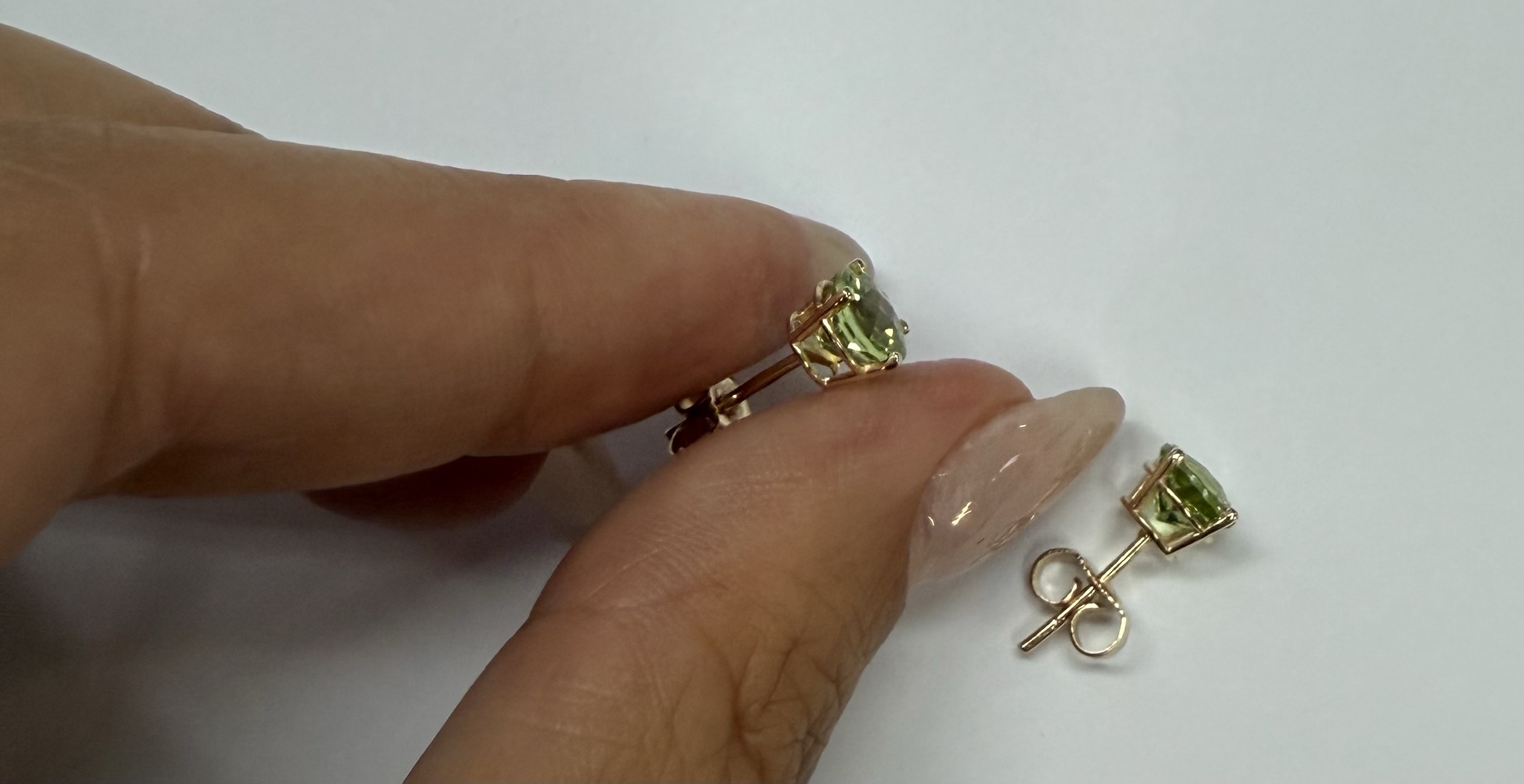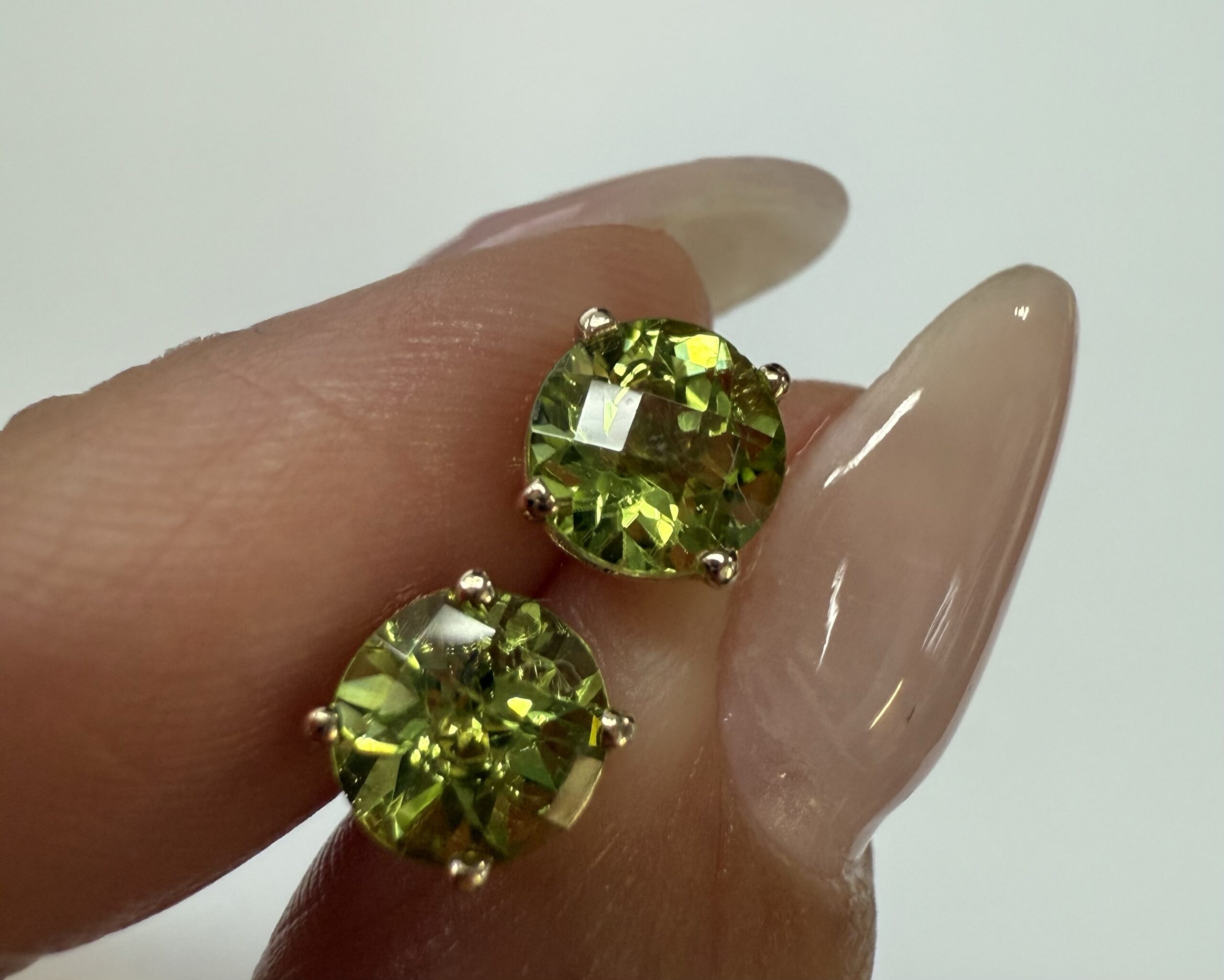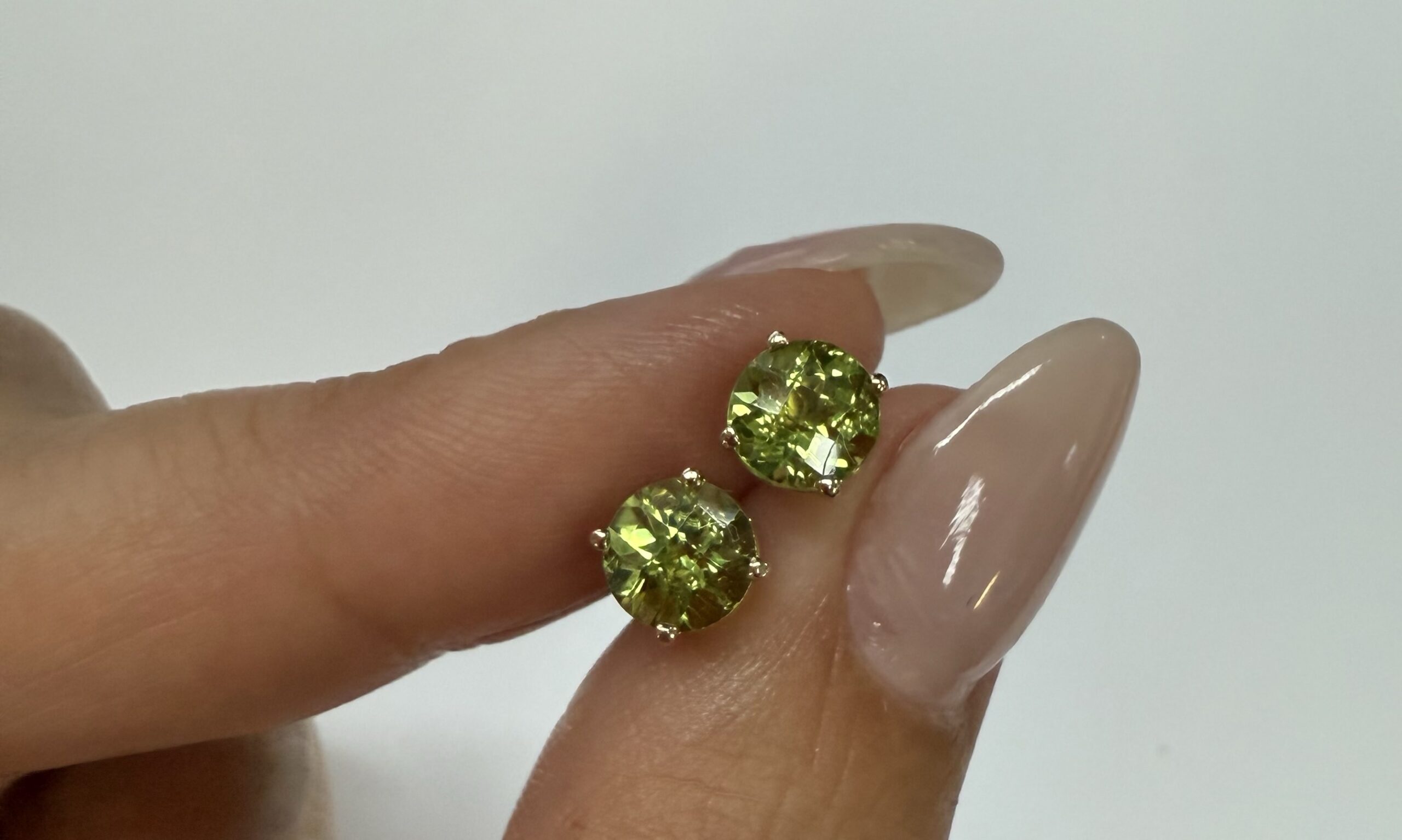14k yellow gold four prong basket set genuine 6 mm Peridot (August birthstone) stud earrings. These earrings have an entire weight of 1.2 grams.