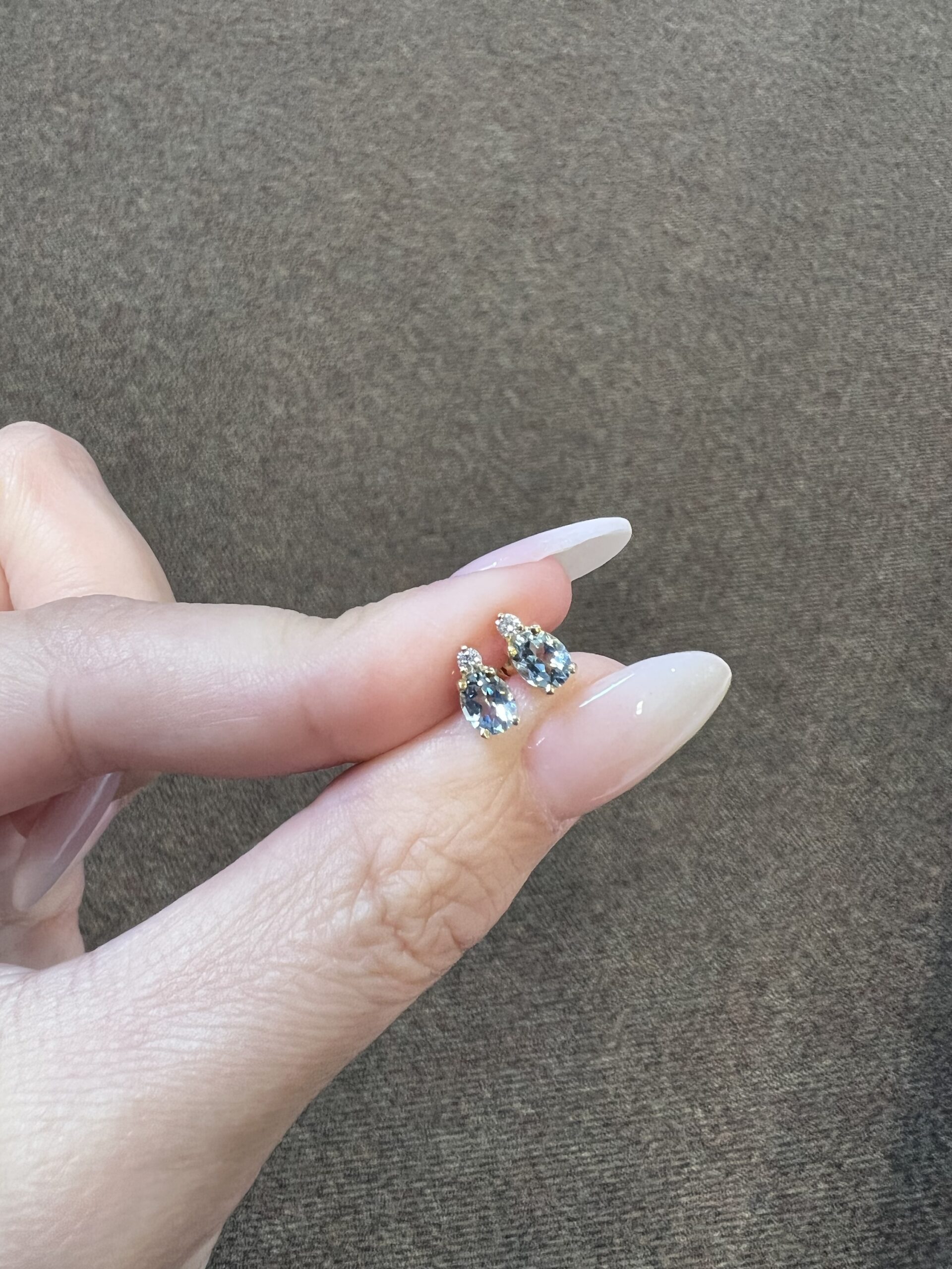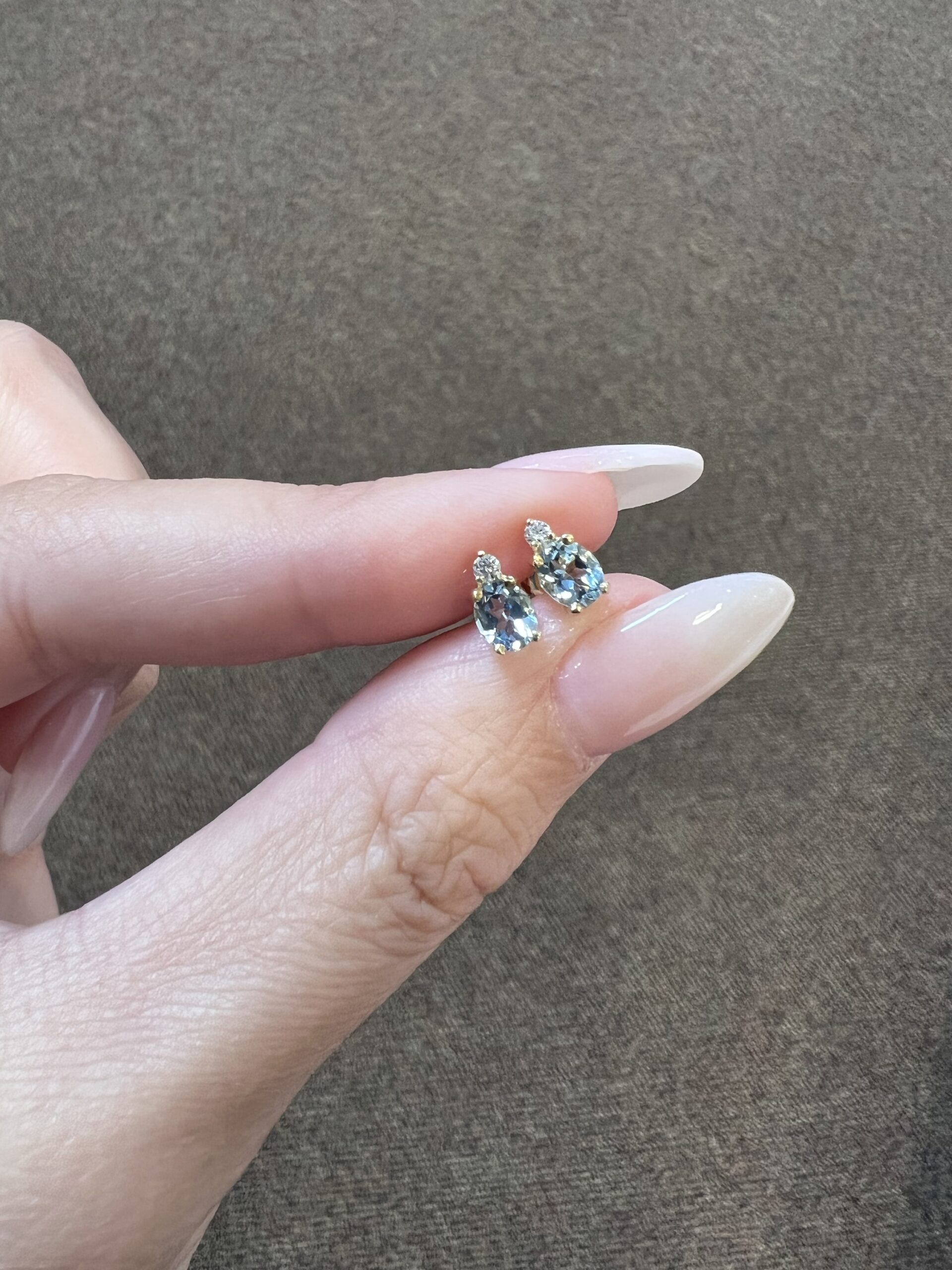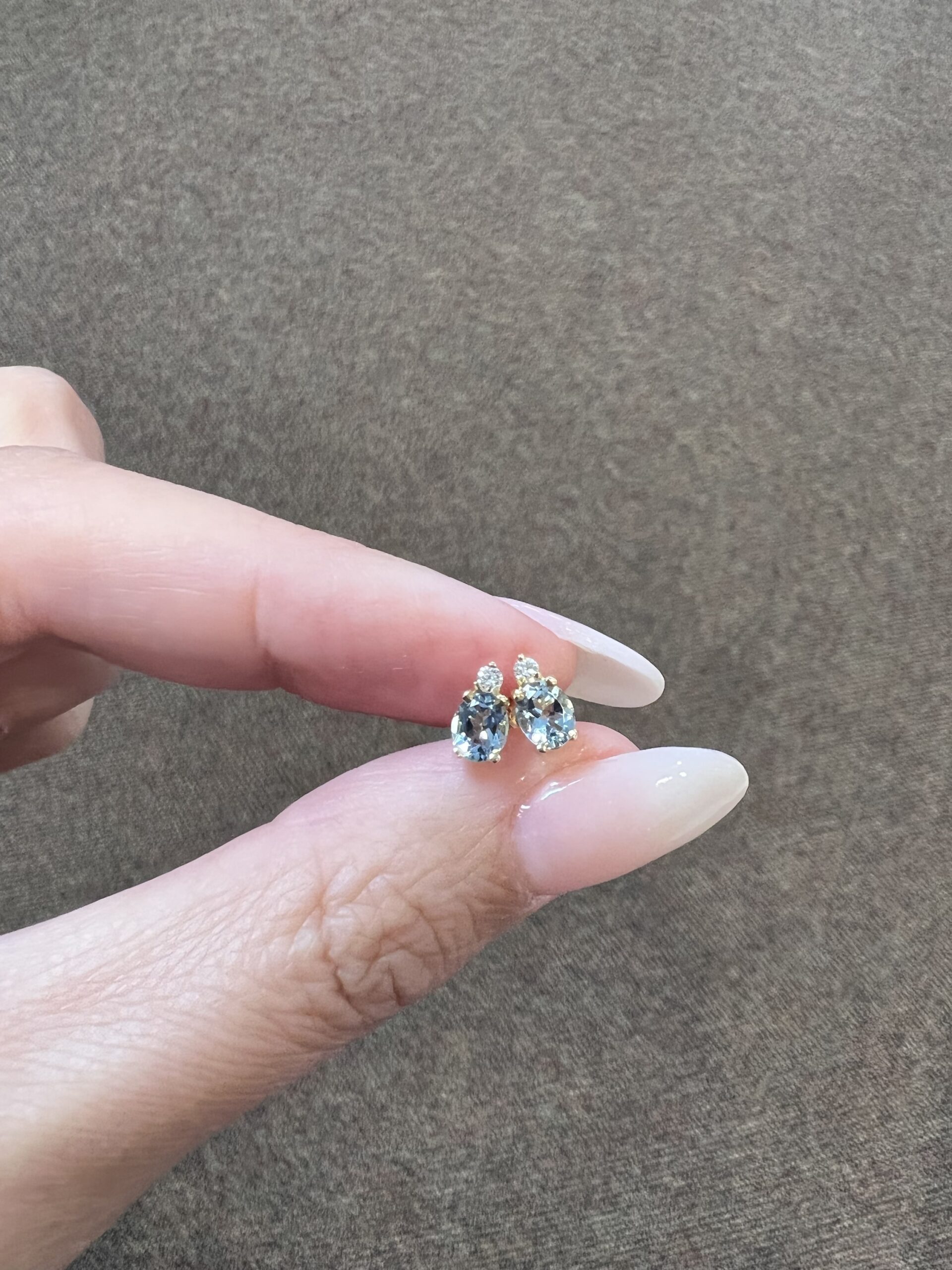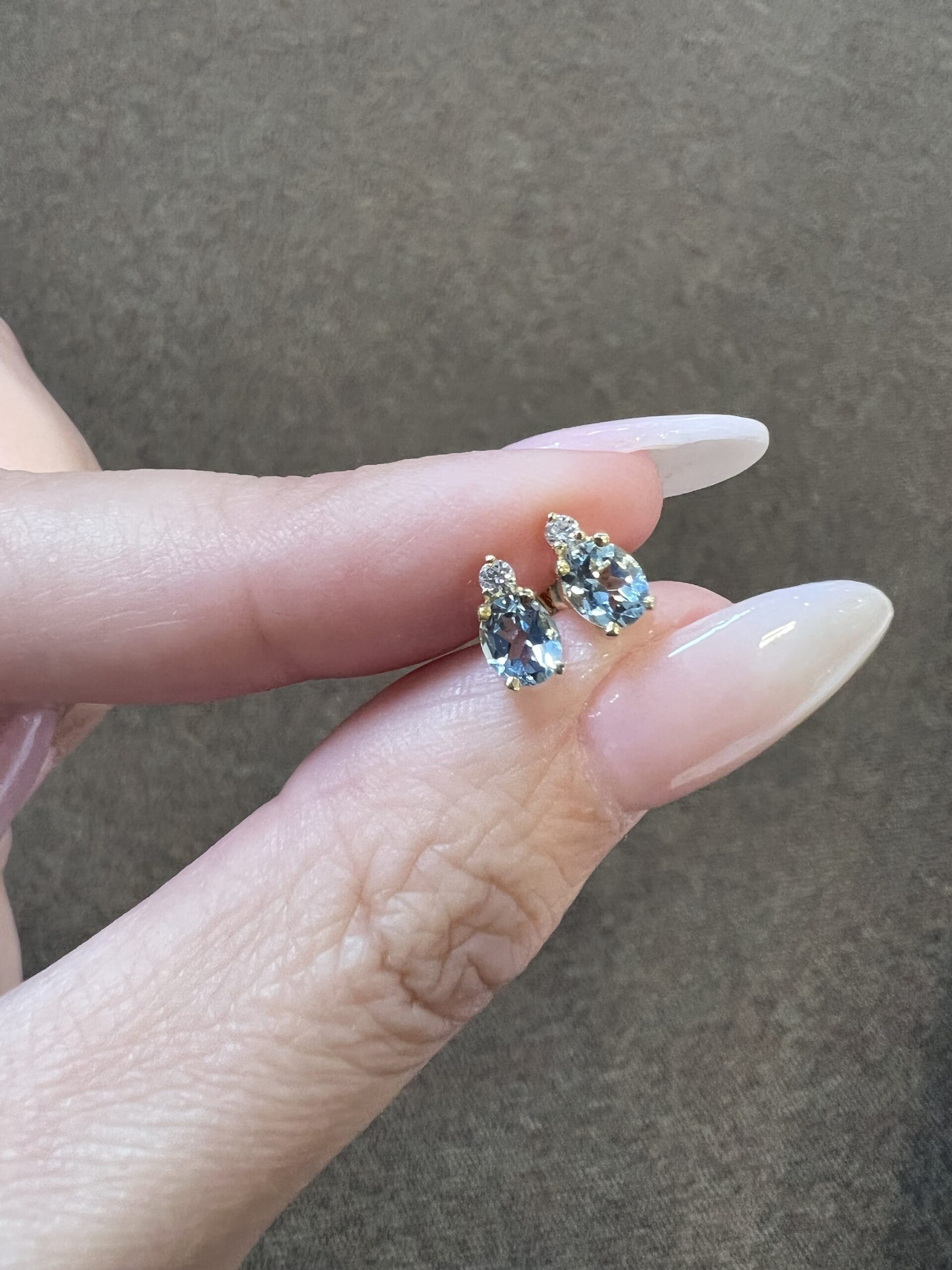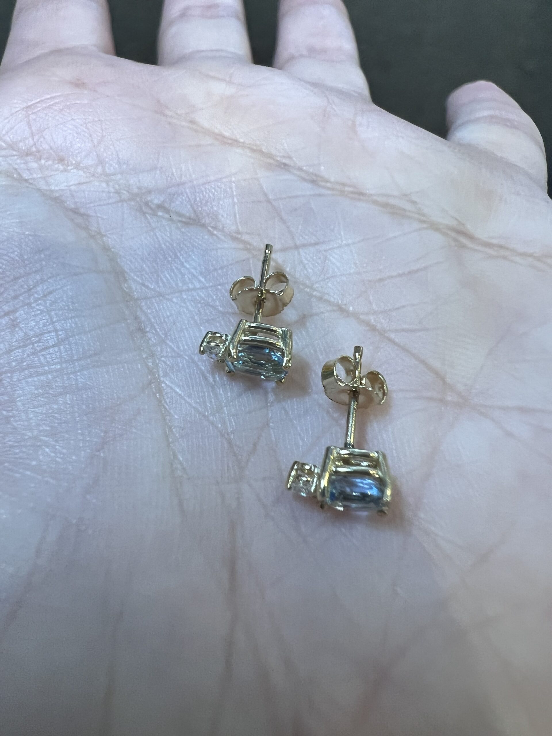 14k yellow gold oval shaped, faceted genuine .68 cttw Aquamarine (March birthstone) and genuine .06 cttw Round Brilliant Cut diamond basket set stud earrings. These diamonds average G-H in color and SI1 in clarity. These earrings have an entire weight of 1.1 grams.
