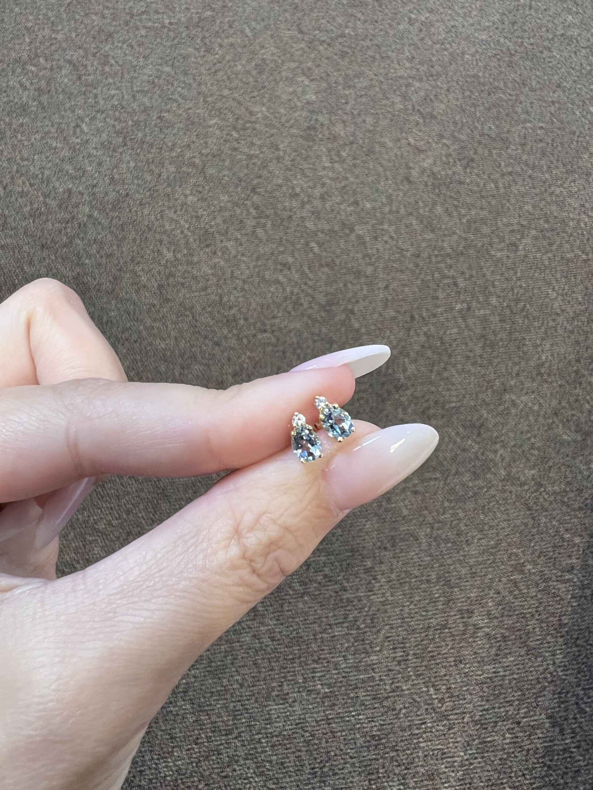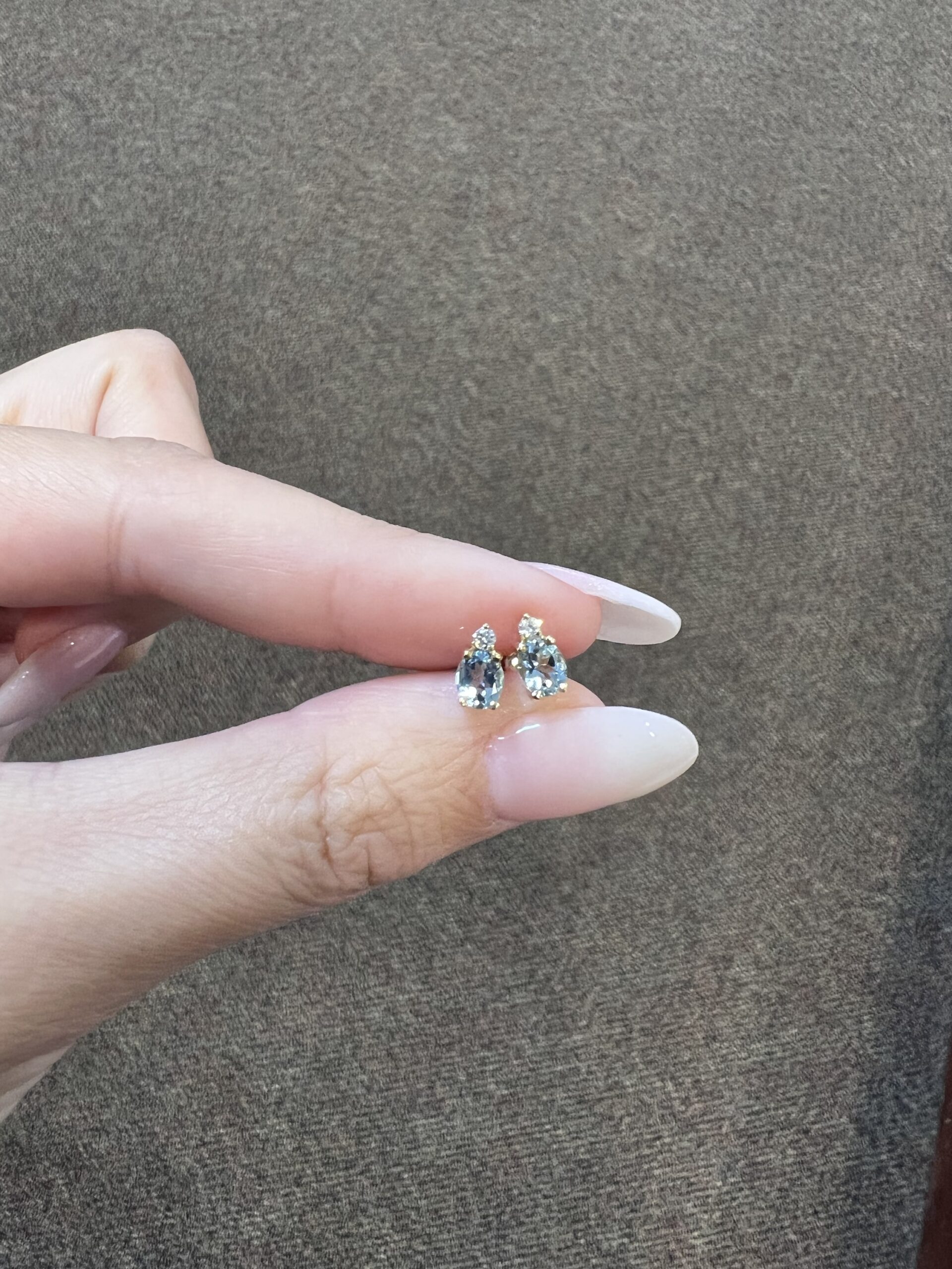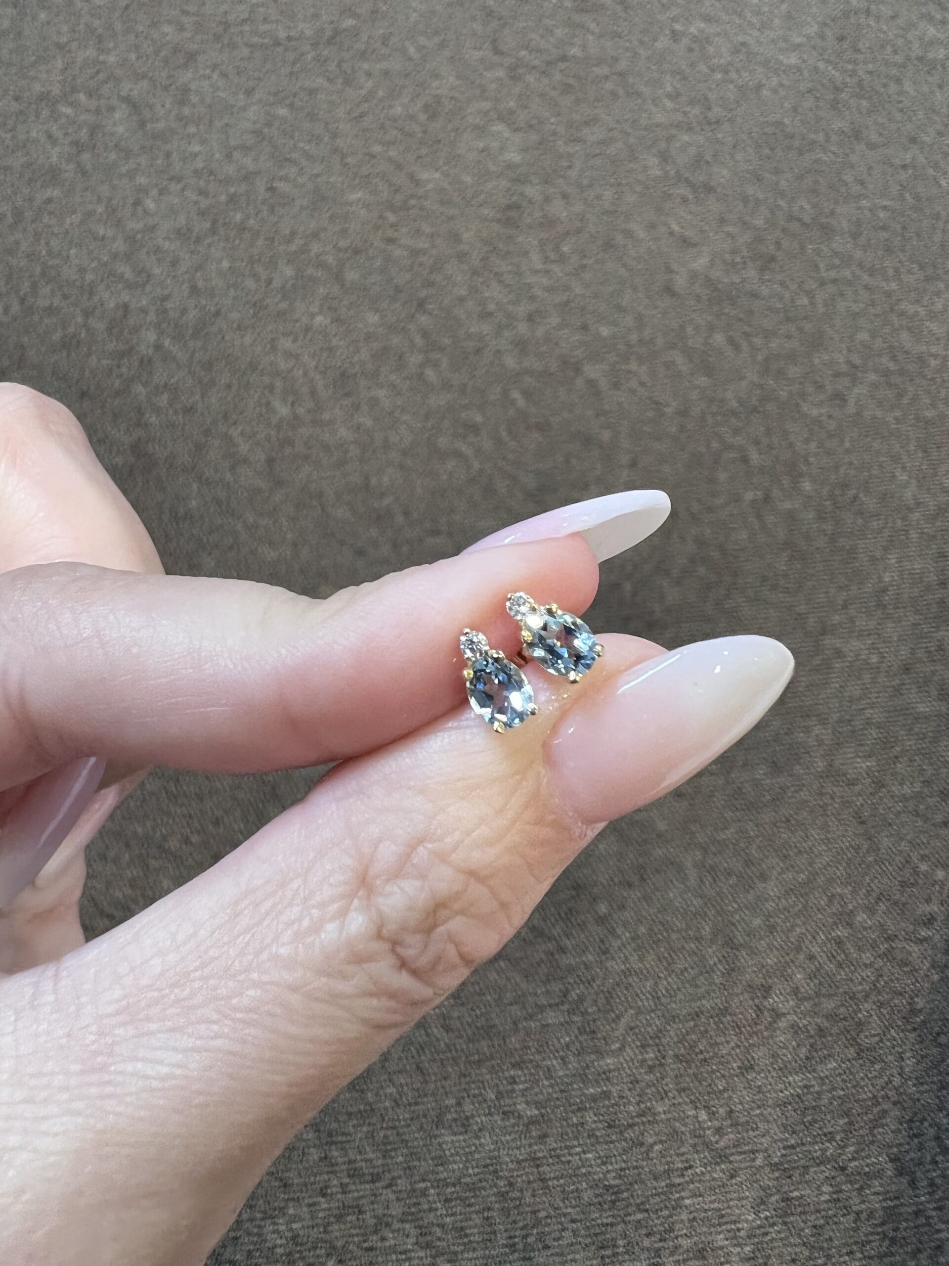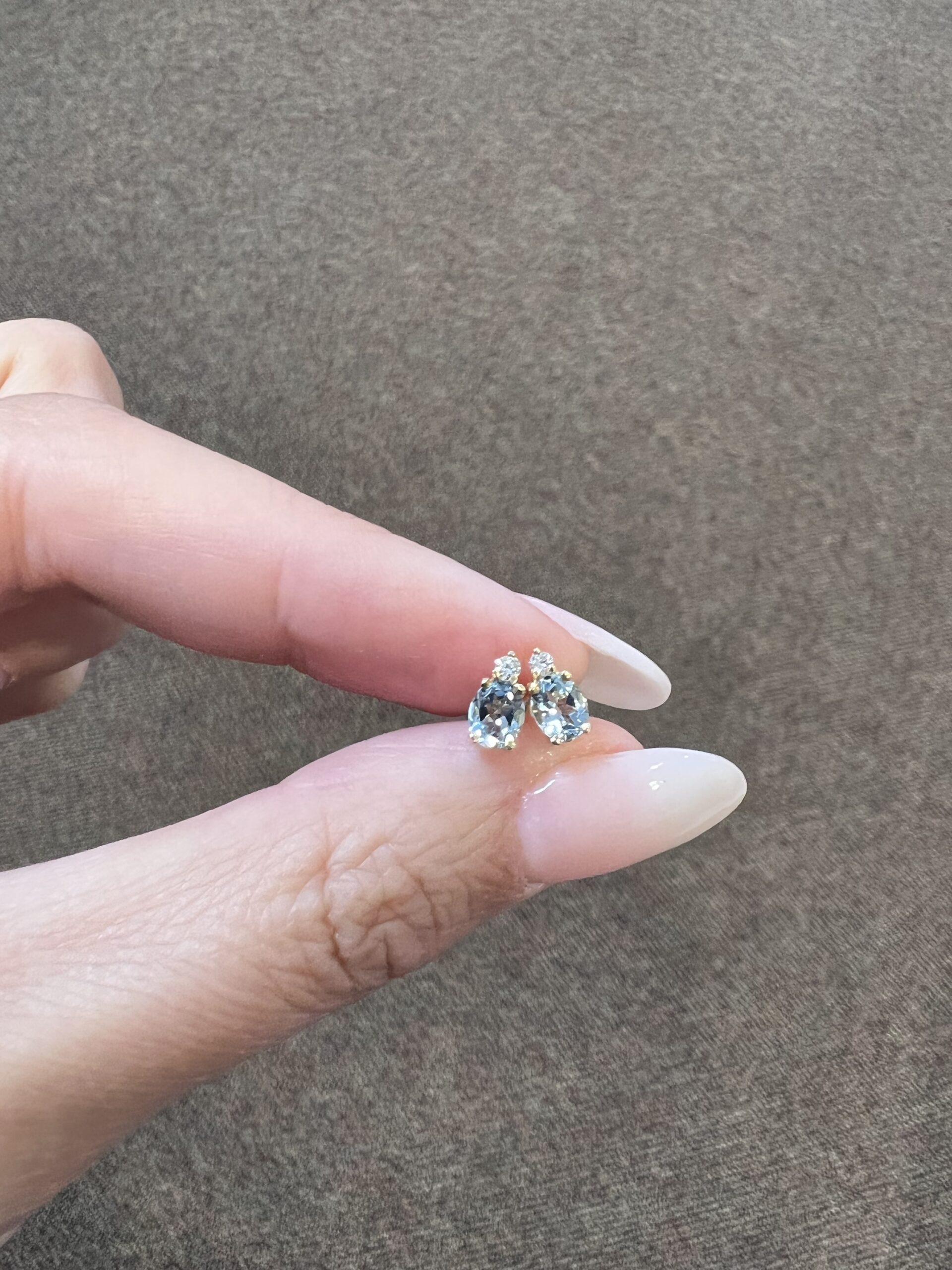 14k yellow gold oval shaped, faceted genuine .68 cttw Aquamarine (March birthstone) and genuine .06 cttw Round Brilliant Cut diamond basket set stud earrings. These diamonds average G-H in color and SI1 in clarity. These earrings have an entire weight of 1.1 grams.