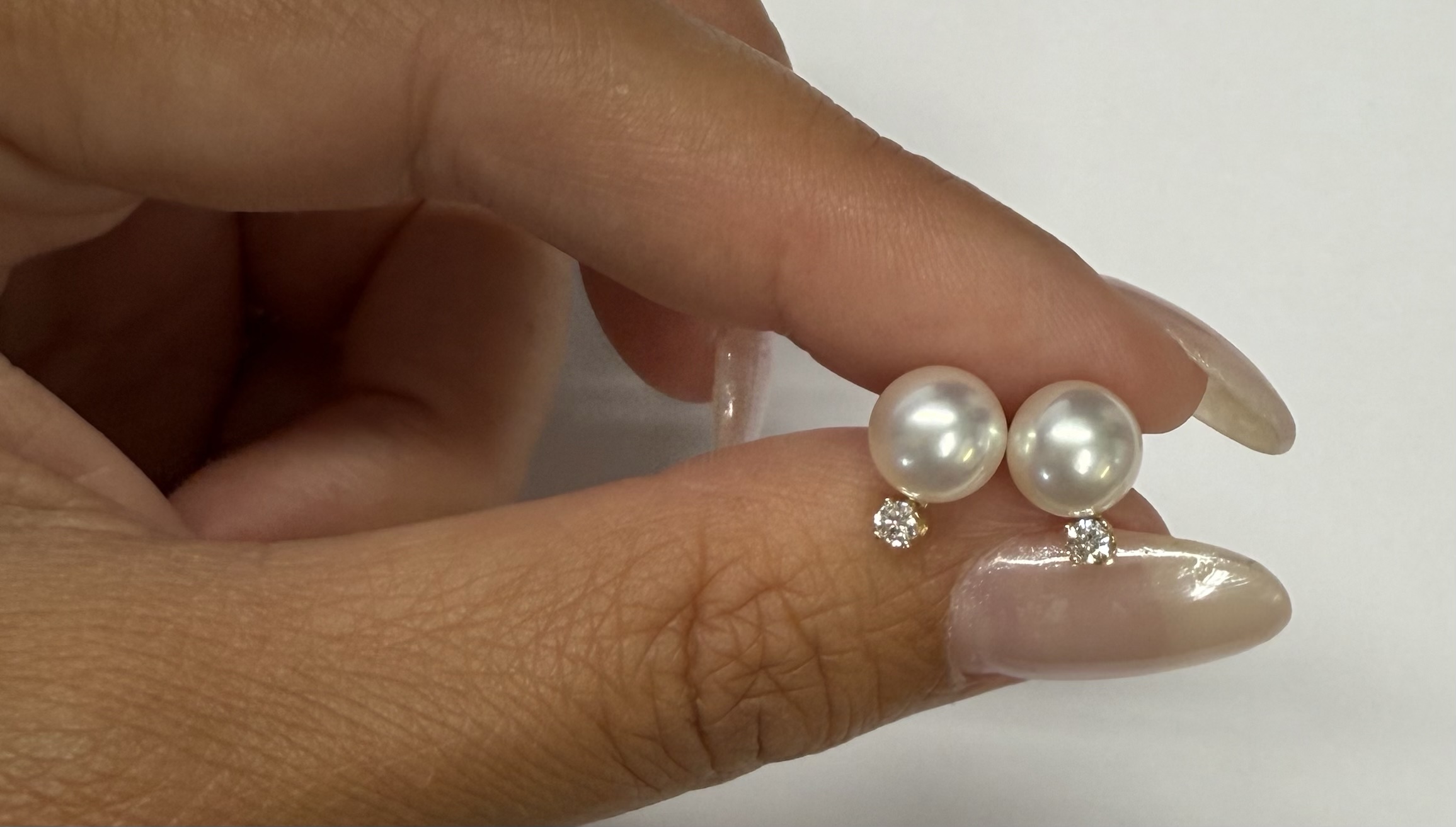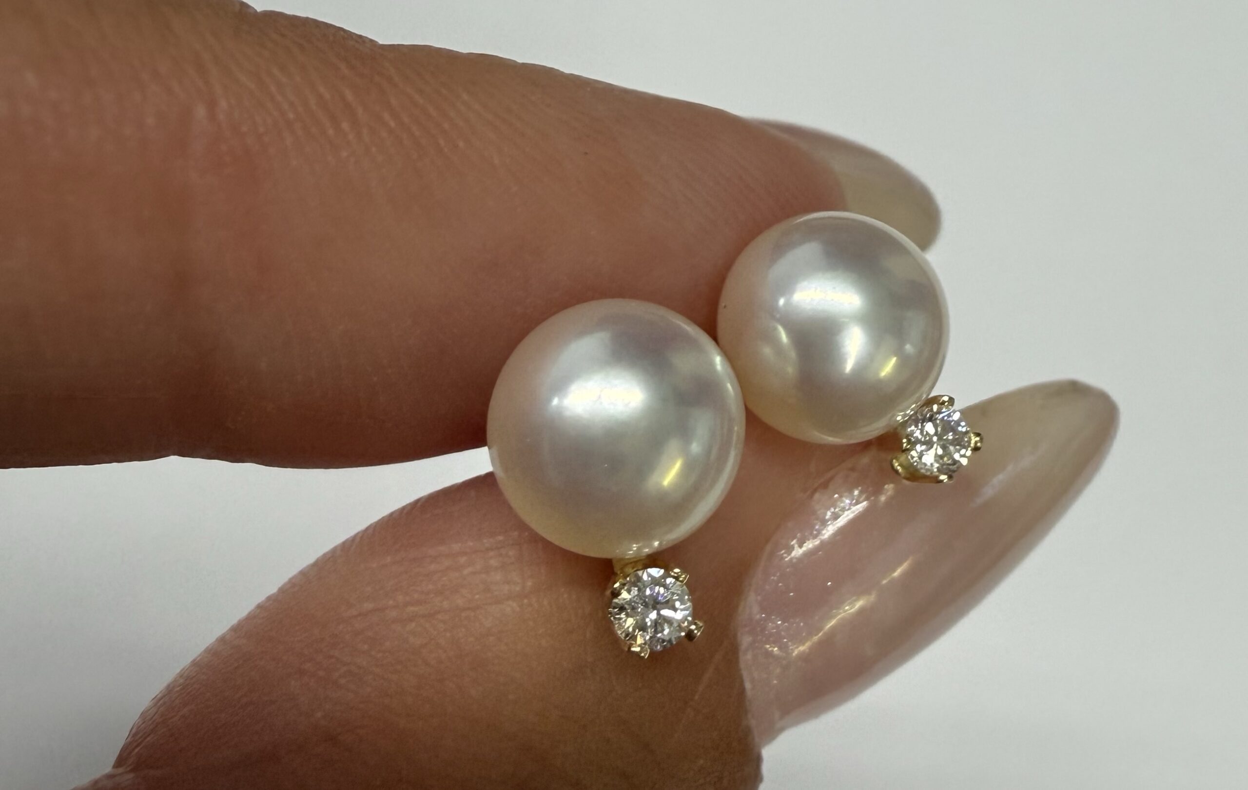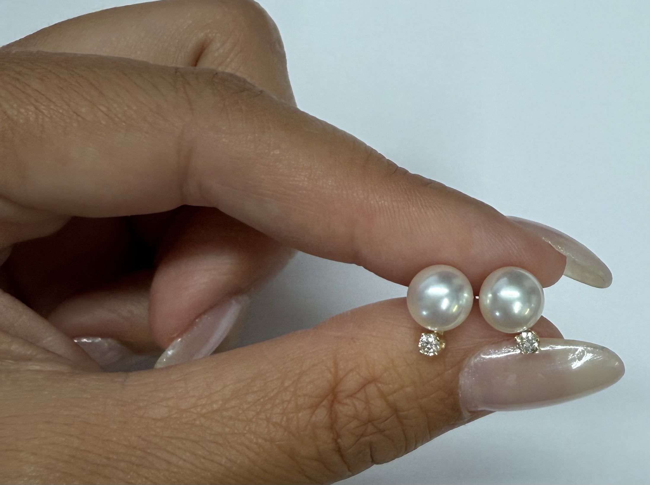 14k yellow gold 7 mm cultured saltwater pearl and genuine .10 cttw Round Brilliant Cut diamond stud earrings. These diamonds average G-H in color, and SI1 in clarity. These earrings have an entire weight of 1.7 grams.