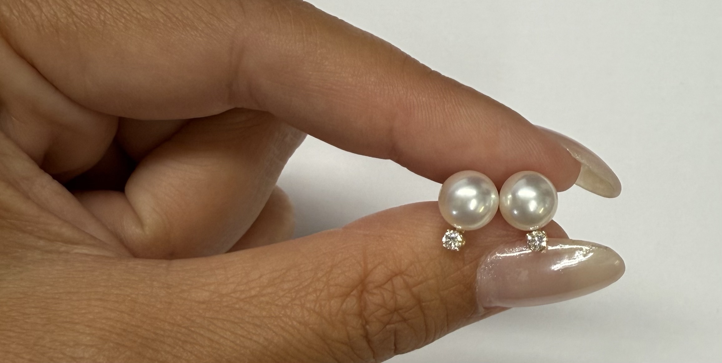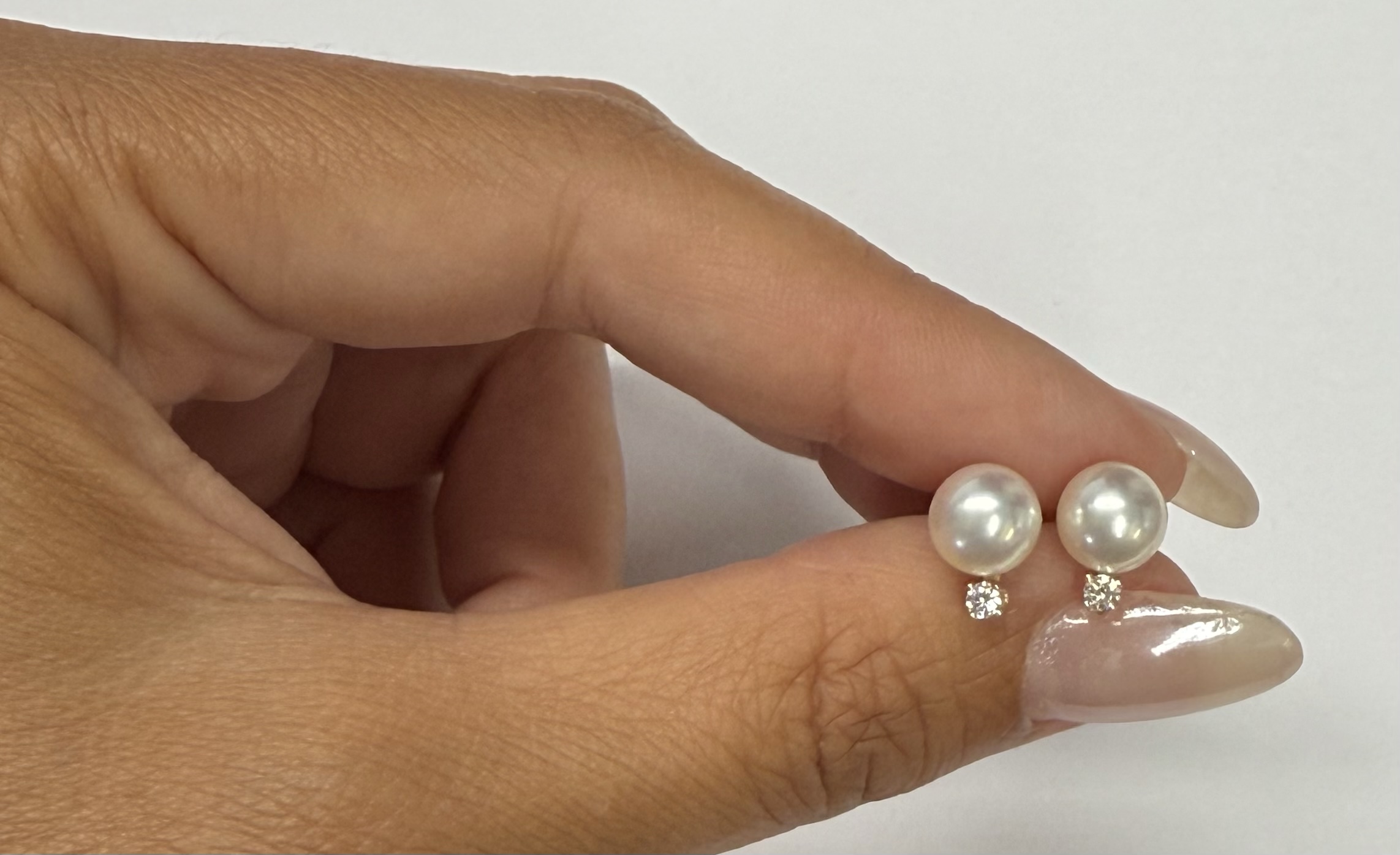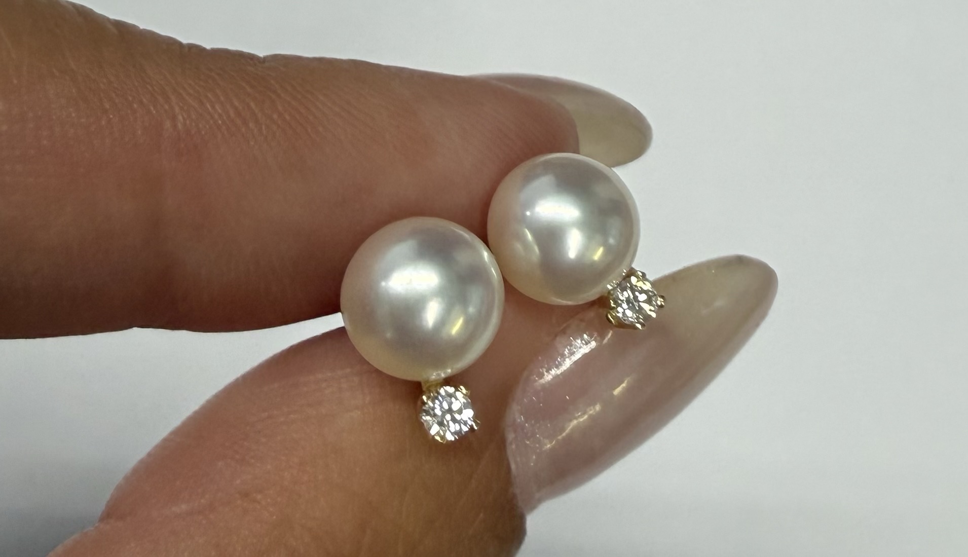 14k yellow gold 7 mm cultured saltwater pearl and genuine .10 cttw Round Brilliant Cut diamond stud earrings. These diamonds average G-H in color, and SI1 in clarity. These earrings have an entire weight of 1.7 grams.