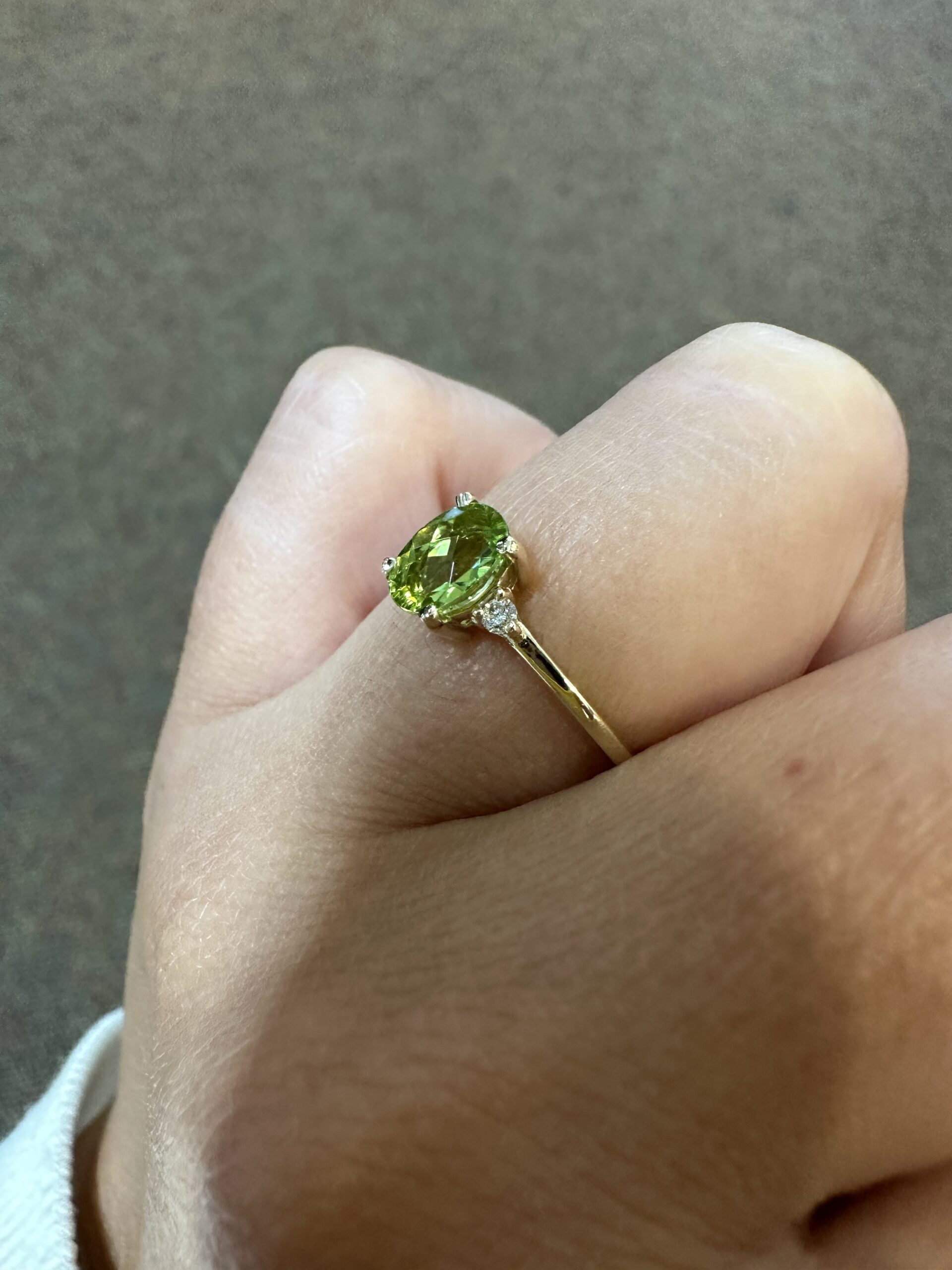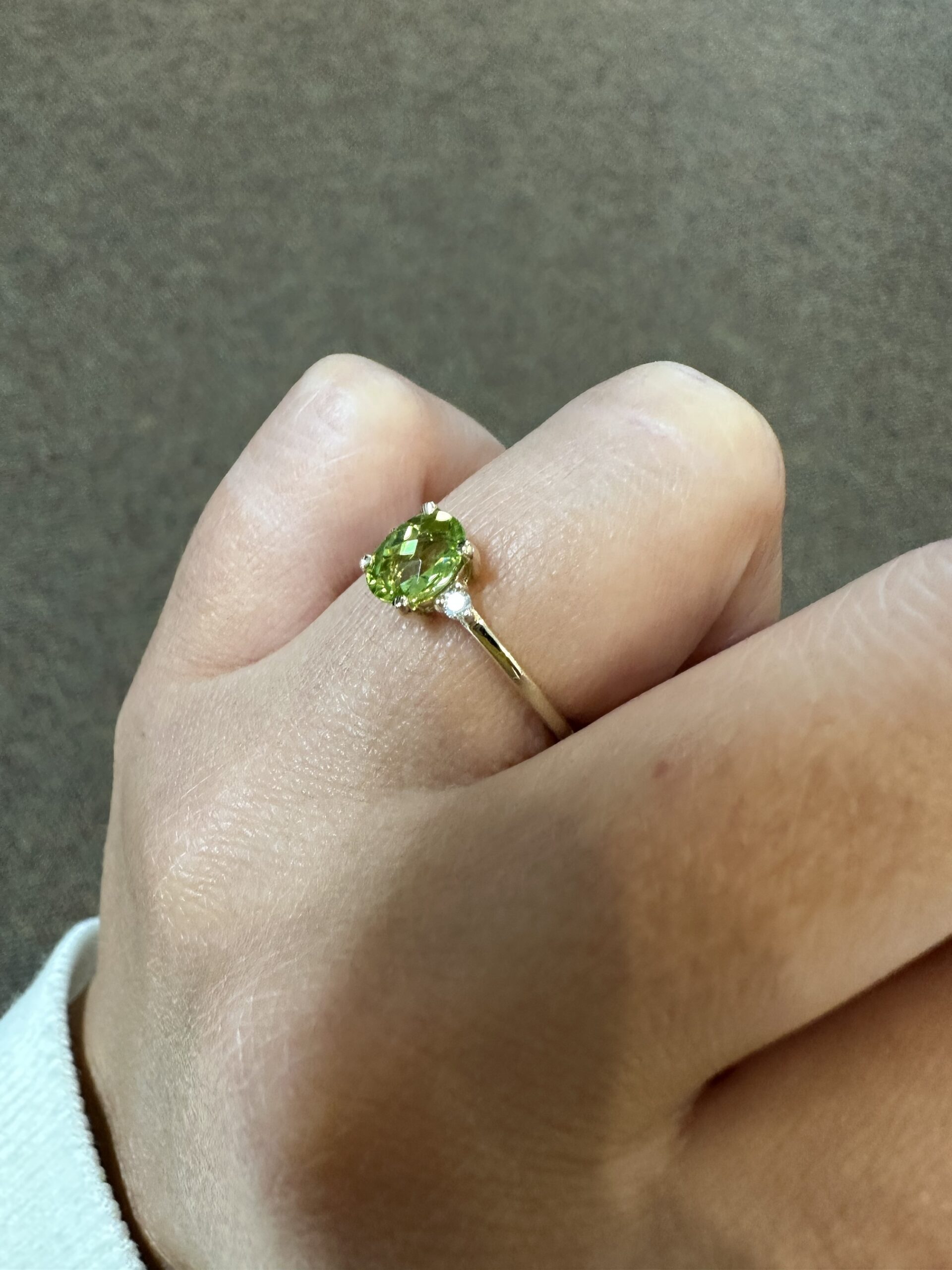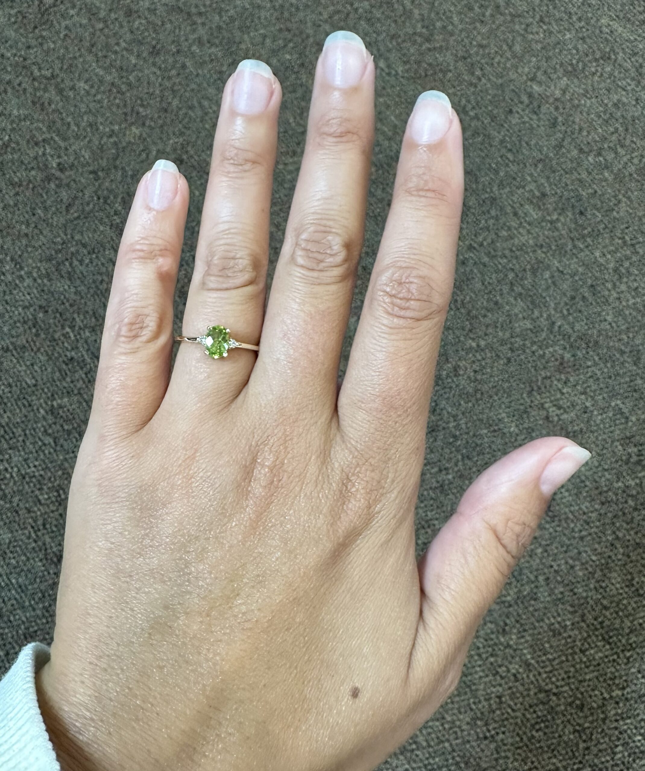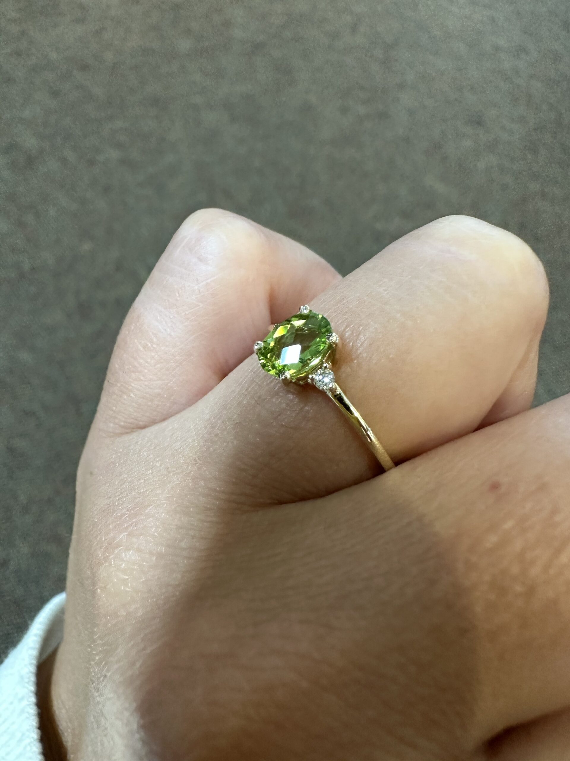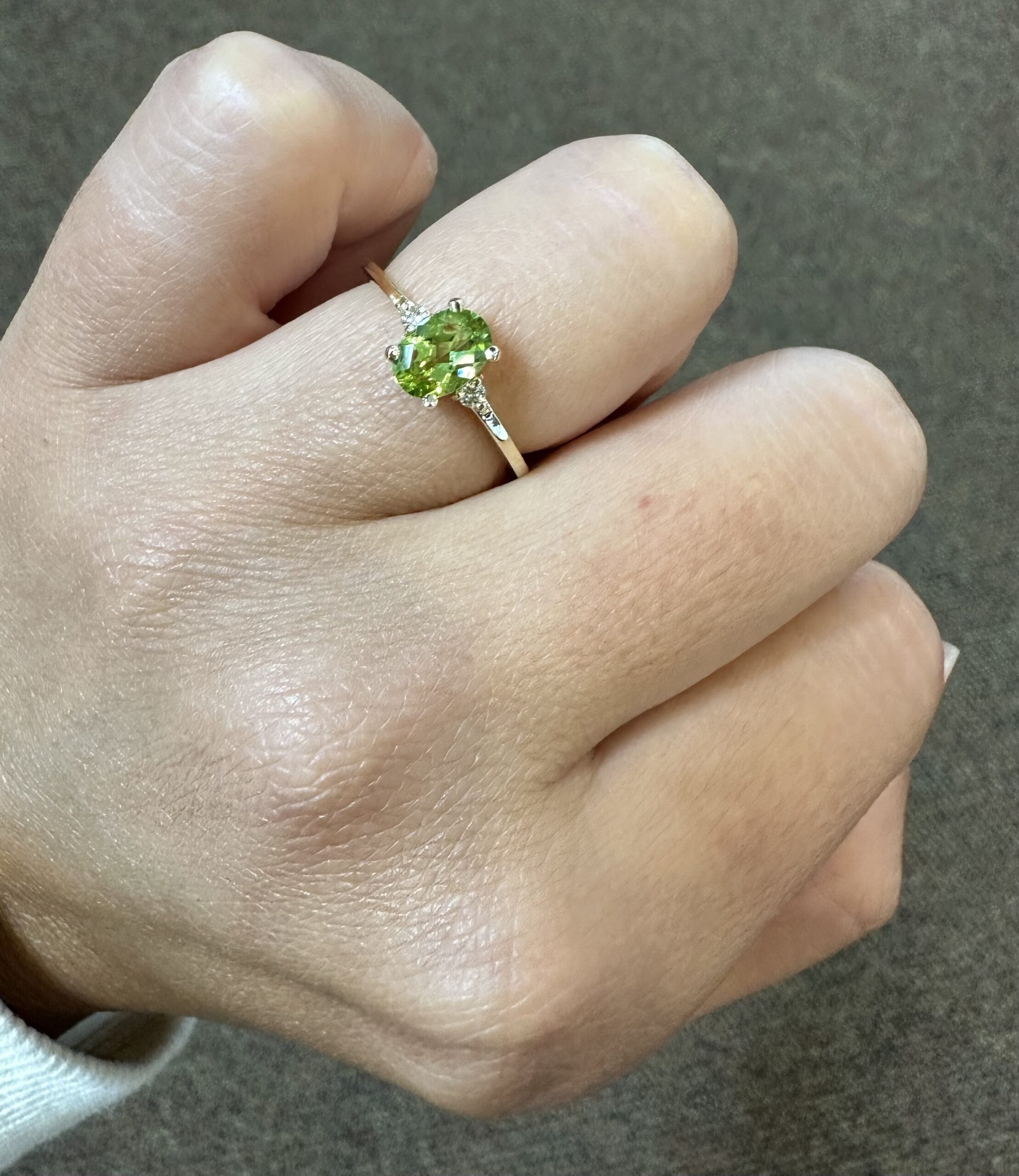 14k yellow gold genuine .70 carat oval shaped, faceted Peridot (August birthstone) & .06 cttw Round Brilliant Cut diamond ring. These diamonds average G-H in color and SI1 in clarity. This ring has an entire weight of 1.9 grams. This ring is a finger size 6 1/4, but it can be slightly sized. Please make note of the finger size desired in the comments section at checkout.