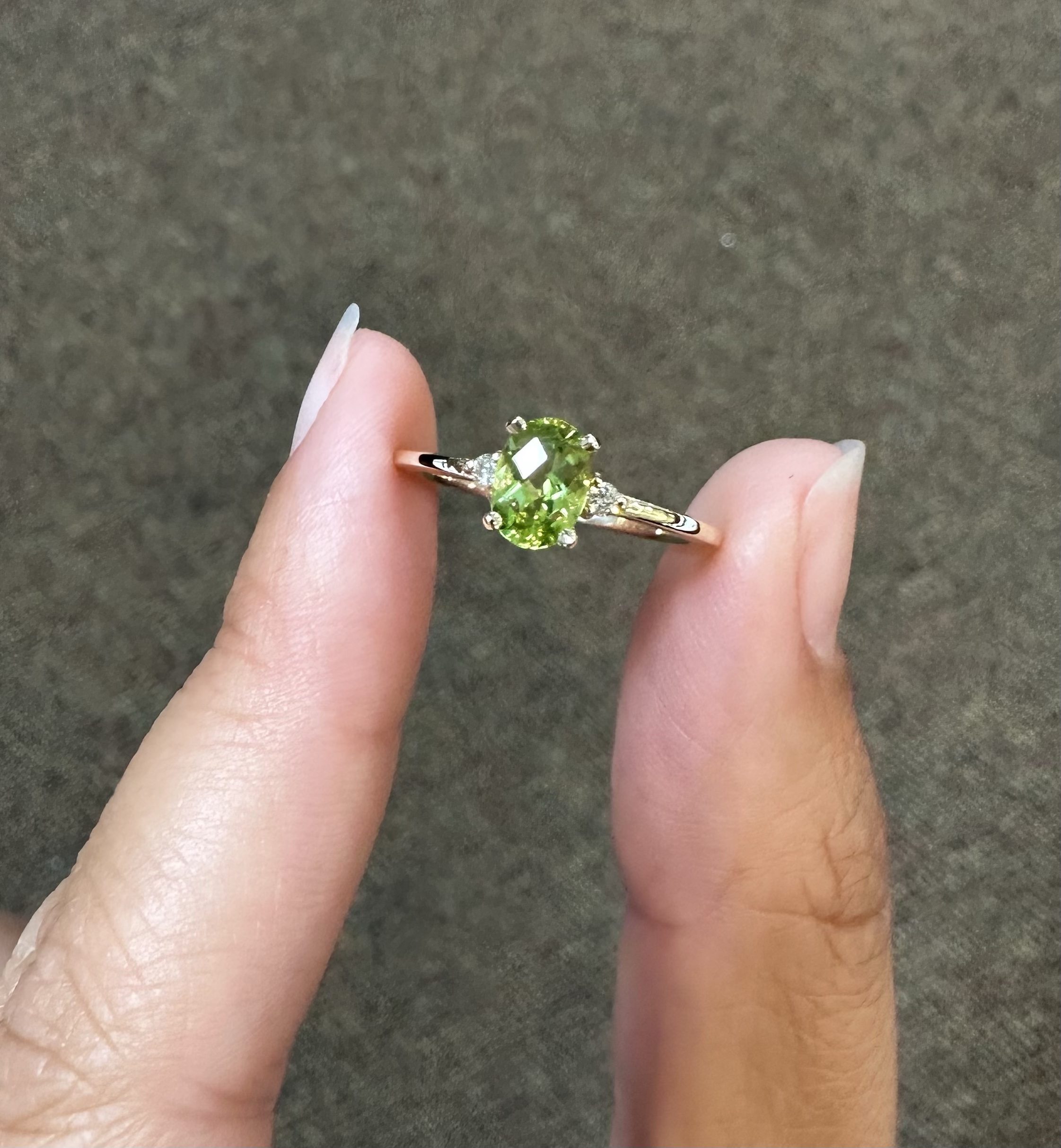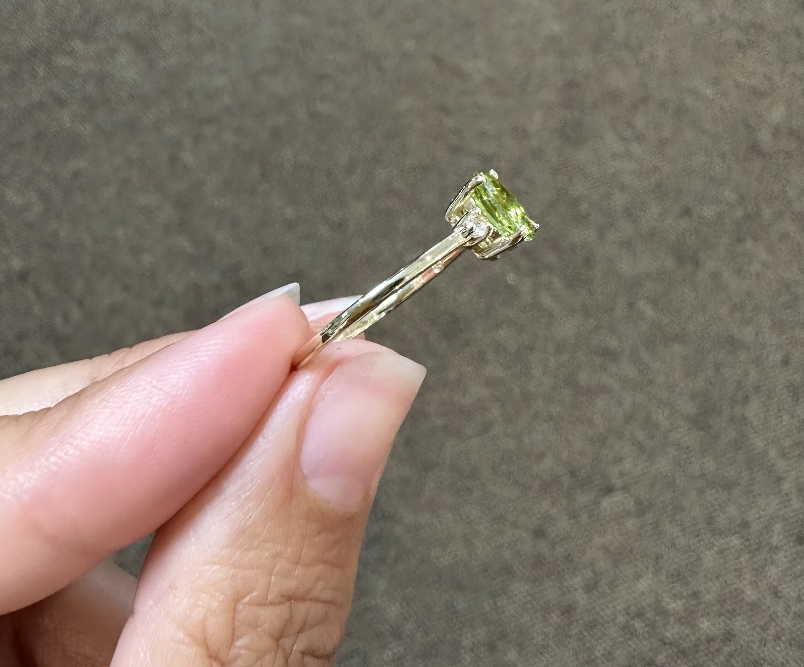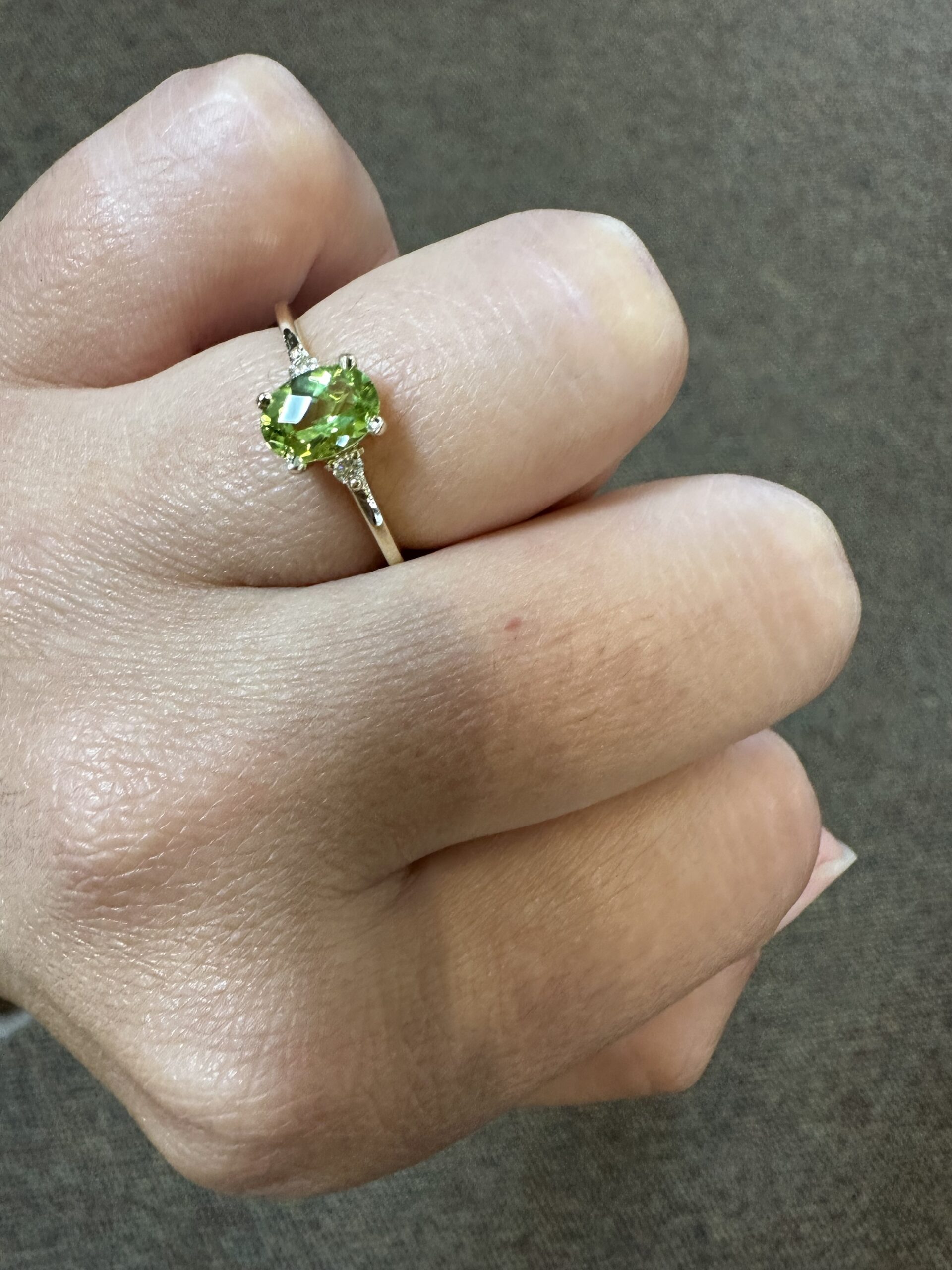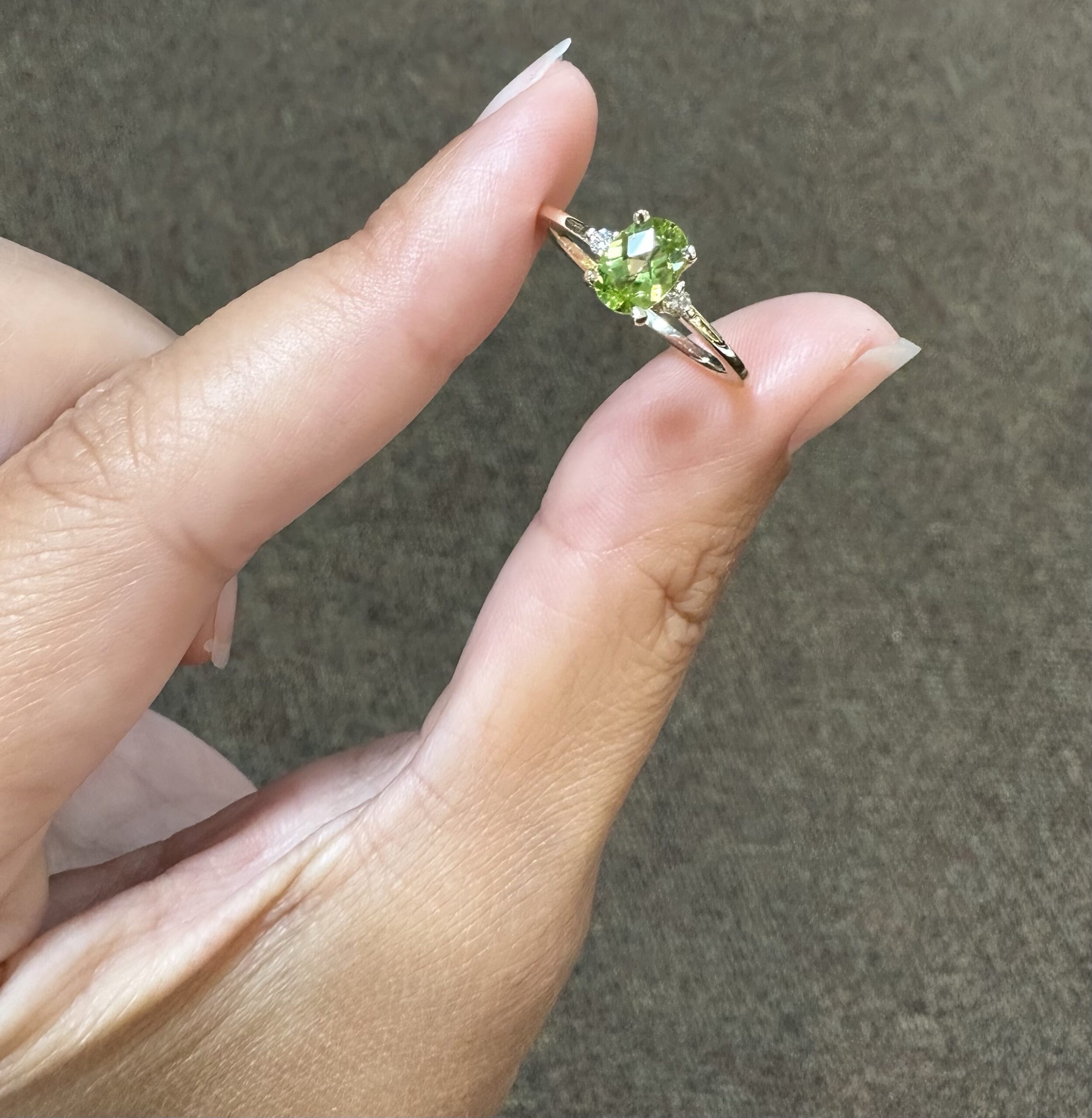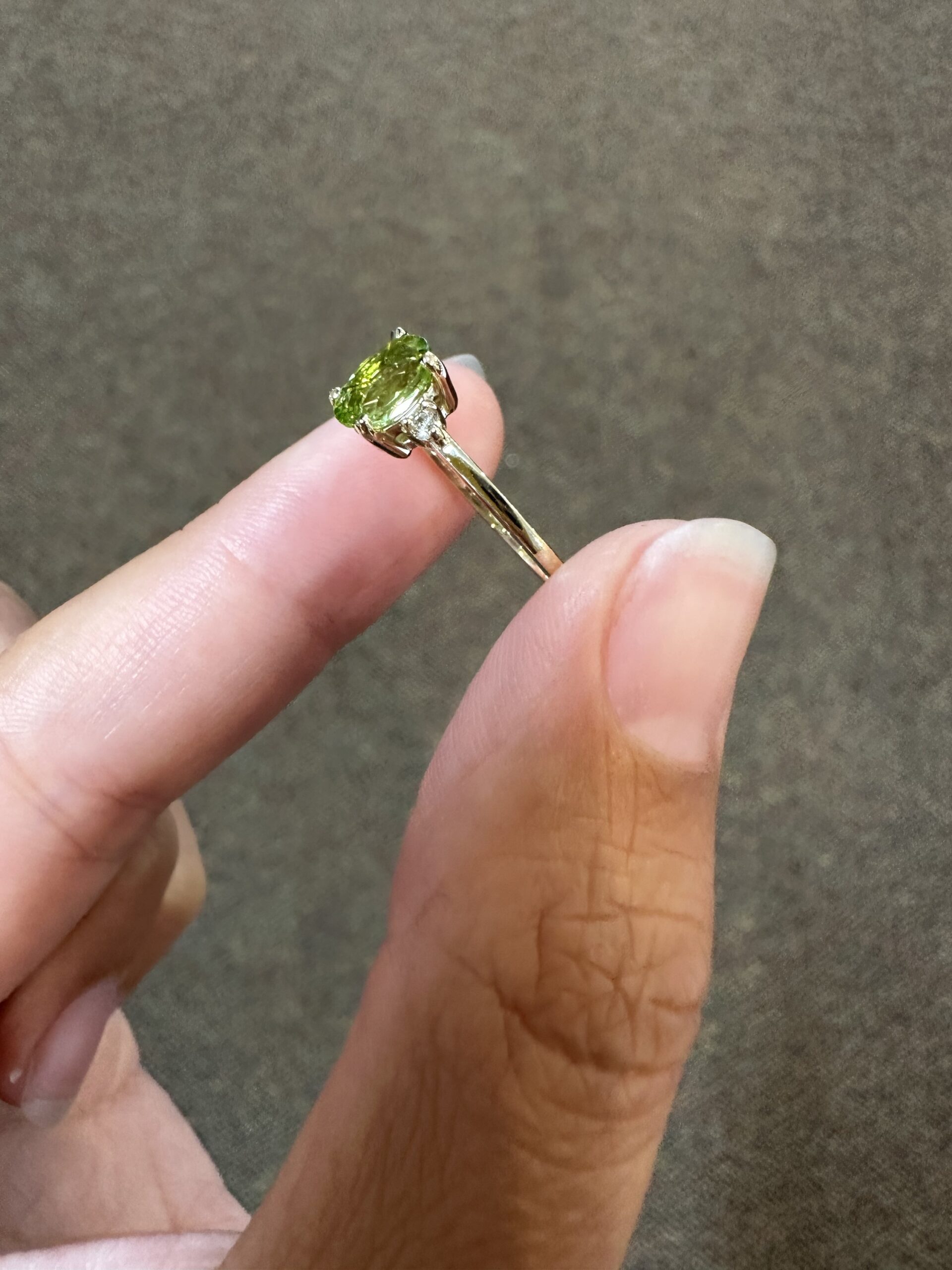 14k yellow gold genuine .70 carat oval shaped, faceted Peridot (August birthstone) & .06 cttw Round Brilliant Cut diamond ring. These diamonds average G-H in color and SI1 in clarity. This ring has an entire weight of 1.9 grams. This ring is a finger size 6 1/4, but it can be slightly sized. Please make note of the finger size desired in the comments section at checkout.