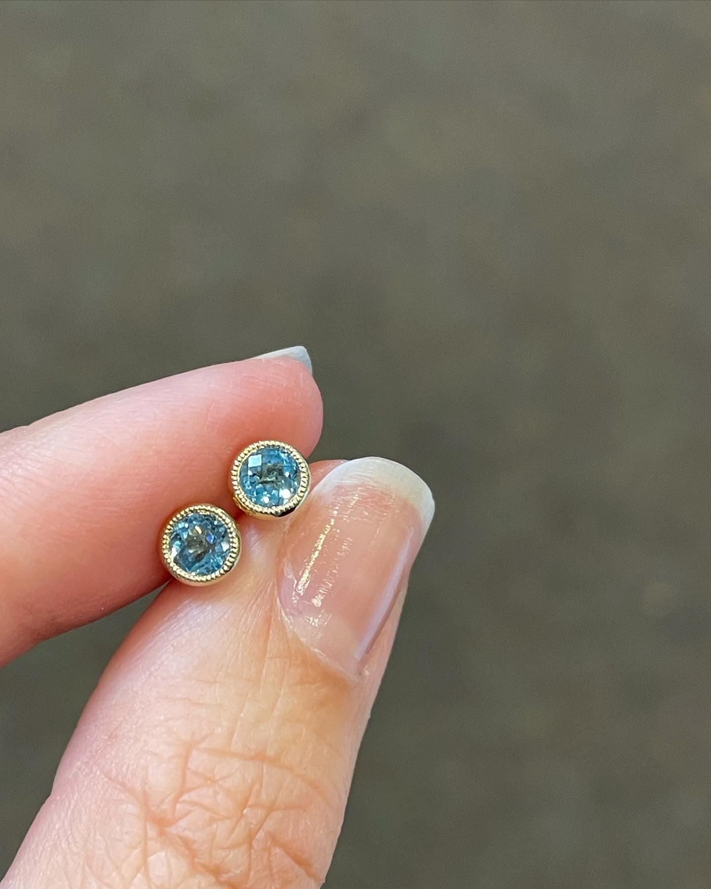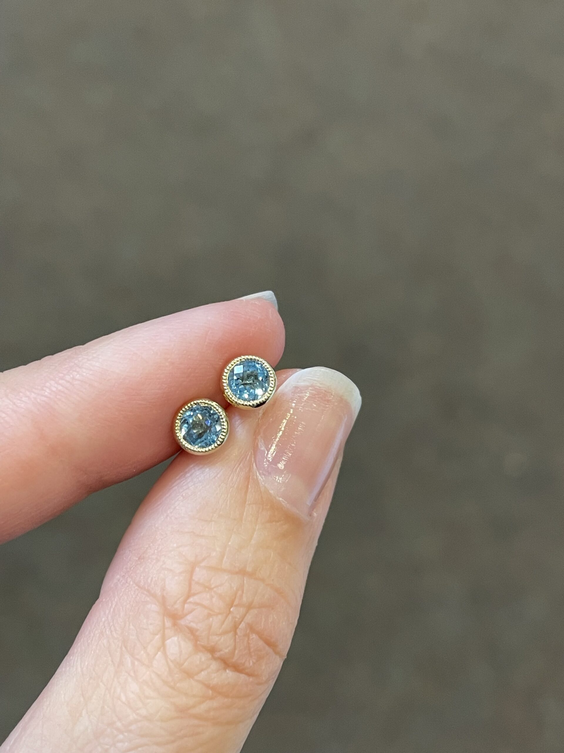 14k yellow gold genuine round, faceted, .70 Cttw Blue Topaz bezel set stud earrings with filigree and mill grain details. These earrings measure 5 mm in size.