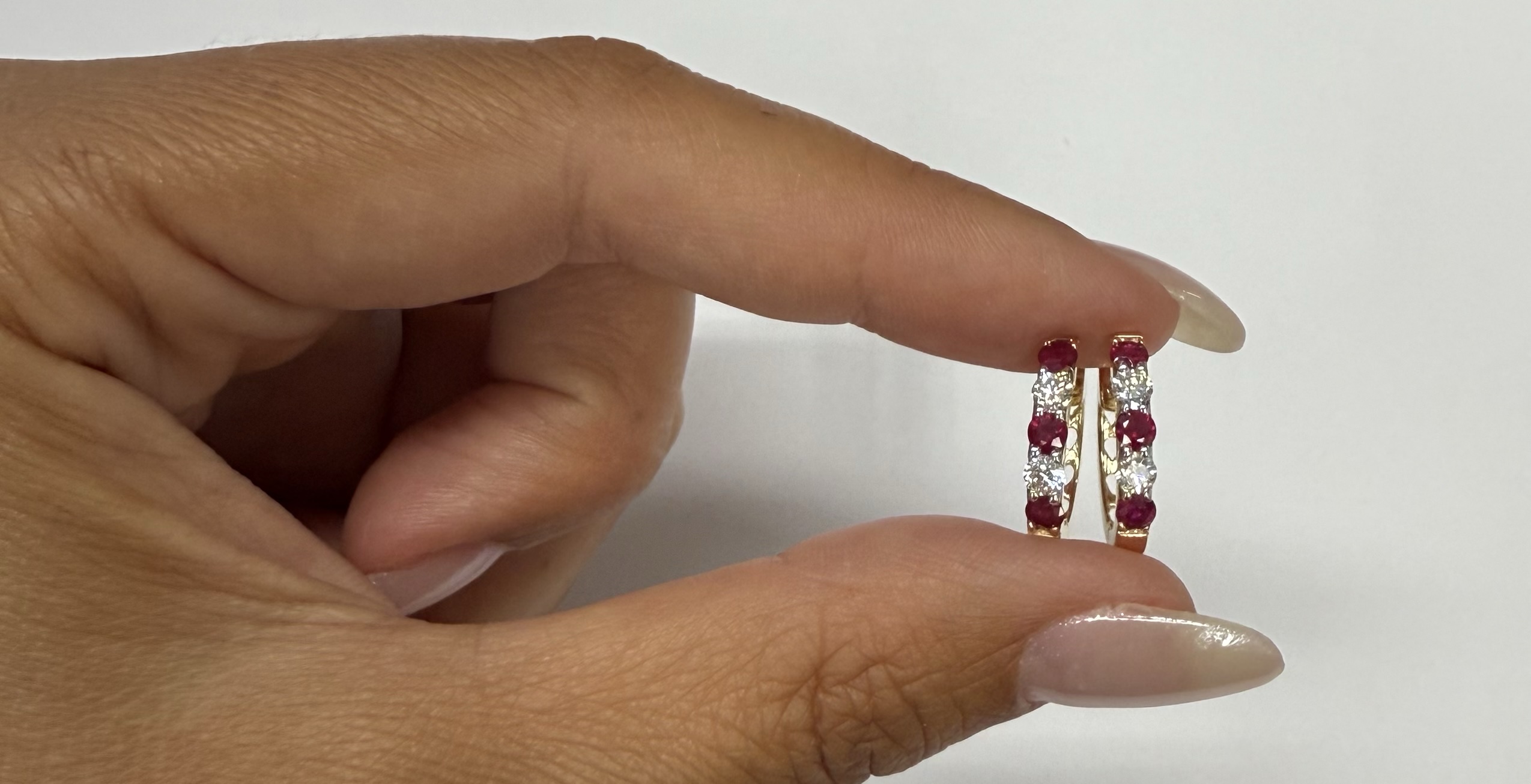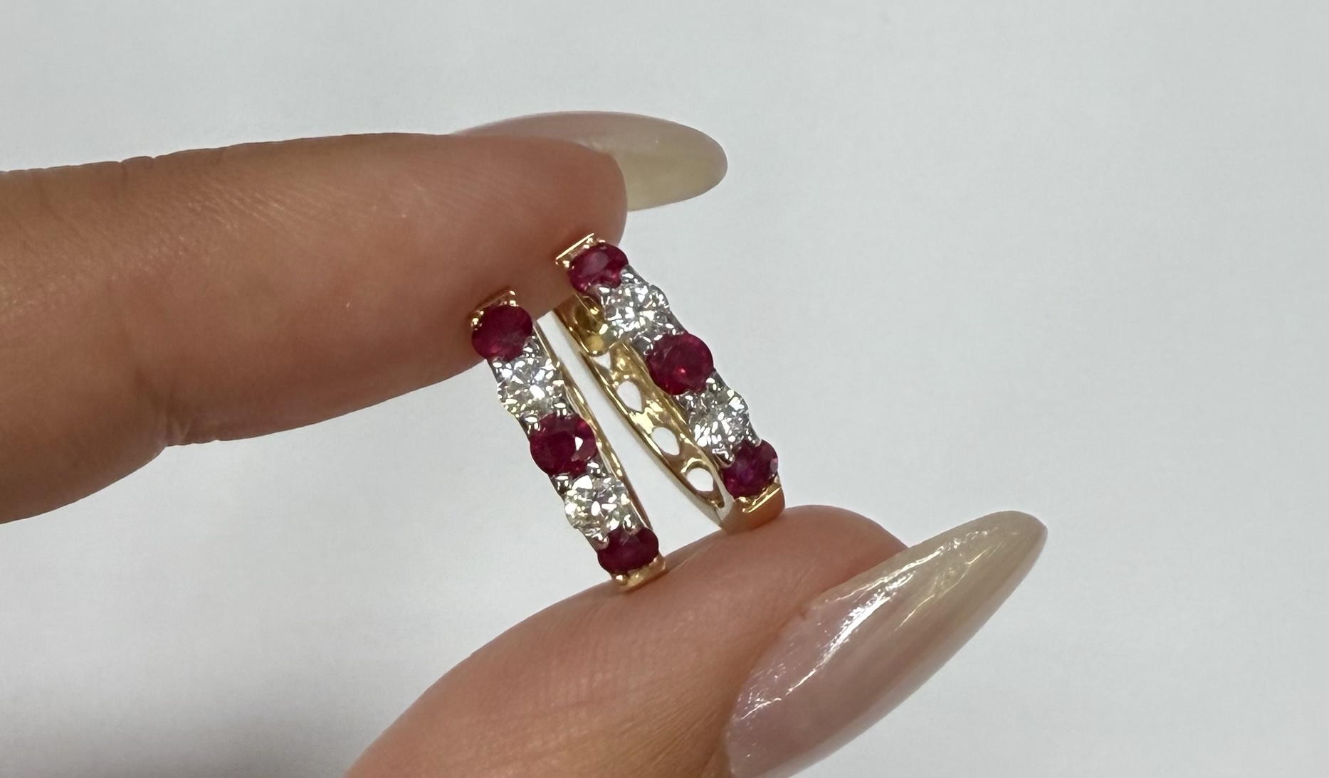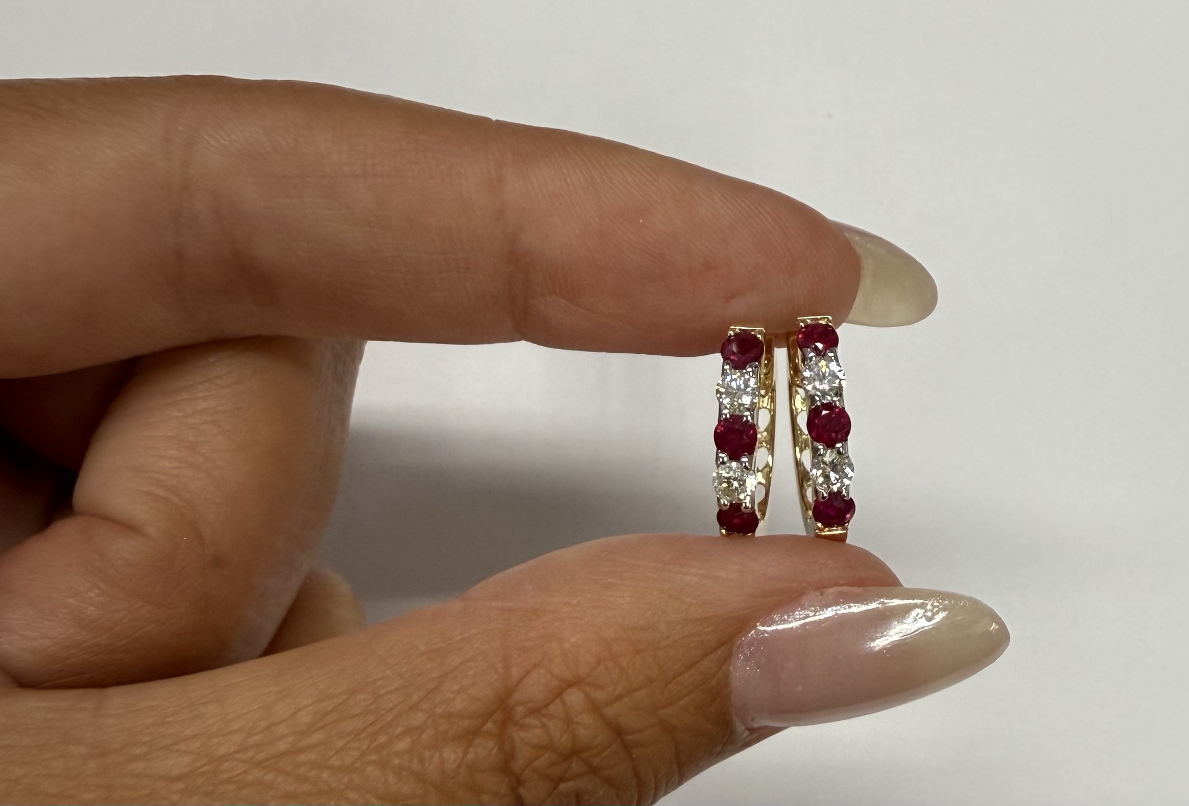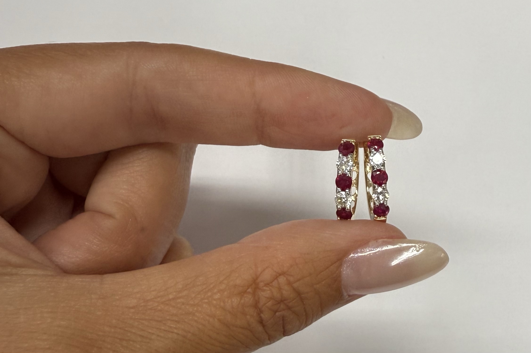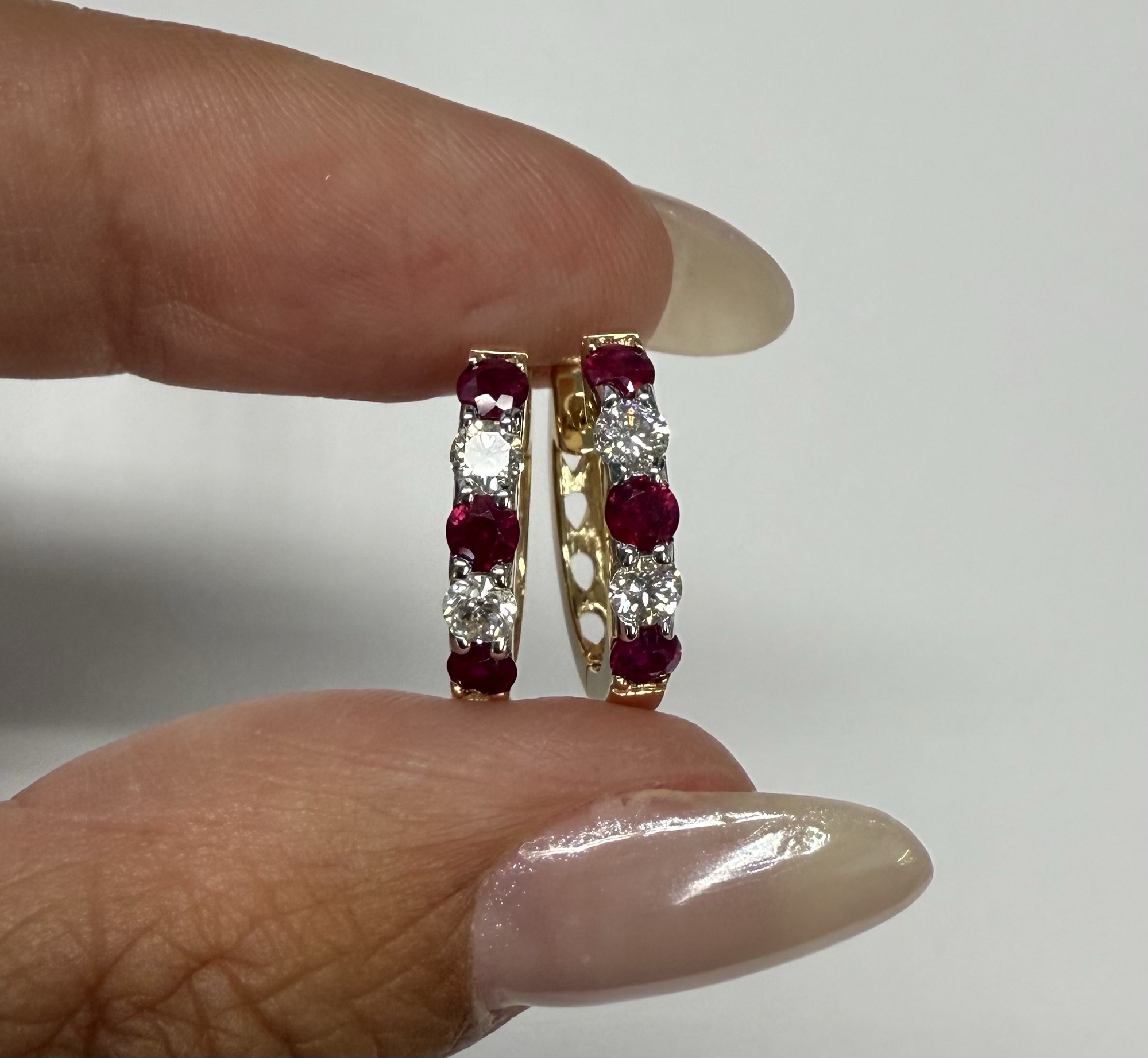 14k yellow gold oval shaped genuine .73 Cttw Ruby (July birthstone) and genuine .40 cttw Round Brilliant Cut diamond hoop earrings. These diamonds average G-H in color, and SI1-SI2 in clarity. These diamonds are nicely proportioned and well finished. These earrings have an entire weight of 2.9 grams.