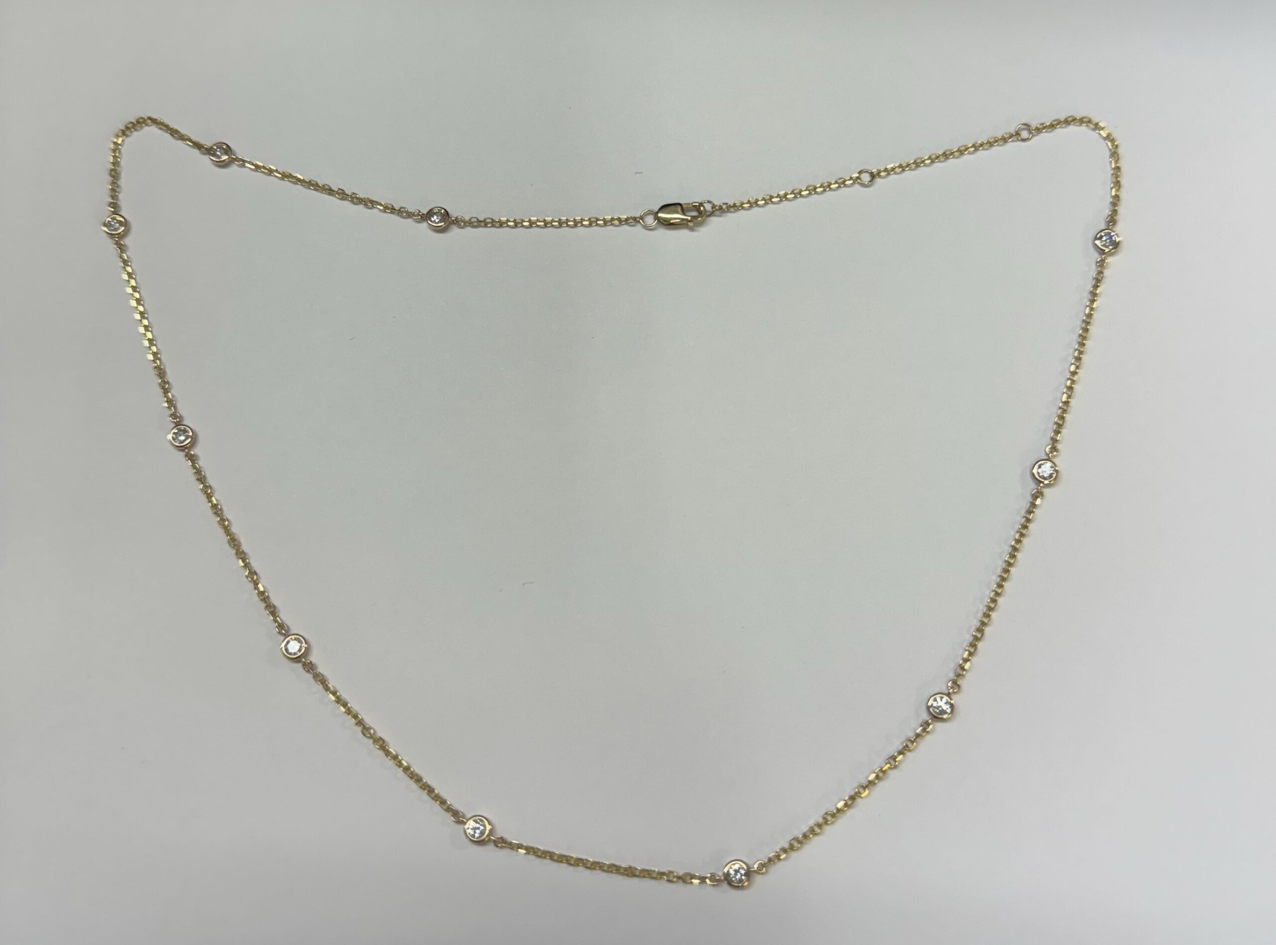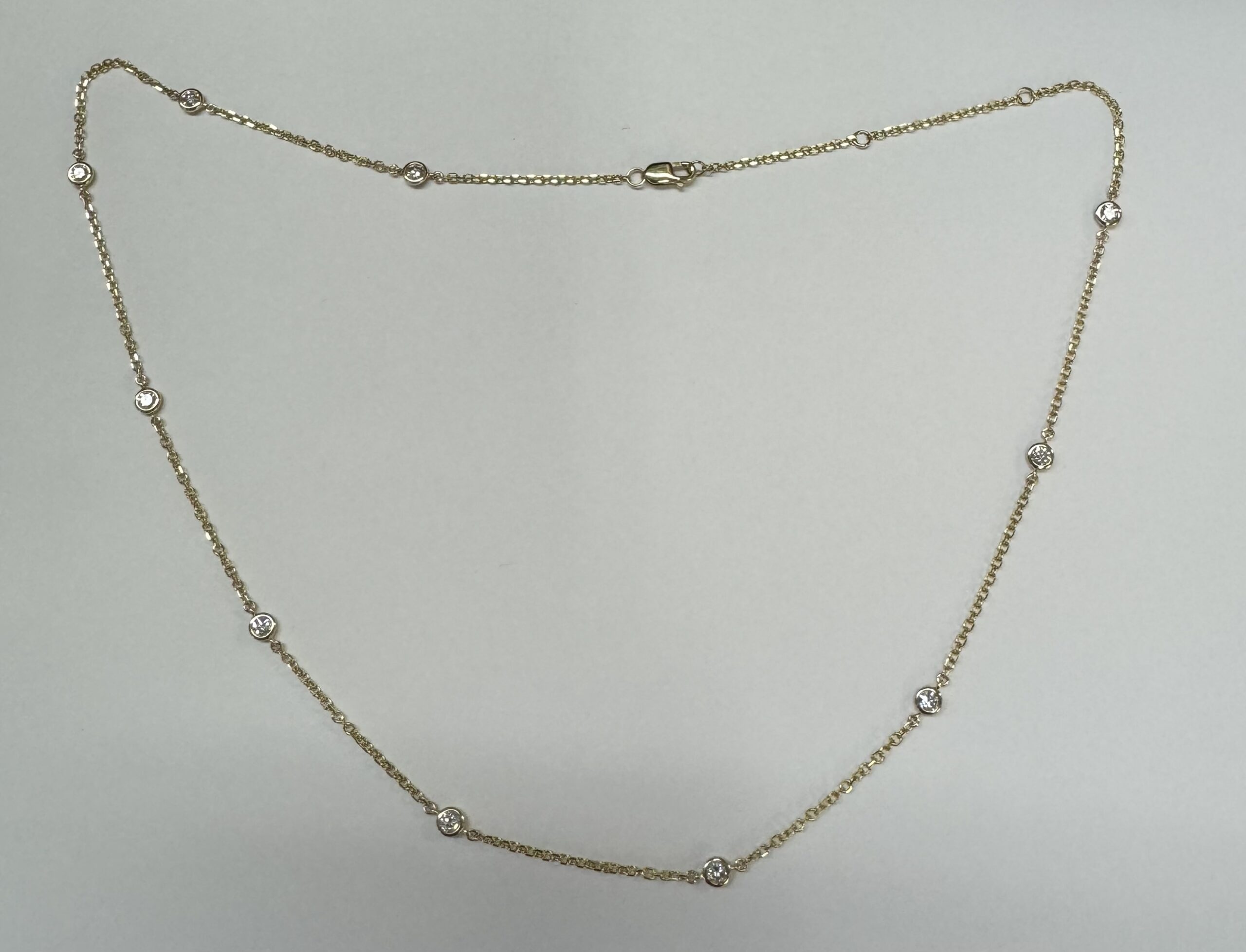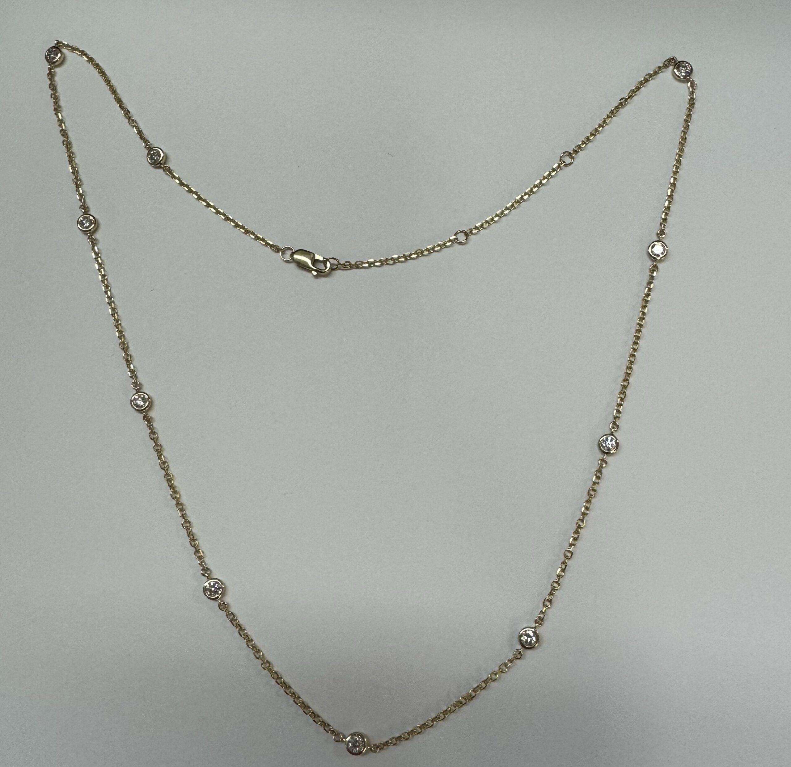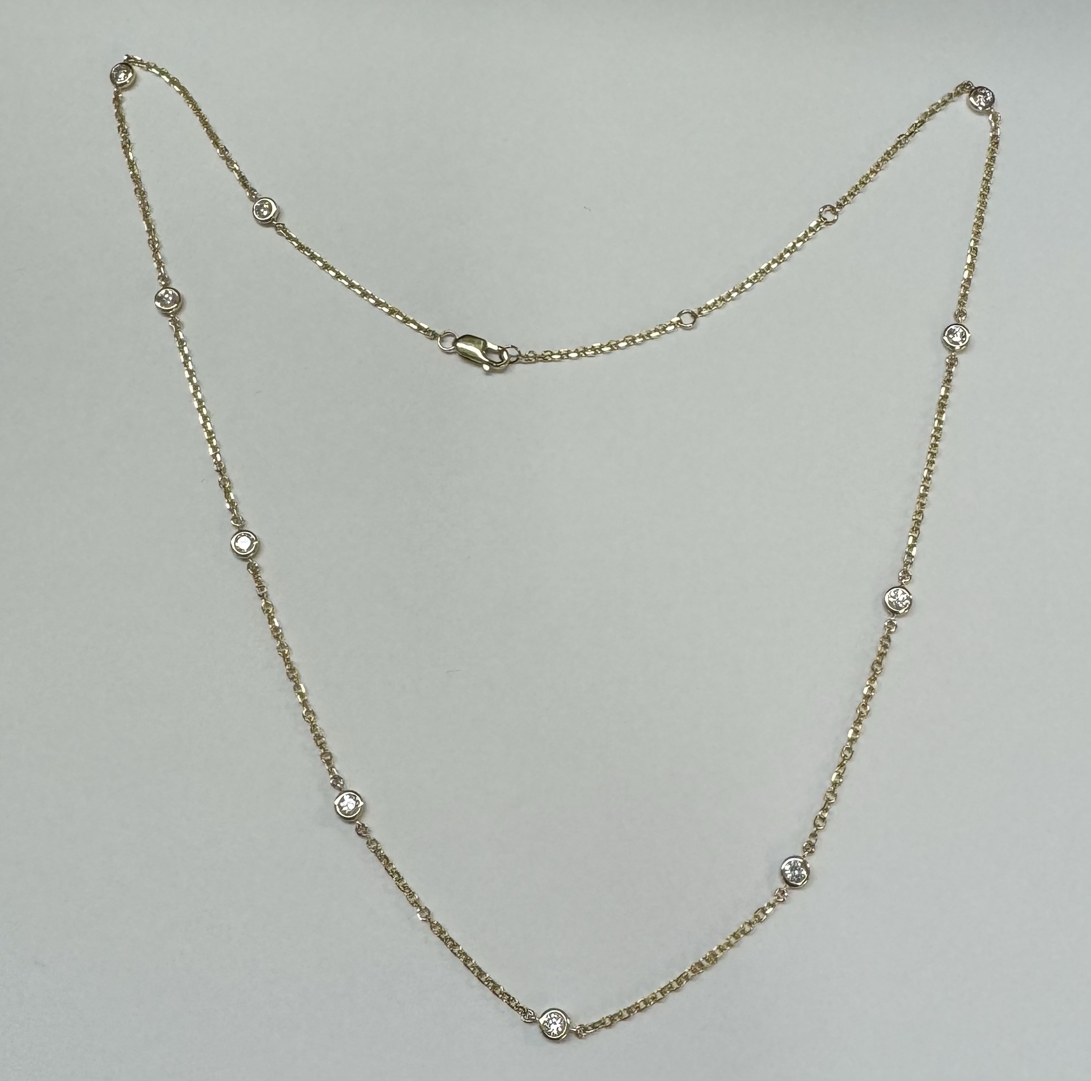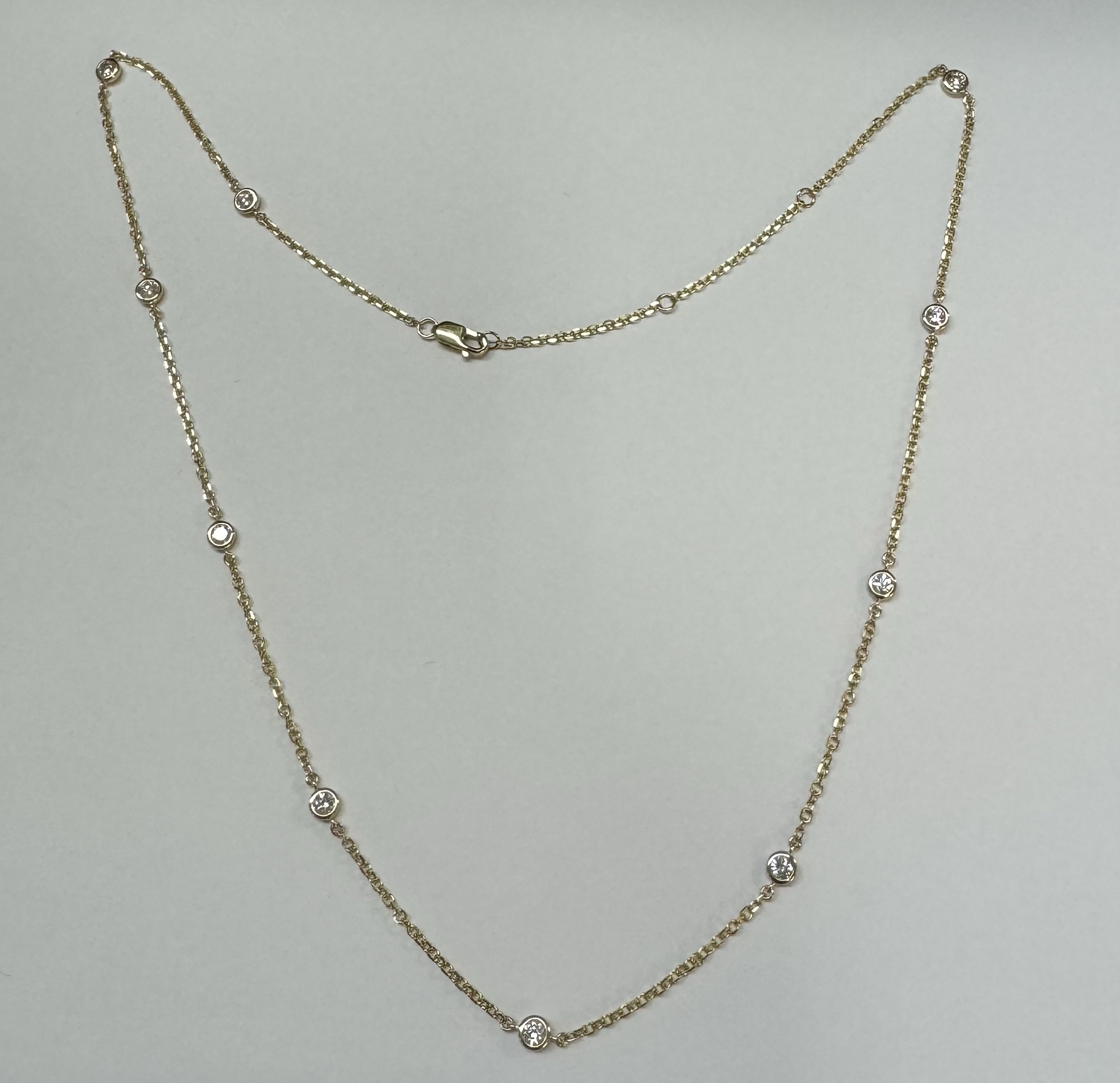 14k yellow gold 10 stone bezel set genuine .75 cttw Round Brilliant Cut diamond by the yard necklace. These diamonds average G-H in color and SI1 in clarity. This necklace is adjustable 16-18”. This necklace has an entire weight of 3.5 grams.