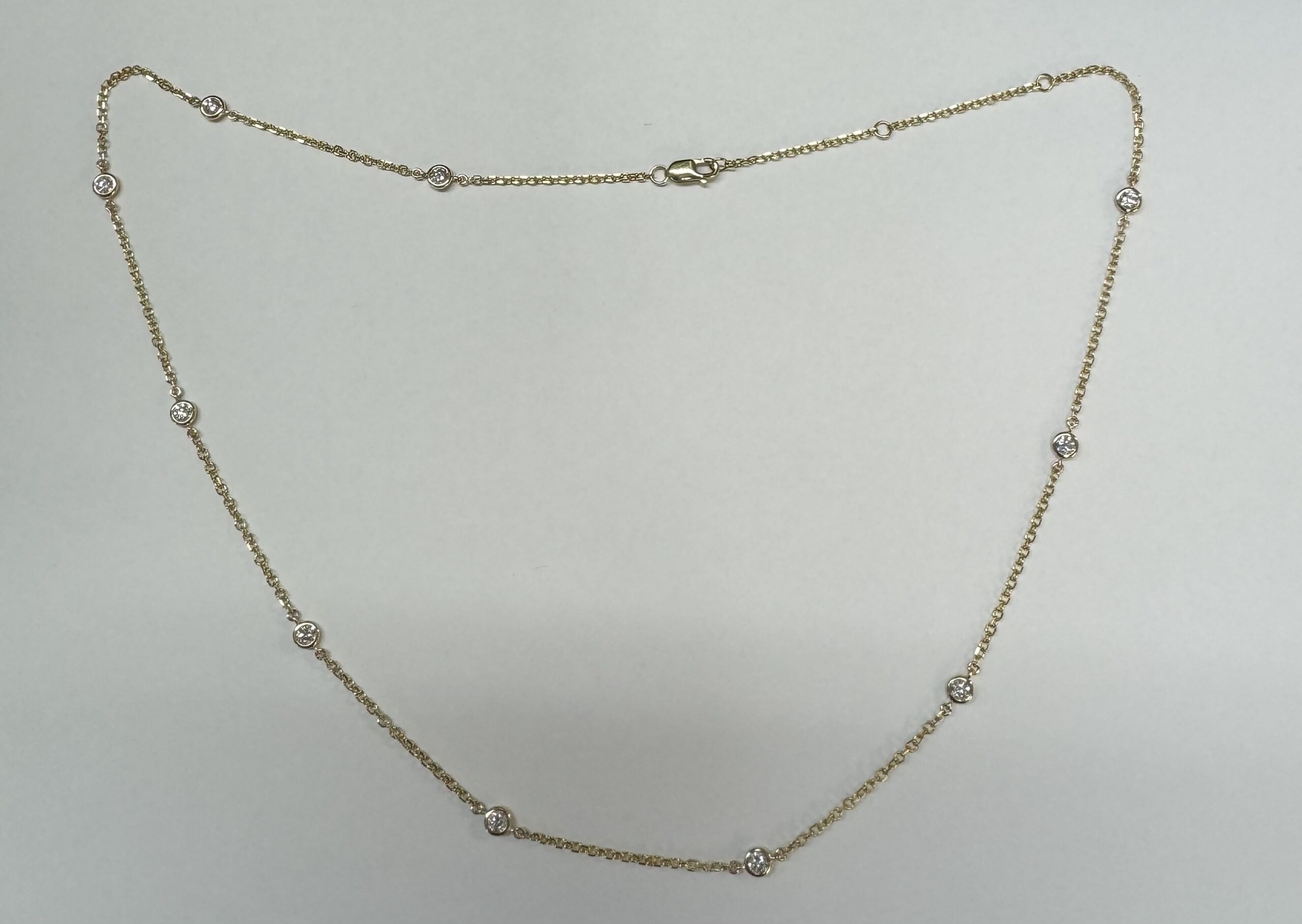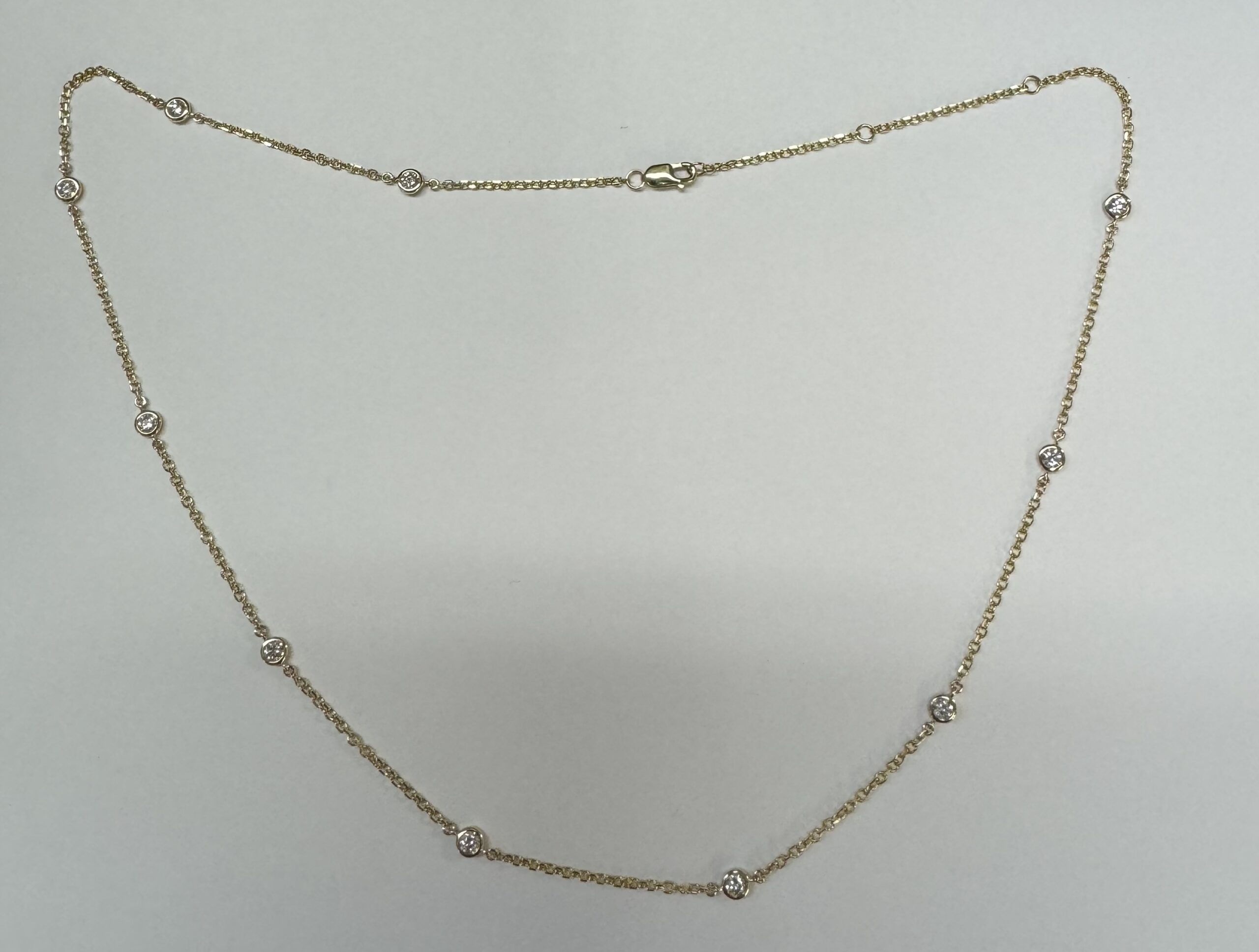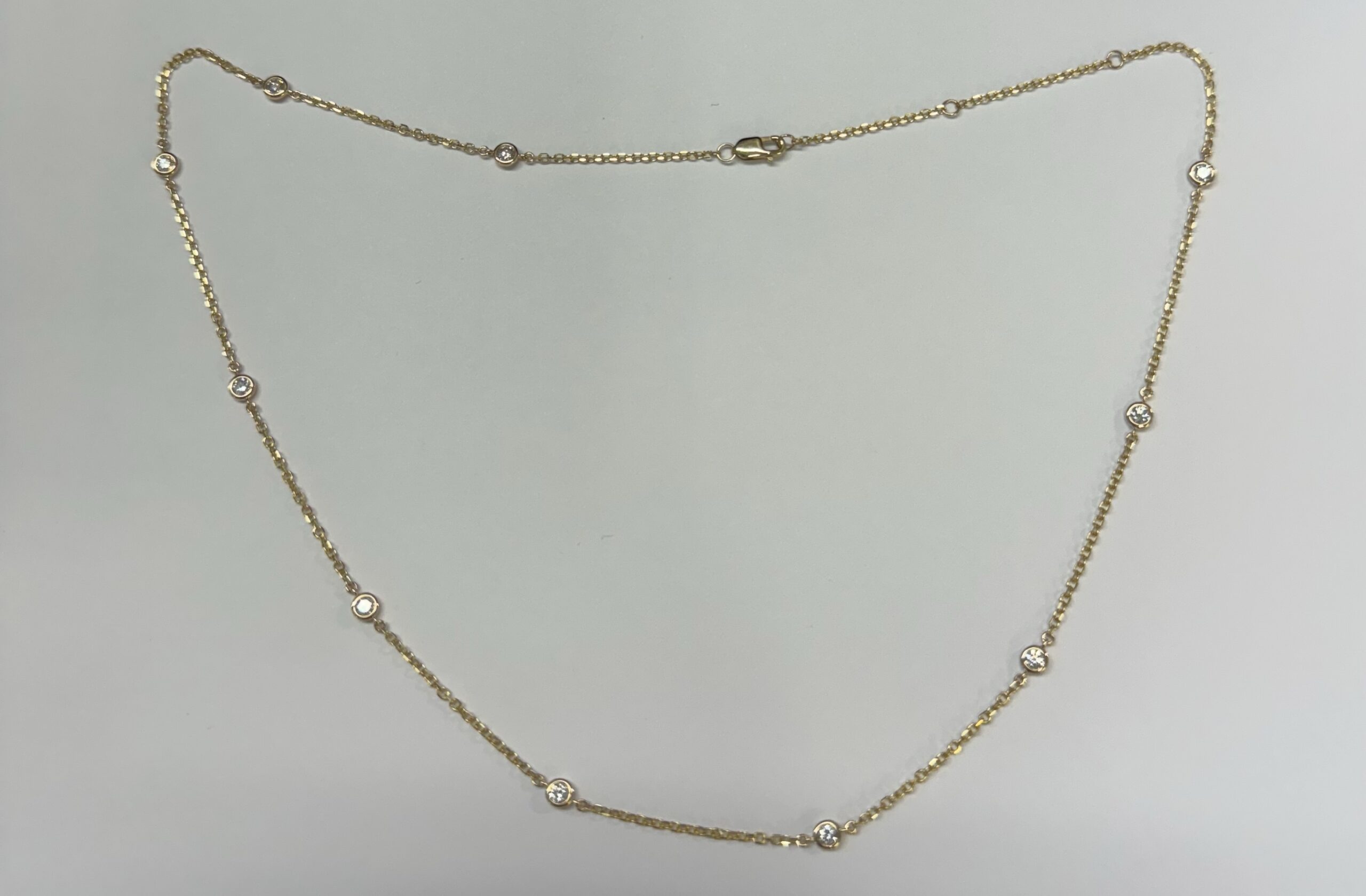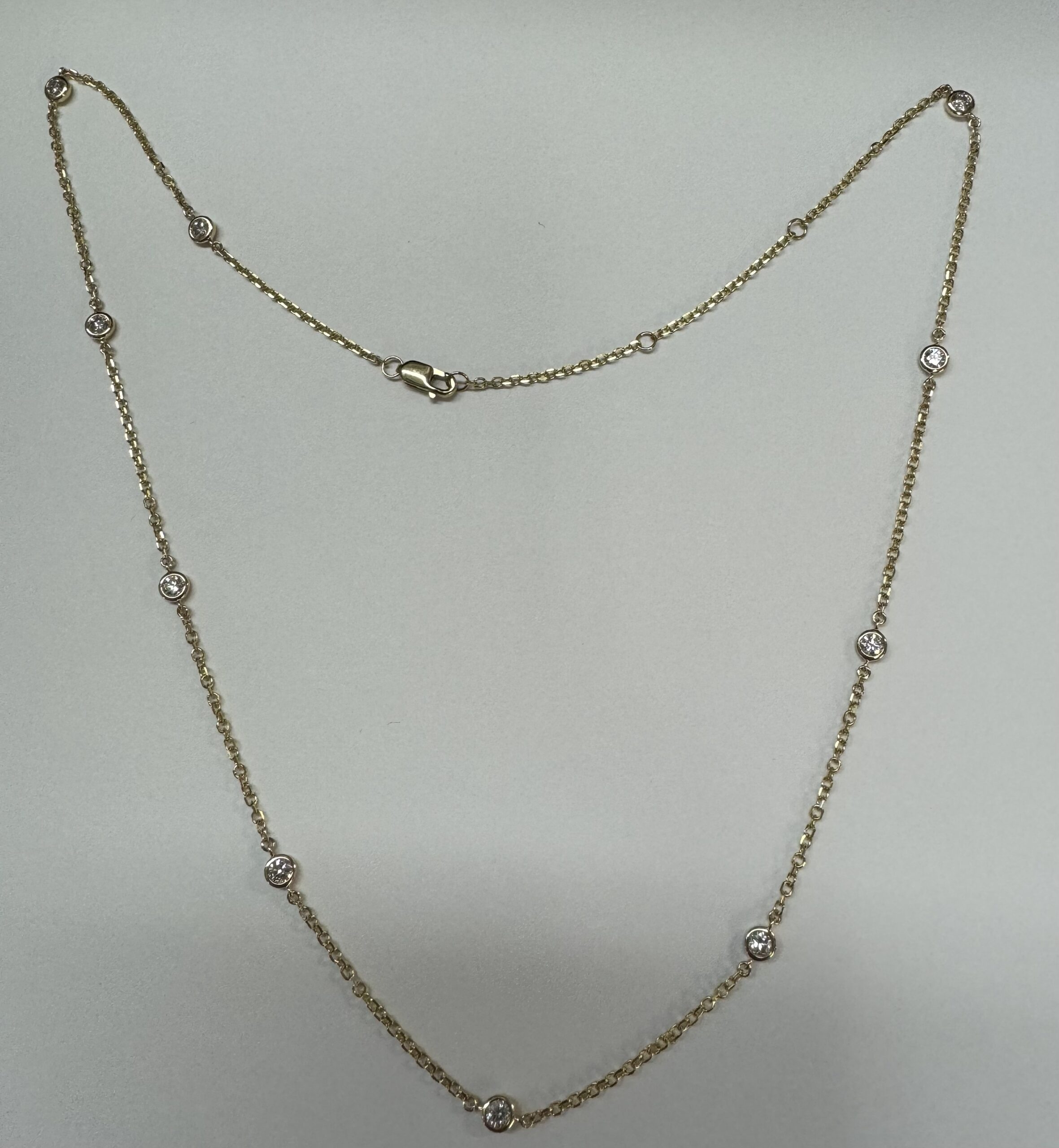14k yellow gold 10 stone bezel set genuine .75 cttw Round Brilliant Cut diamond by the yard necklace. These diamonds average G-H in color and SI1 in clarity. This necklace is adjustable 16-18”. This necklace has an entire weight of 3.5 grams.