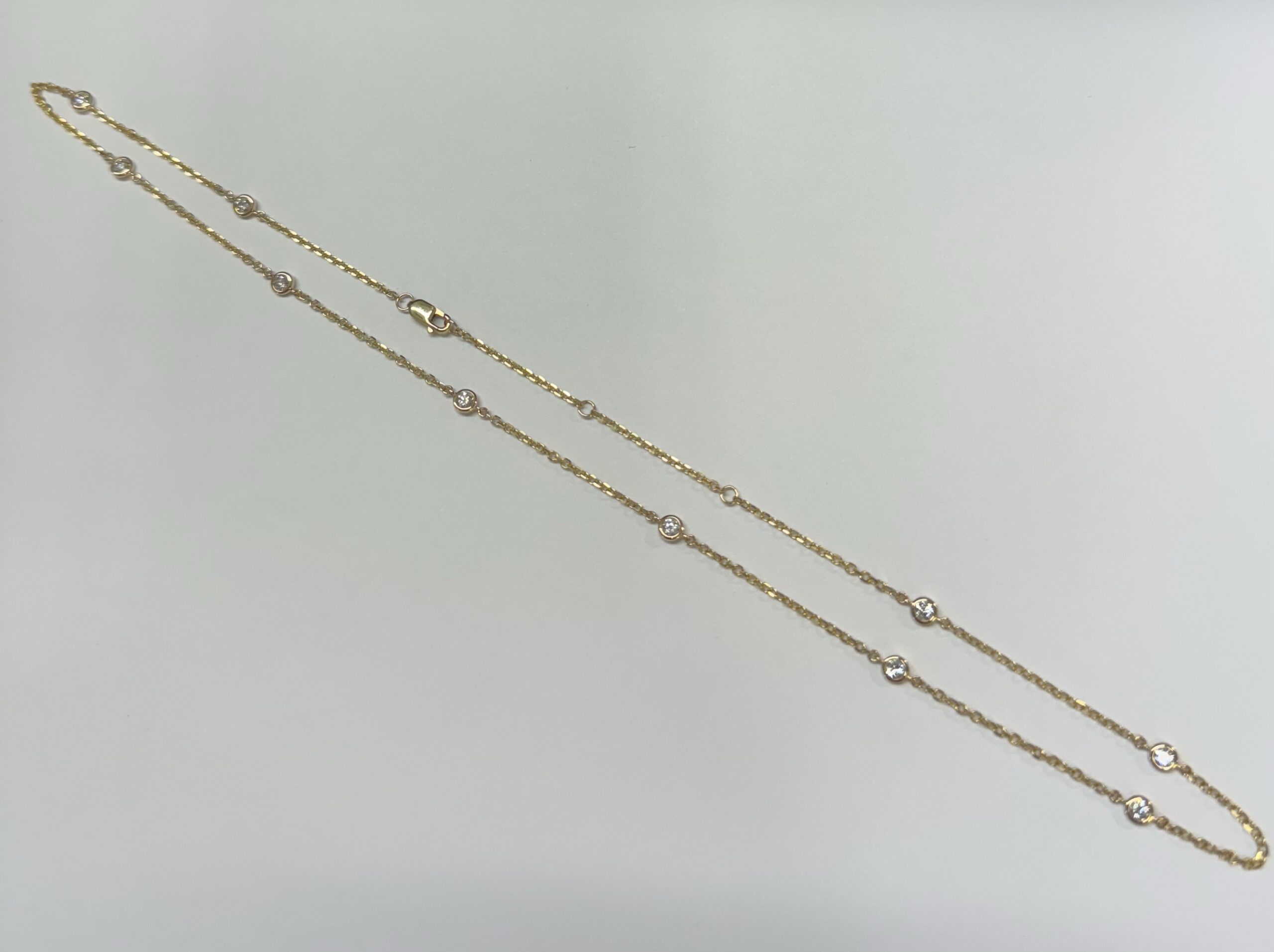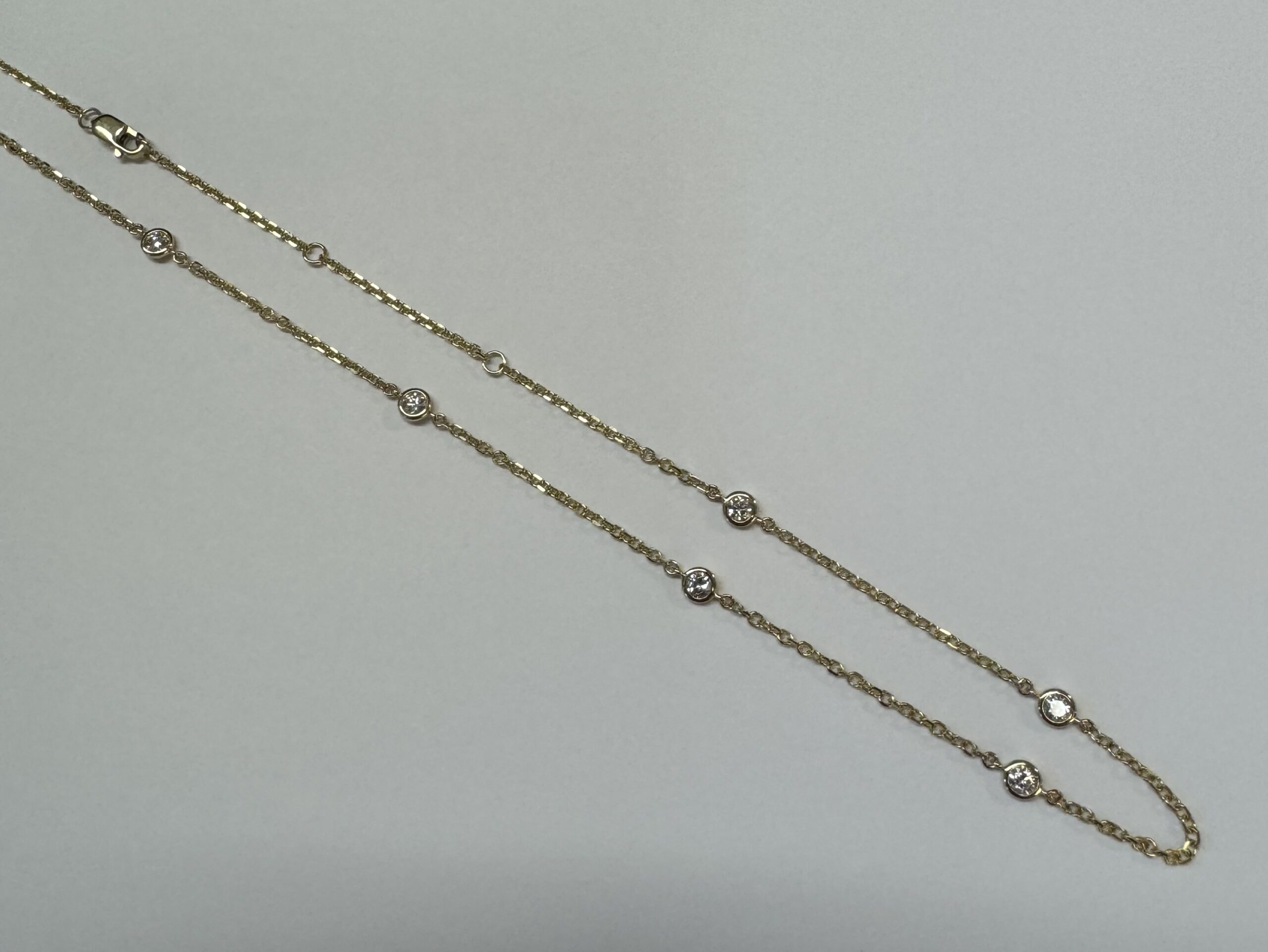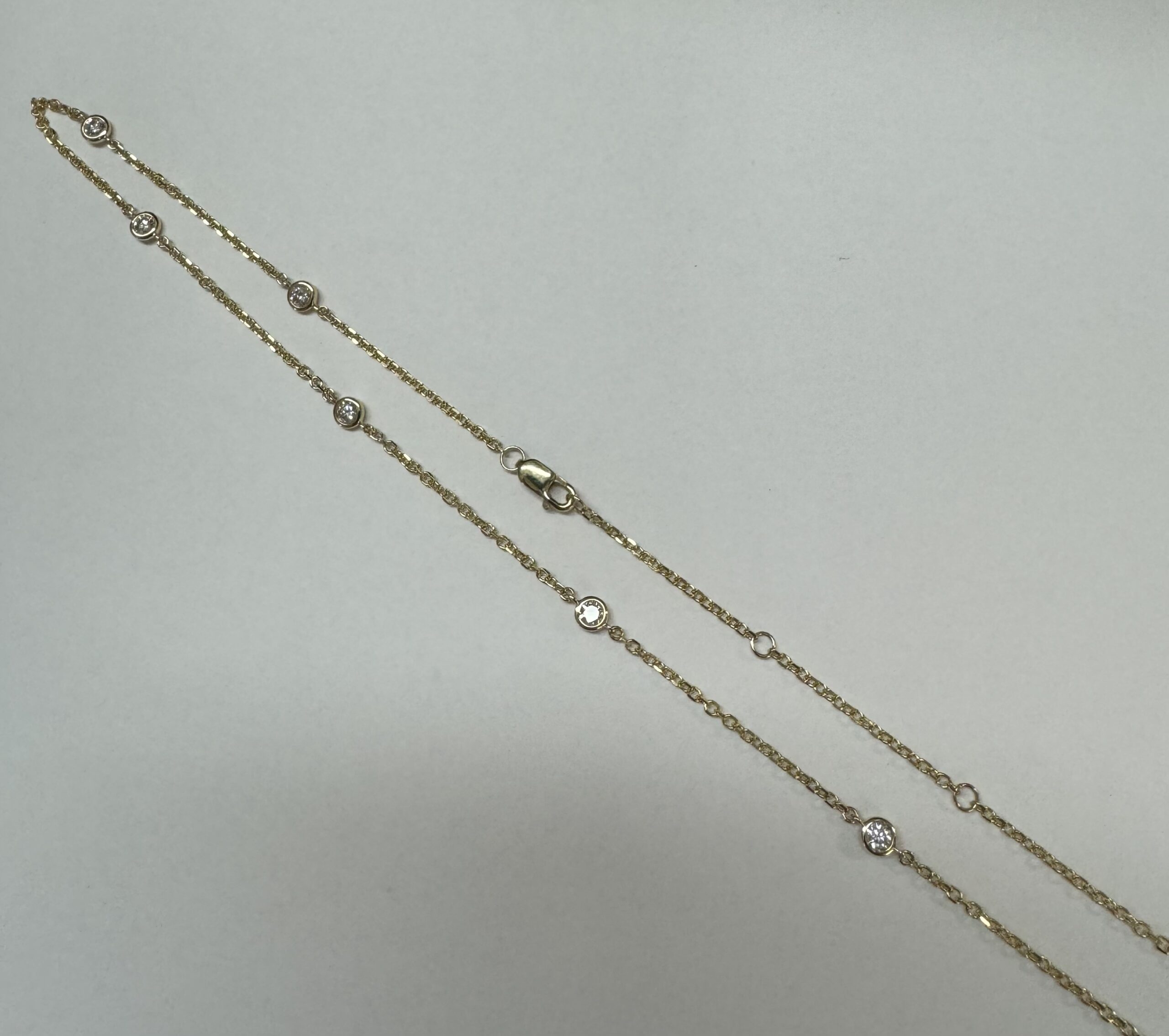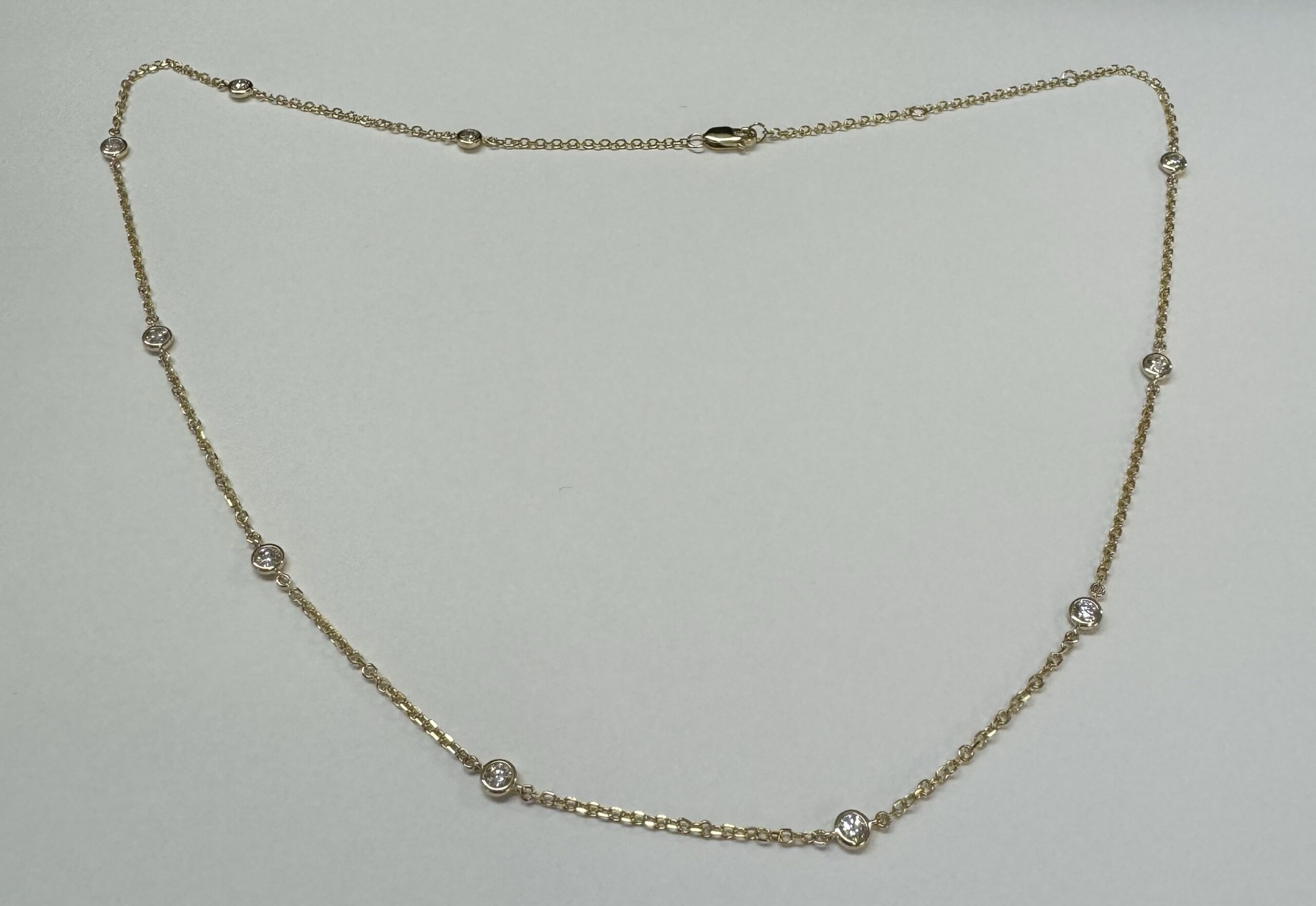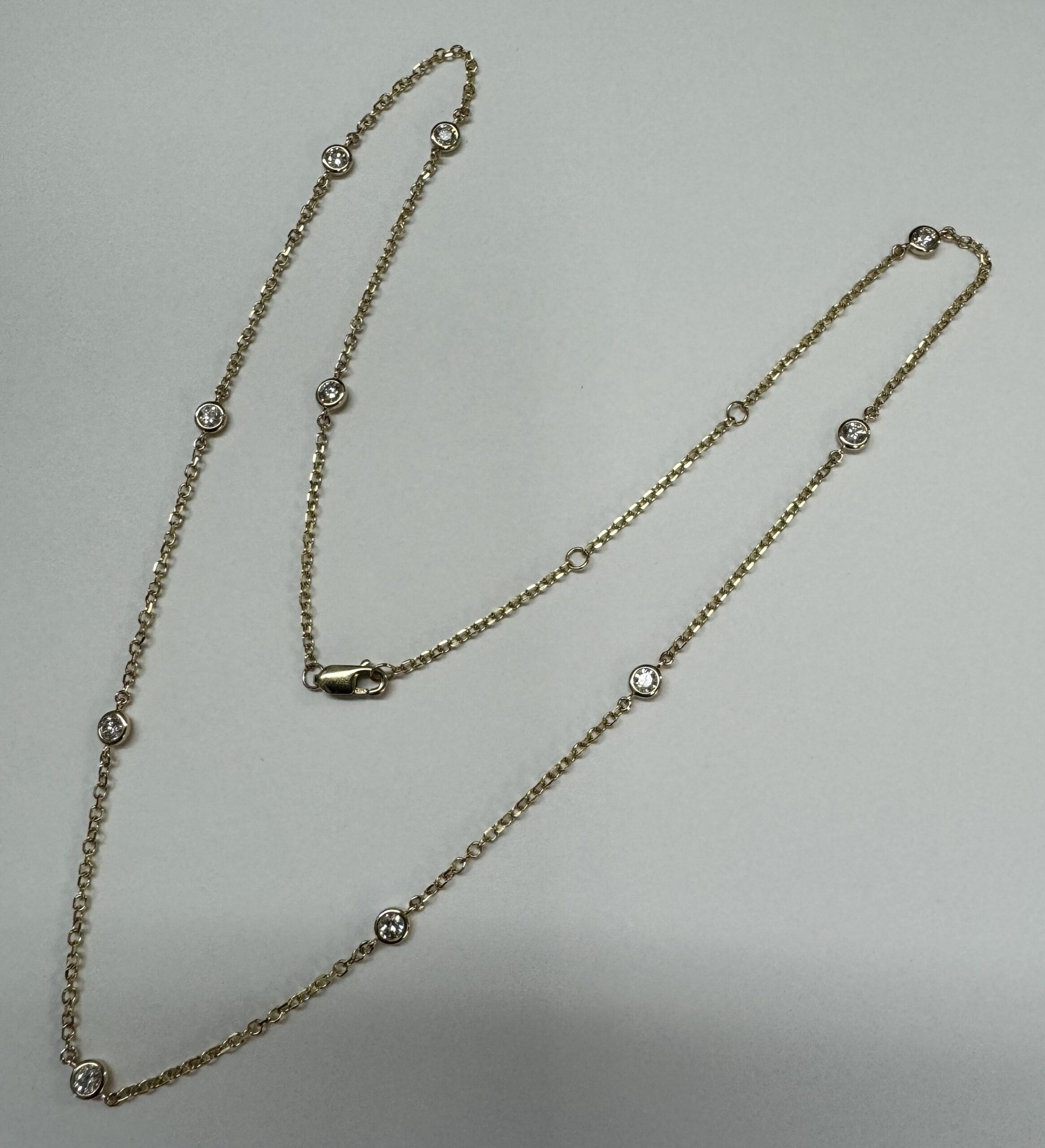 14k yellow gold 10 stone bezel set genuine .75 cttw Round Brilliant Cut diamond by the yard necklace. These diamonds average G-H in color and SI1 in clarity. This necklace is adjustable 16-18”. This necklace has an entire weight of 3.5 grams.