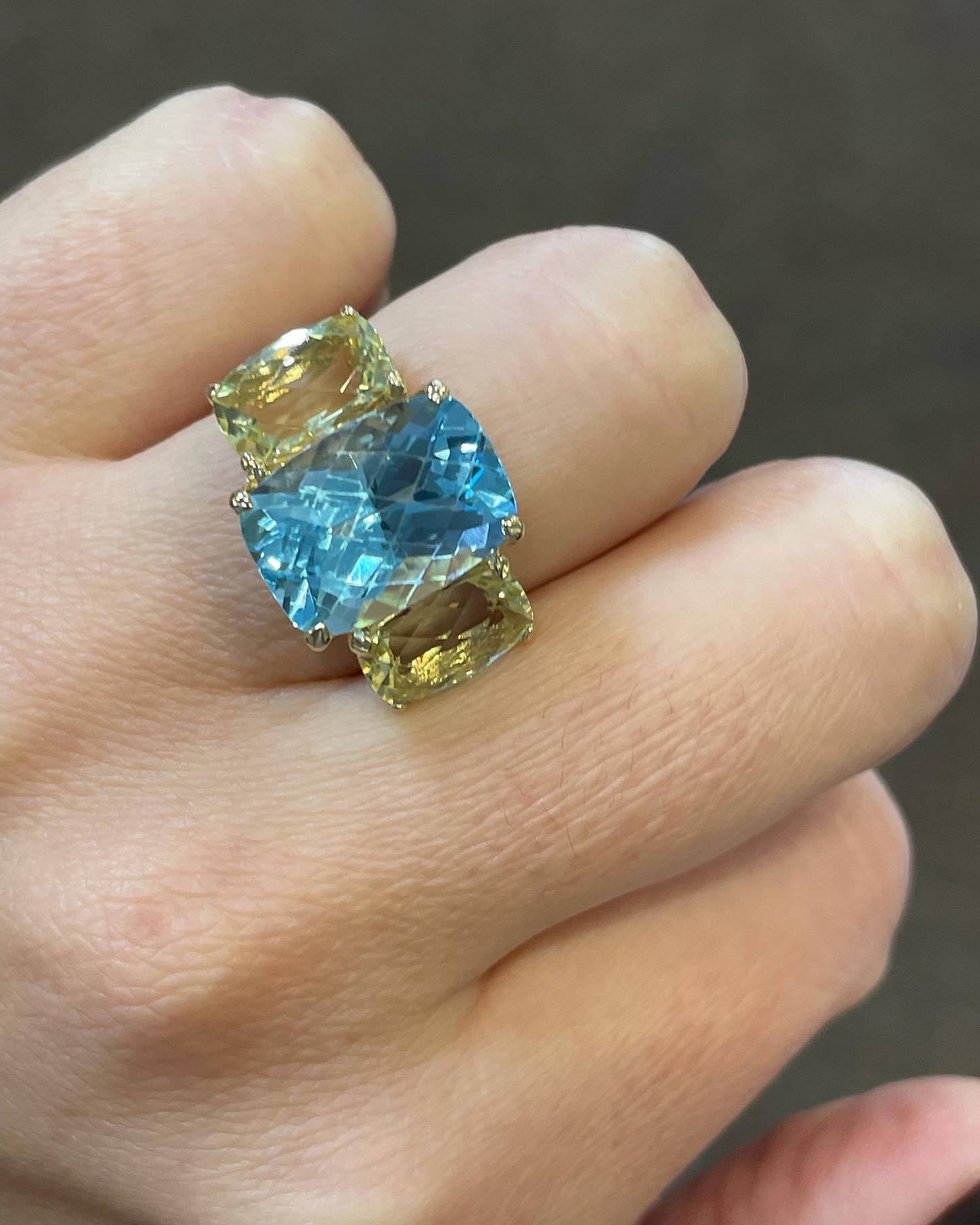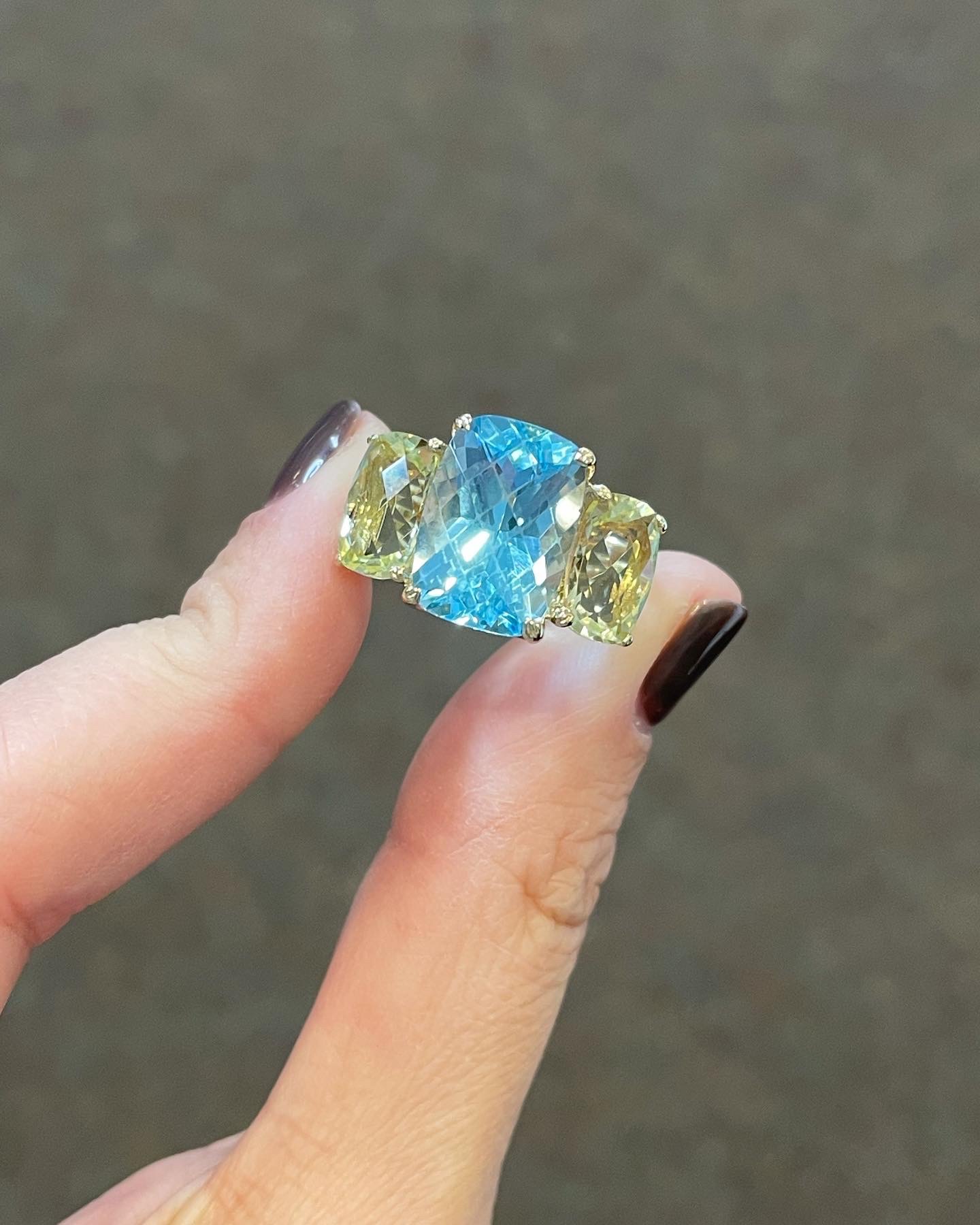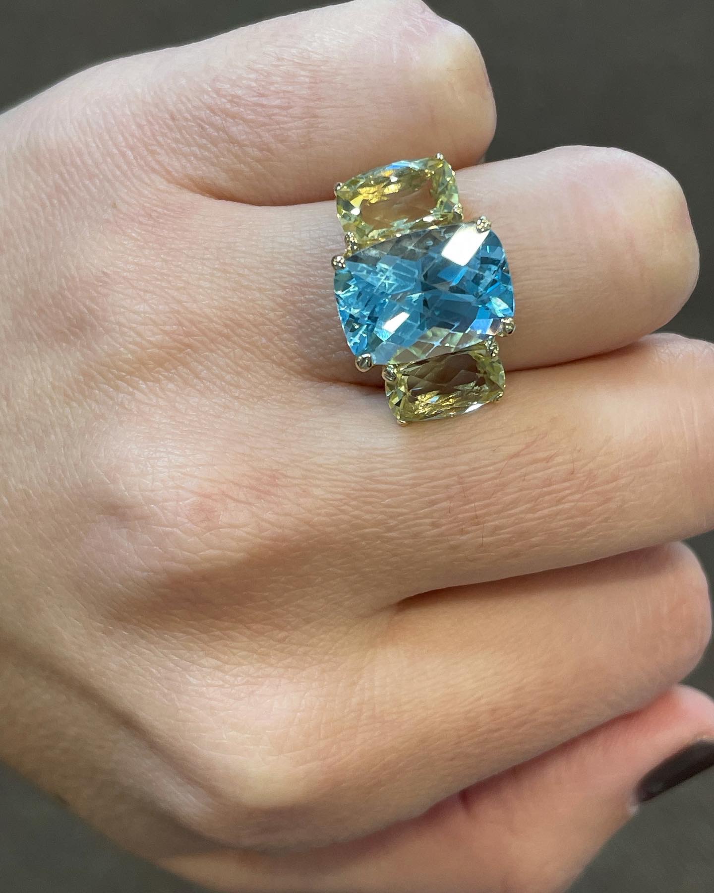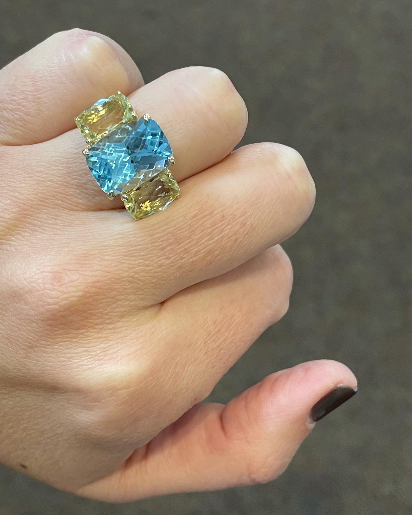 14k yellow gold genuine Blue Topaz & Citrine 3 stone cocktail ring. This ring is a finger size 8, but it can be reasonably sized. Please make note of the size preference needed in the comments section at checkout.