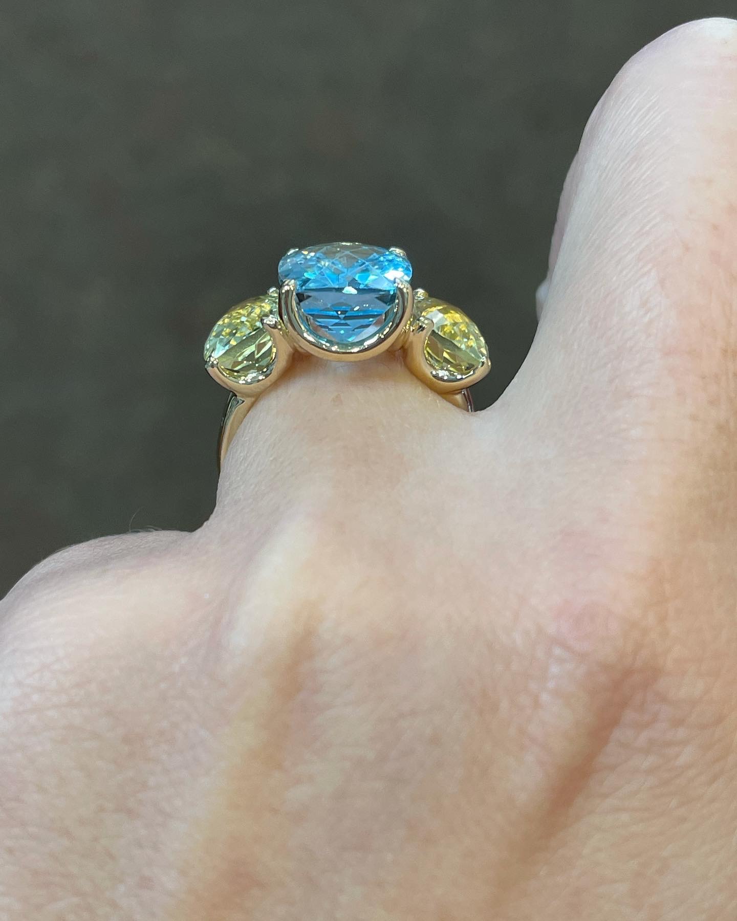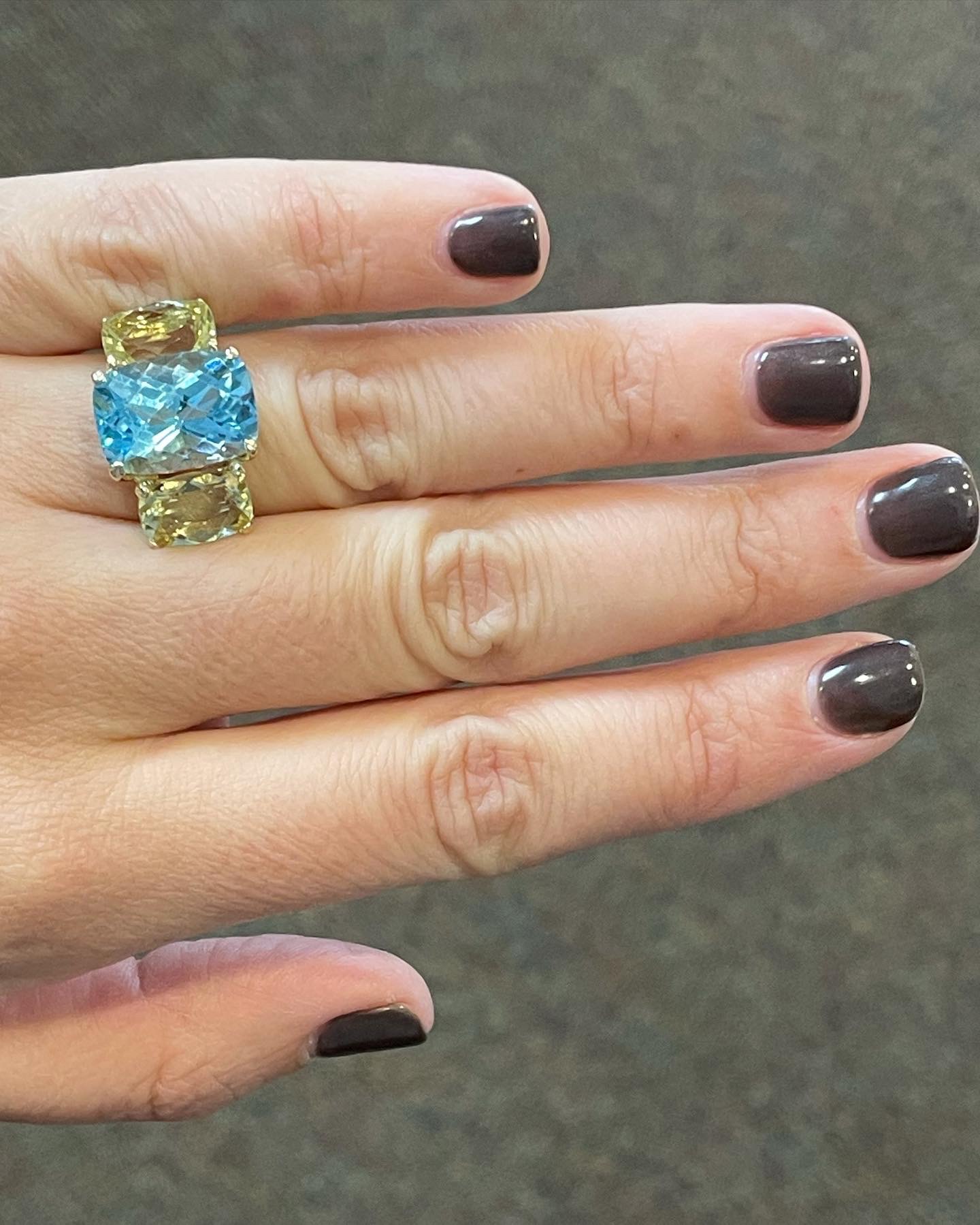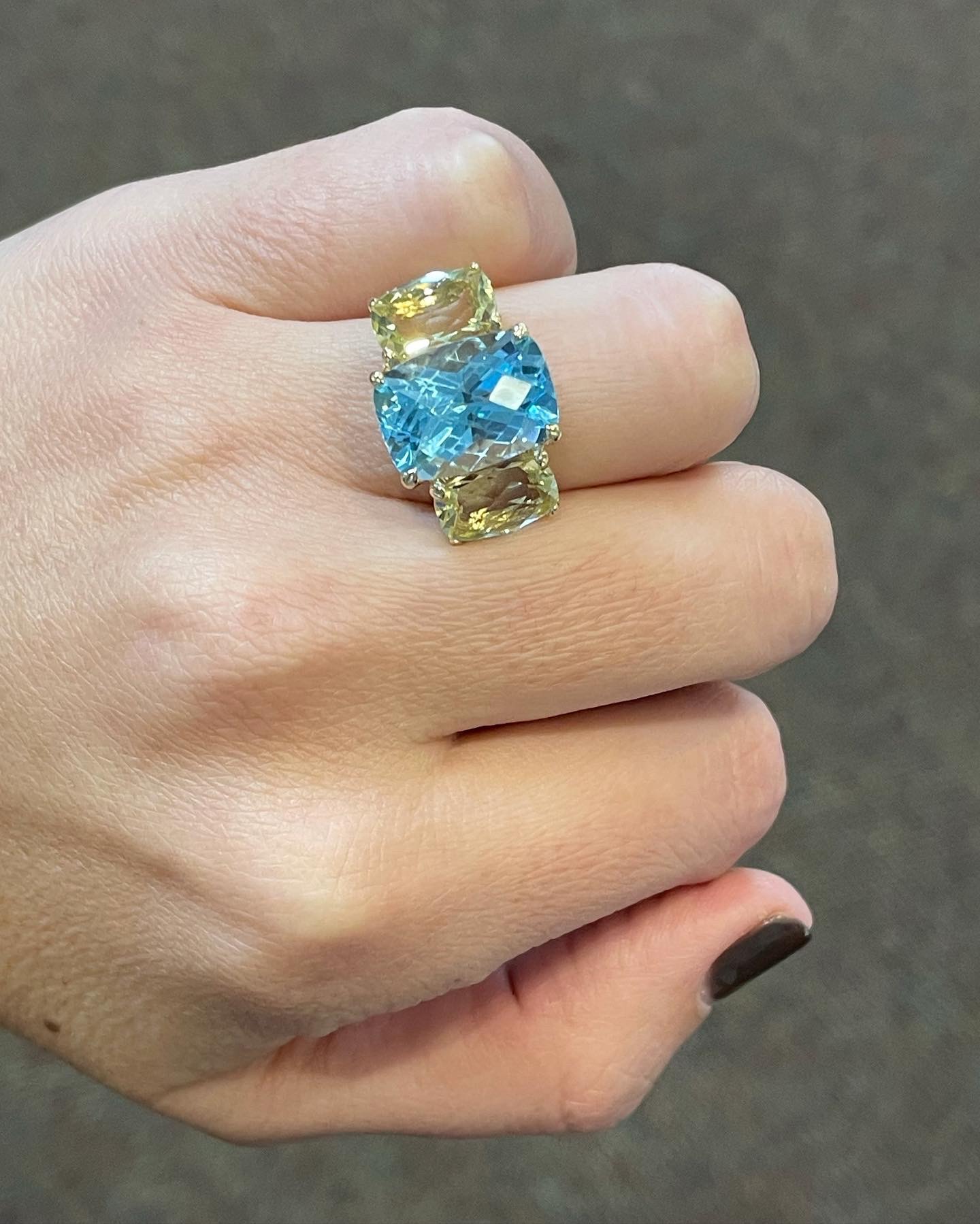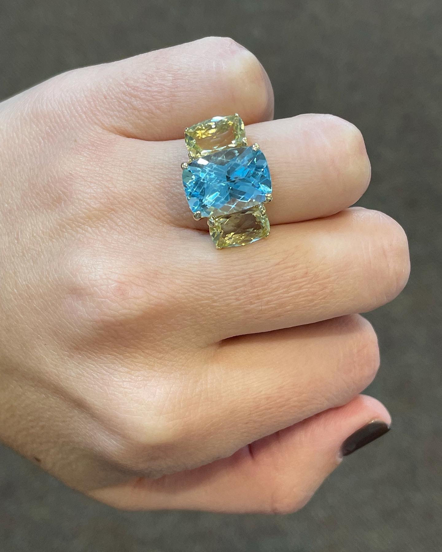 14k yellow gold genuine Blue Topaz & Citrine 3 stone cocktail ring. This ring is a finger size 8, but it can be reasonably sized. Please make note of the size preference needed in the comments section at checkout.