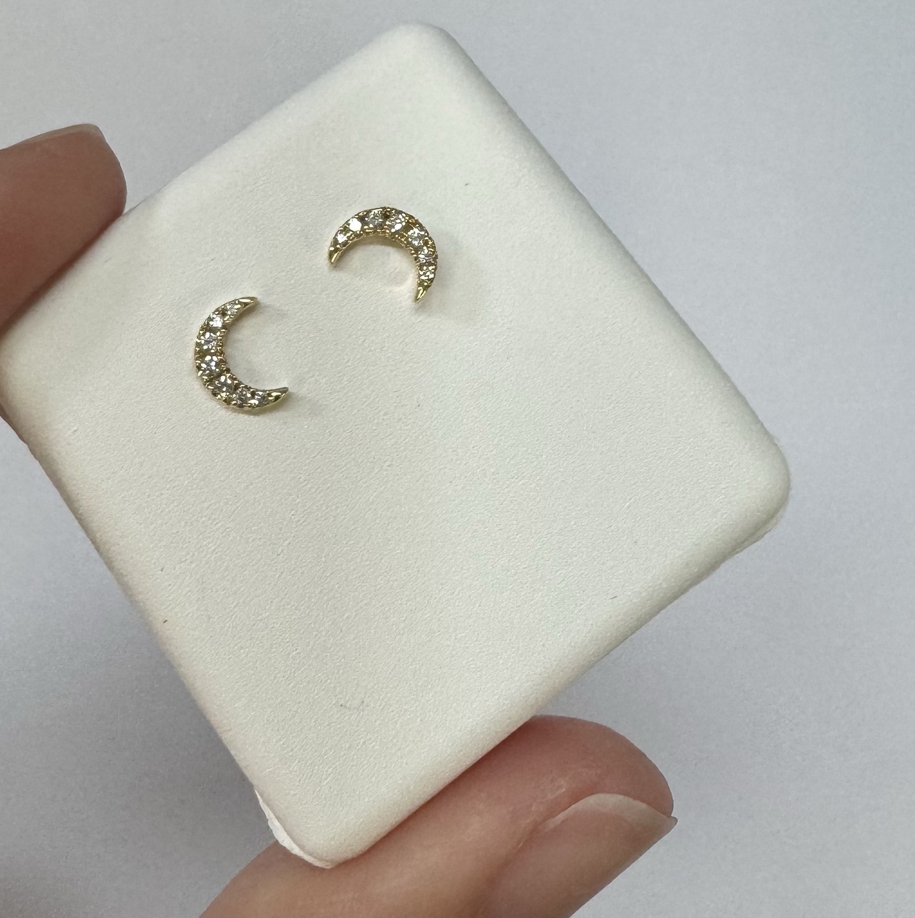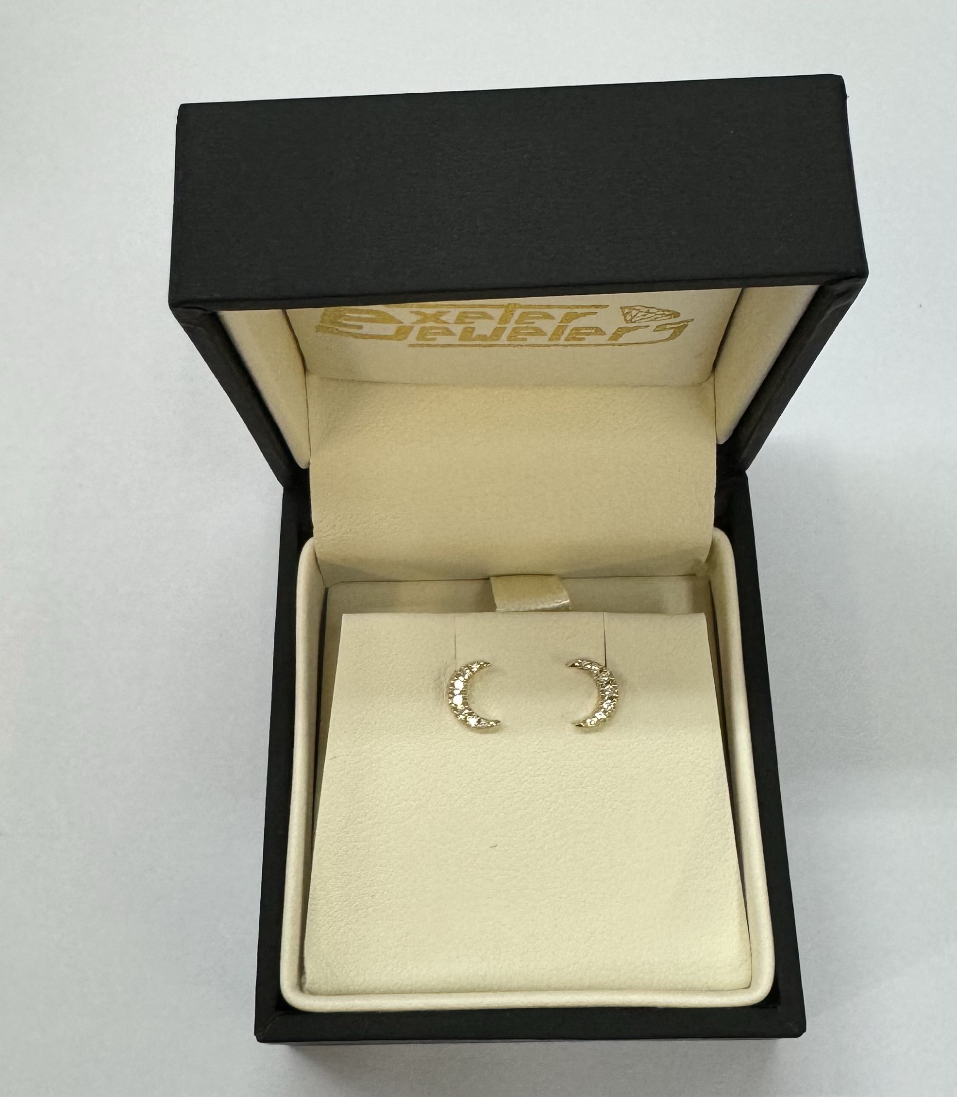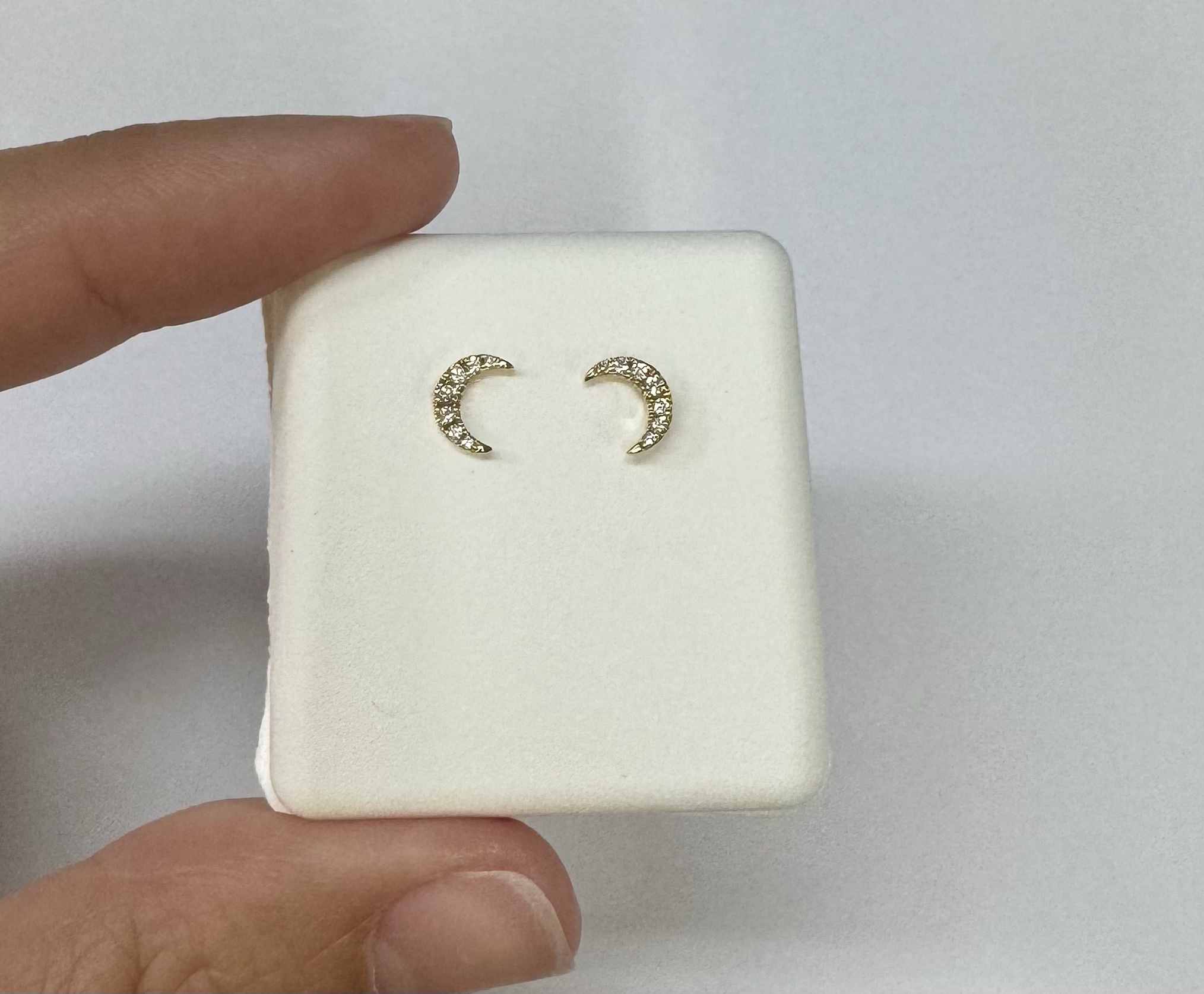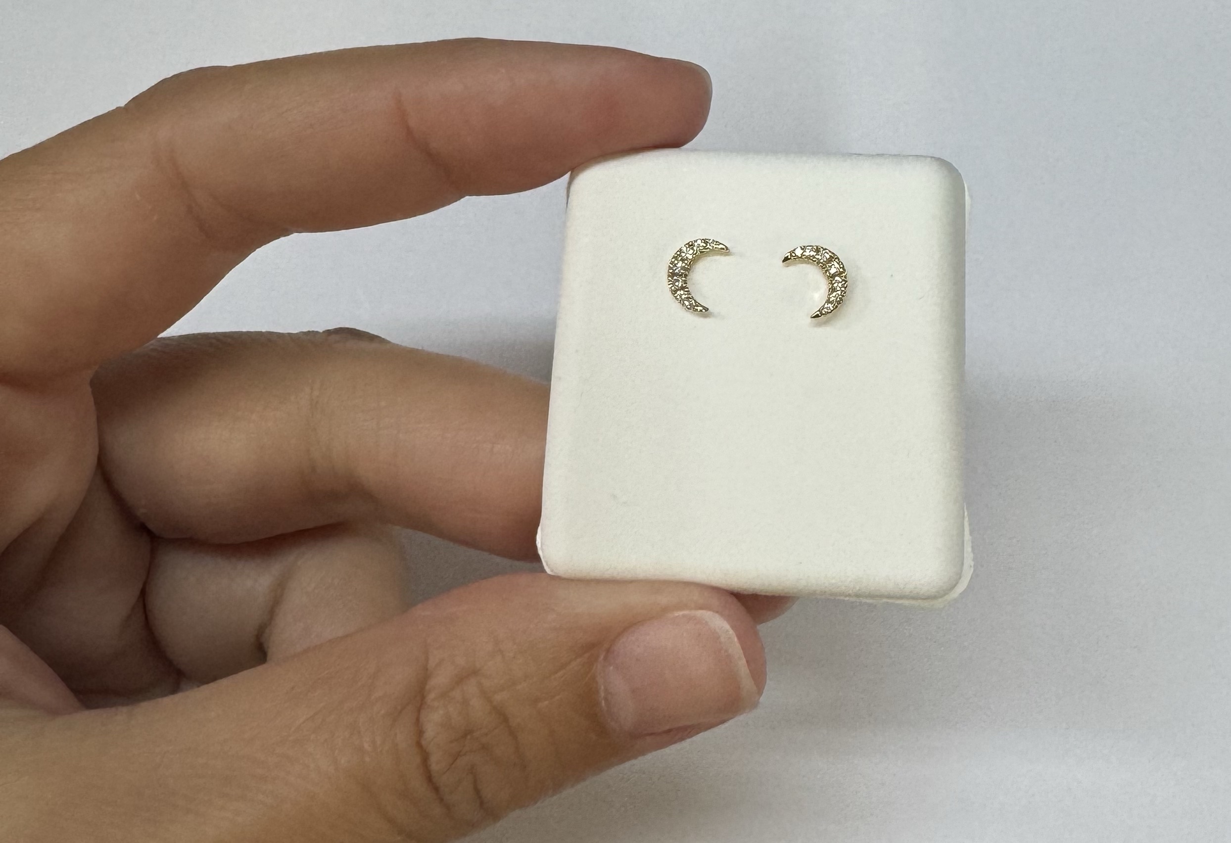 14k yellow gold genuine .05 cttw Round Brilliant Cut diamond crescent moon stud earrings. These diamonds average H-I in color and SI in clarity. These earrings have an entire weight of 0.9 grams. If you wish to purchase a single stud for $145 please contact us directly.