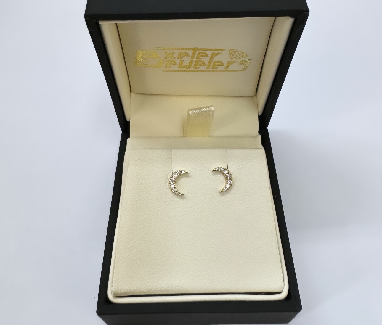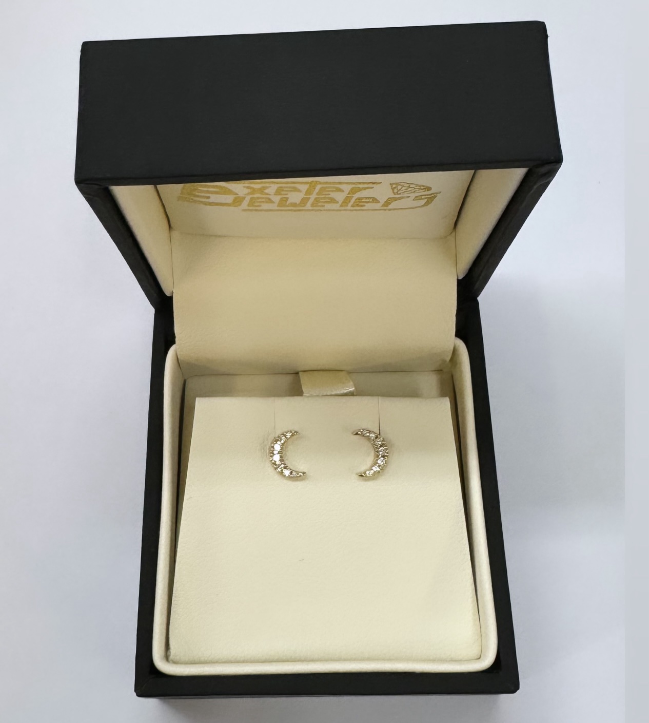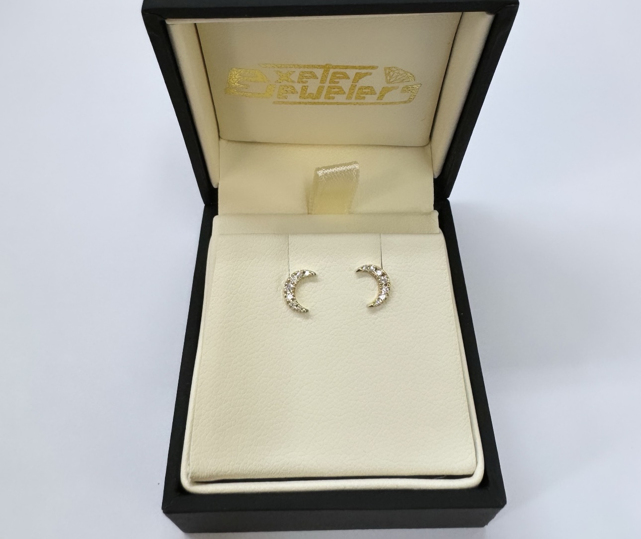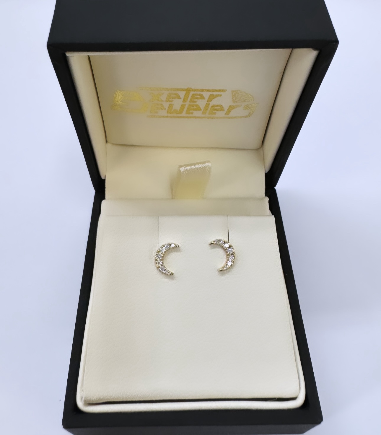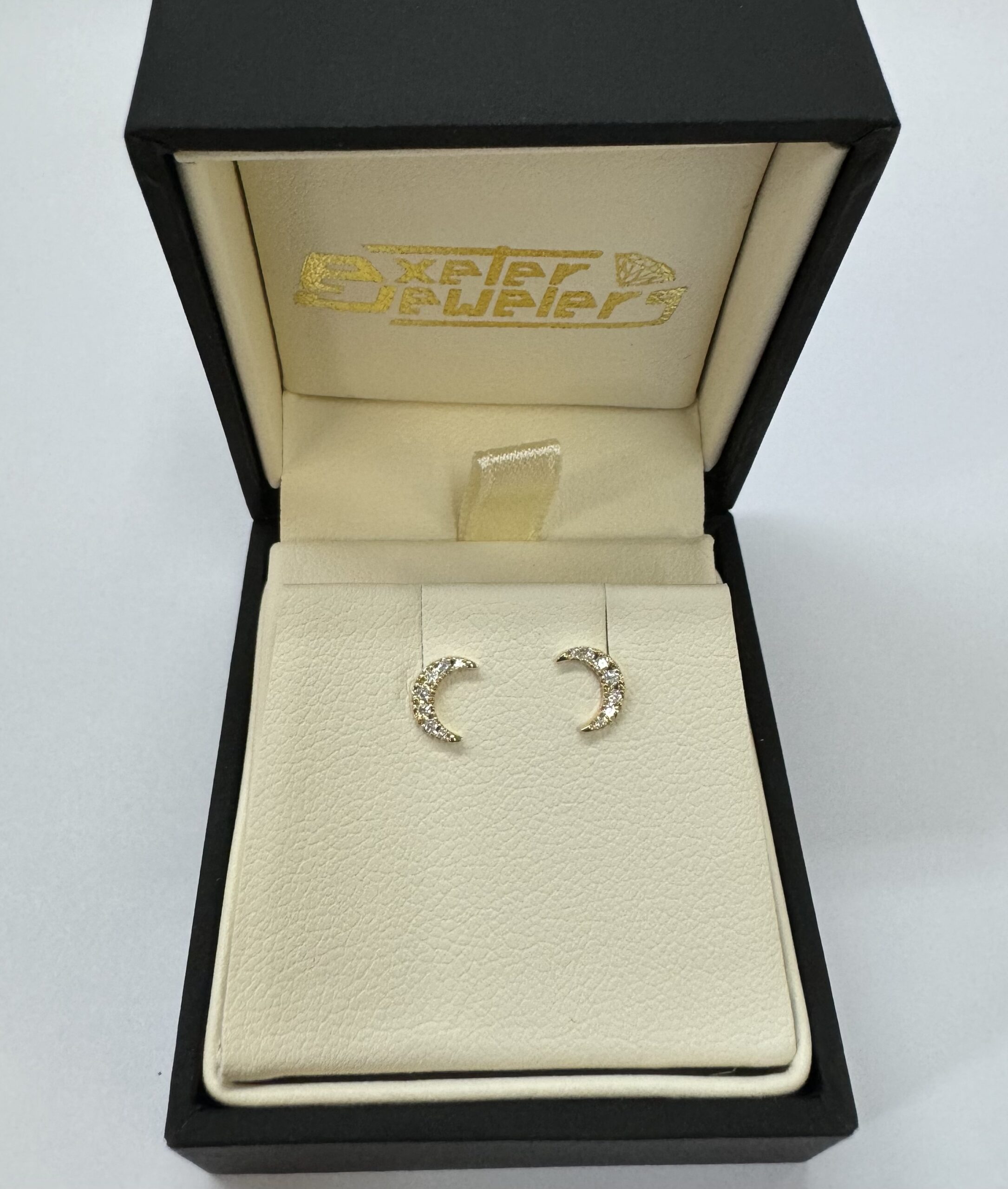 14k yellow gold genuine .05 cttw Round Brilliant Cut diamond crescent moon stud earrings. These diamonds average H-I in color and SI in clarity. These earrings have an entire weight of 0.9 grams. If you wish to purchase a single stud for $145 please contact us directly.