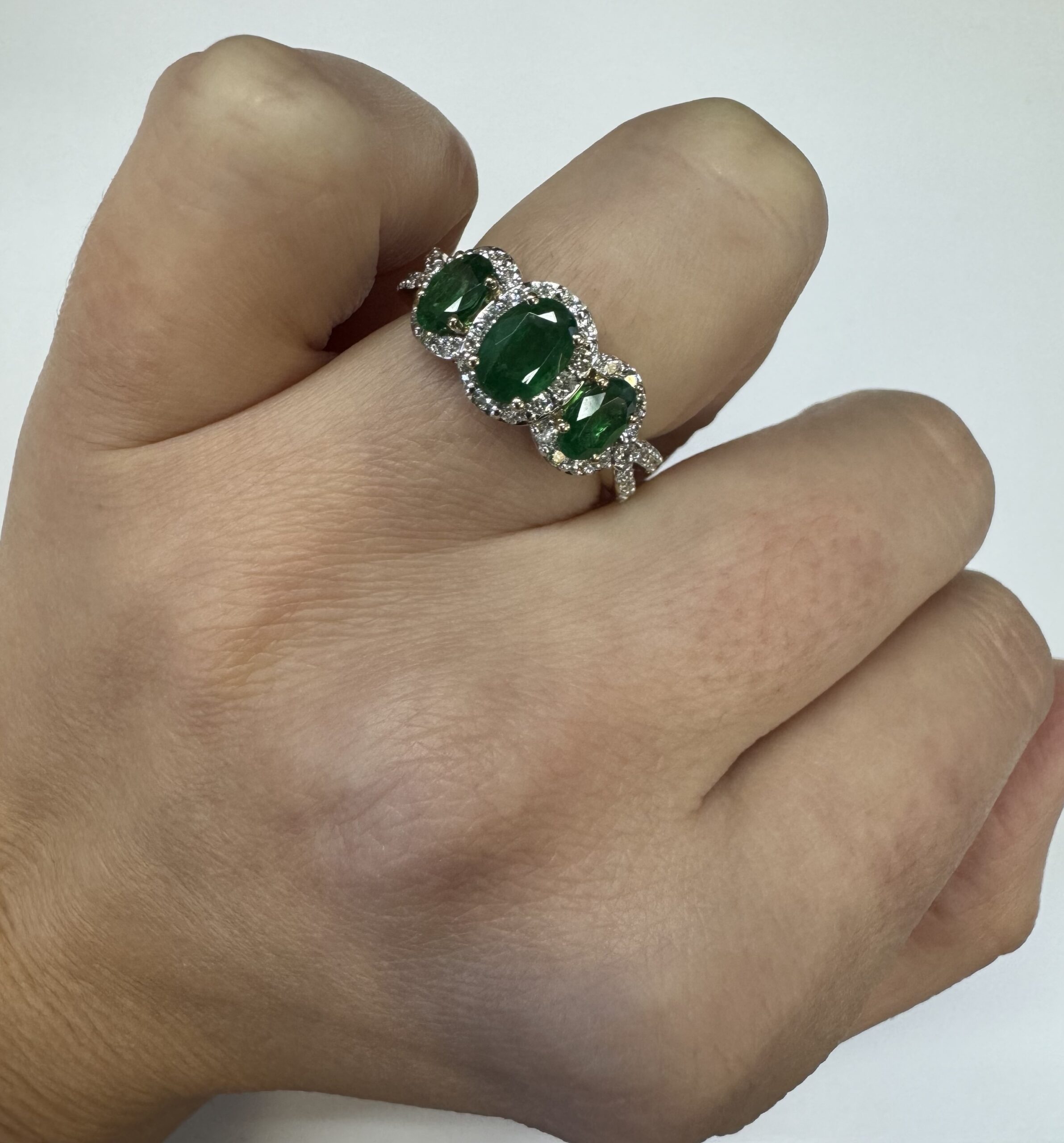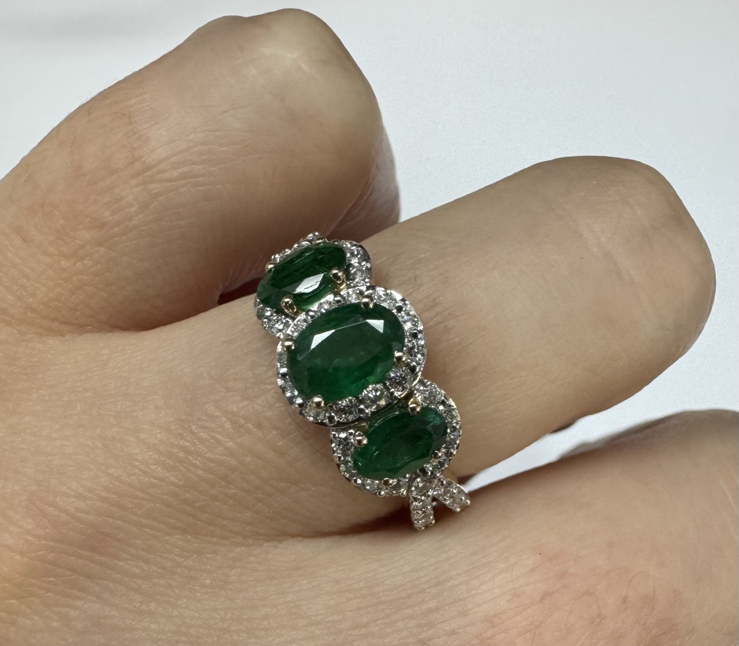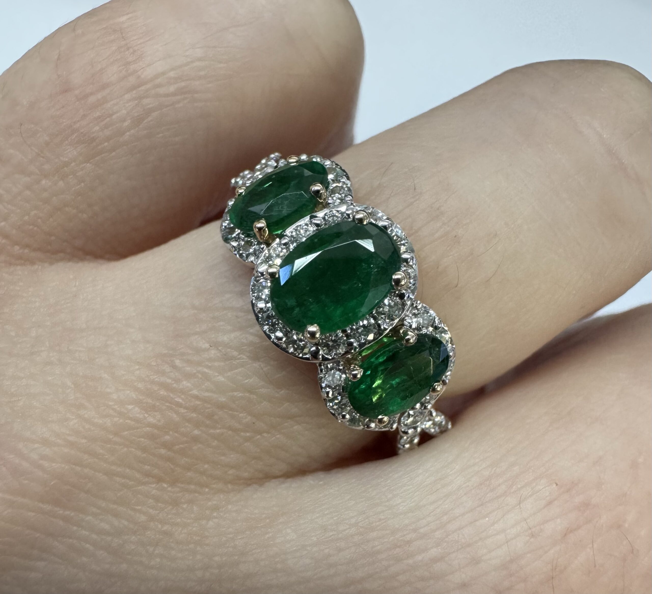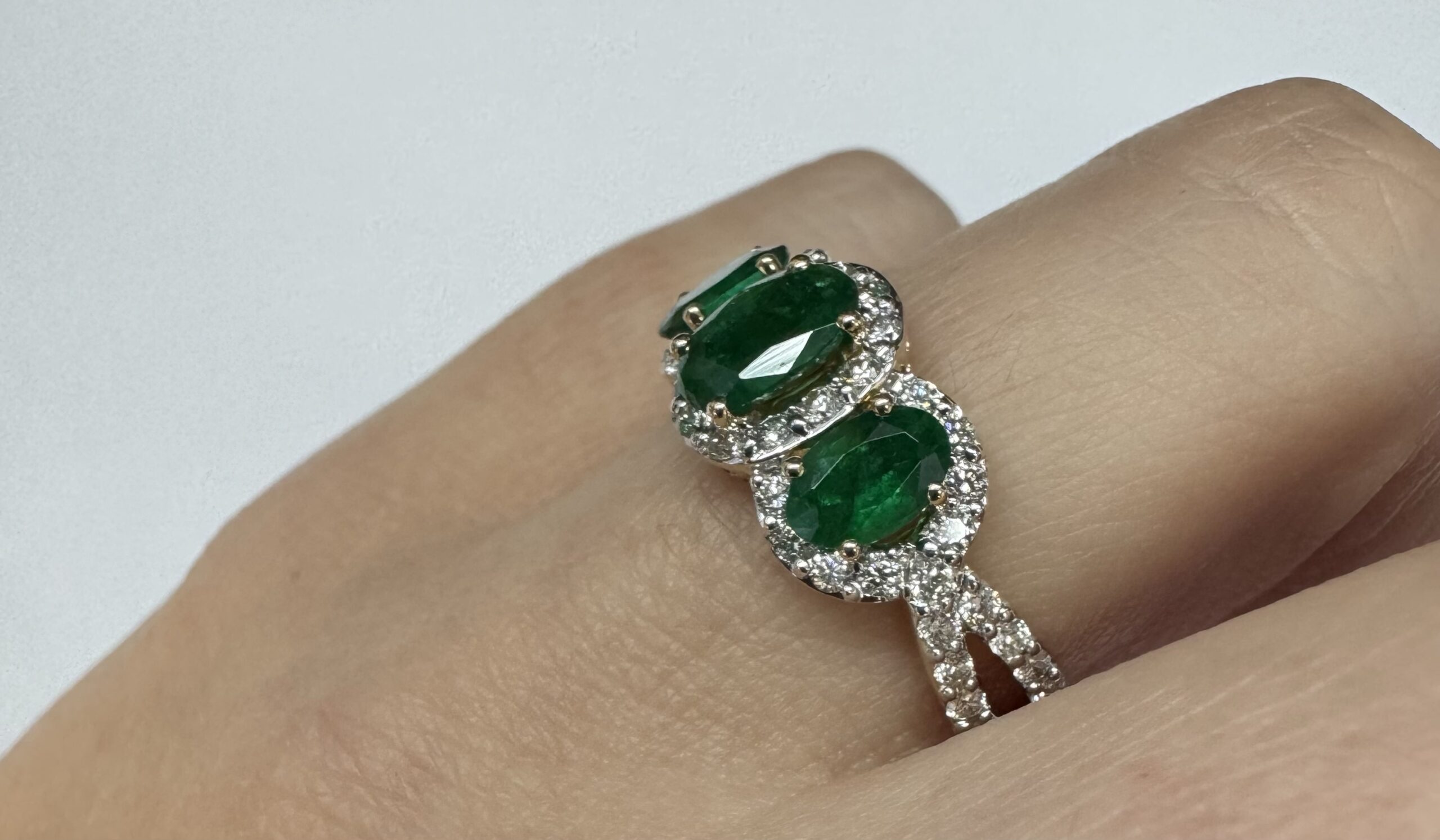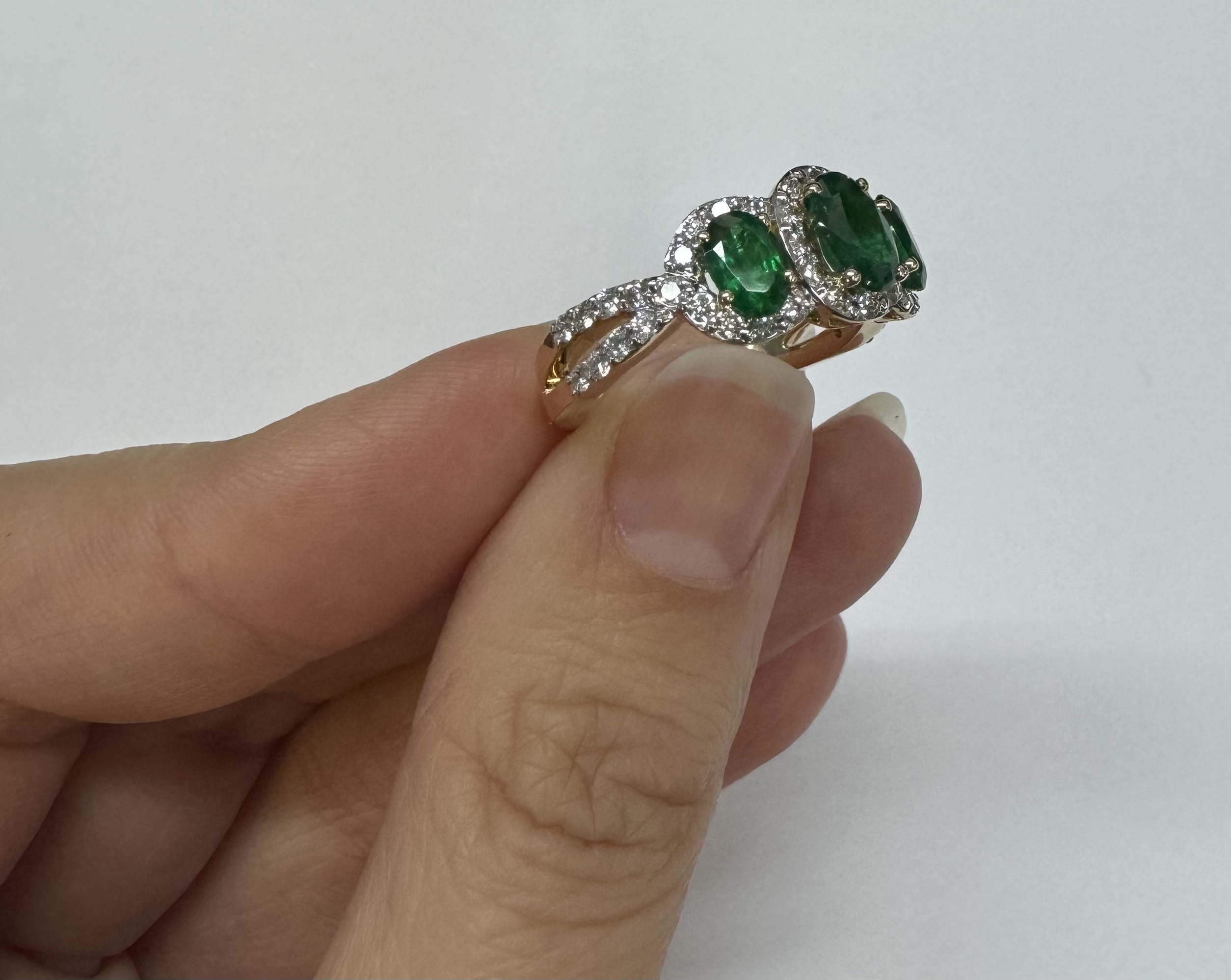 14k yellow gold genuine oval shaped, faceted 1.43 cttw Emerald & .54 cttw genuine Round Brilliant Cut diamond triple halo ring with split shank. These diamonds average G-H in color and SI1 in clarity. These diamonds are nicely proportioned and well finished. This ring is a finger size 7, but it can be reasonably sized. Please make note of the finger size desired in the comments section at checkout. This ring has an entire weight of 4.4 grams.