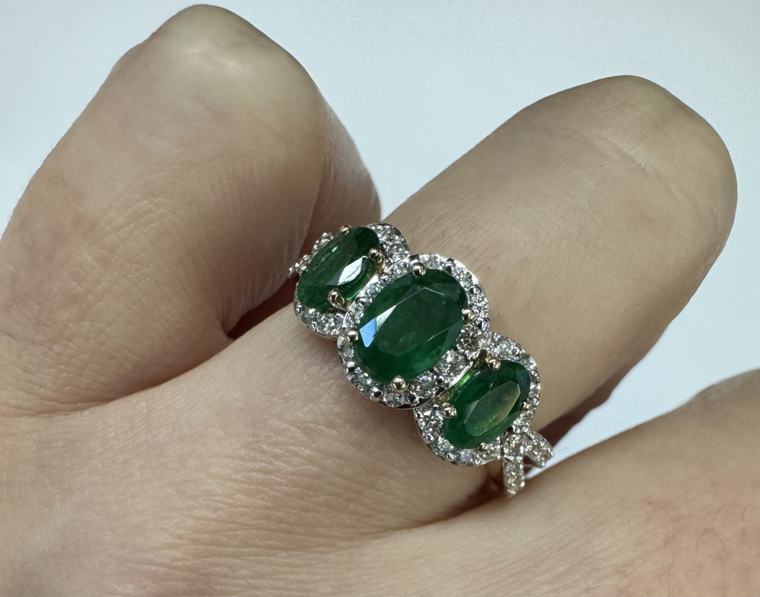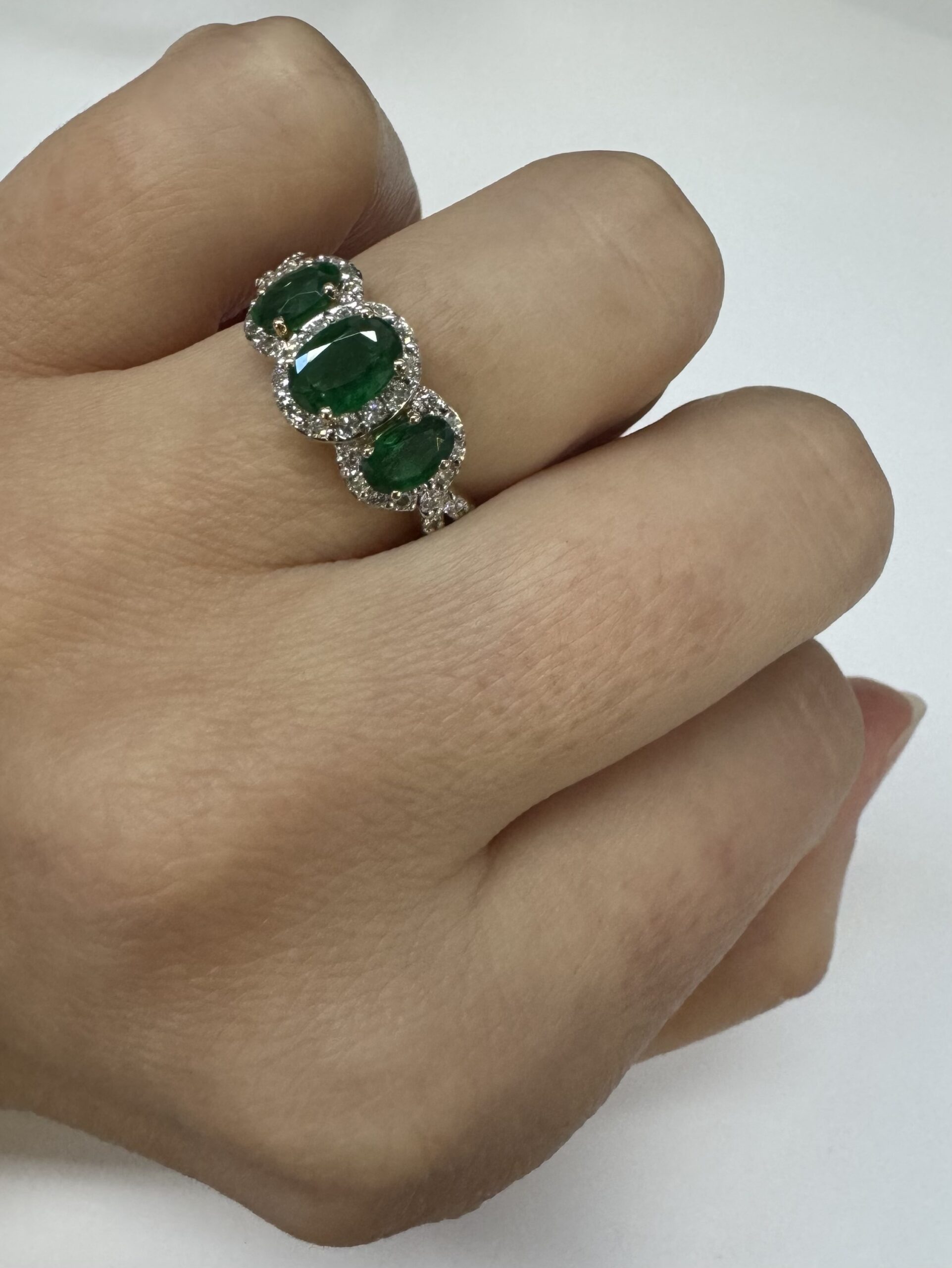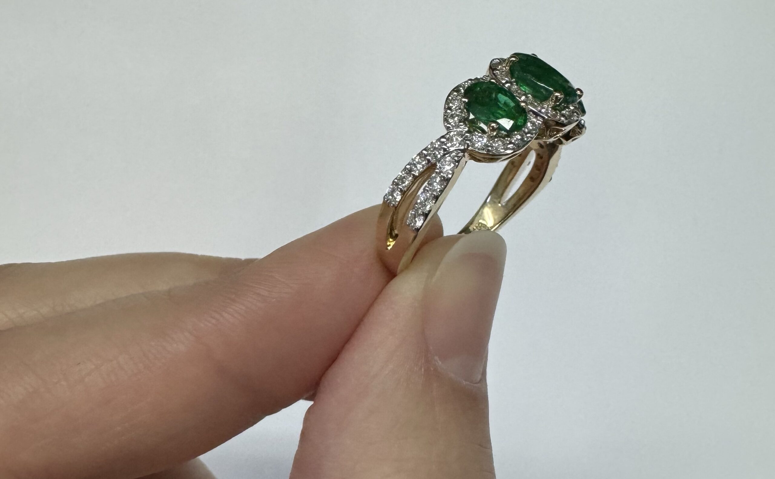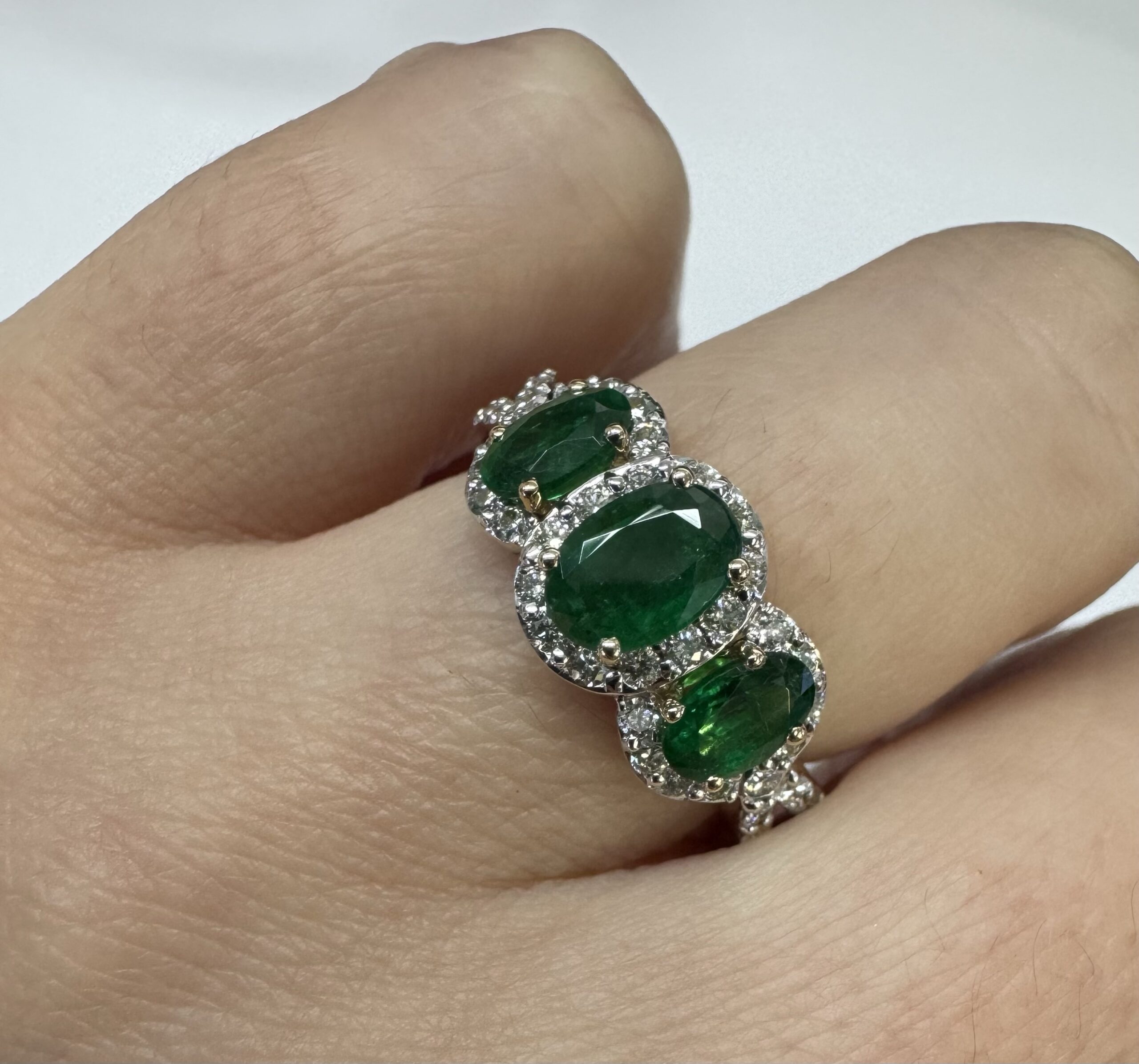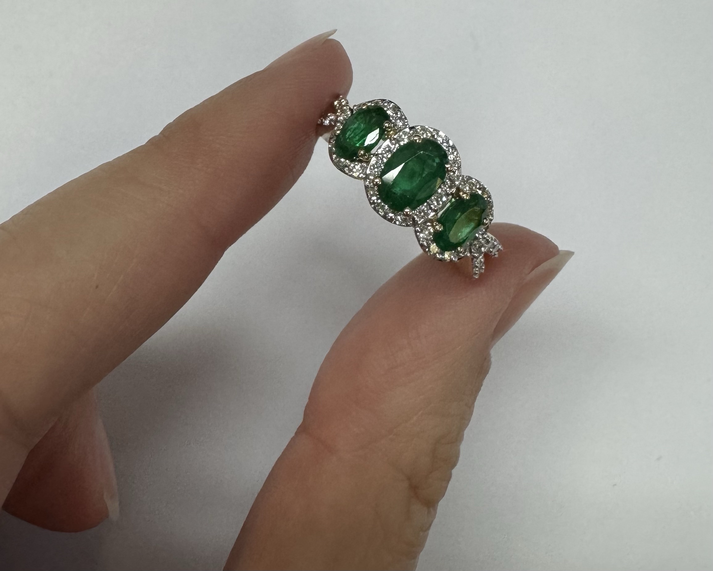 14k yellow gold genuine oval shaped, faceted 1.43 cttw Emerald & .54 cttw genuine Round Brilliant Cut diamond triple halo ring with split shank. These diamonds average G-H in color and SI1 in clarity. These diamonds are nicely proportioned and well finished. This ring is a finger size 7, but it can be reasonably sized. Please make note of the finger size desired in the comments section at checkout. This ring has an entire weight of 4.4 grams.