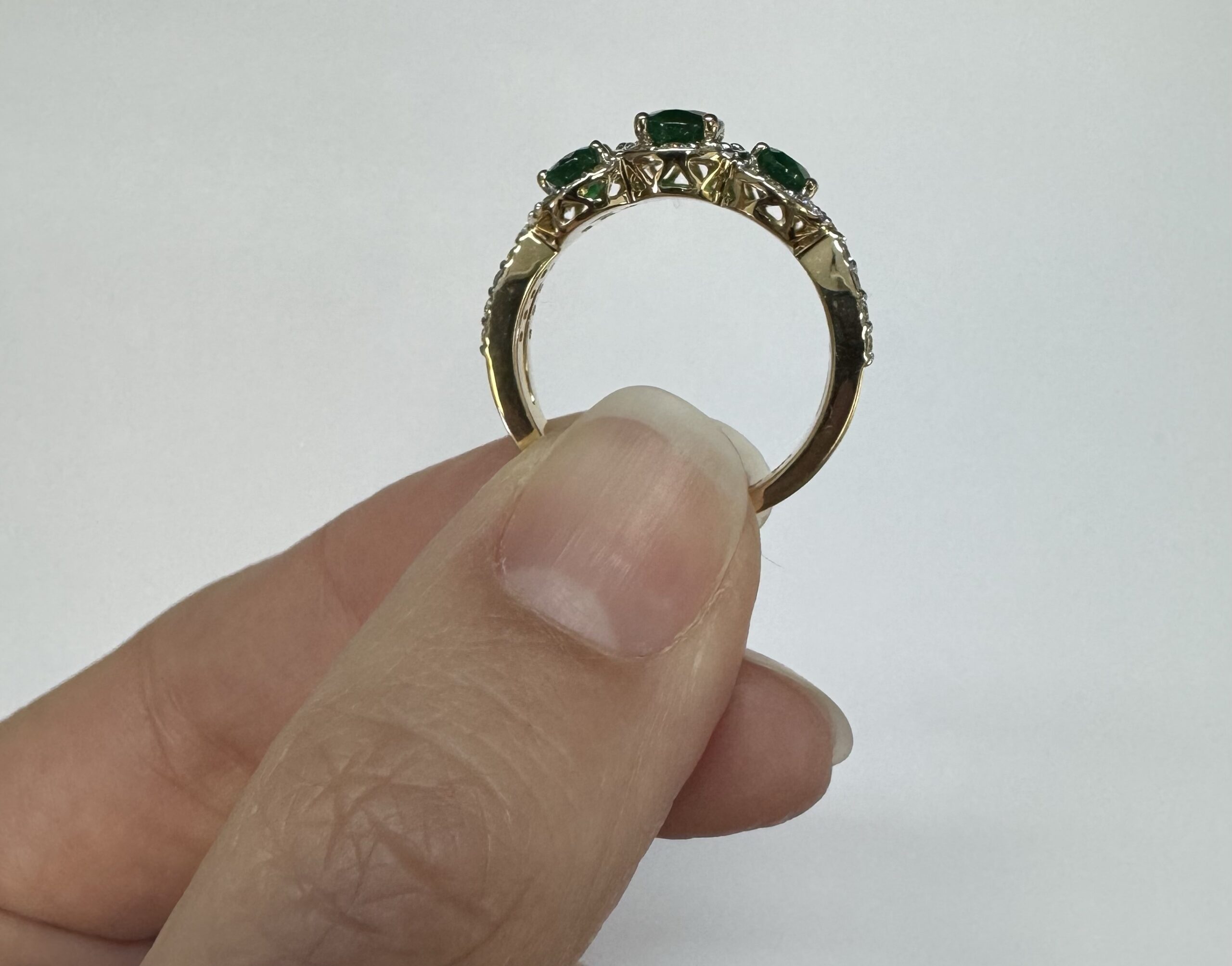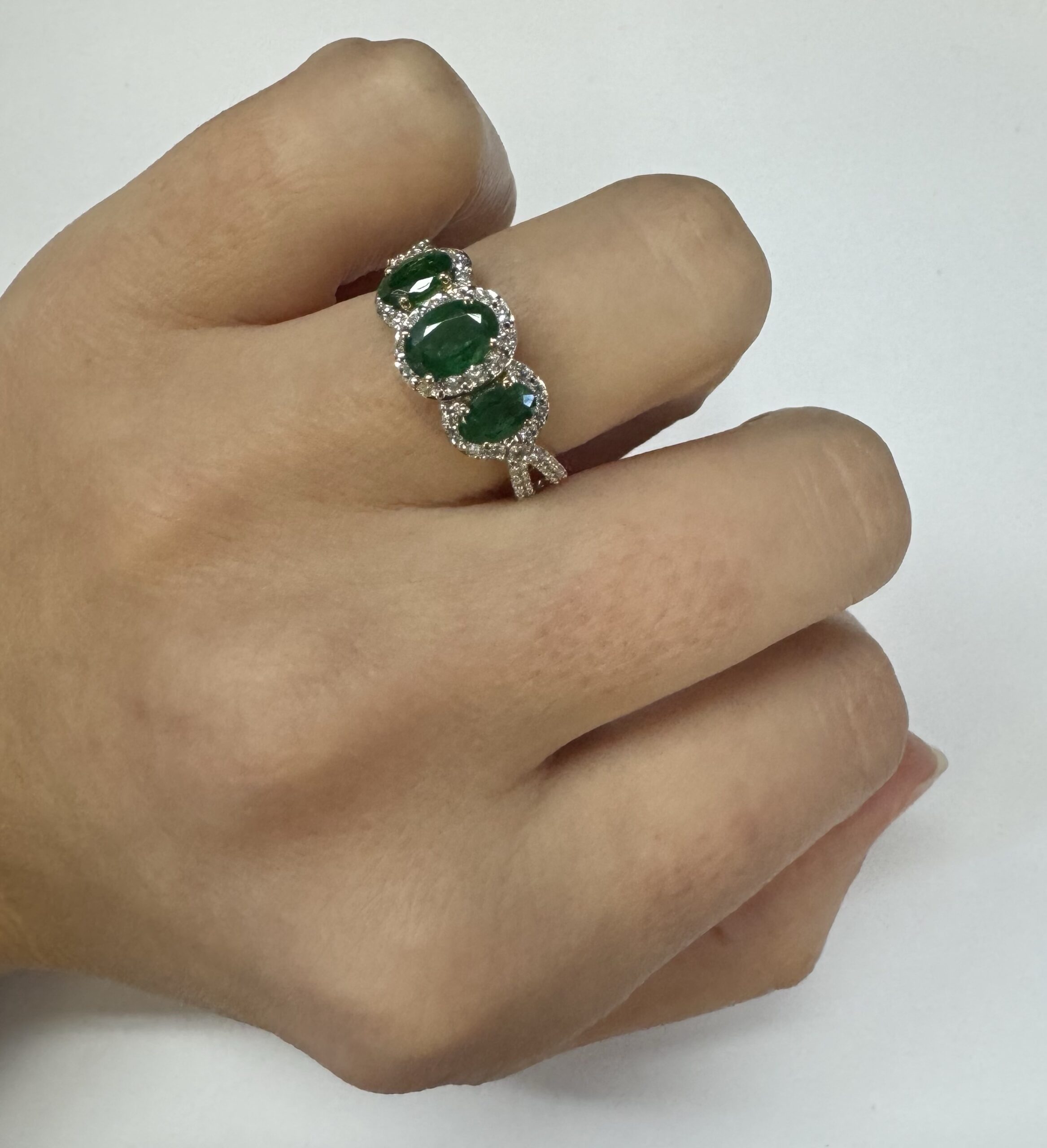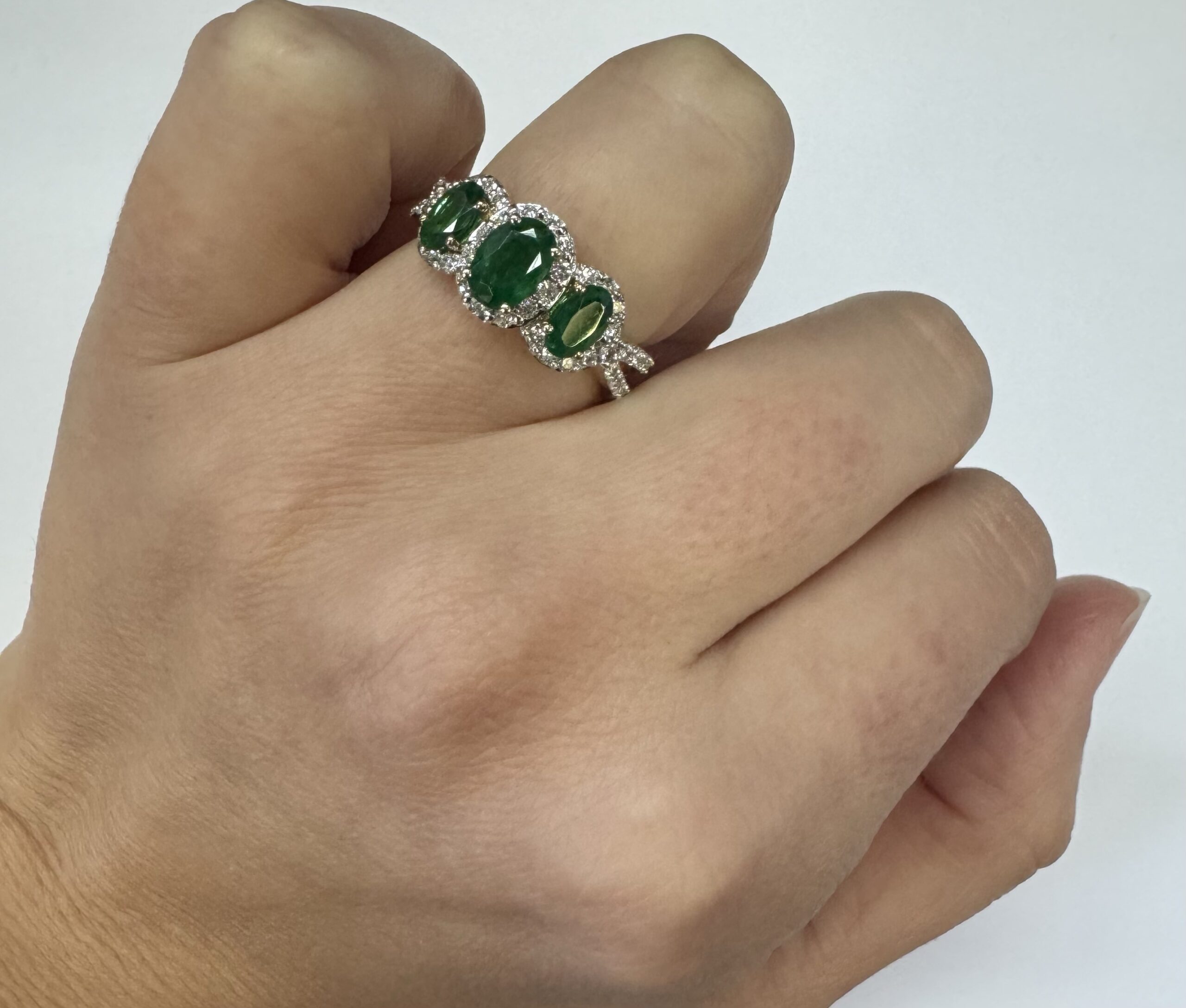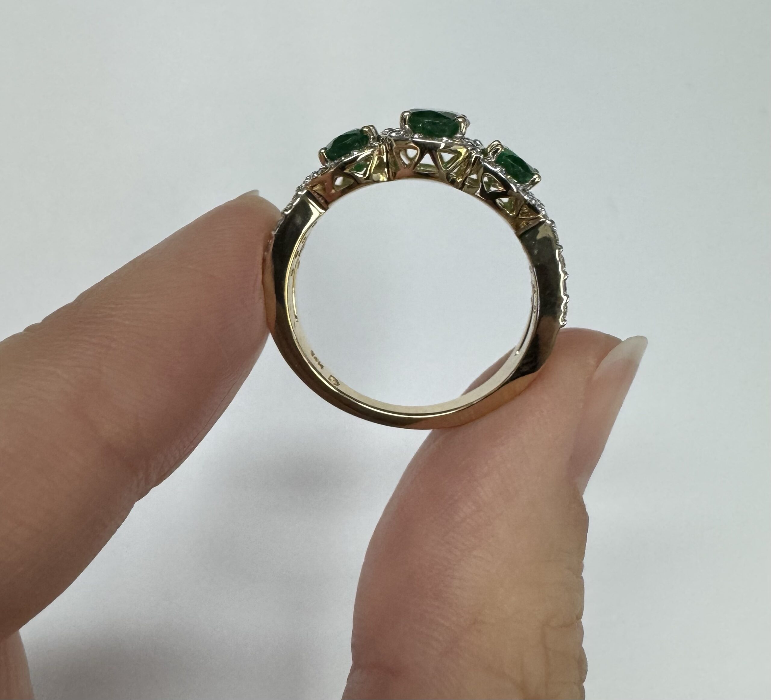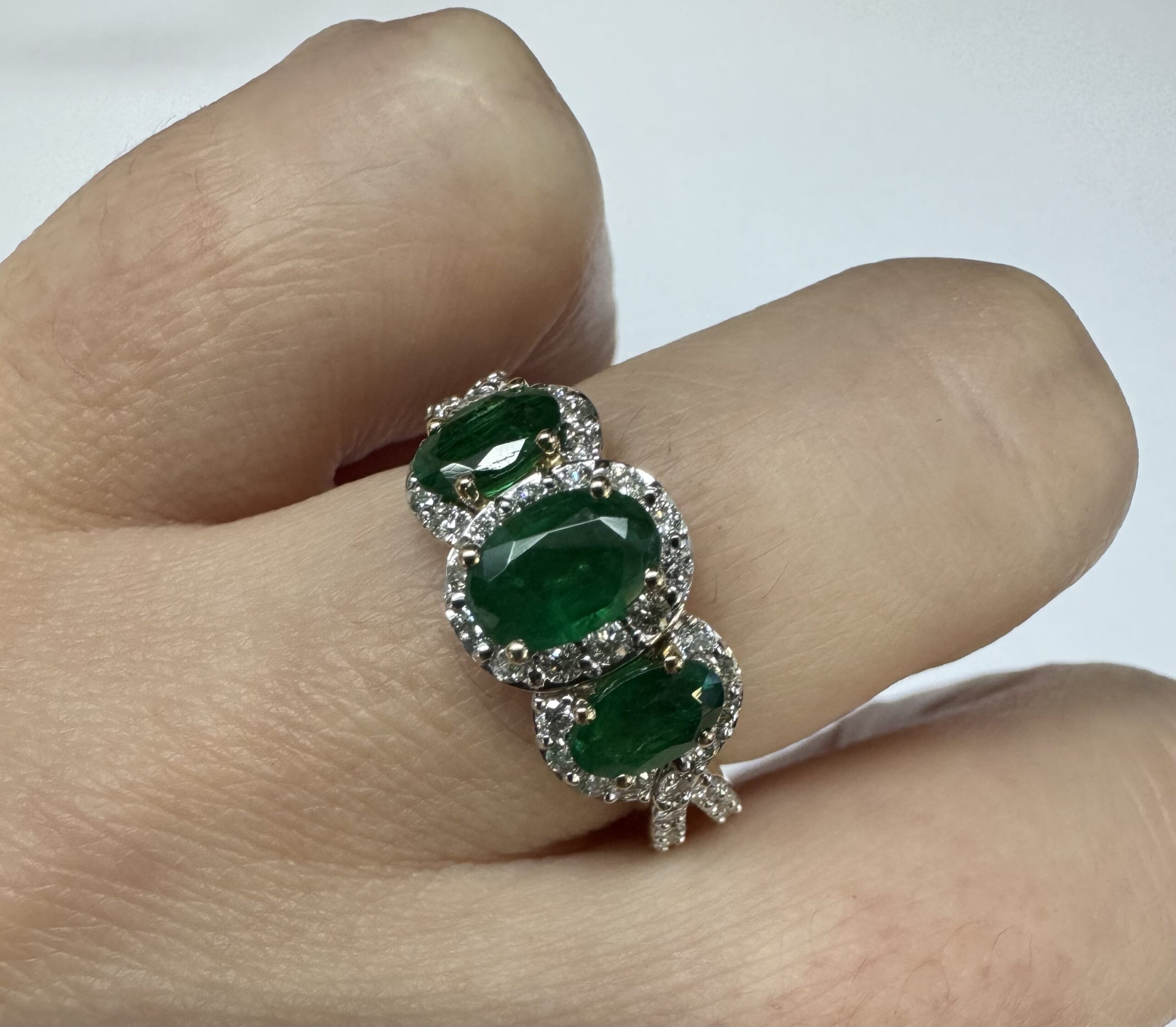 14k yellow gold genuine oval shaped, faceted 1.43 cttw Emerald & .54 cttw genuine Round Brilliant Cut diamond triple halo ring with split shank. These diamonds average G-H in color and SI1 in clarity. These diamonds are nicely proportioned and well finished. This ring is a finger size 7, but it can be reasonably sized. Please make note of the finger size desired in the comments section at checkout. This ring has an entire weight of 4.4 grams.