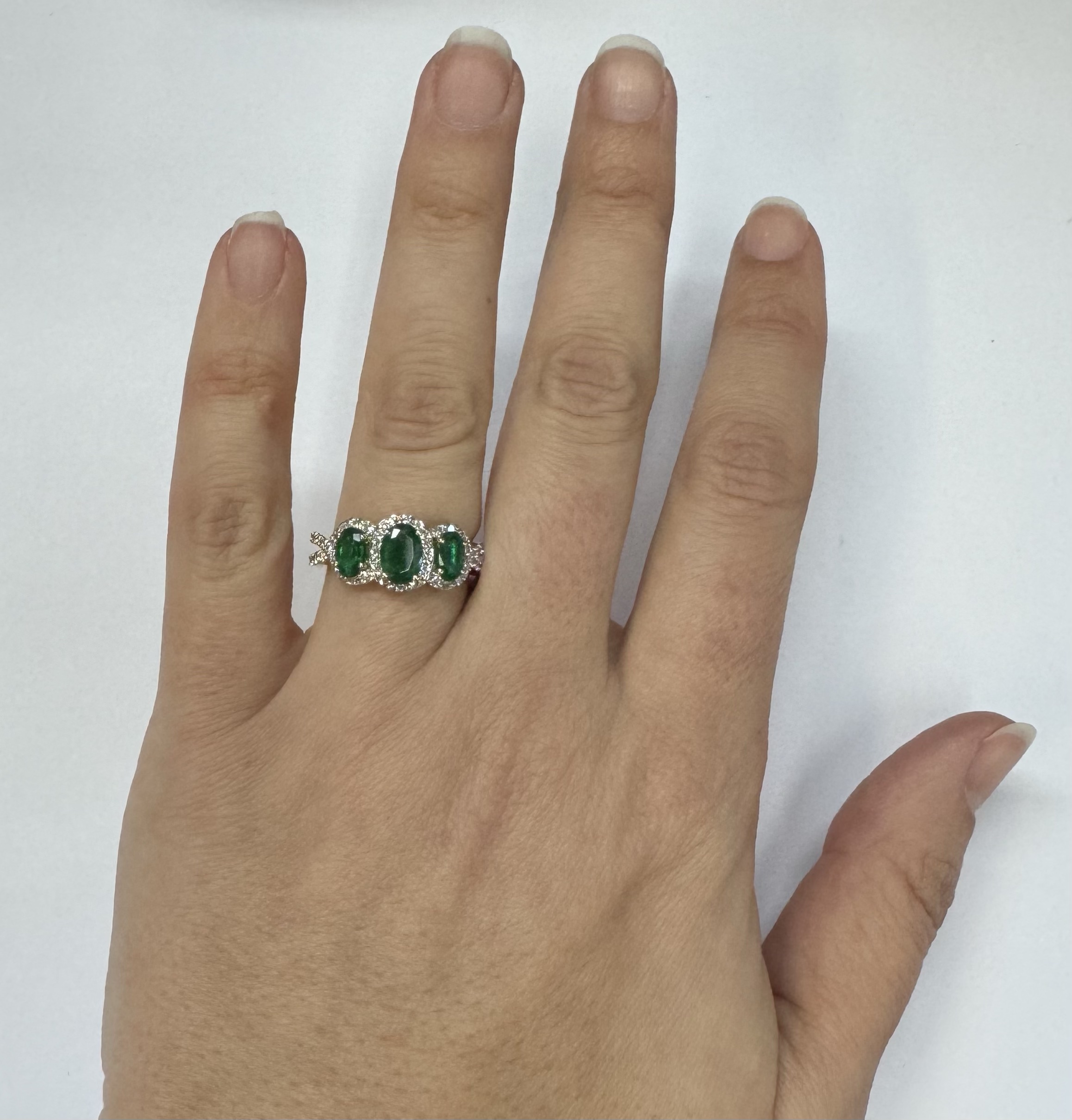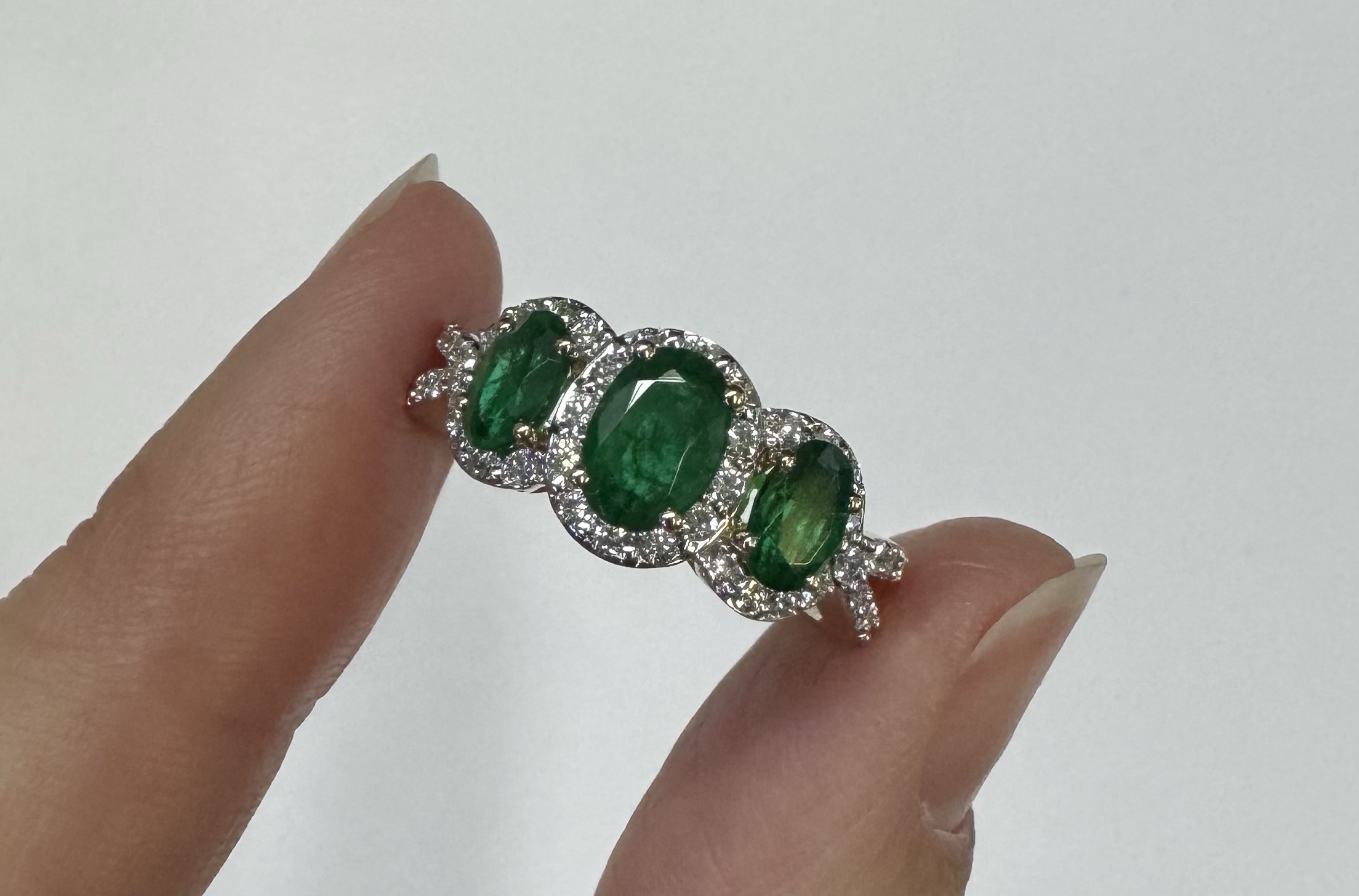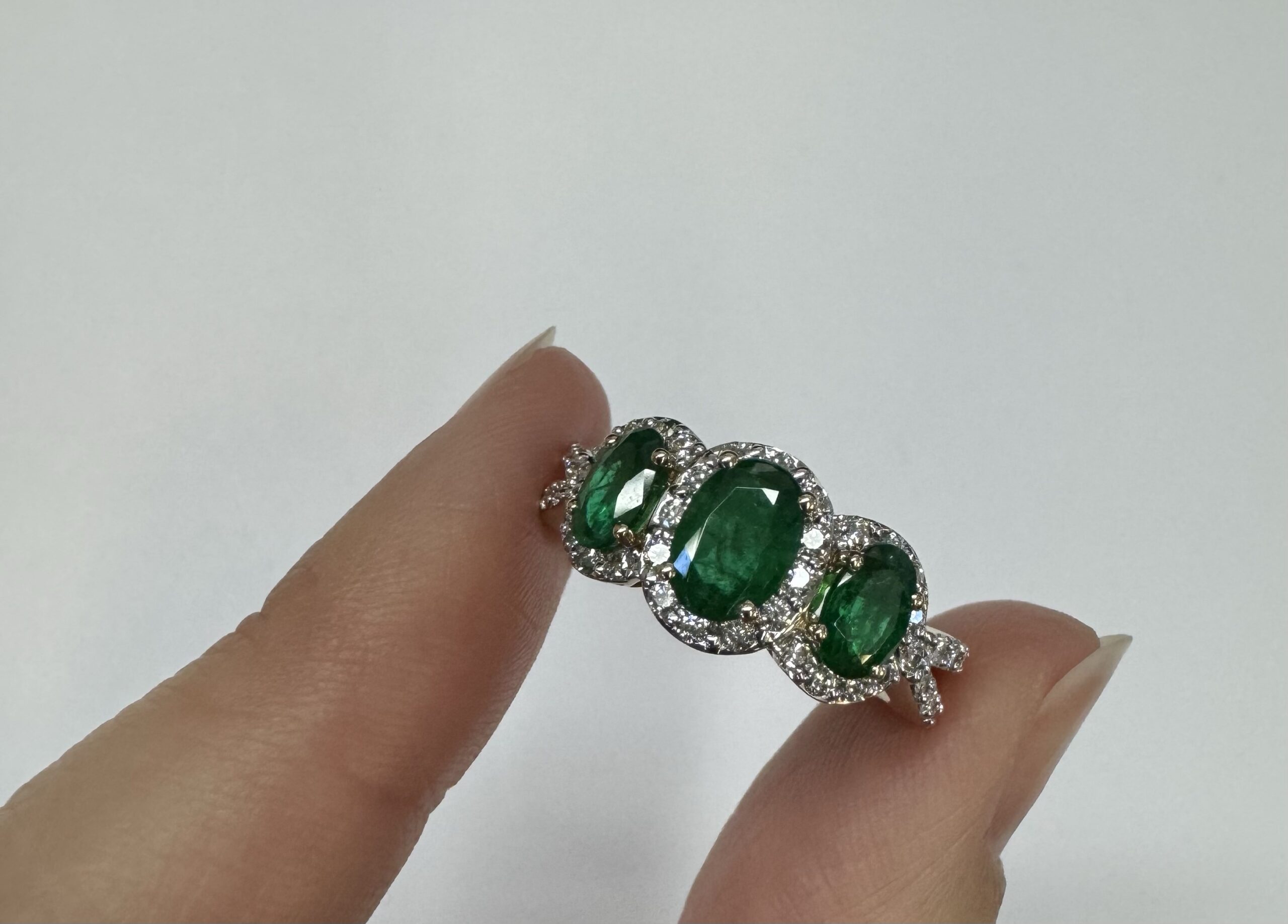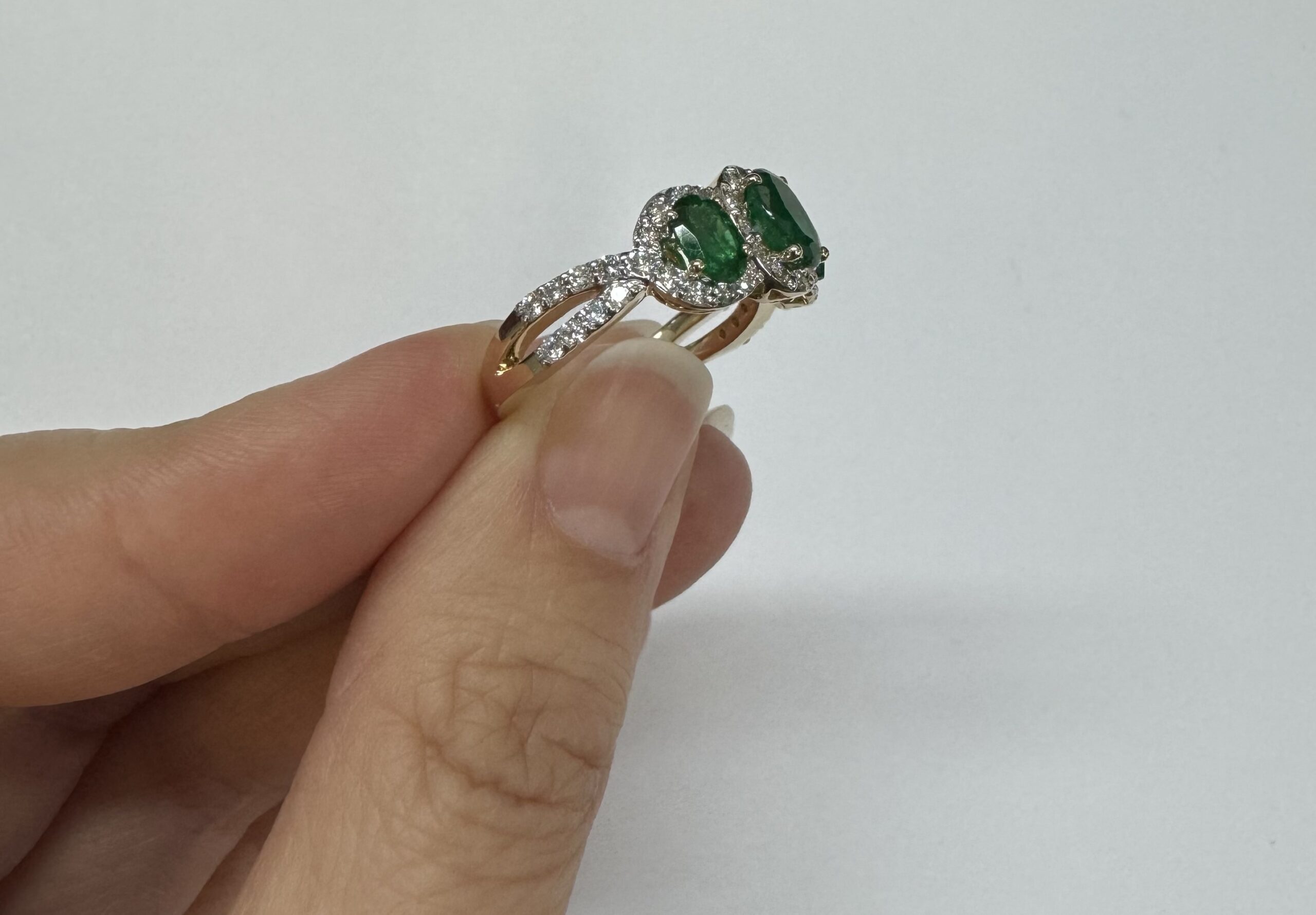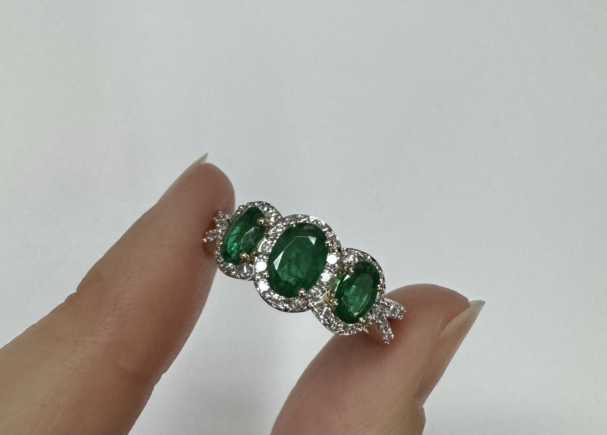 14k yellow gold genuine oval shaped, faceted 1.43 cttw Emerald & .54 cttw genuine Round Brilliant Cut diamond triple halo ring with split shank. These diamonds average G-H in color and SI1 in clarity. These diamonds are nicely proportioned and well finished. This ring is a finger size 7, but it can be reasonably sized. Please make note of the finger size desired in the comments section at checkout. This ring has an entire weight of 4.4 grams.