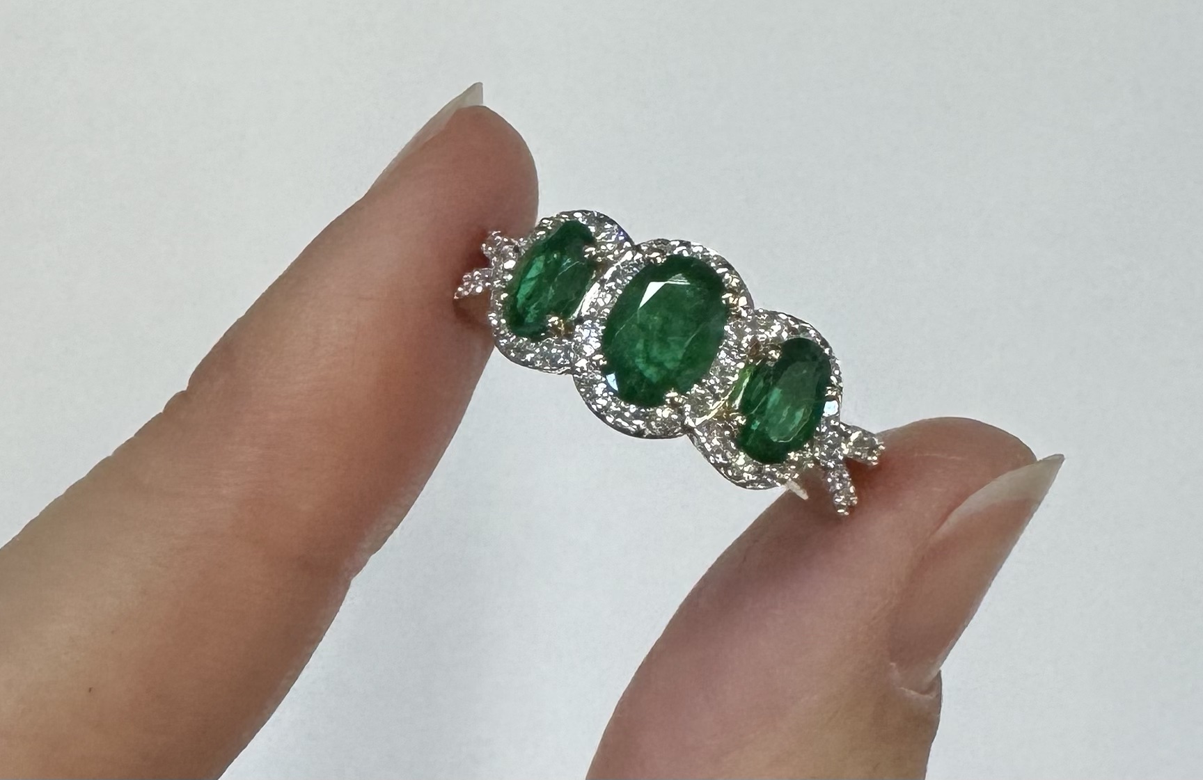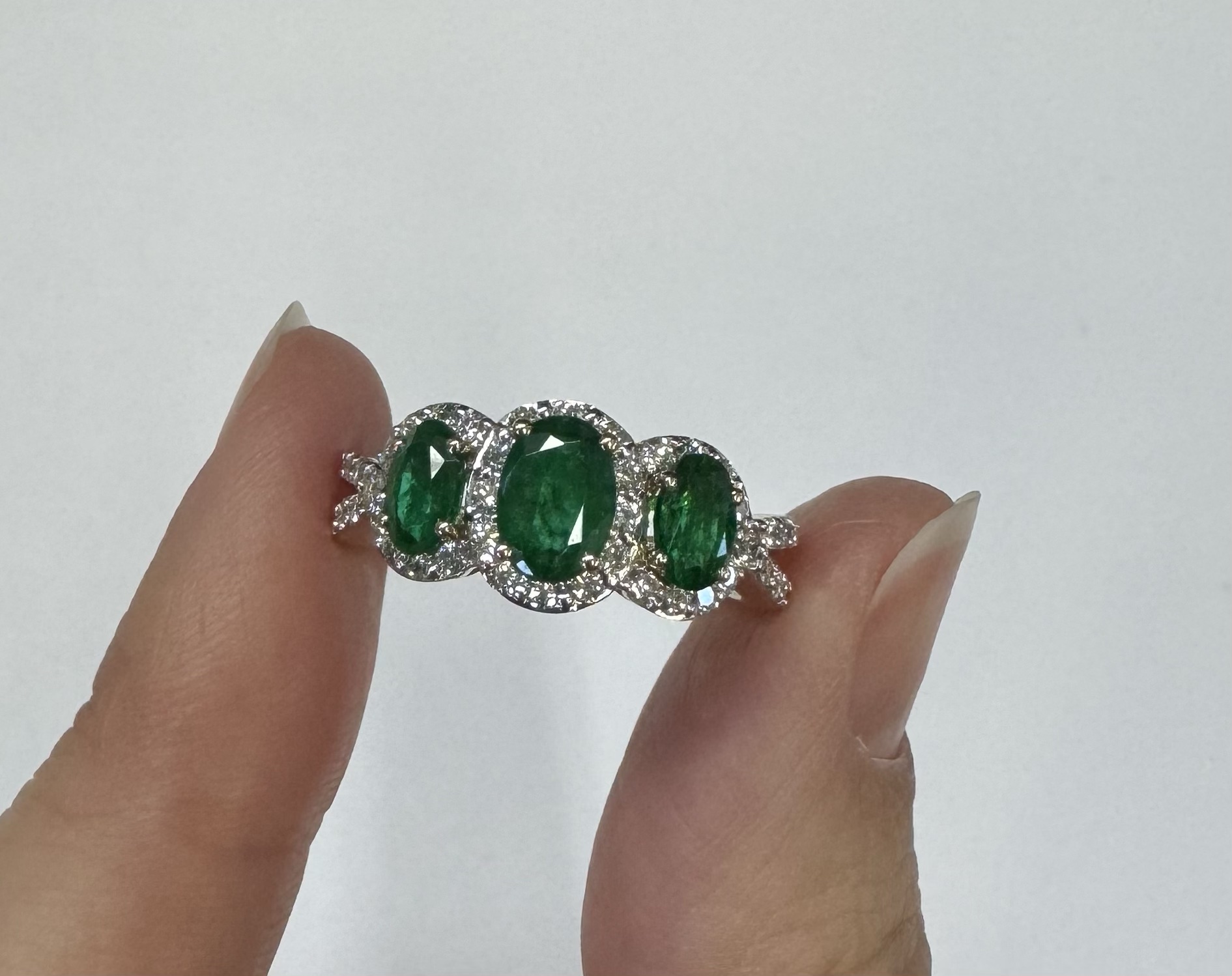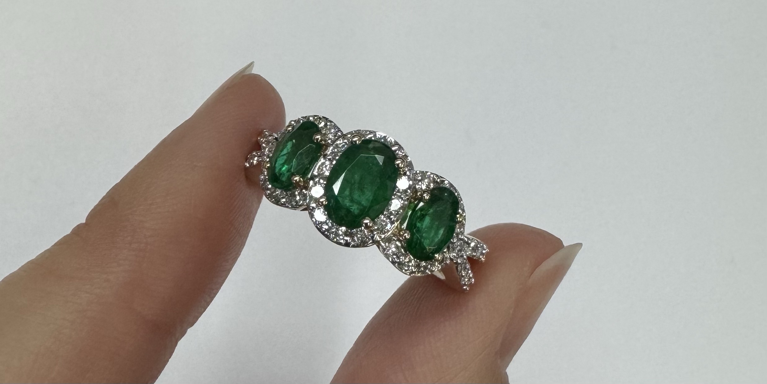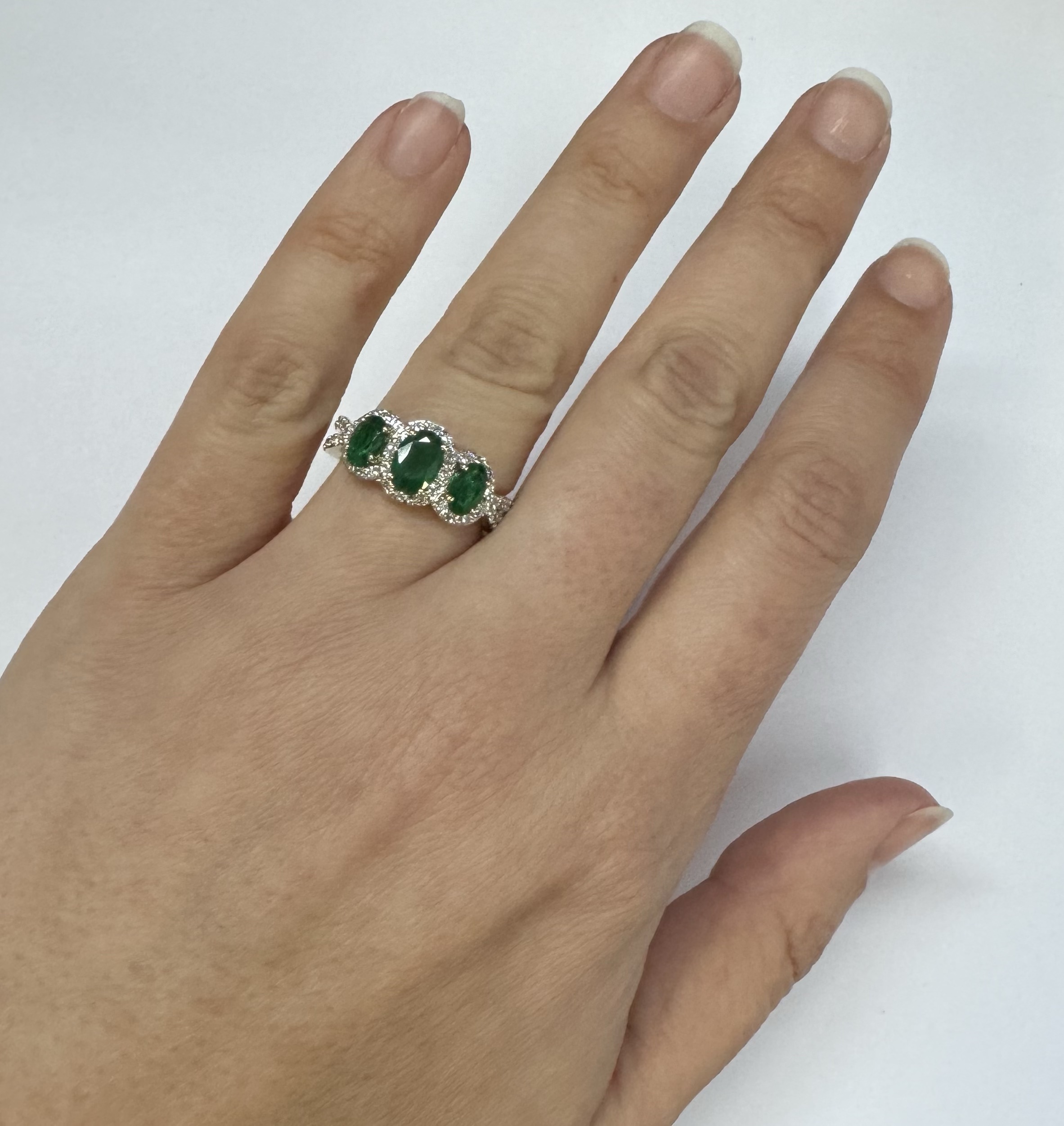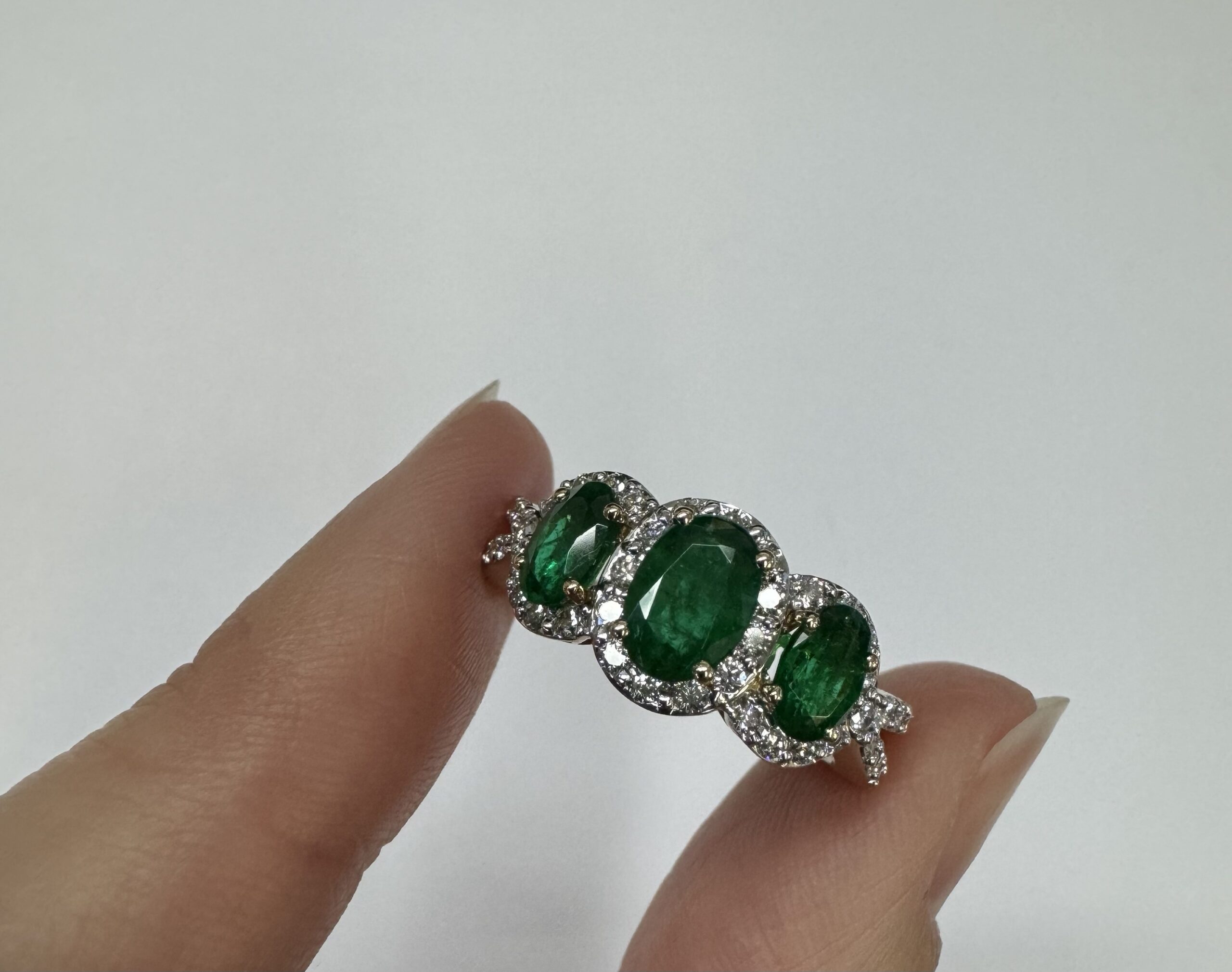 14k yellow gold genuine oval shaped, faceted 1.43 cttw Emerald & .54 cttw genuine Round Brilliant Cut diamond triple halo ring with split shank. These diamonds average G-H in color and SI1 in clarity. These diamonds are nicely proportioned and well finished. This ring is a finger size 7, but it can be reasonably sized. Please make note of the finger size desired in the comments section at checkout. This ring has an entire weight of 4.4 grams.
