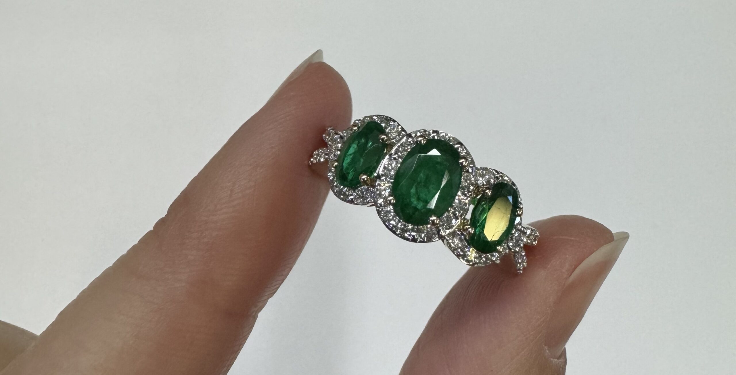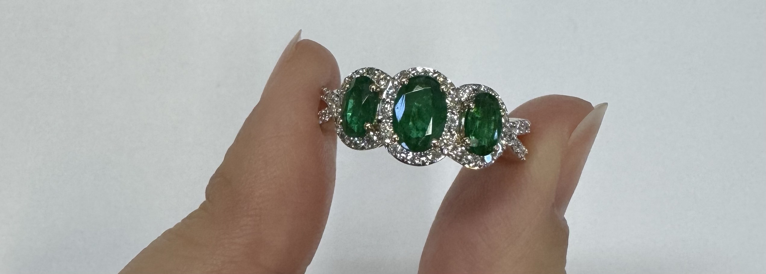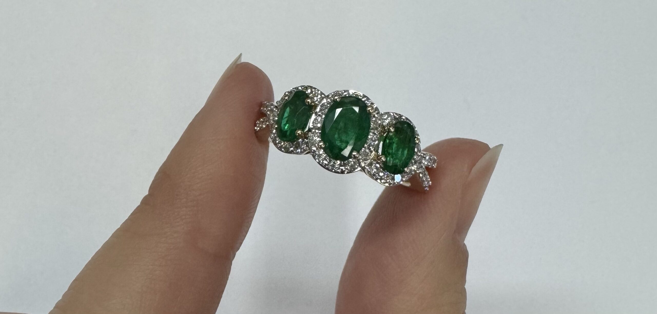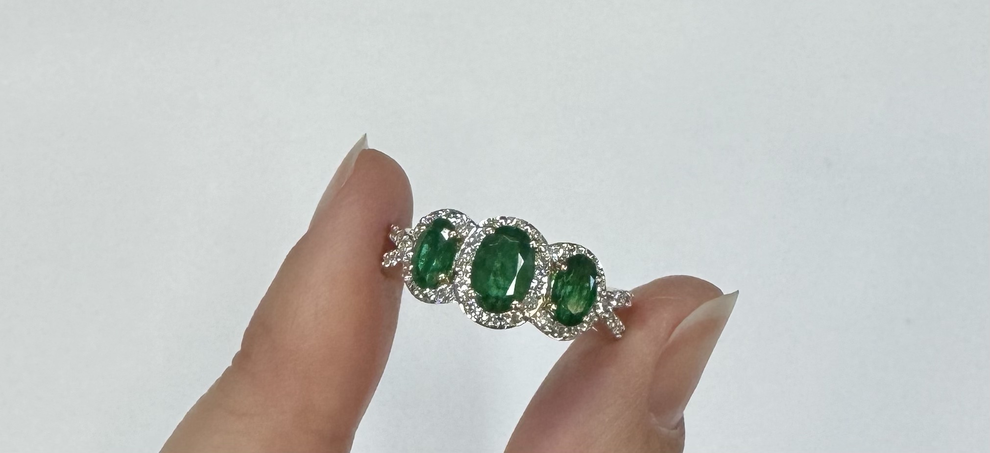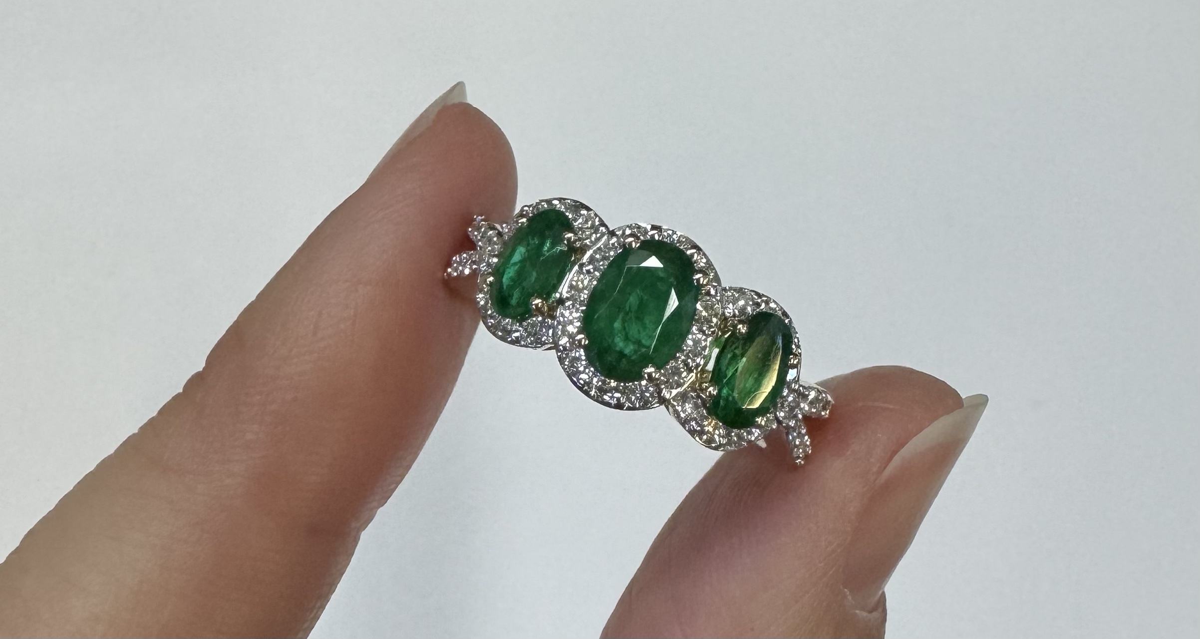 14k yellow gold genuine oval shaped, faceted 1.43 cttw Emerald & .54 cttw genuine Round Brilliant Cut diamond triple halo ring with split shank. These diamonds average G-H in color and SI1 in clarity. These diamonds are nicely proportioned and well finished. This ring is a finger size 7, but it can be reasonably sized. Please make note of the finger size desired in the comments section at checkout. This ring has an entire weight of 4.4 grams.