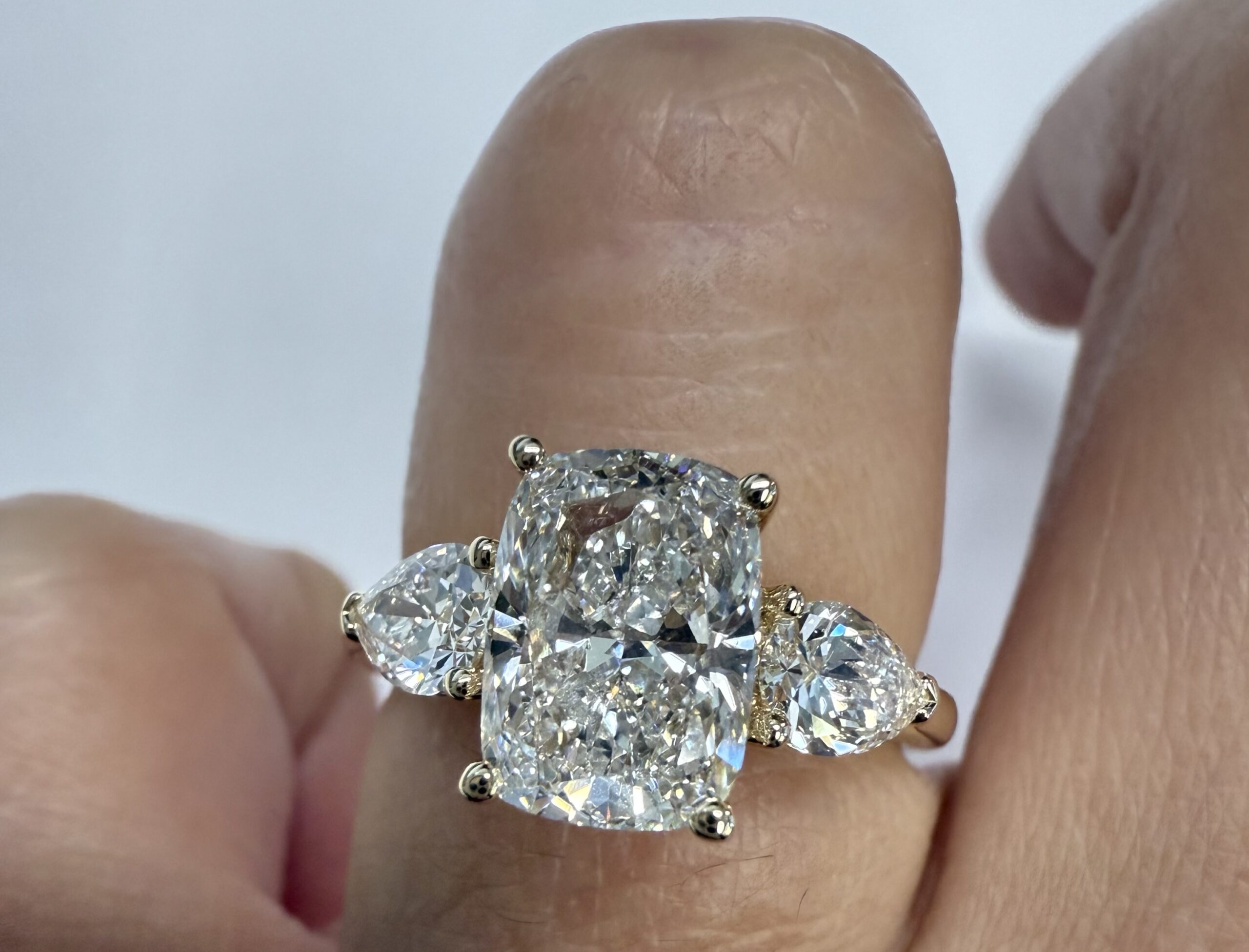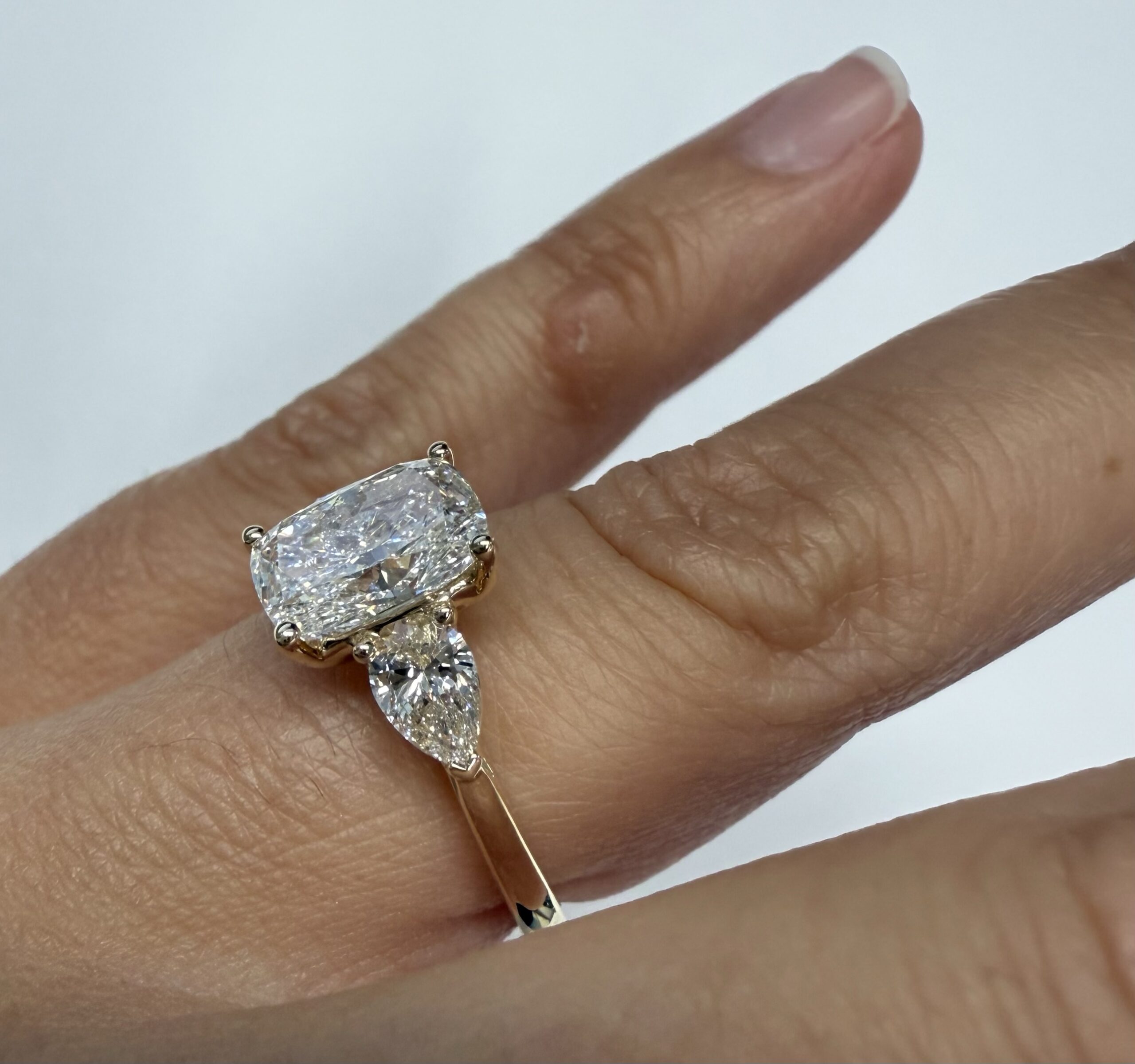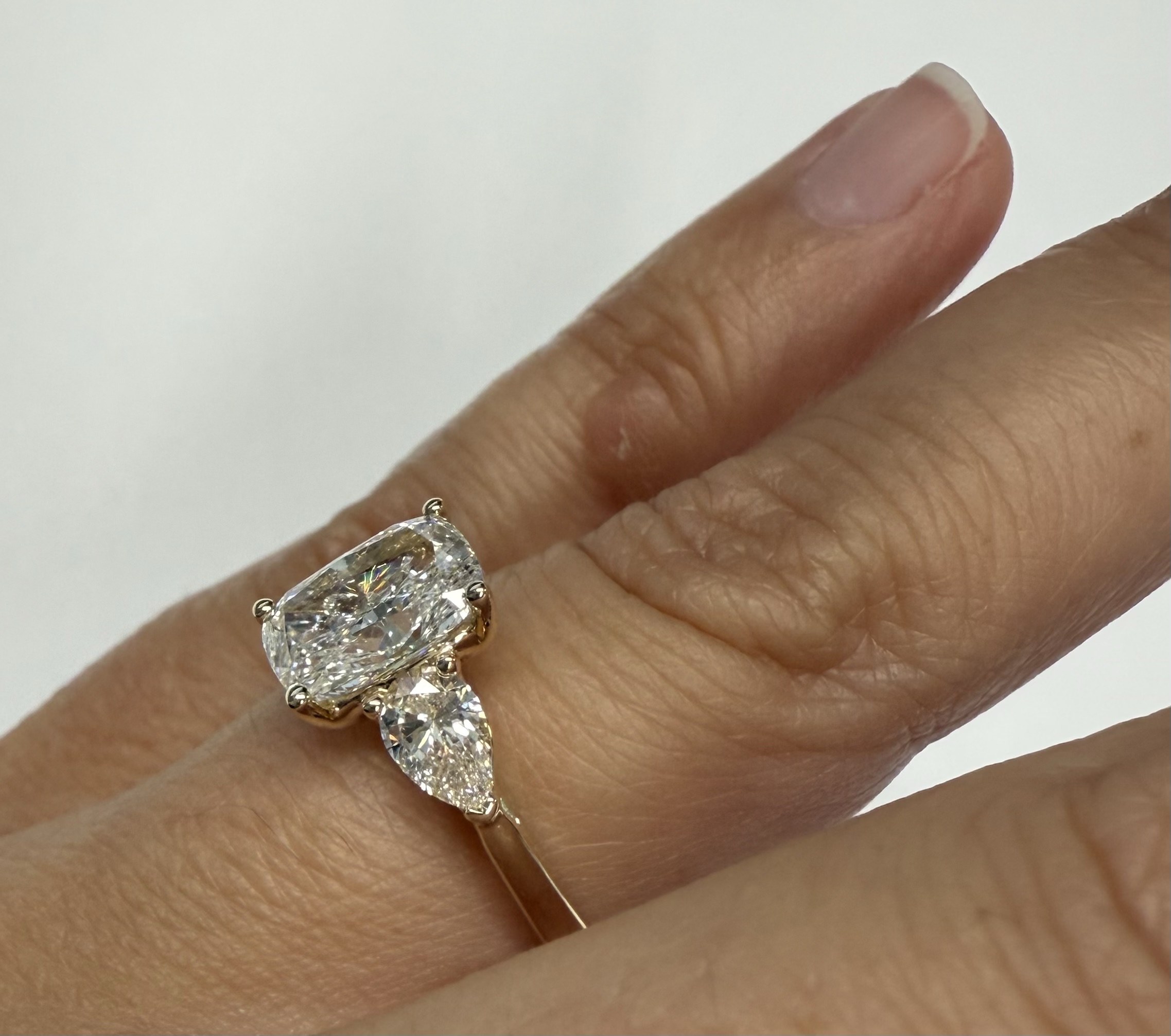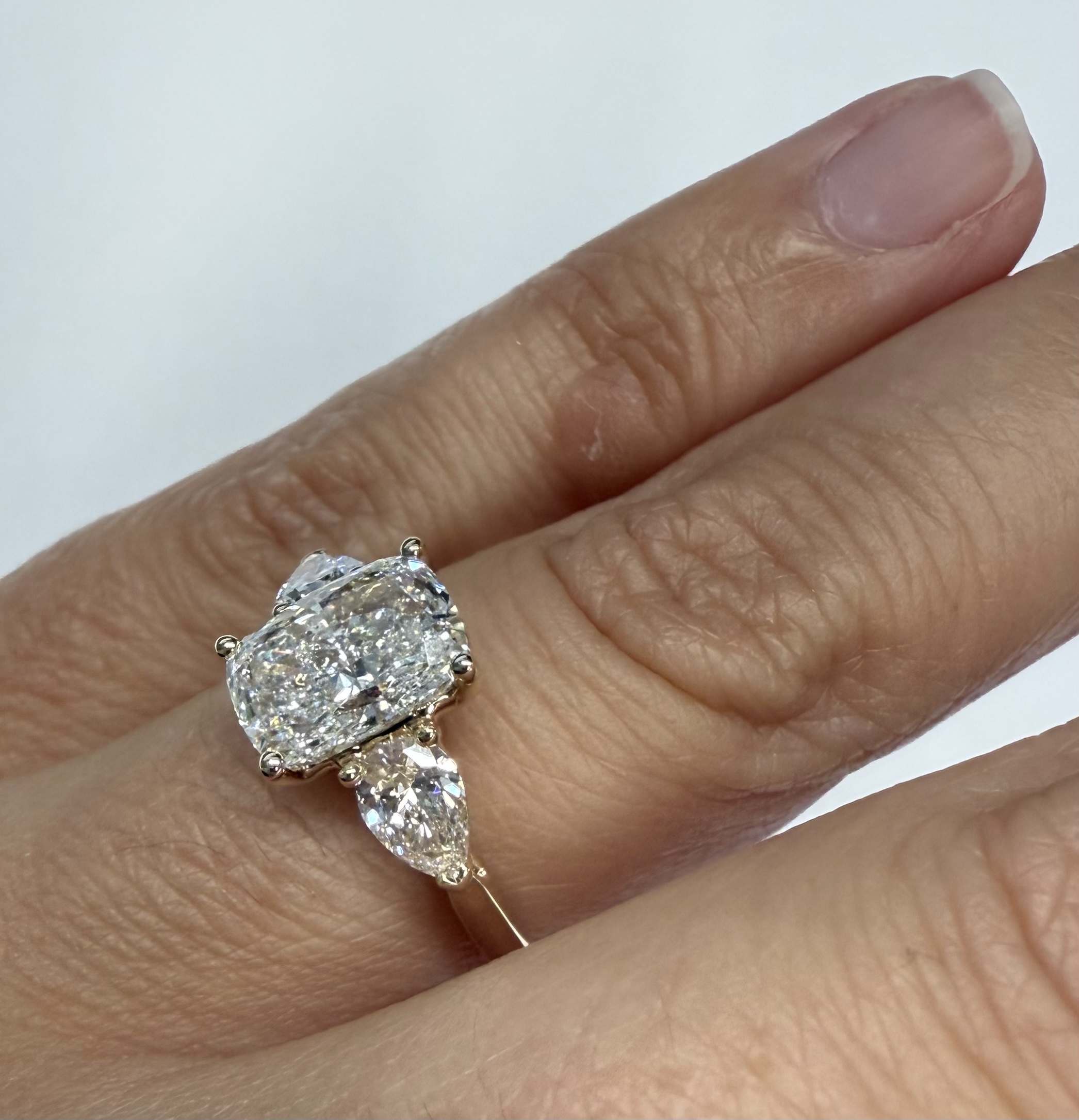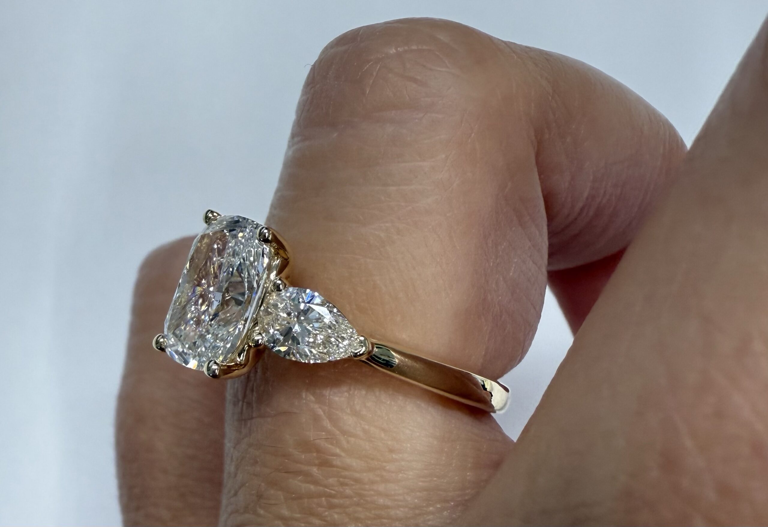 14k yellow gold IGI Certified Laboratory Grown 2.08 Carat Cushion Brilliant Cut diamond with E color, VS1 clarity. This diamond has excellent polish, excellent summery, and no fluorescence. This diamond is set in the center of the ring into a 4 prong basket style head. This ring is further enhanced by 2 genuine Laboratory Grown Pear Shaped diamonds, which are shared prong set to either side of the major diamond. These 2 diamonds have a total combined weight of .69/100-ct. These diamonds average E in color, and VS1 in clarity. These diamonds have excellent polish, excellent symmetry, and no fluorescence. This ring has an entire weight of 3.9 grams. This ring is a finger size 6, but it can be reasonably sized. Please make note of the finger size desired in the comments section at checkout.