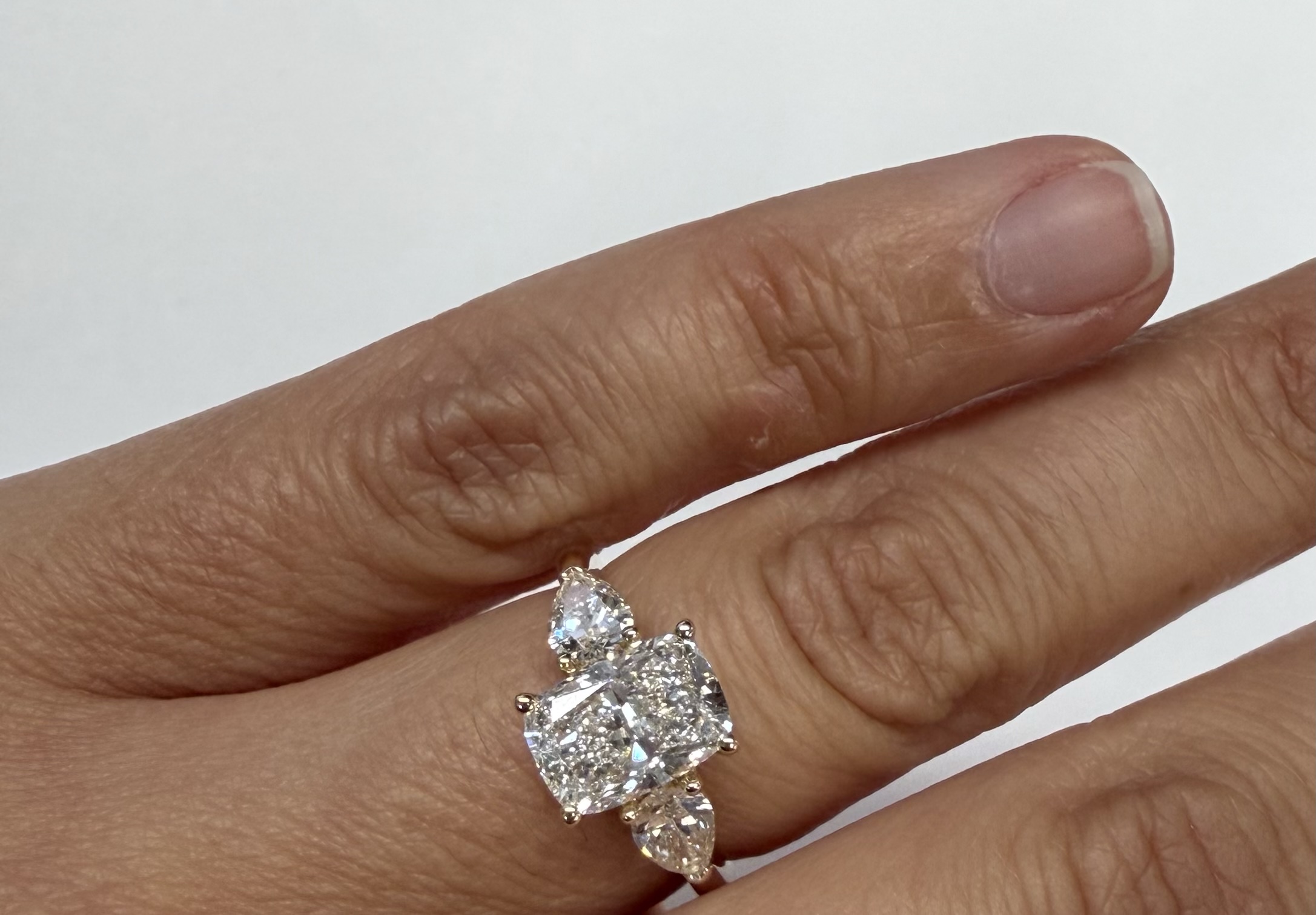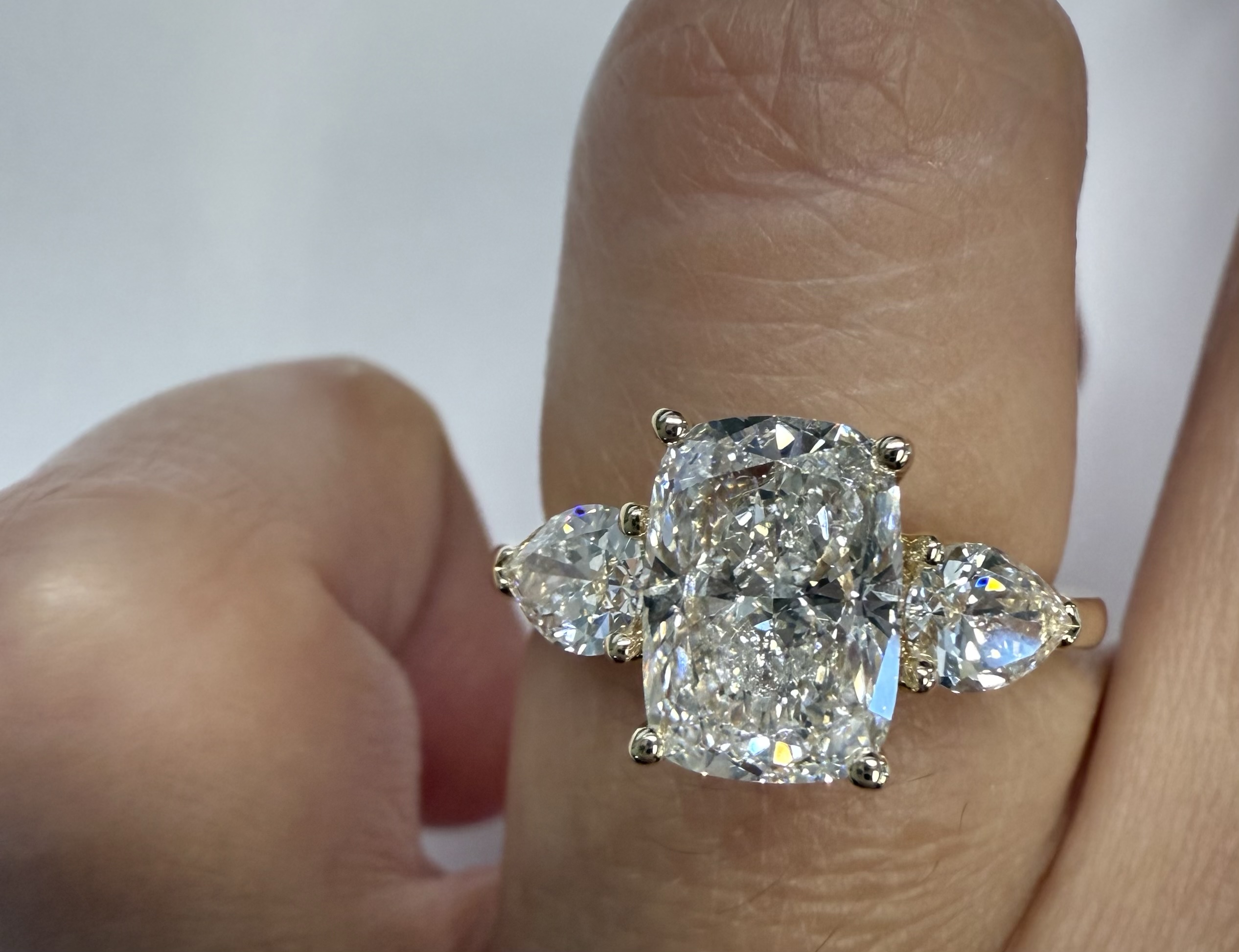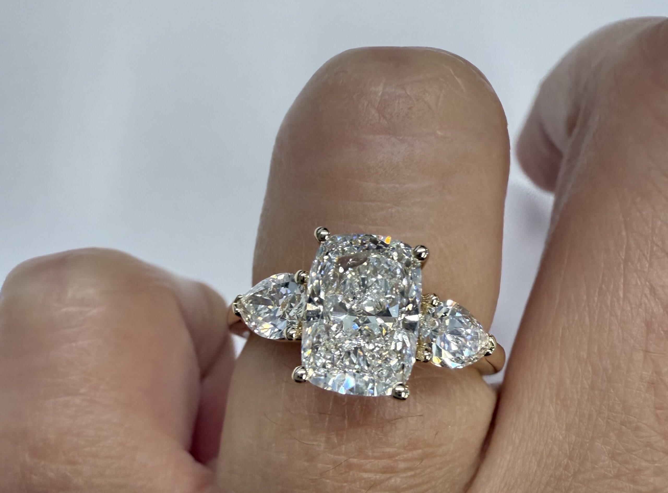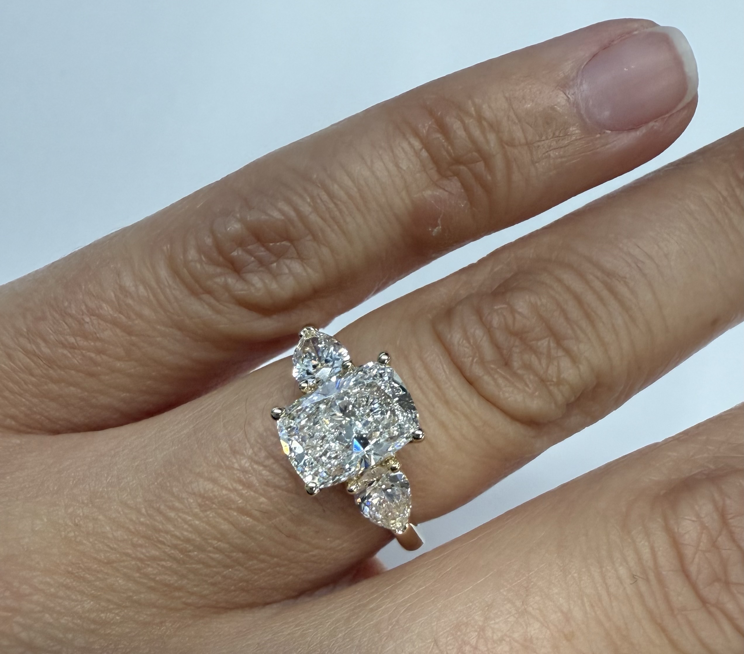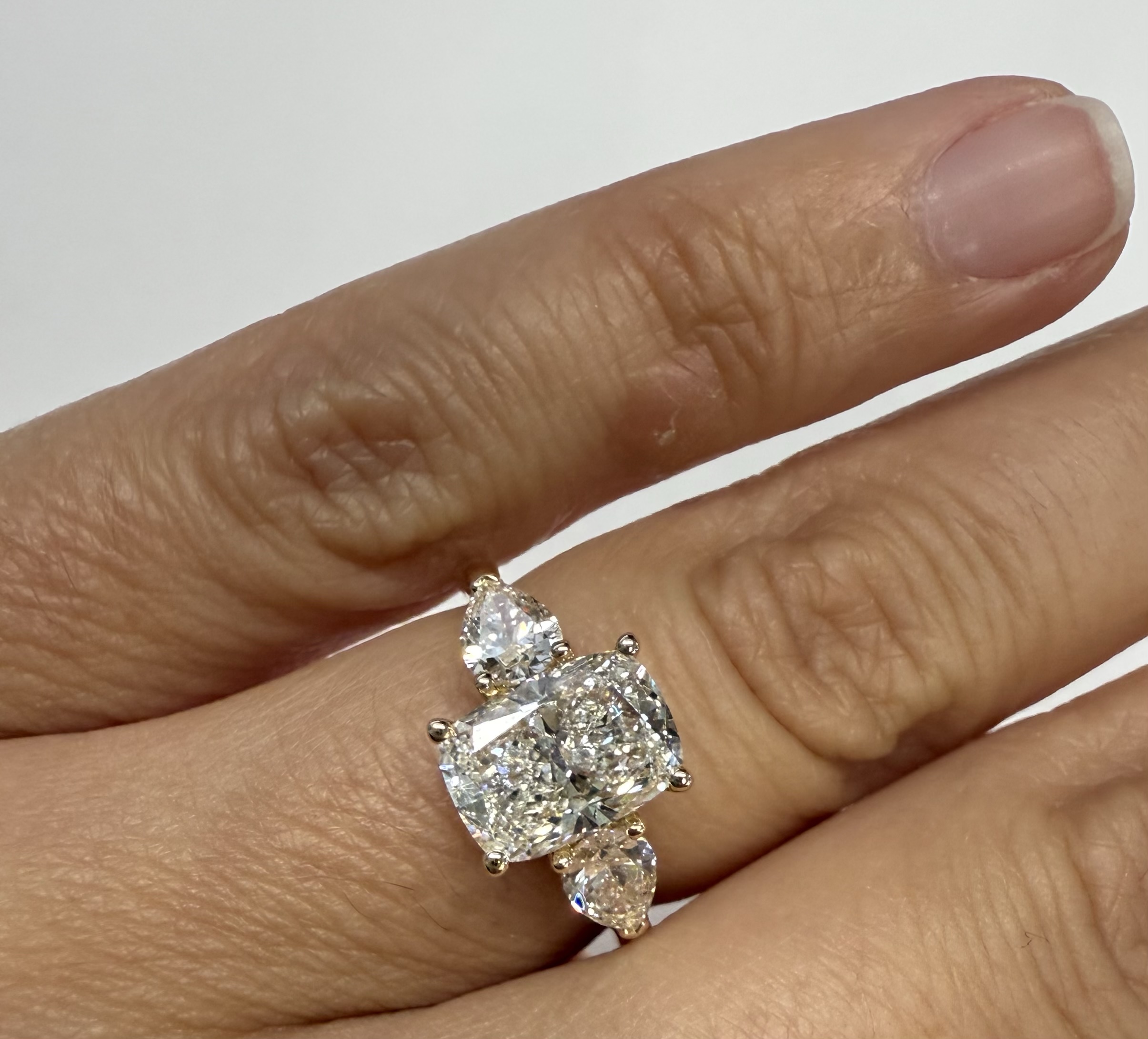 14k yellow gold IGI Certified Laboratory Grown 2.08 Carat Cushion Brilliant Cut diamond with E color, VS1 clarity. This diamond has excellent polish, excellent summery, and no fluorescence. This diamond is set in the center of the ring into a 4 prong basket style head. This ring is further enhanced by 2 genuine Laboratory Grown Pear Shaped diamonds, which are shared prong set to either side of the major diamond. These 2 diamonds have a total combined weight of .69/100-ct. These diamonds average E in color, and VS1 in clarity. These diamonds have excellent polish, excellent symmetry, and no fluorescence. This ring has an entire weight of 3.9 grams. This ring is a finger size 6, but it can be reasonably sized. Please make note of the finger size desired in the comments section at checkout.