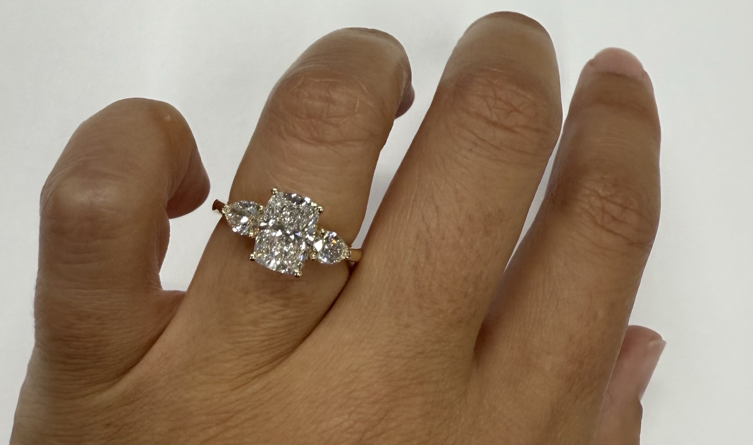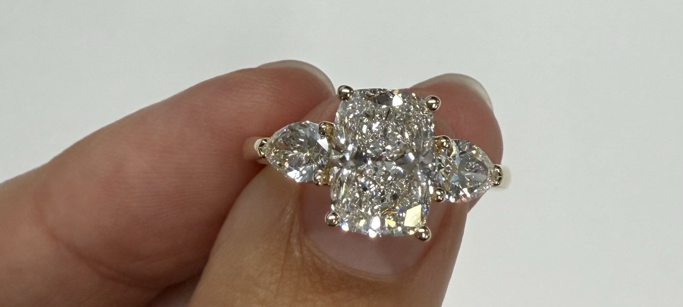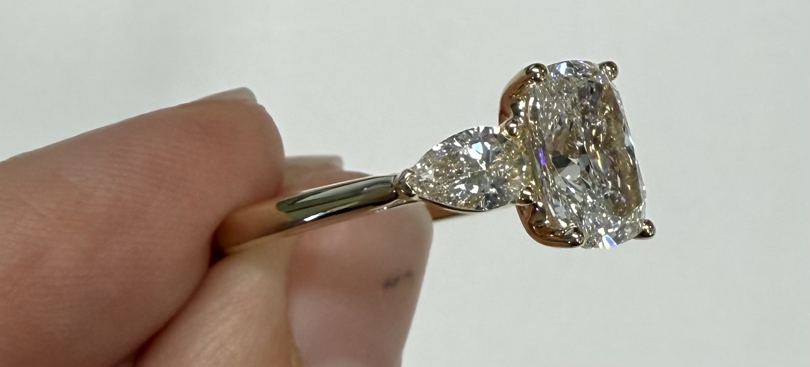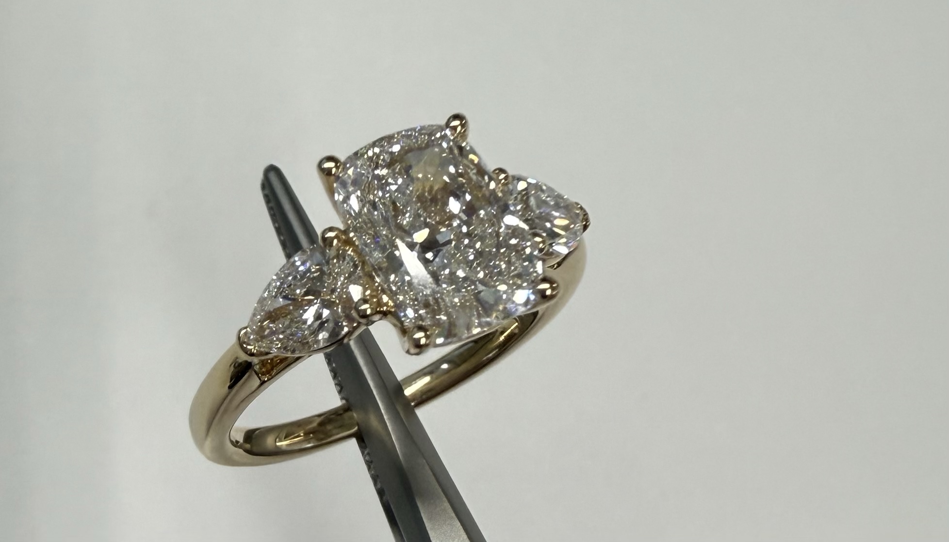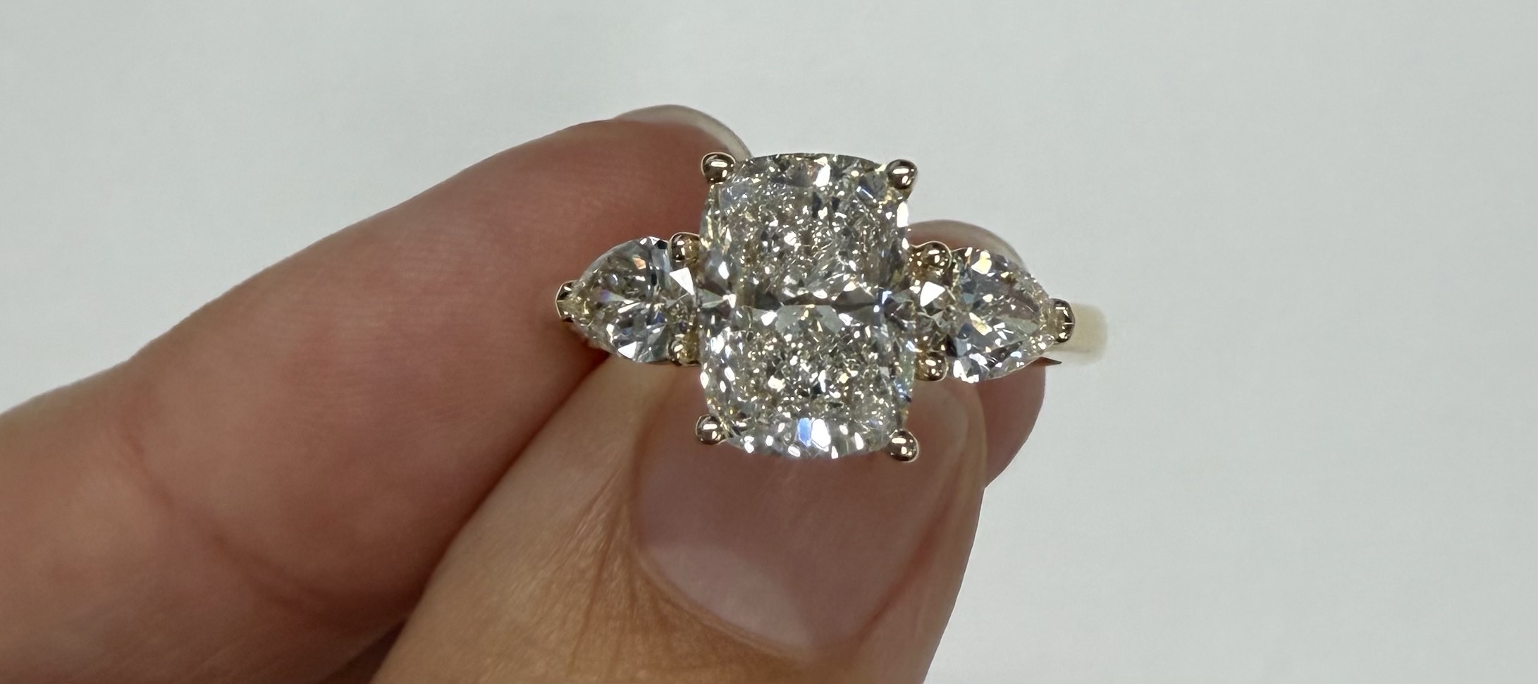14k yellow gold IGI Certified Laboratory Grown 2.08 Carat Cushion Brilliant Cut diamond with E color, VS1 clarity. This diamond has excellent polish, excellent summery, and no fluorescence. This diamond is set in the center of the ring into a 4 prong basket style head. This ring is further enhanced by 2 genuine Laboratory Grown Pear Shaped diamonds, which are shared prong set to either side of the major diamond. These 2 diamonds have a total combined weight of .69/100-ct. These diamonds average E in color, and VS1 in clarity. These diamonds have excellent polish, excellent symmetry, and no fluorescence. This ring has an entire weight of 3.9 grams. This ring is a finger size 6, but it can be reasonably sized. Please make note of the finger size desired in the comments section at checkout.