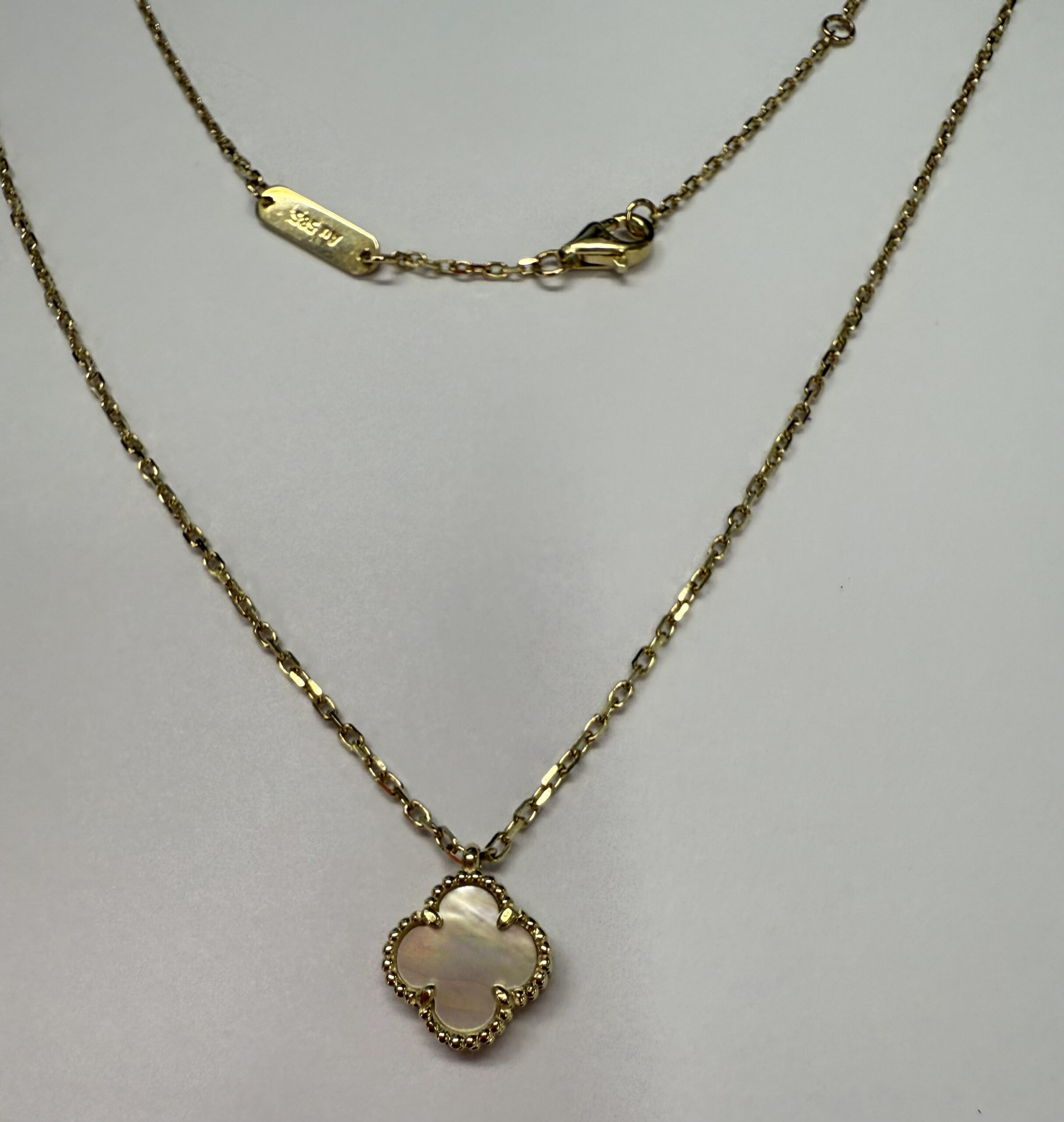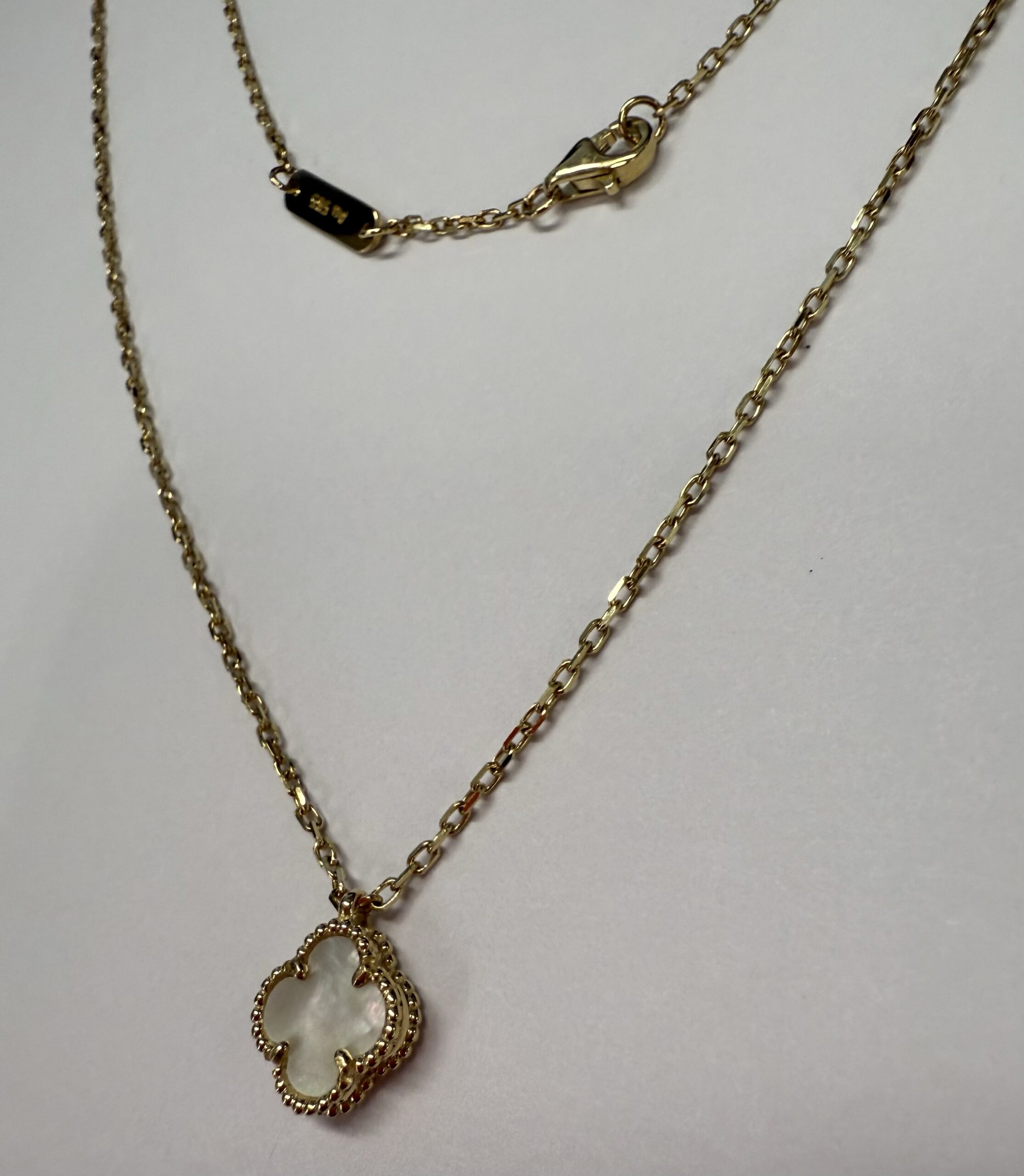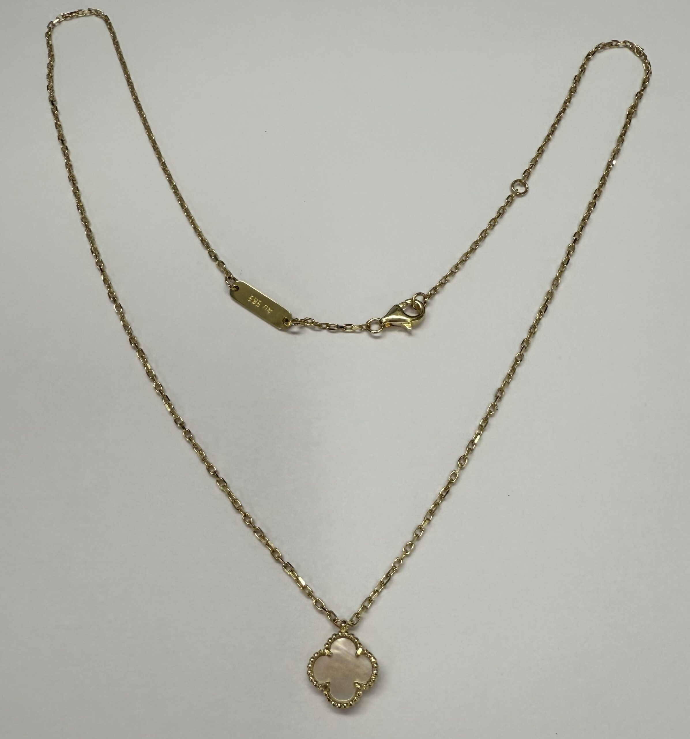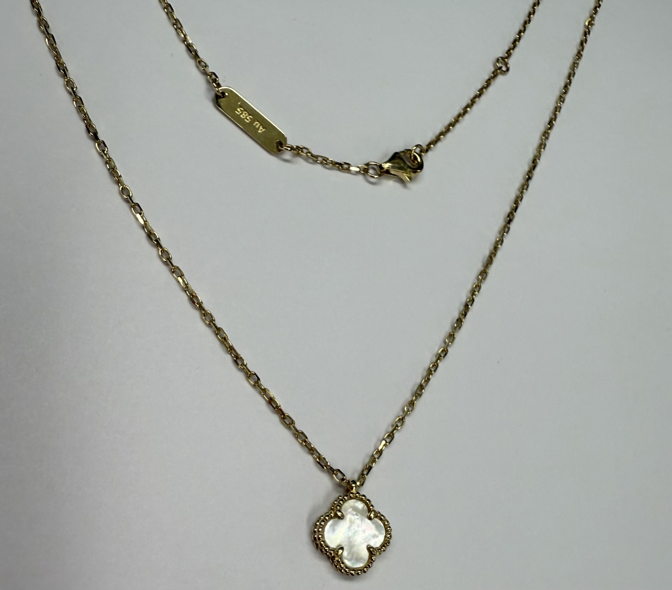 One-of-a-kind 14k yellow gold genuine Mother of Pearl clover necklace, adjustable 16-18″, 3.4 grams.