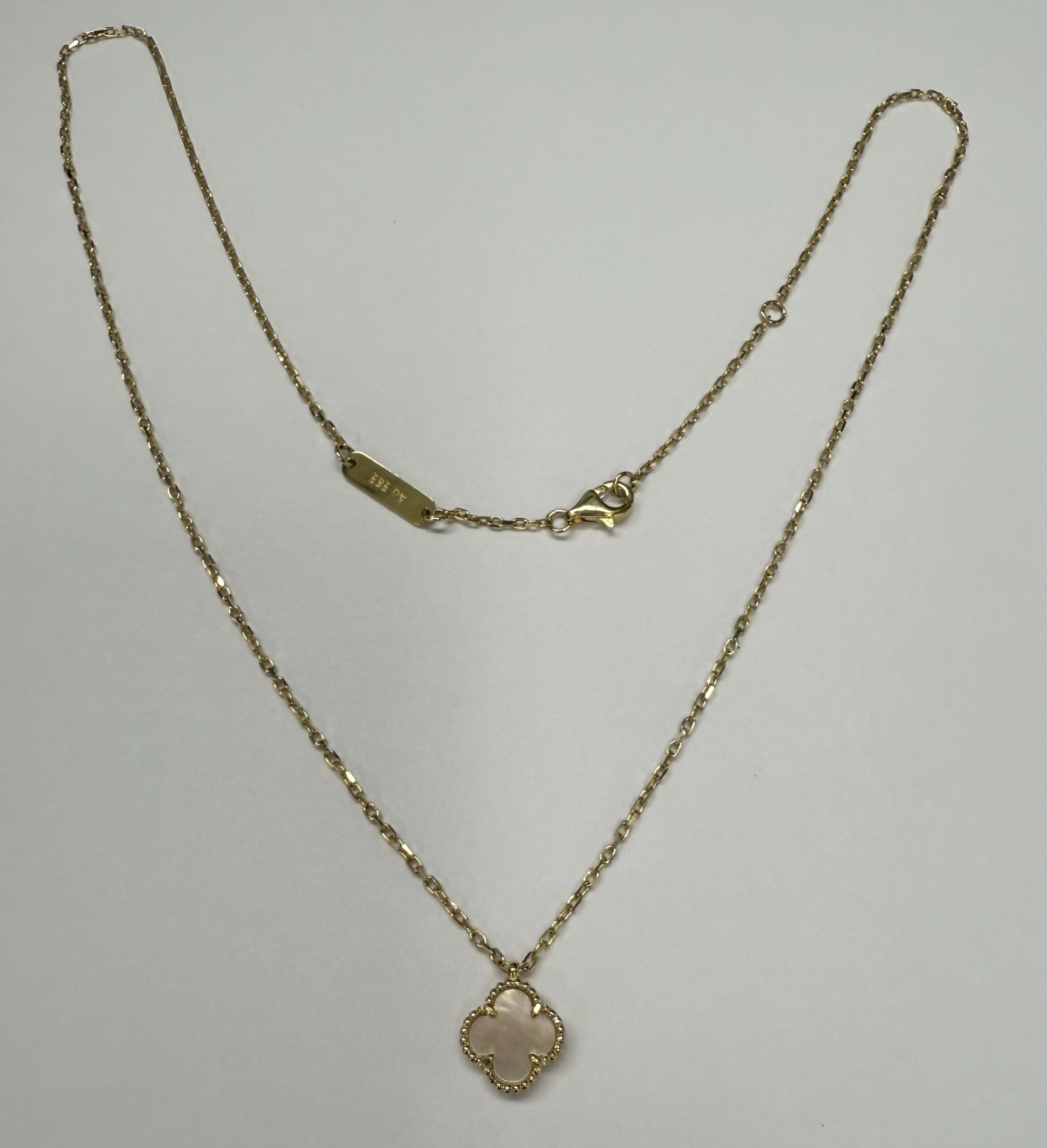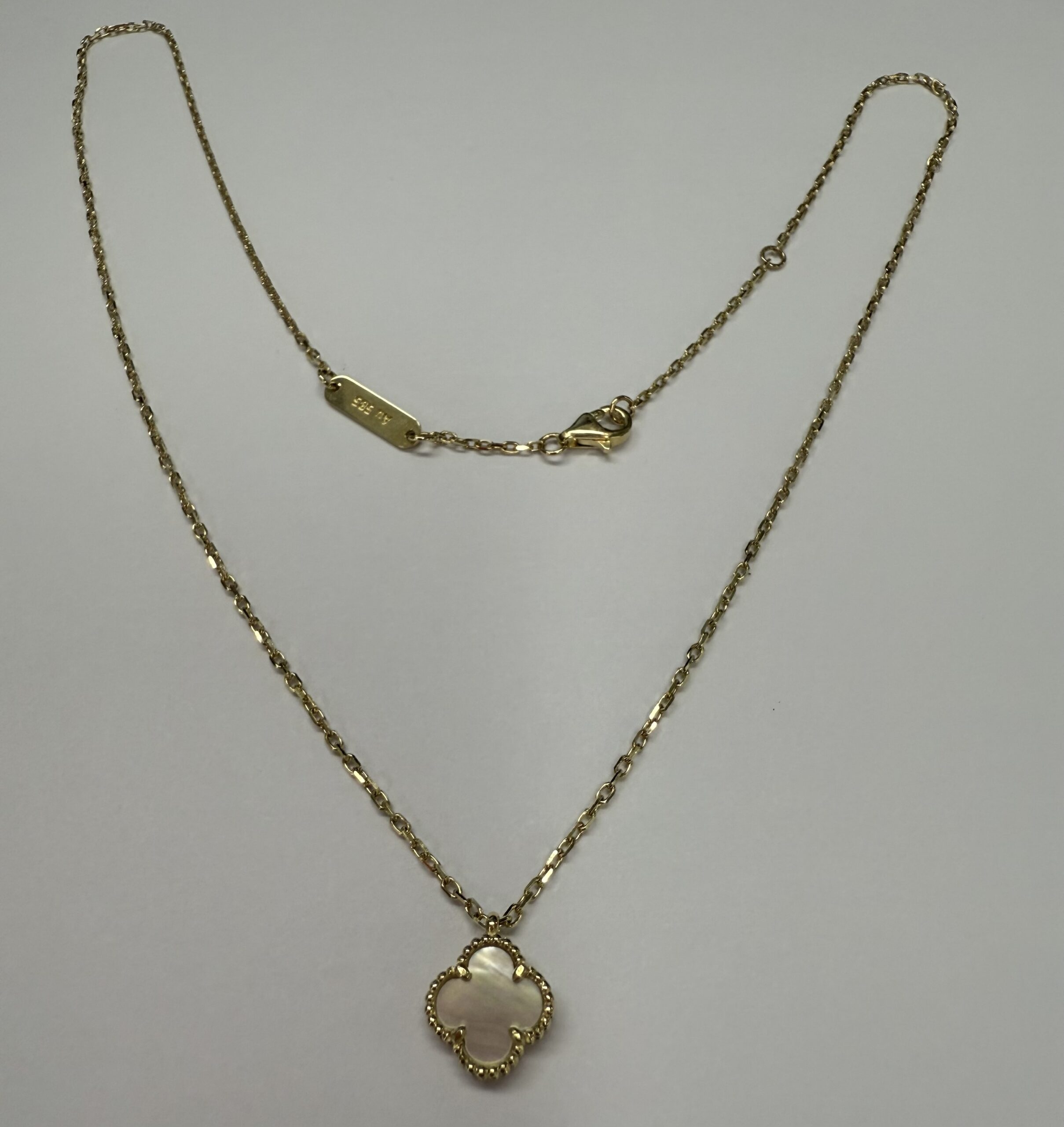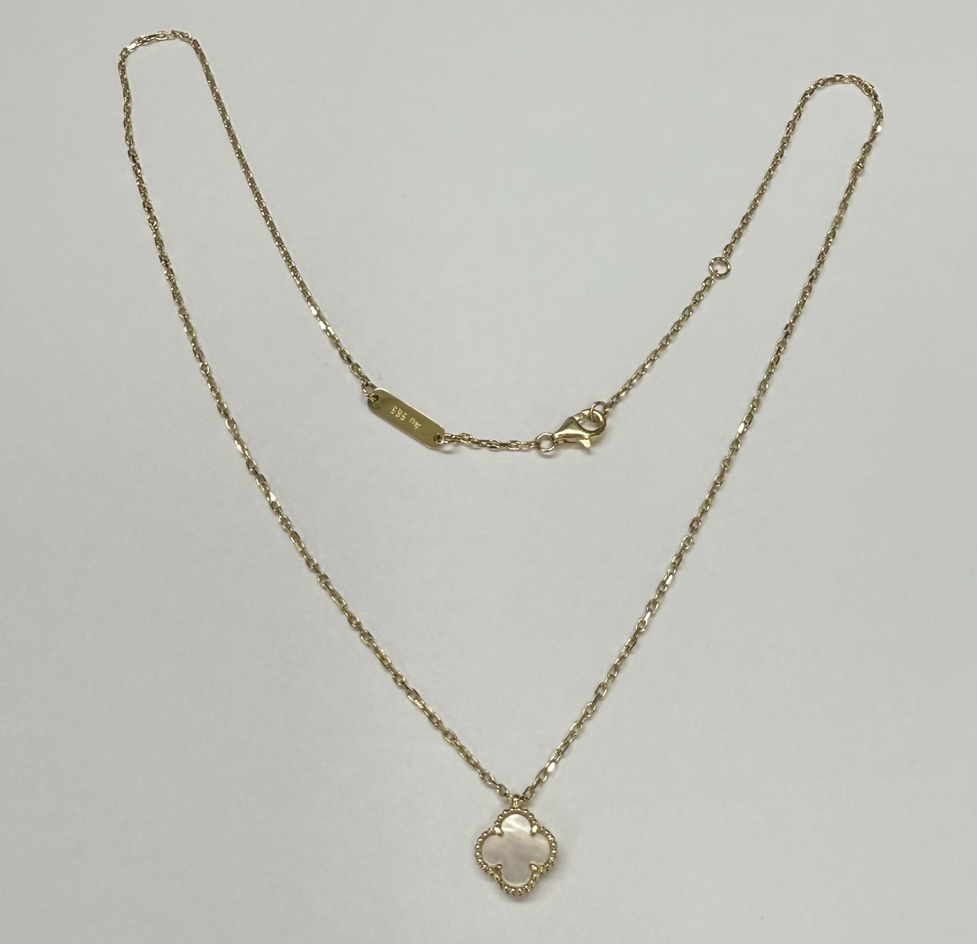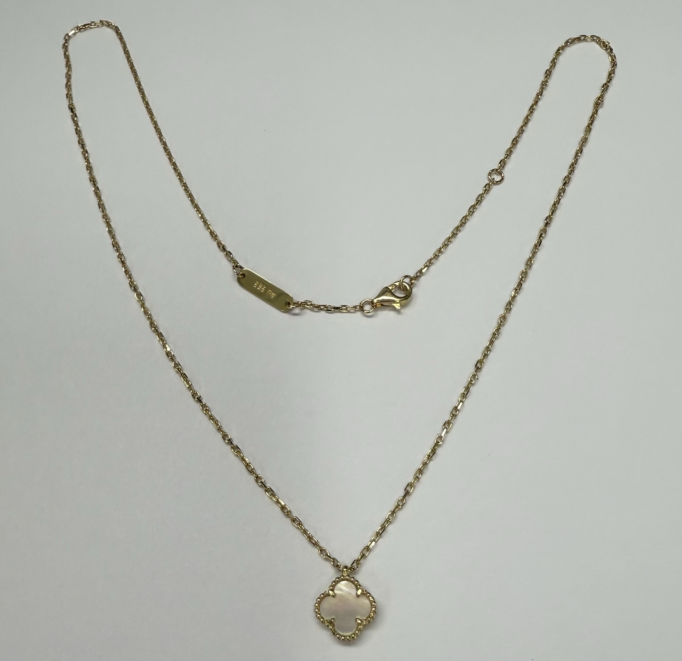 One-of-a-kind 14k yellow gold genuine Mother of Pearl clover necklace, adjustable 16-18″, 3.4 grams.