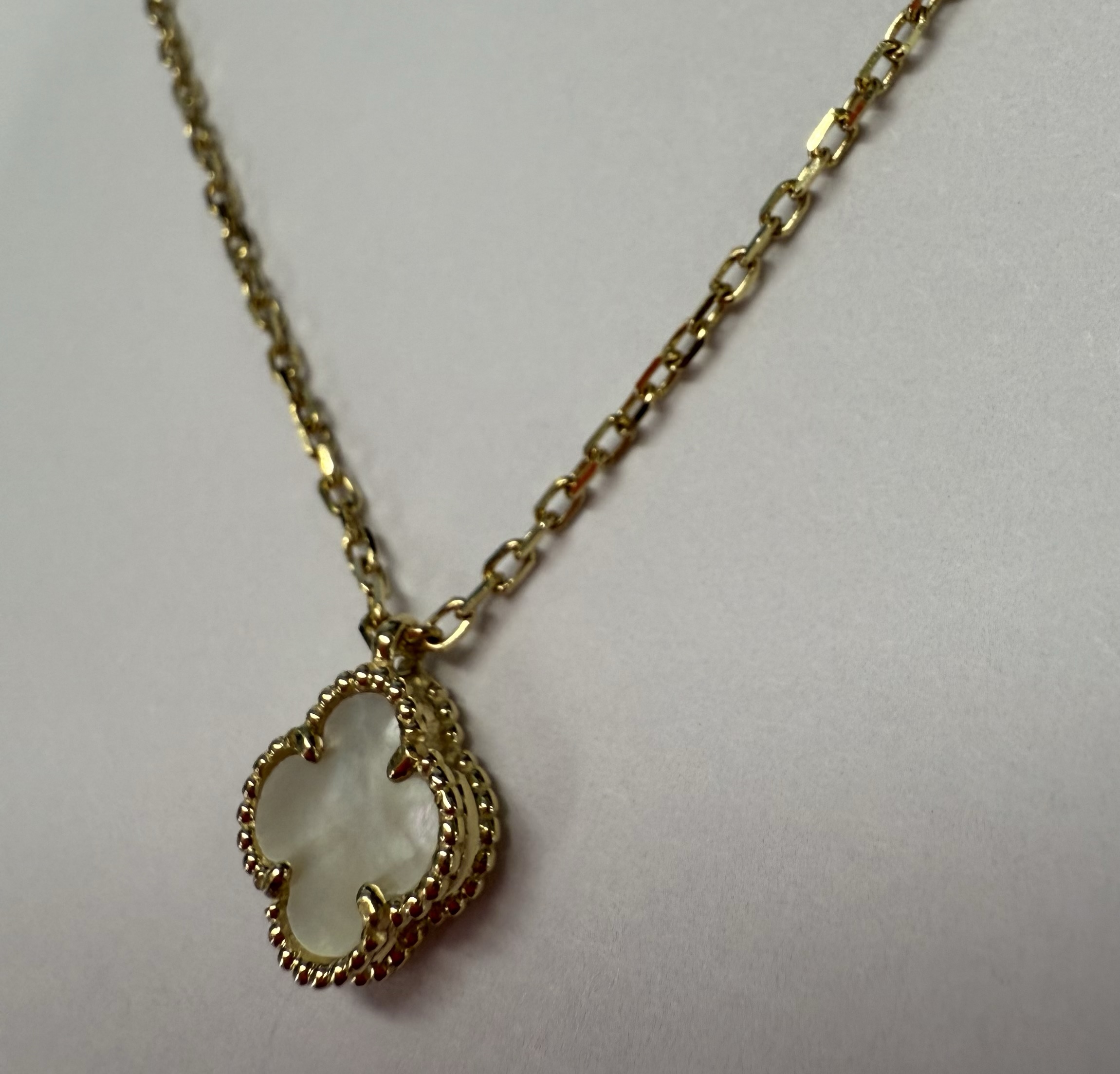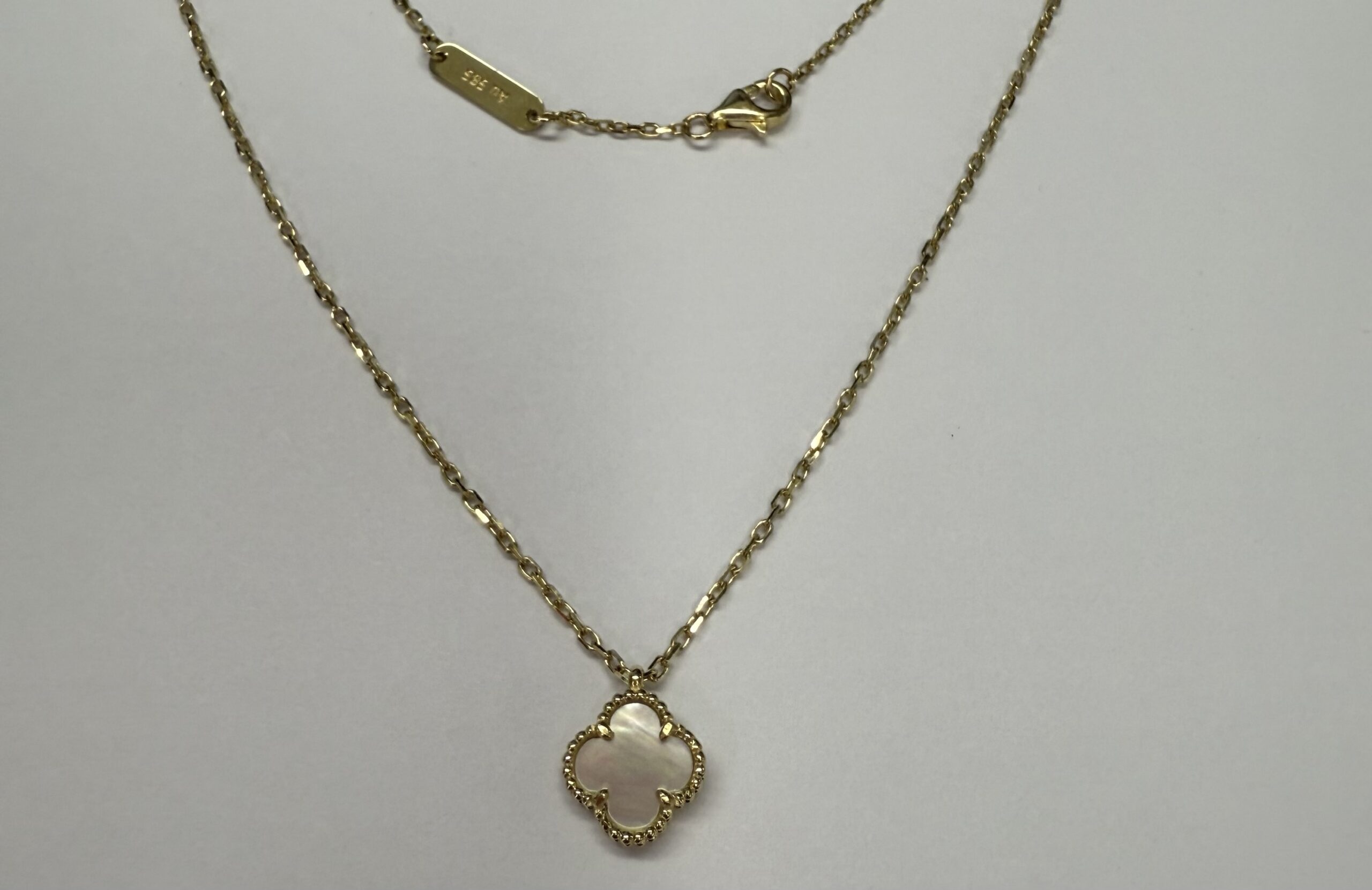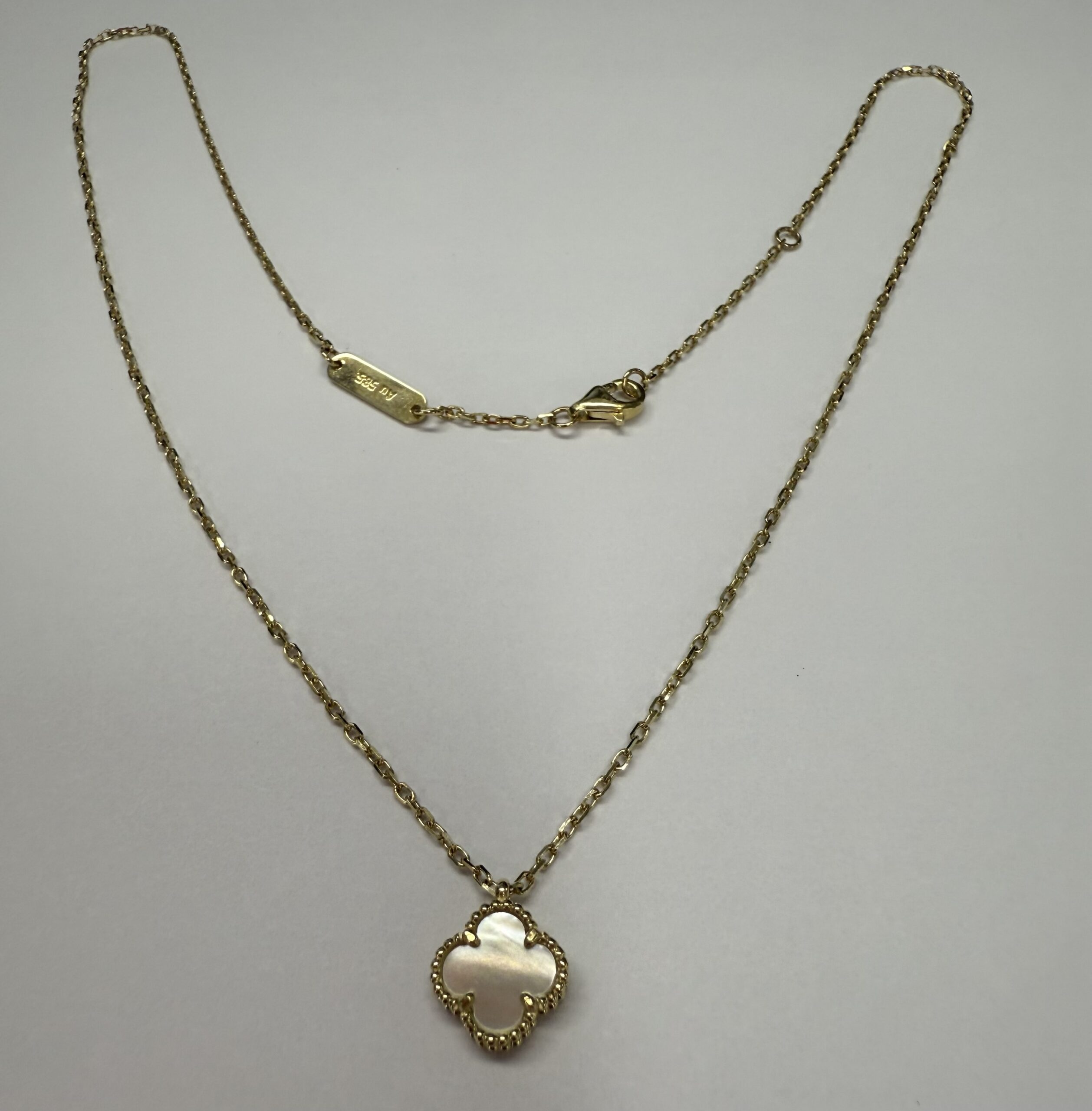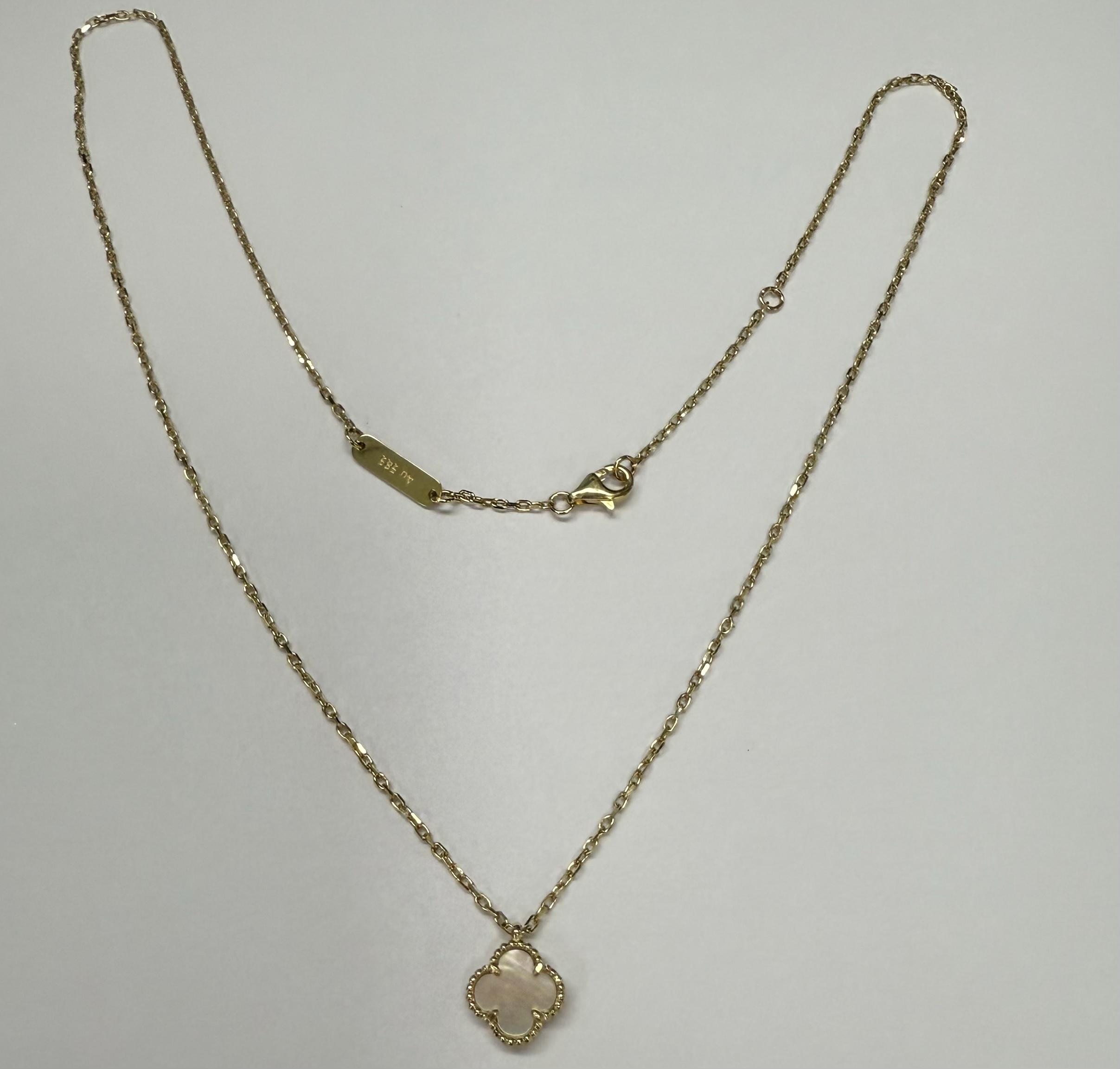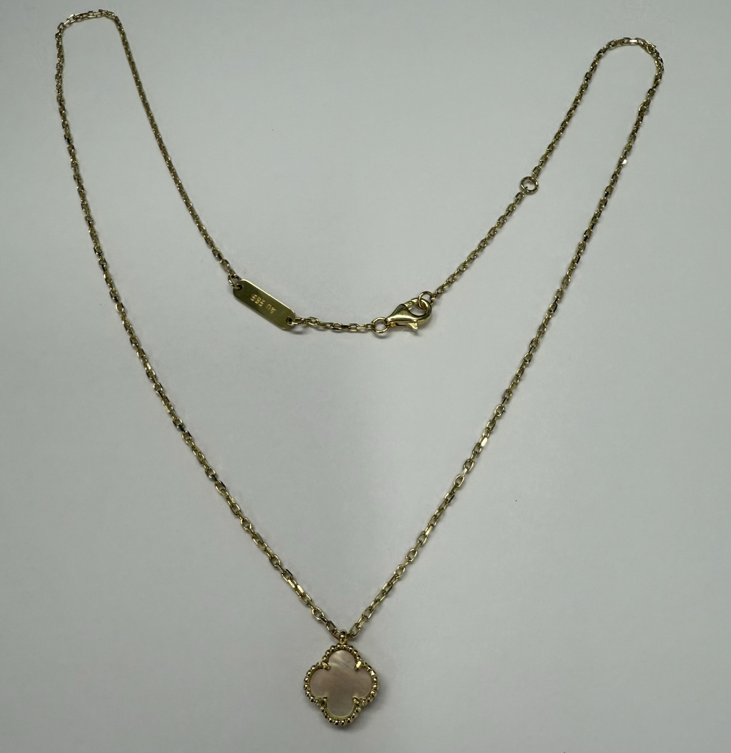 One-of-a-kind 14k yellow gold genuine Mother of Pearl clover necklace, adjustable 16-18″, 3.4 grams.