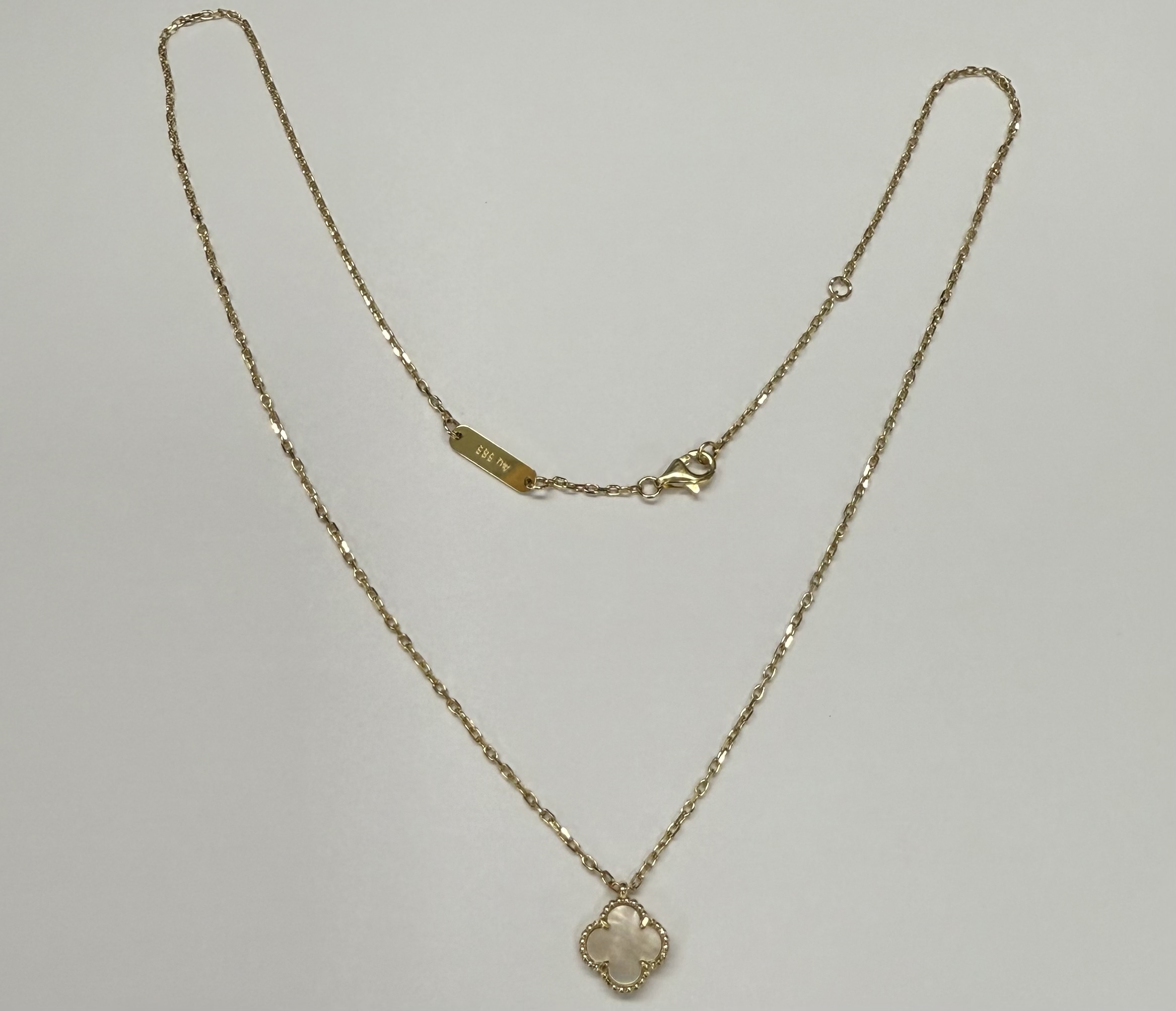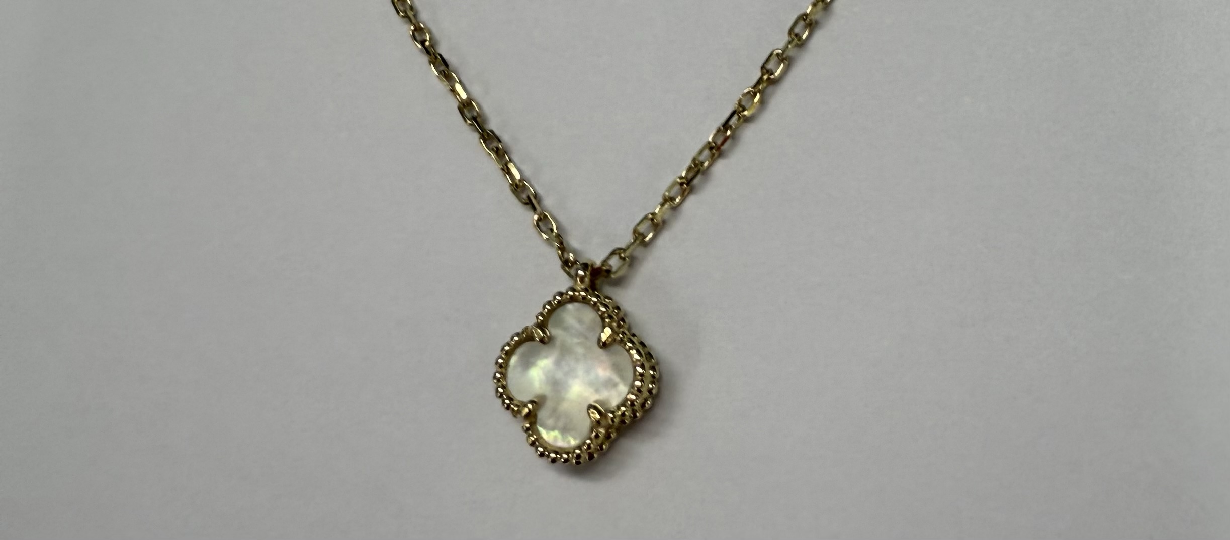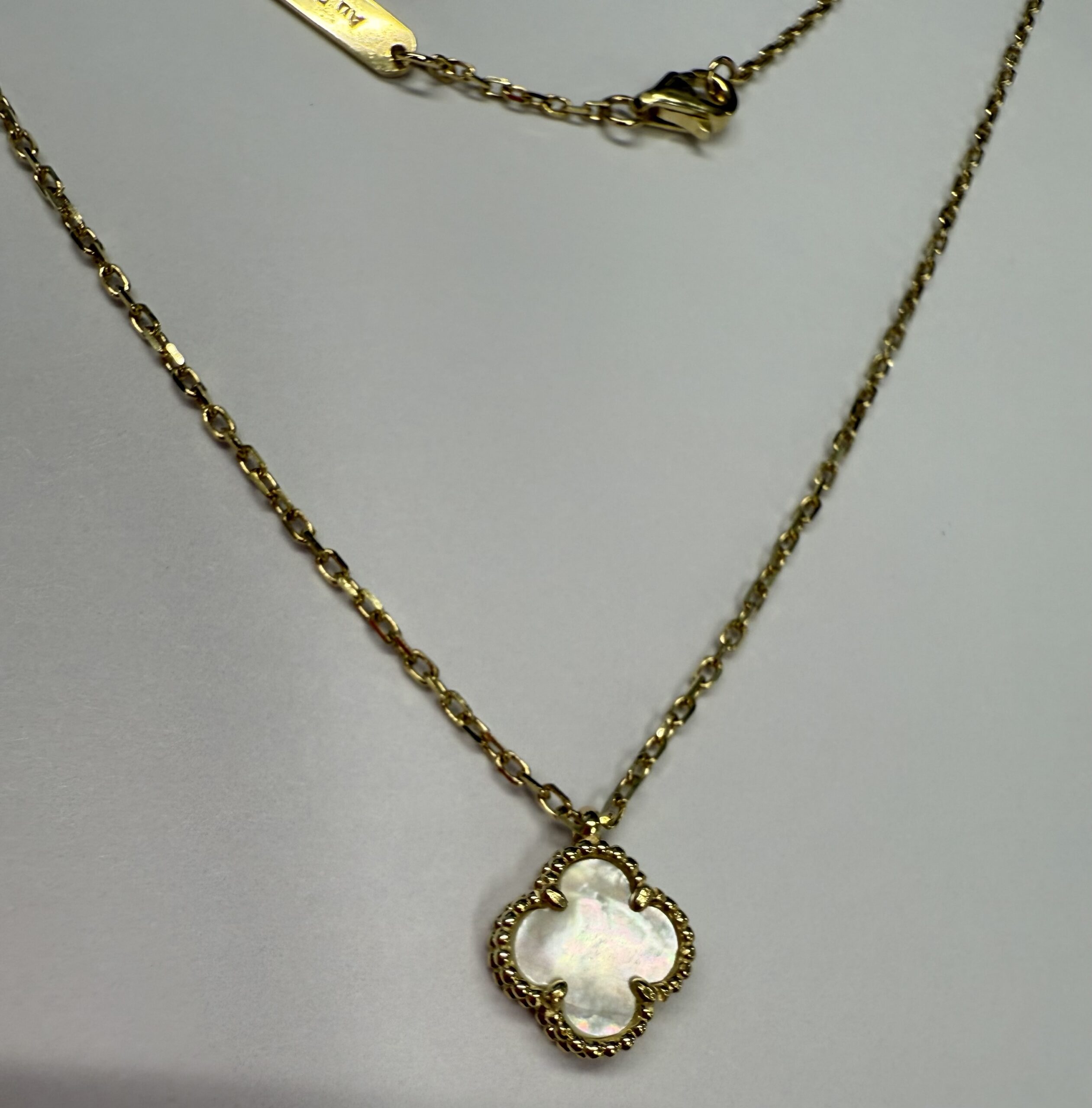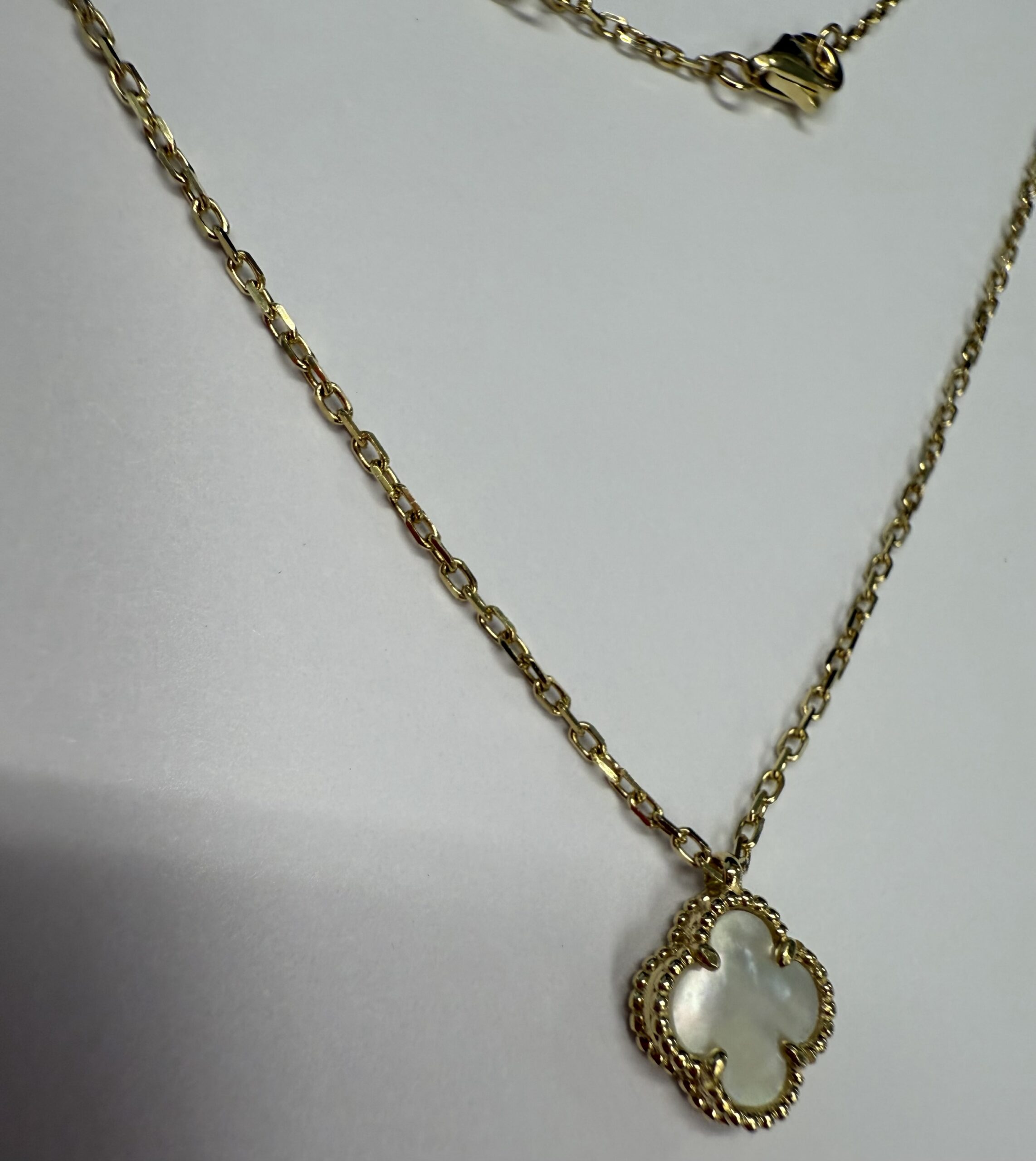 One-of-a-kind 14k yellow gold genuine Mother of Pearl clover necklace, adjustable 16-18″, 3.4 grams.