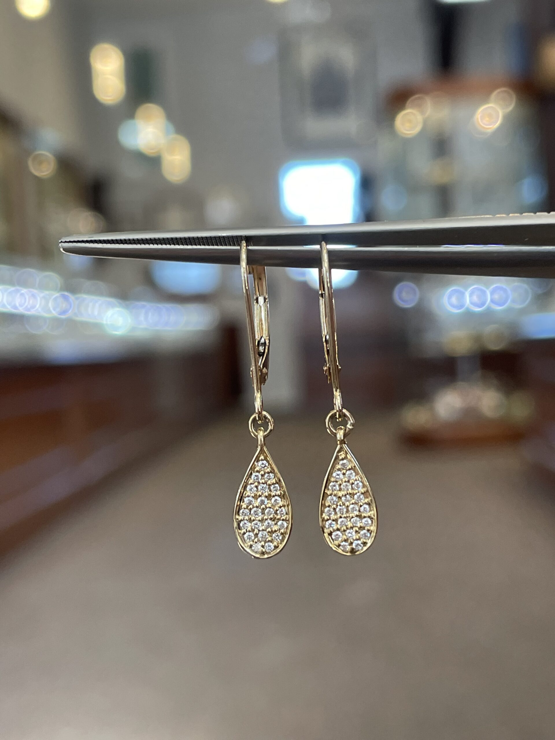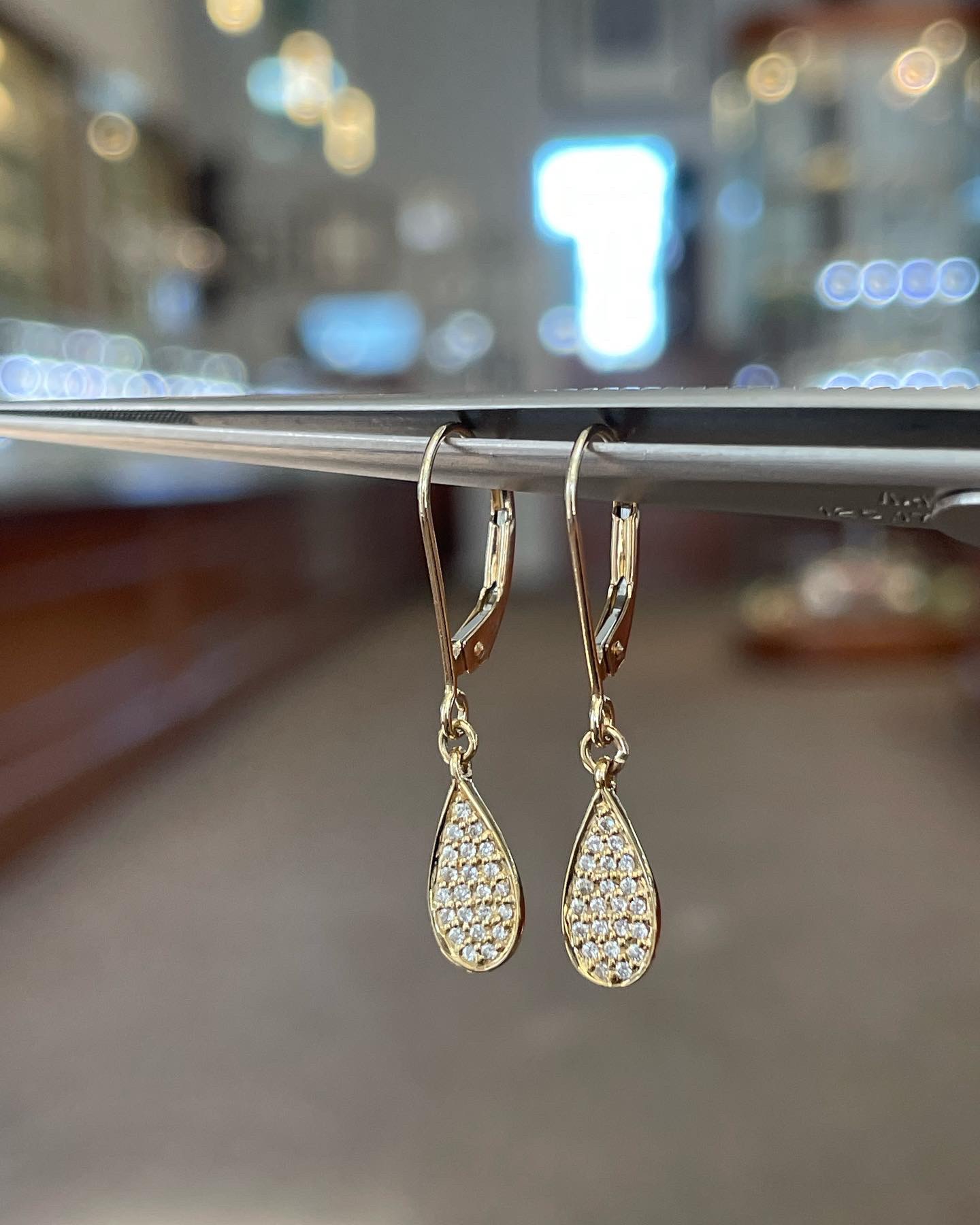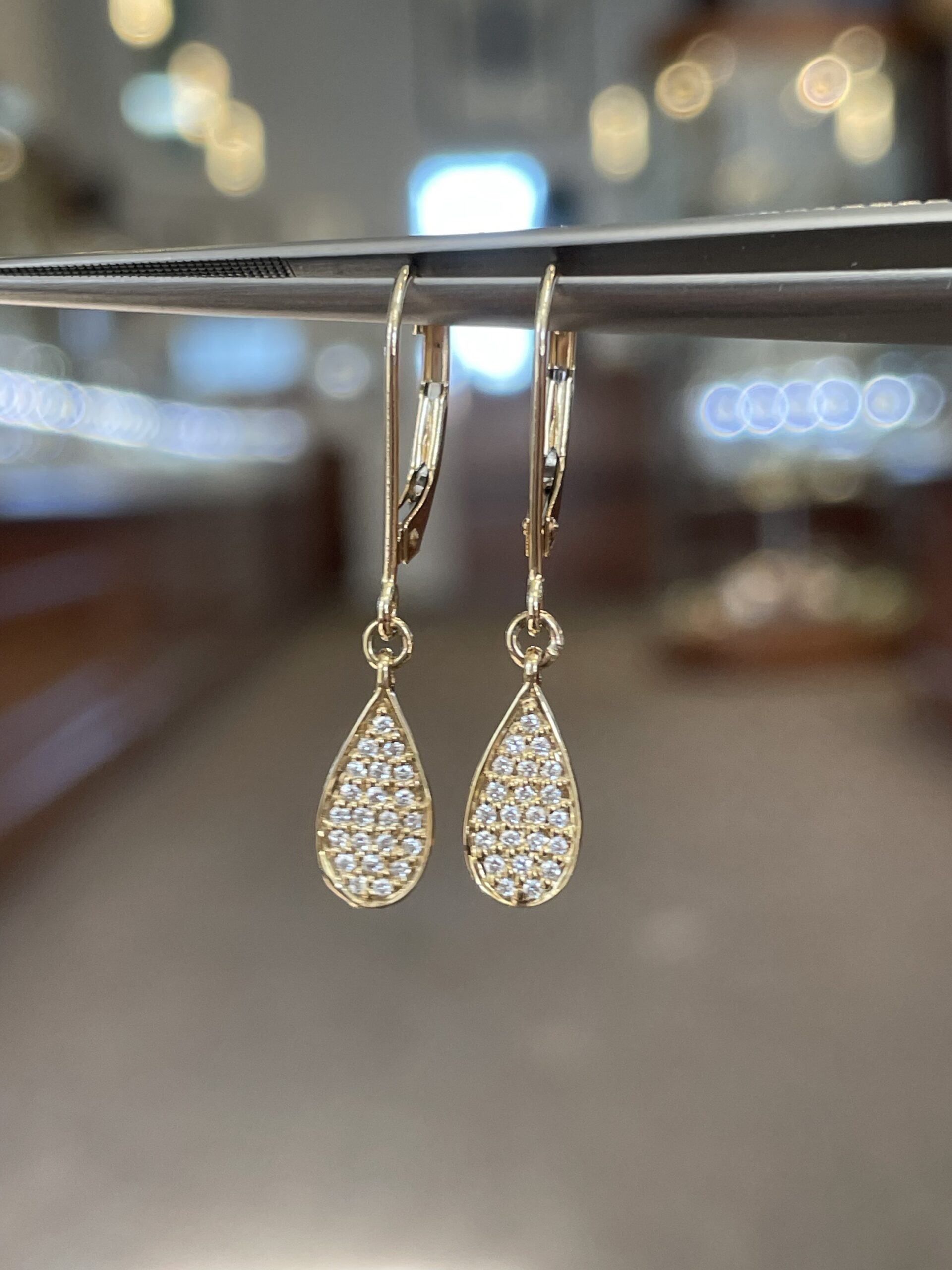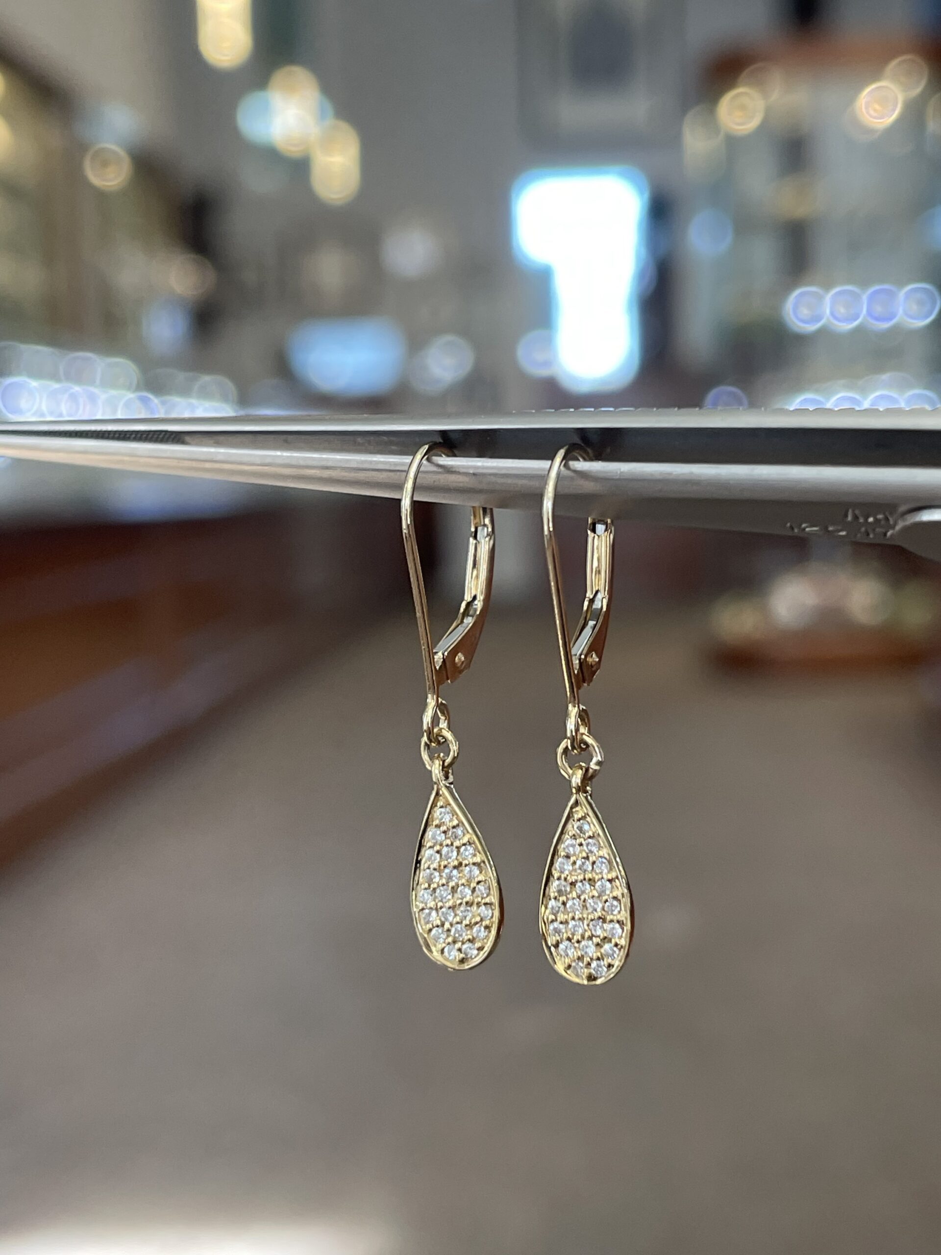 14k yellow gold genuine .15 Cttw Round Brilliant Cut diamond teardrop shaped lever back dangle earrings.
