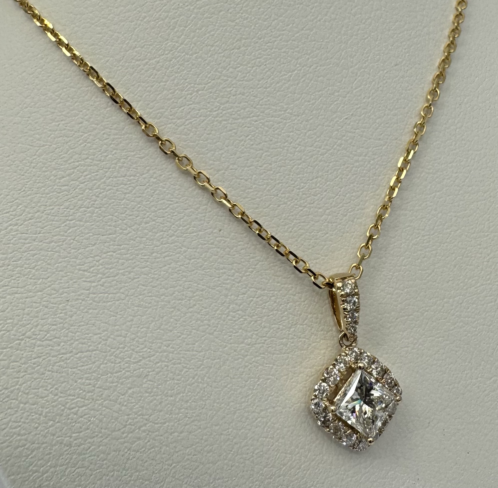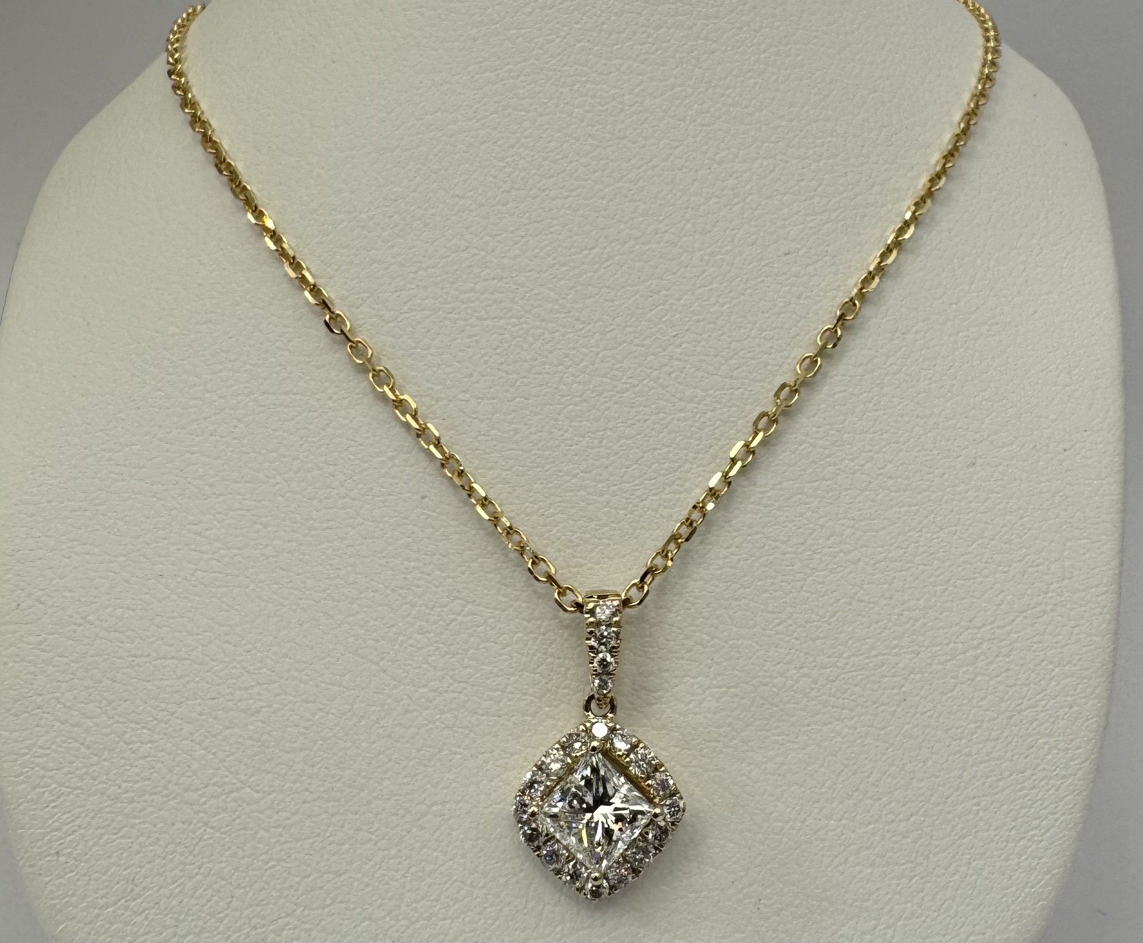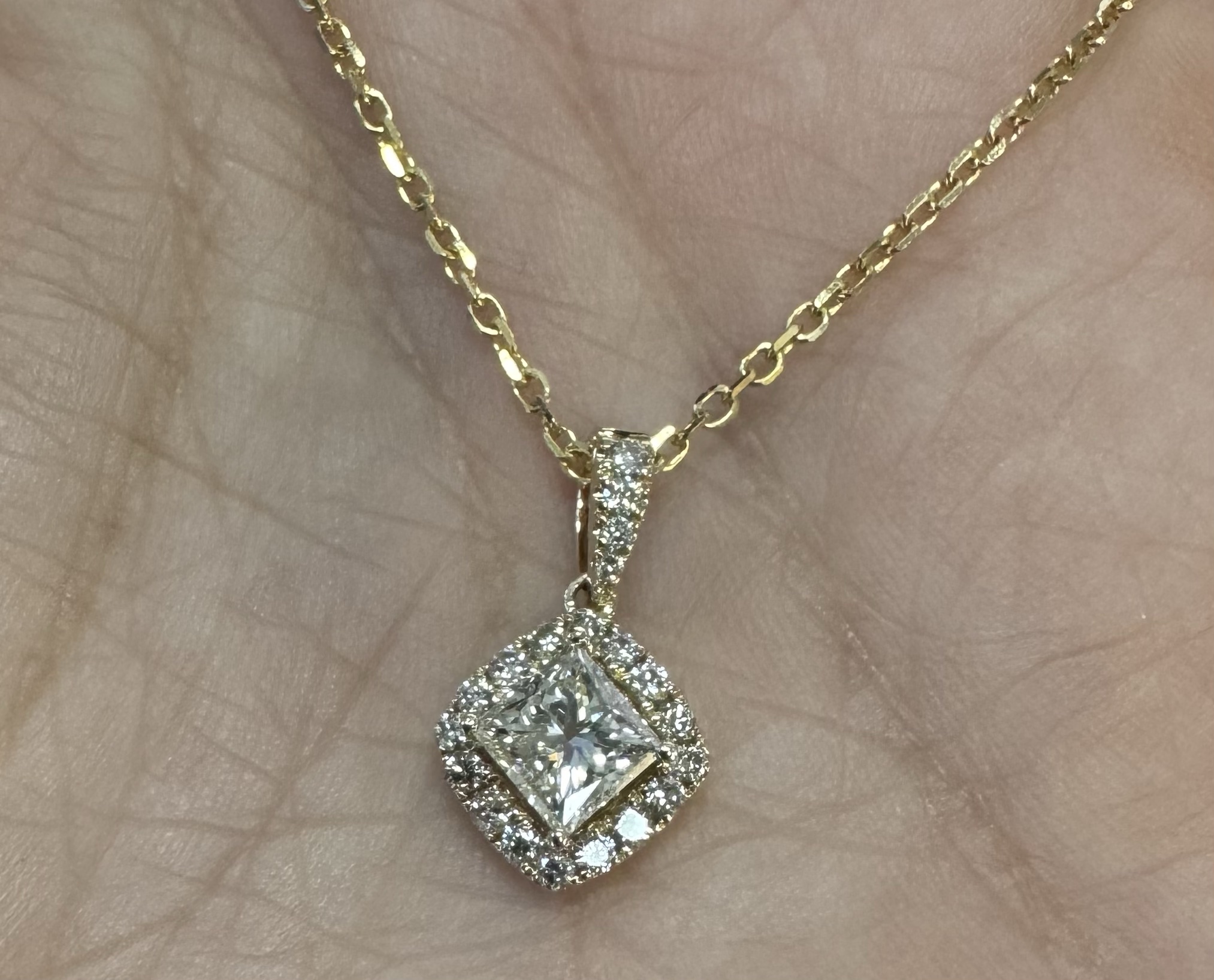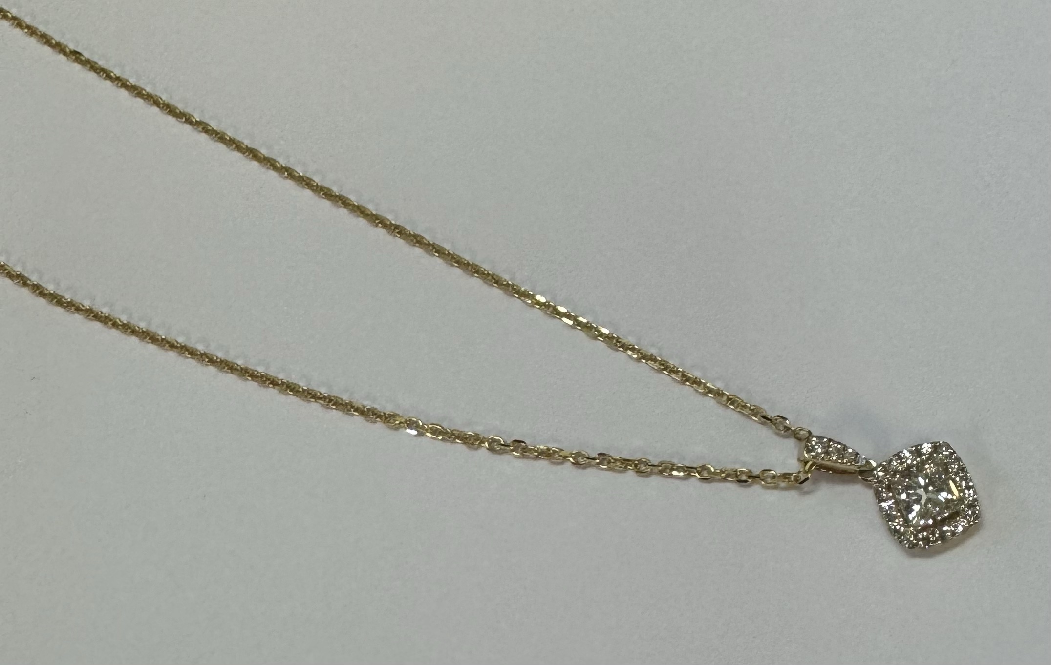 14k yellow gold GIA certified natural .60 cttw Cushion Modified Brilliant Cut diamond halo pendant. This diamond had H color, VS1 clarity, as described in GIA certificate #6117329353. This diamond has very good polish and very good symmetry. This diamond is enhanced by a pave’ set diamond halo and diamond bail which is set with .23 cttw of genuine Round Brilliant Cut diamonds. These smaller diamonds average G-H in color and SI1 in clarity. This pendant is suspended from a 1.4 mm 14k yellow gold forzantina chain which is adjustable 16-18″, and which is terminated by a lobster claw clasp. This pendant has an entire weight of 3.3 grams. This piece is accompanied by the GIA certificate on the major diamond as well as an appraisal for insurance purposes.