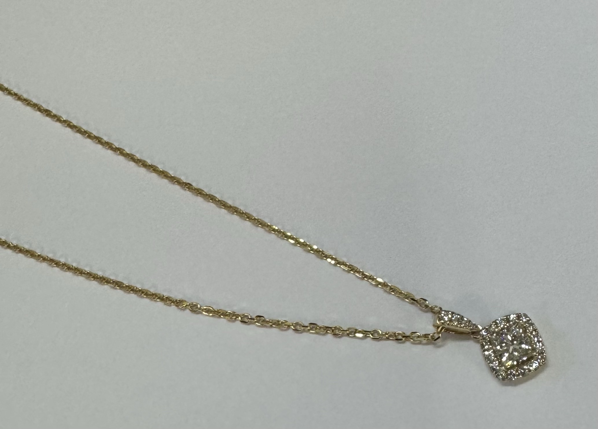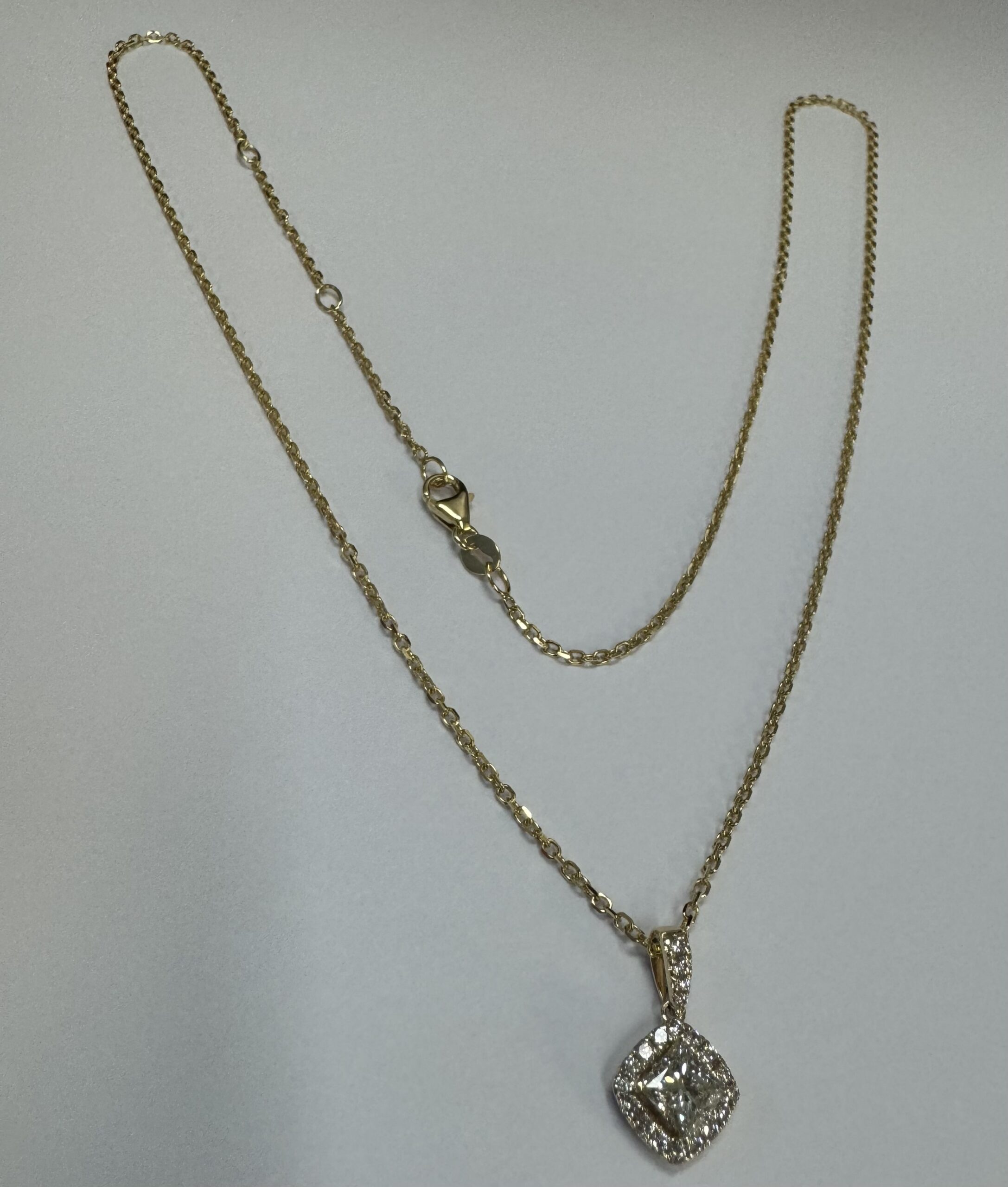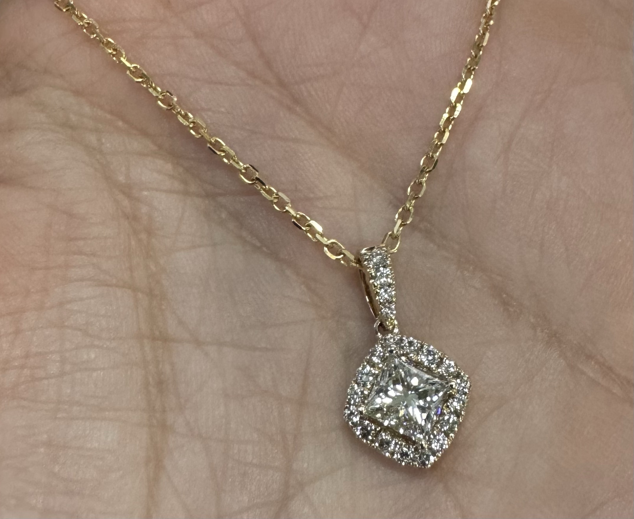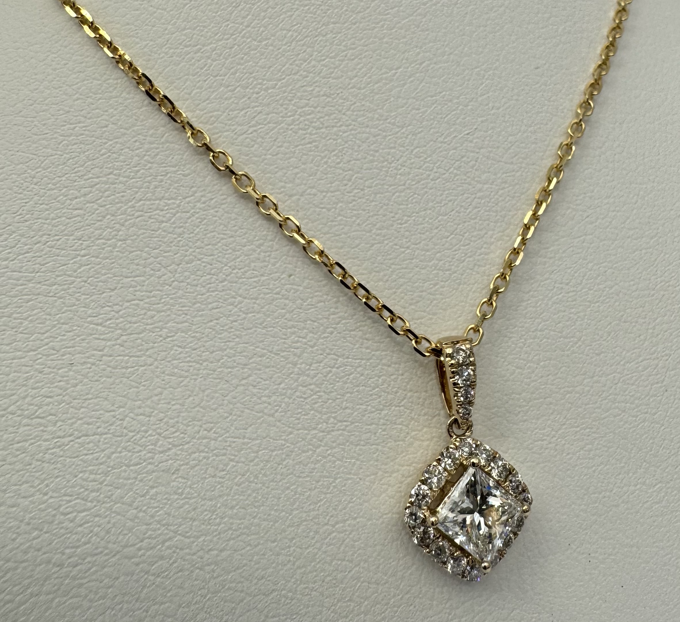 14k yellow gold GIA certified natural .60 cttw Cushion Modified Brilliant Cut diamond halo pendant. This diamond had H color, VS1 clarity, as described in GIA certificate #6117329353. This diamond has very good polish and very good symmetry. This diamond is enhanced by a pave’ set diamond halo and diamond bail which is set with .23 cttw of genuine Round Brilliant Cut diamonds. These smaller diamonds average G-H in color and SI1 in clarity. This pendant is suspended from a 1.4 mm 14k yellow gold forzantina chain which is adjustable 16-18″, and which is terminated by a lobster claw clasp. This pendant has an entire weight of 3.3 grams. This piece is accompanied by the GIA certificate on the major diamond as well as an appraisal for insurance purposes.