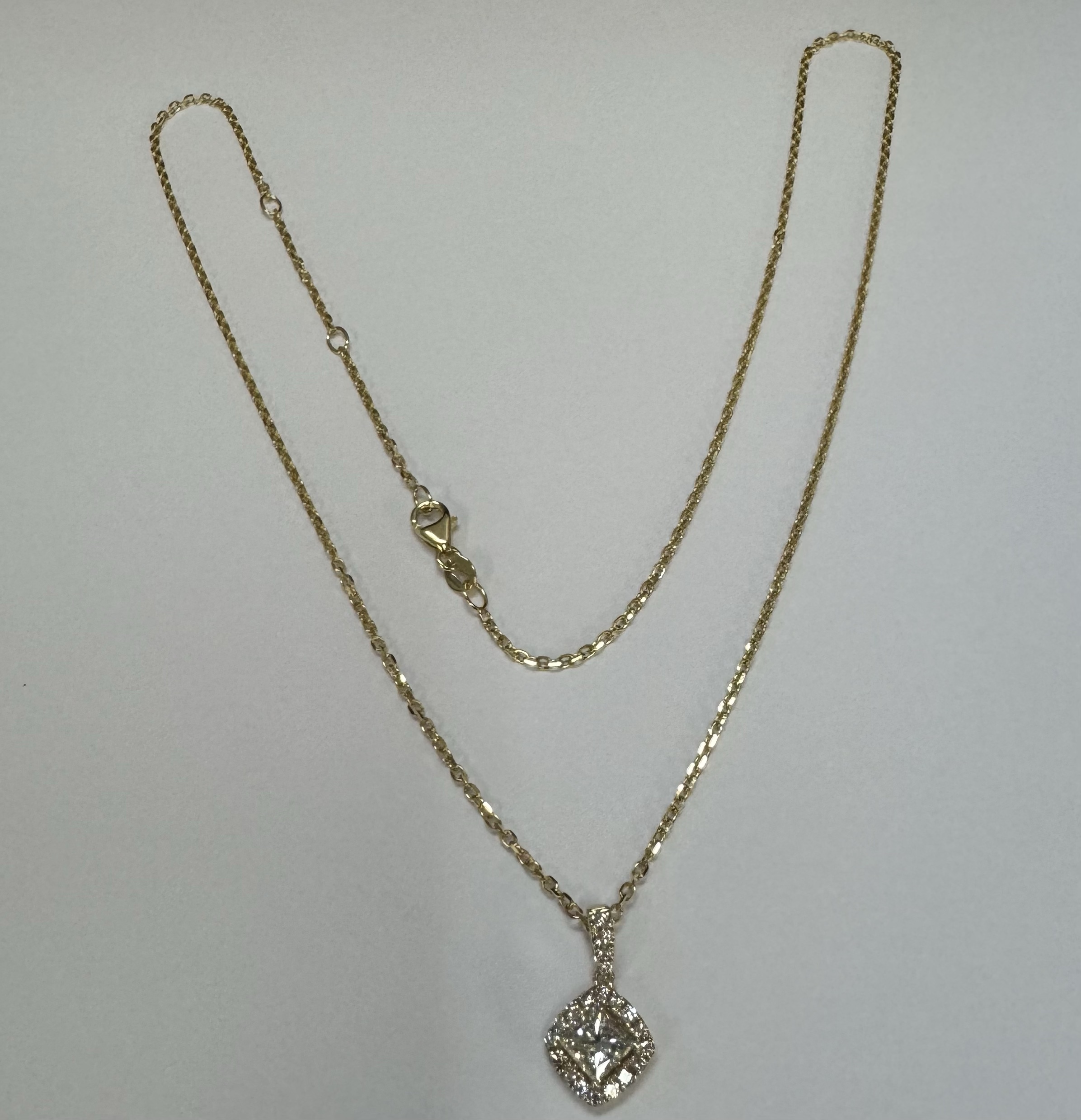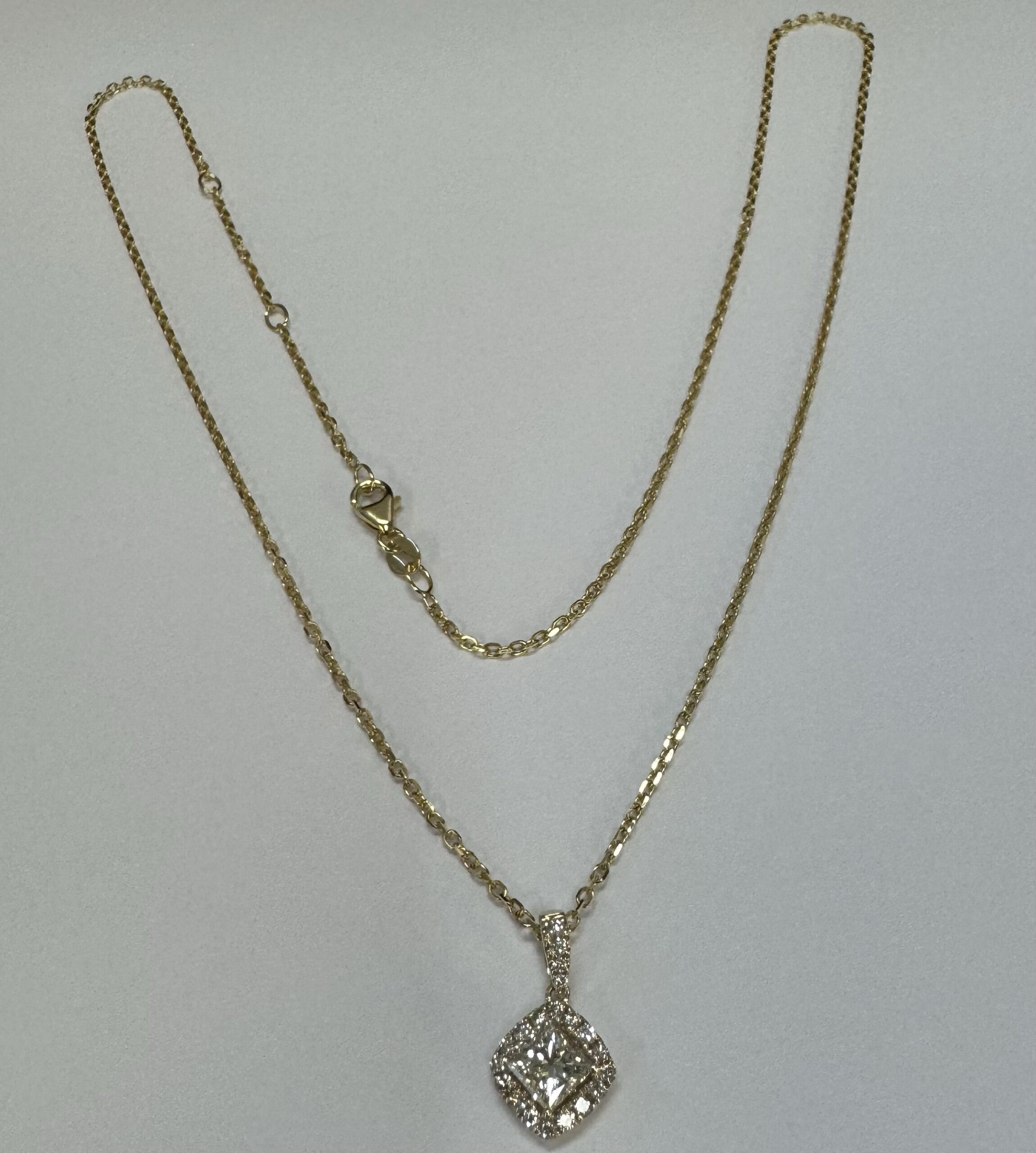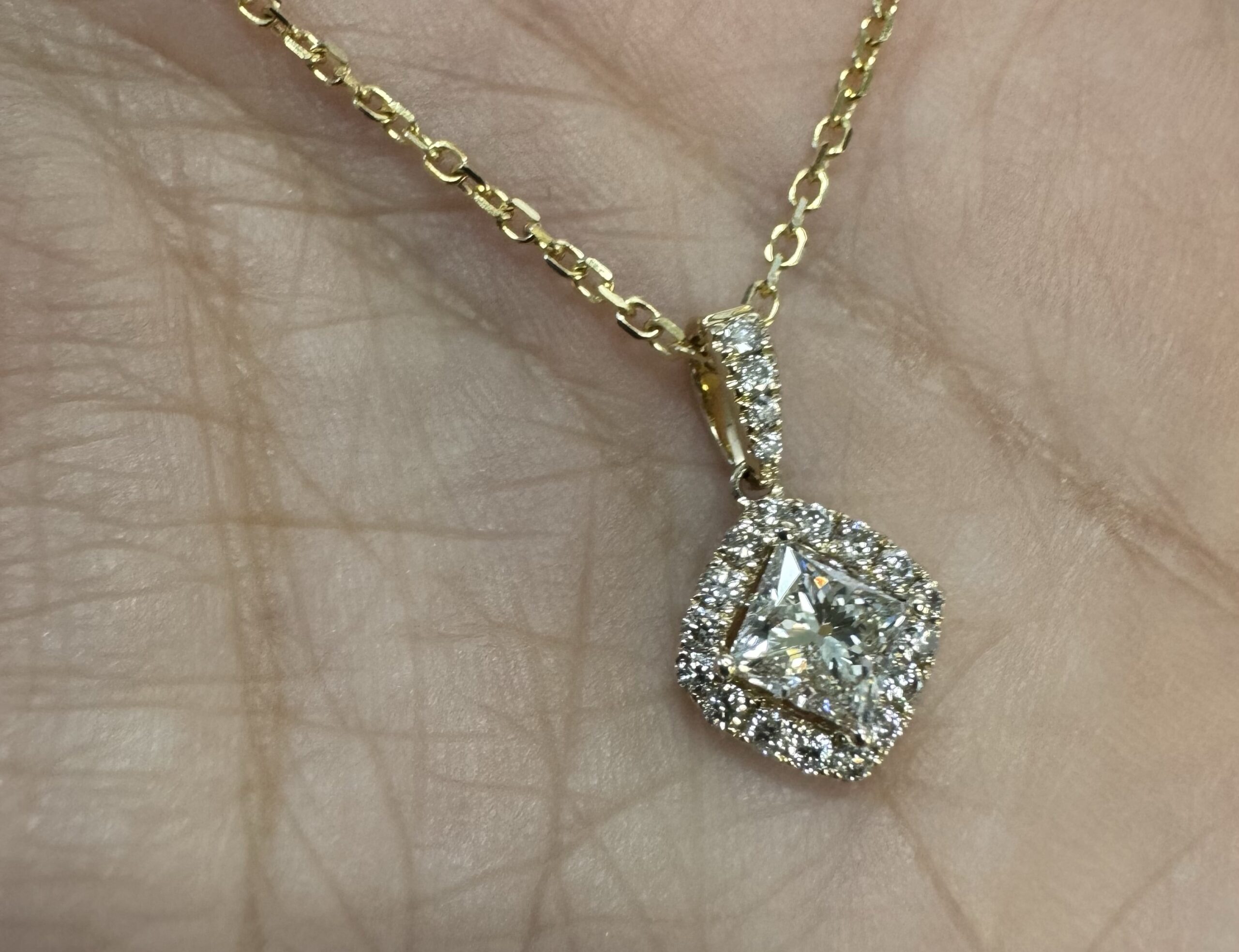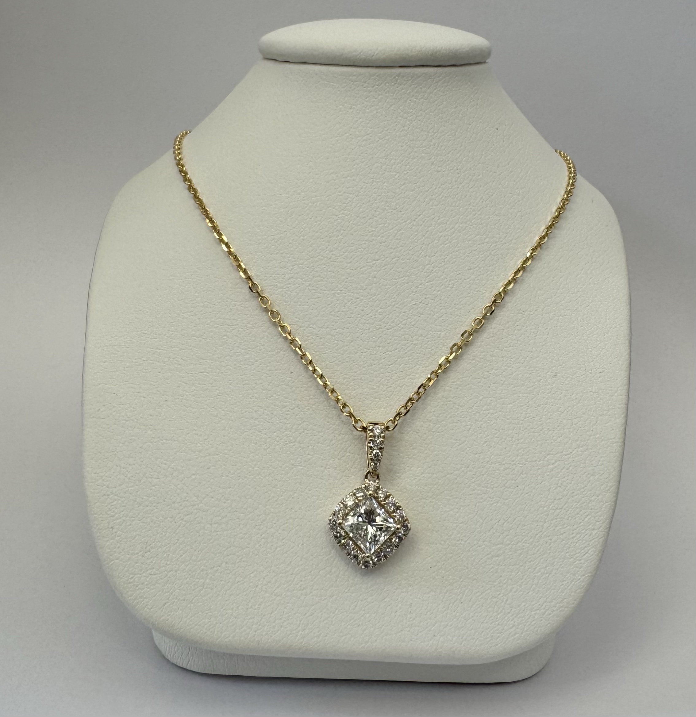 14k yellow gold GIA certified natural .60 cttw Cushion Modified Brilliant Cut diamond halo pendant. This diamond had H color, VS1 clarity, as described in GIA certificate #6117329353. This diamond has very good polish and very good symmetry. This diamond is enhanced by a pave’ set diamond halo and diamond bail which is set with .23 cttw of genuine Round Brilliant Cut diamonds. These smaller diamonds average G-H in color and SI1 in clarity. This pendant is suspended from a 1.4 mm 14k yellow gold forzantina chain which is adjustable 16-18″, and which is terminated by a lobster claw clasp. This pendant has an entire weight of 3.3 grams. This piece is accompanied by the GIA certificate on the major diamond as well as an appraisal for insurance purposes.