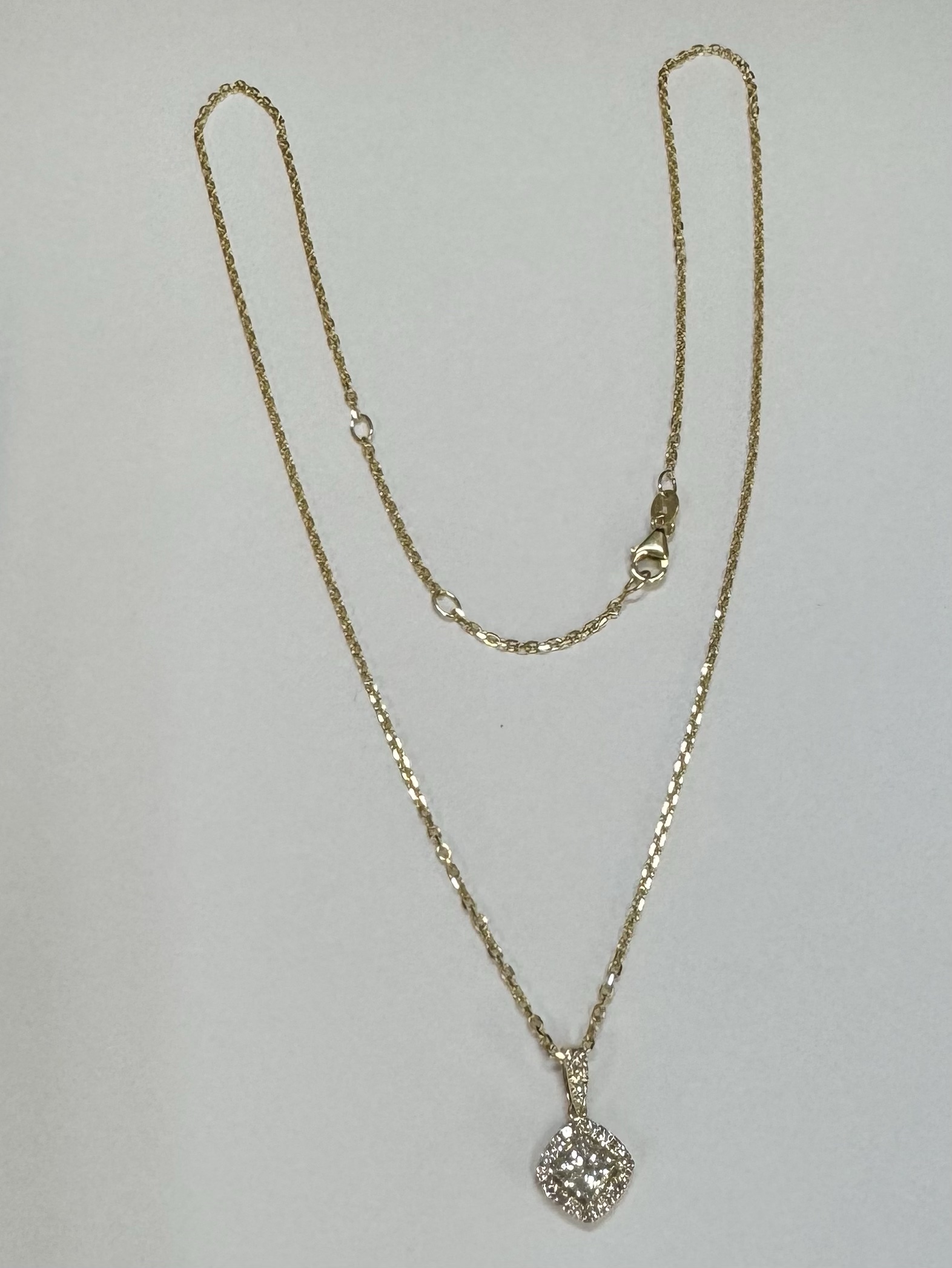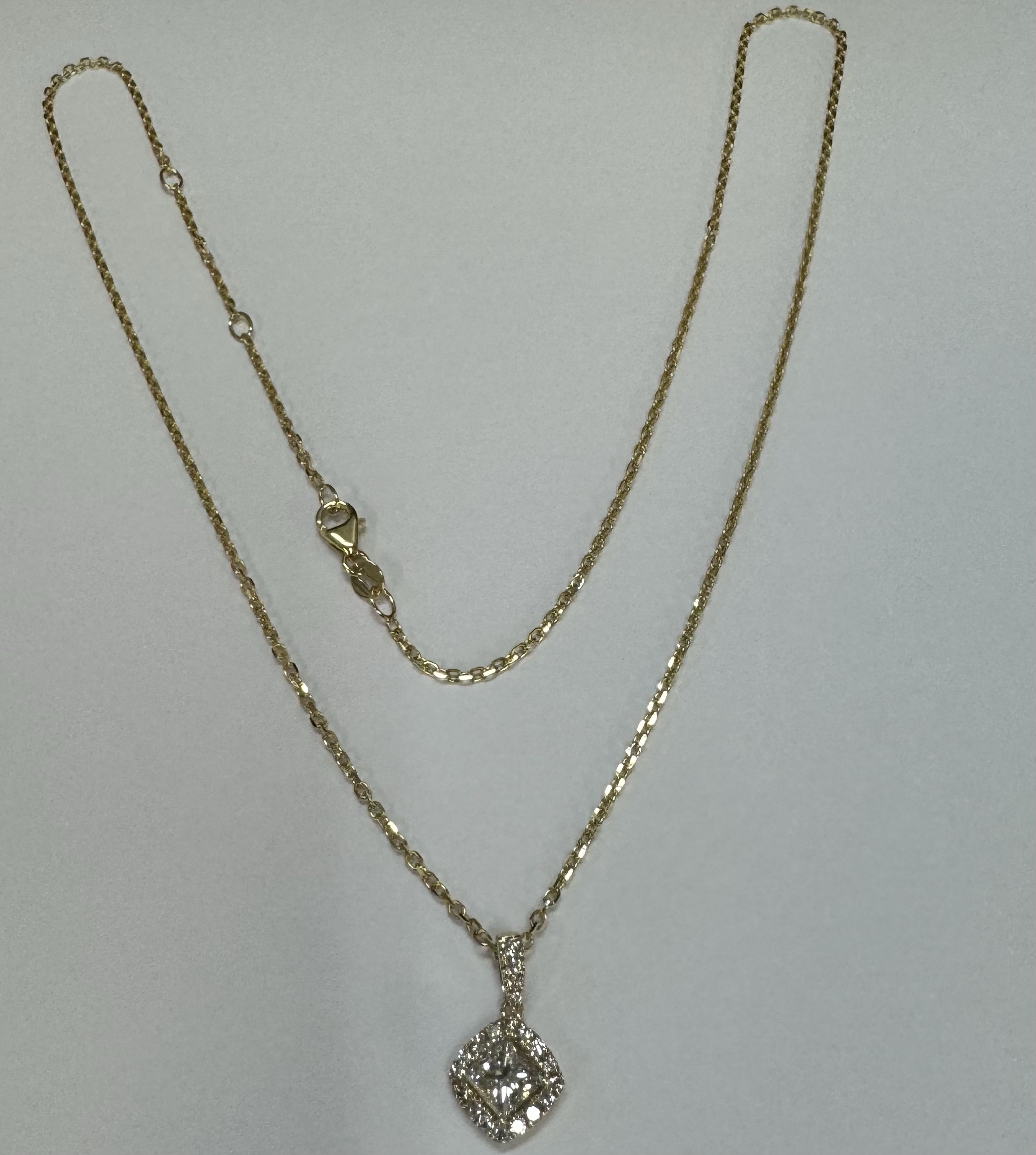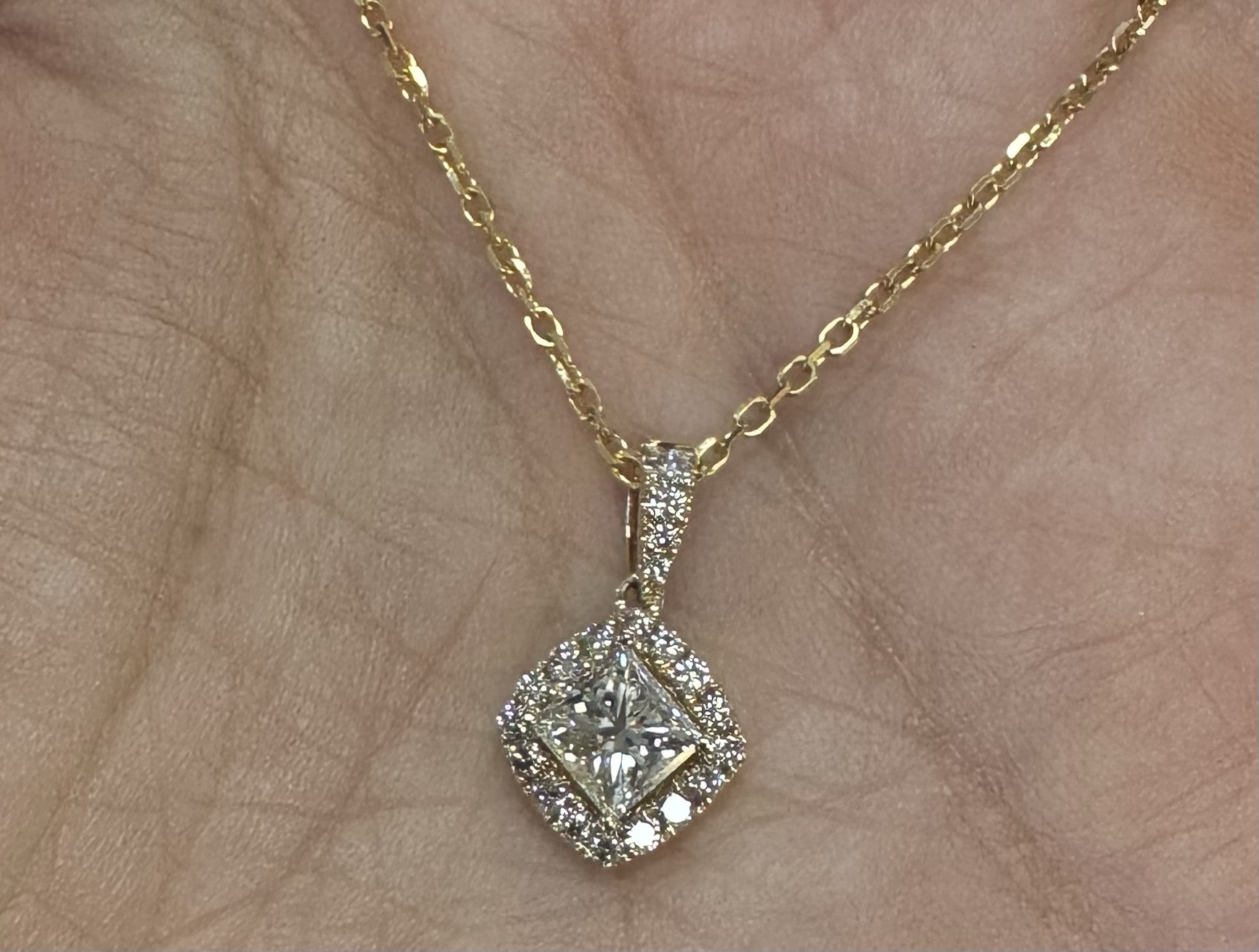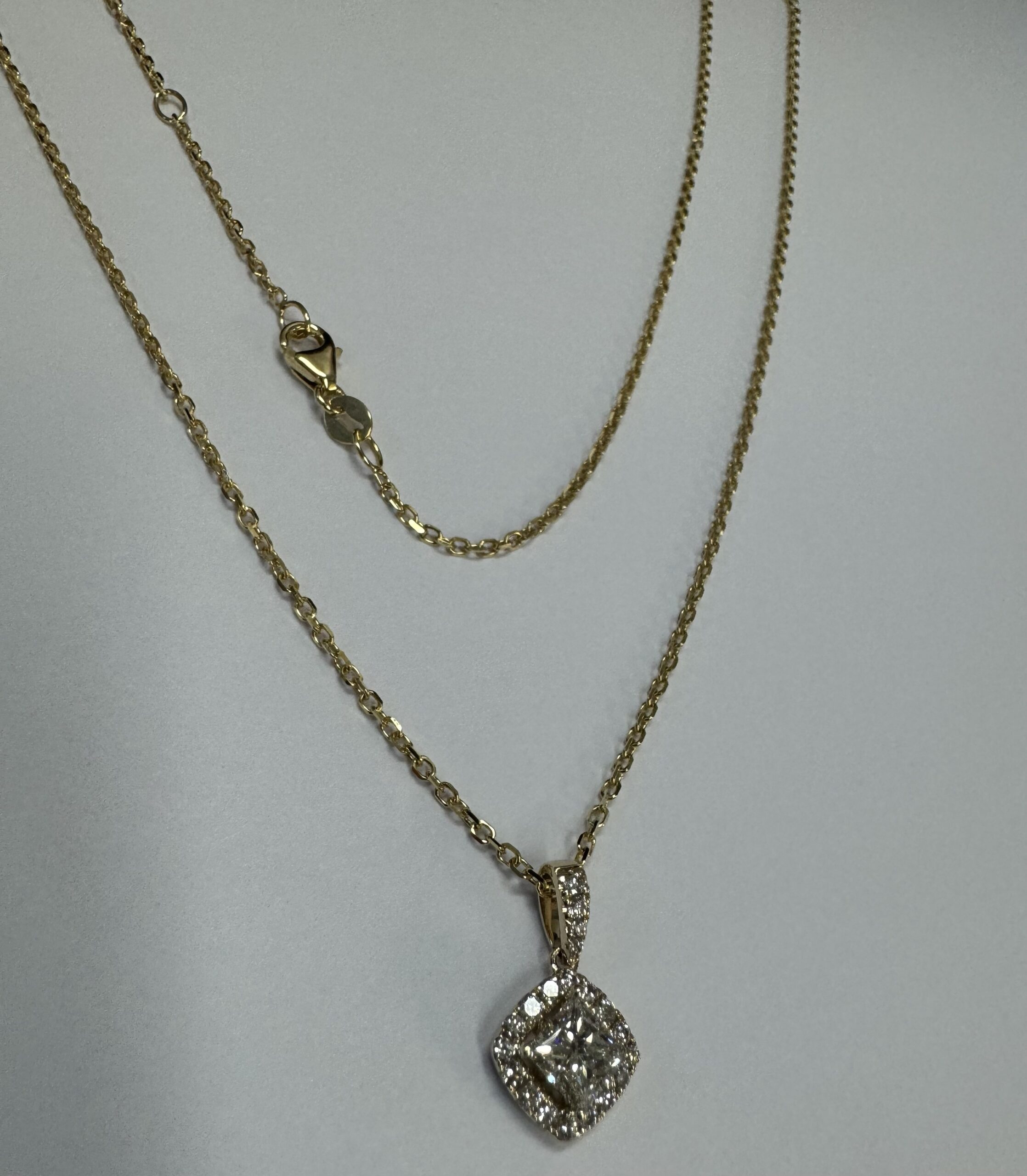 14k yellow gold GIA certified natural .60 cttw Cushion Modified Brilliant Cut diamond halo pendant. This diamond had H color, VS1 clarity, as described in GIA certificate #6117329353. This diamond has very good polish and very good symmetry. This diamond is enhanced by a pave’ set diamond halo and diamond bail which is set with .23 cttw of genuine Round Brilliant Cut diamonds. These smaller diamonds average G-H in color and SI1 in clarity. This pendant is suspended from a 1.4 mm 14k yellow gold forzantina chain which is adjustable 16-18″, and which is terminated by a lobster claw clasp. This pendant has an entire weight of 3.3 grams. This piece is accompanied by the GIA certificate on the major diamond as well as an appraisal for insurance purposes.